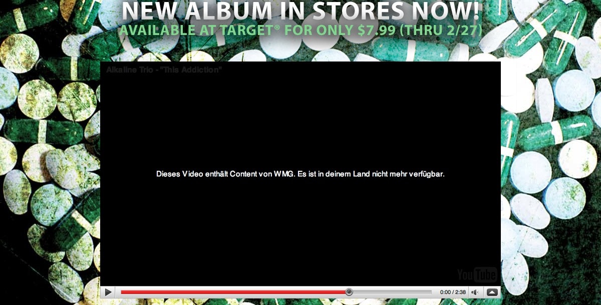 Alkaline Trio sind mit ihrem aktuellen, siebten Album „This Addiction„(*) auf Tour. Und wenn man sich hier in Deutschland den offiziellen YouTube-Channel der Punks so ansieht, dann müssen wir hier wohl froh sein, dass die Plattenfirma der Band nur YouTube-Videos und nicht gleich auch Auftritte hier verbietet. Immerhin vier Konzerte der Tour gibt es in Deutschland: