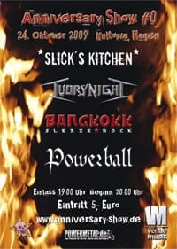 Zusammen mit unseren Kollegen von powermetal.de präsentieren wir Euch am 24. Oktober 2009 im Kultopia in Hagen Bangkokk, Powerball, Ivory Night und Slick’s Kitchen live. Zusammen Spaß haben und die Bude rocken ist die Idee hinter dieser Veranstaltung, zu der Slick’s Kitchen dieses Jahr zum ersten, aber sicher nicht zum letzten Mal einladen.