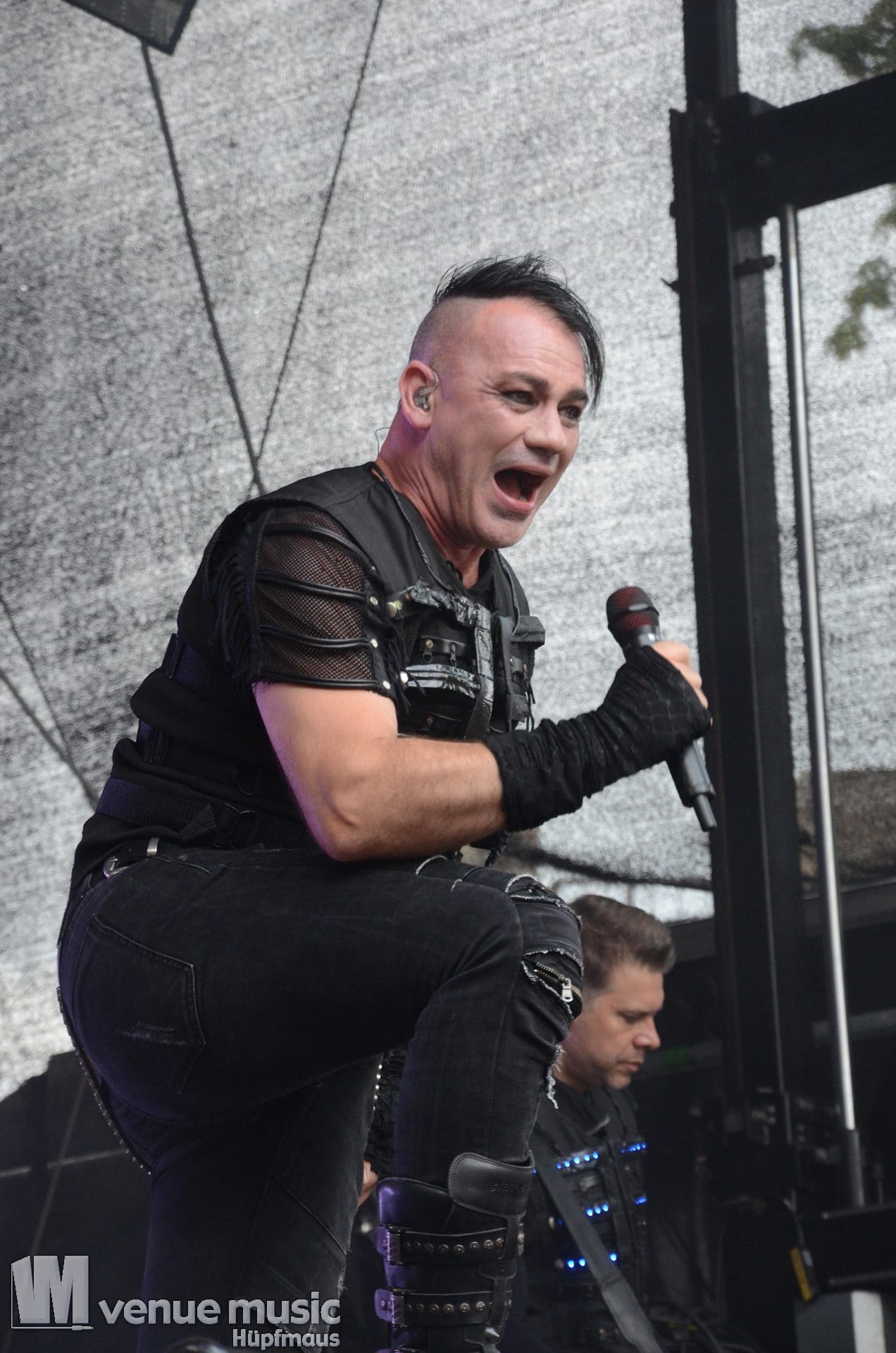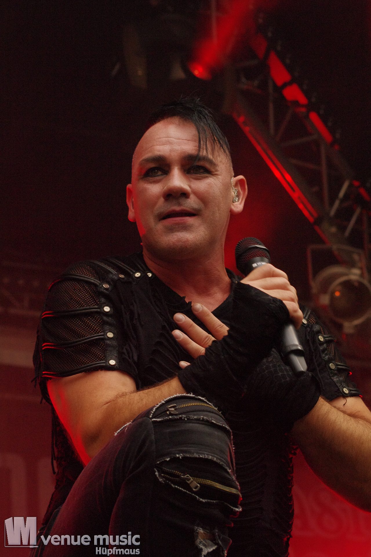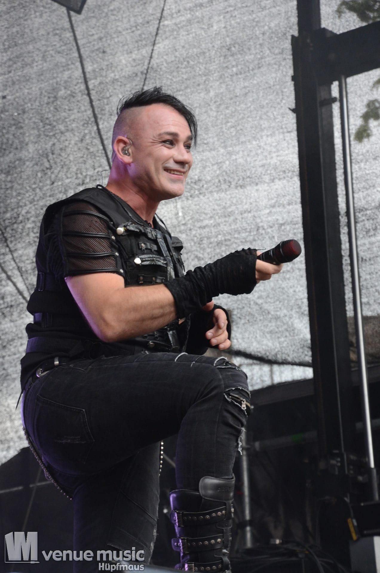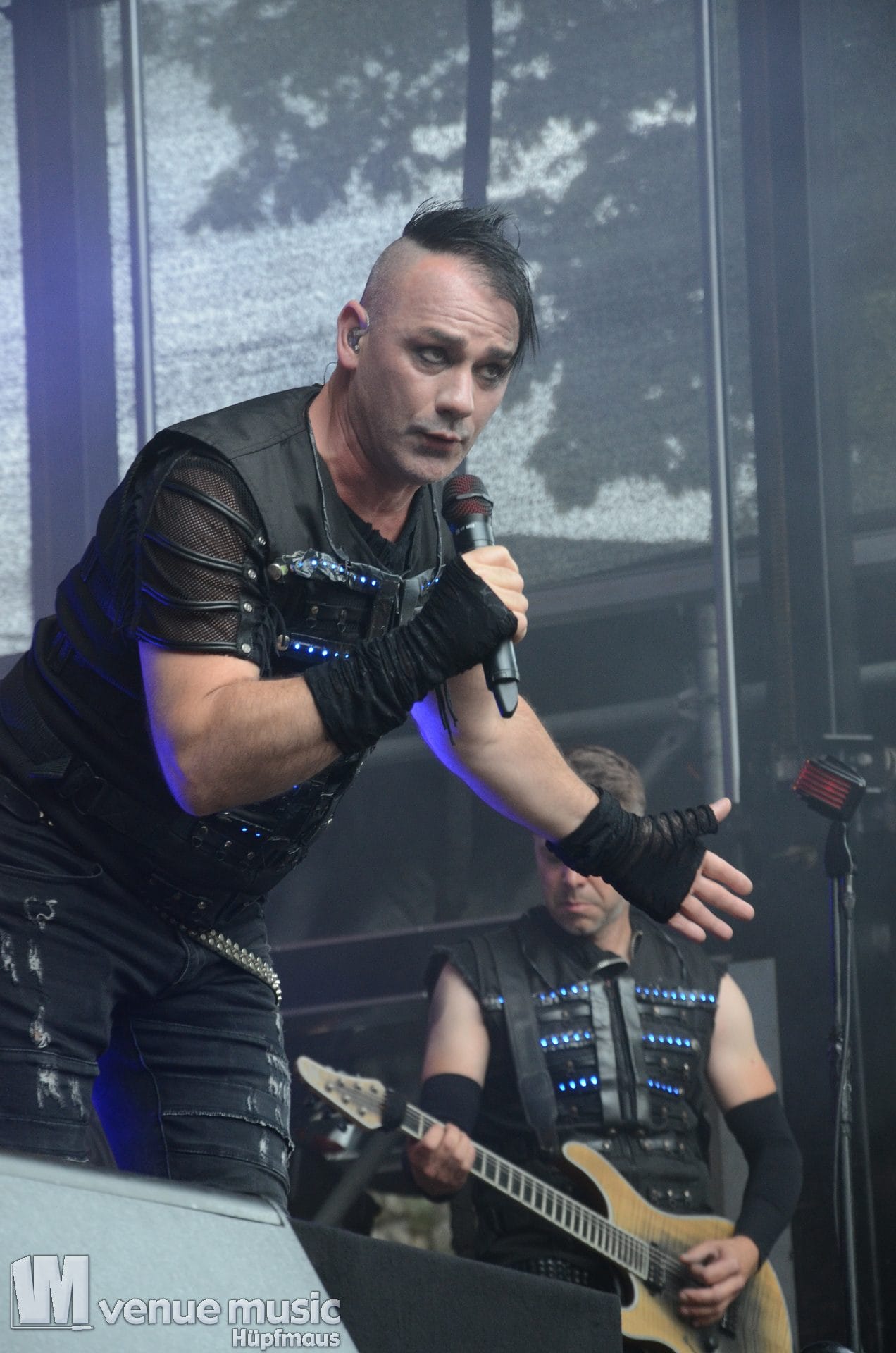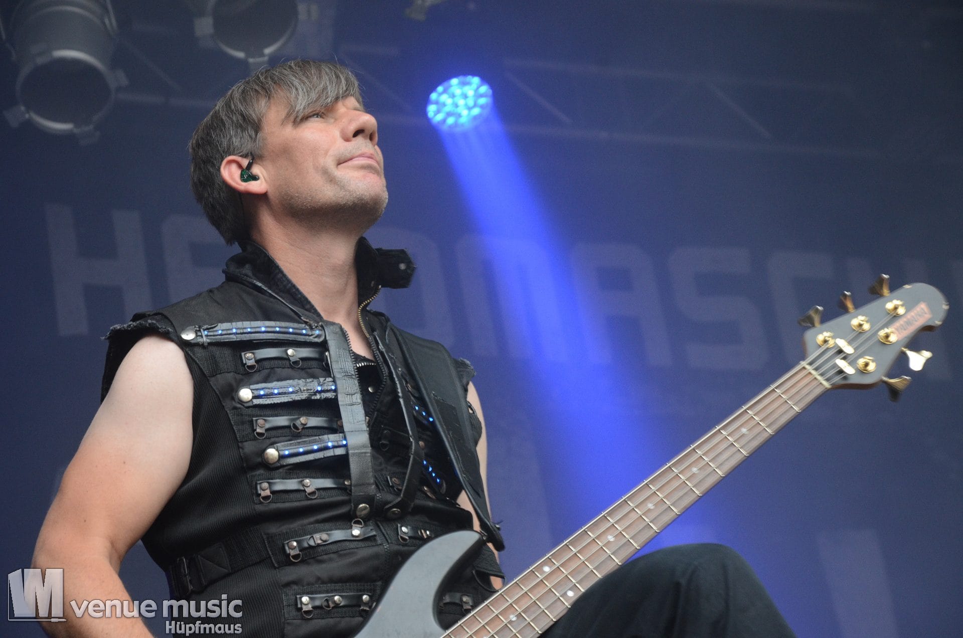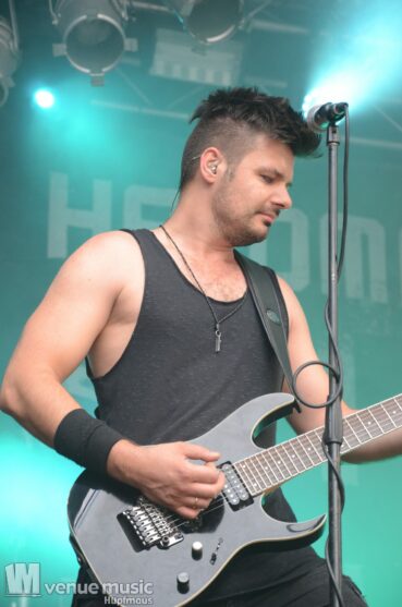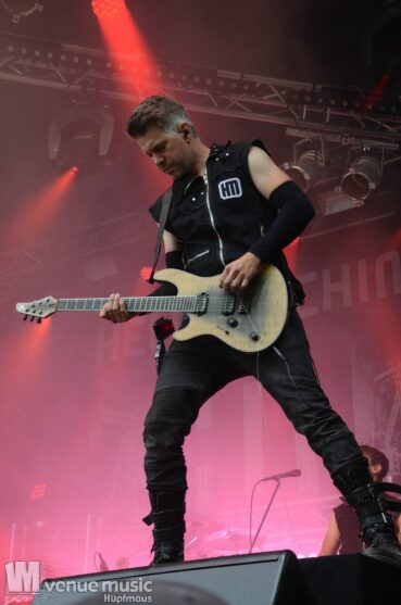 Und weiter ging es mit Neuer Deutscher Härte – Heldmaschine waren nun mit ihrem Set an der Reihe. Ich dachte noch „Moment mal, der Sänger kommt Dir aber bekannt vor“ – klar, er (und noch mehr Musiker der Band) ist ja auch Teil von Völkerball. (Die ich aber immer noch nicht live gesehen habe, dabei spielen sie so oft in Oberhausen, aber irgendwie passte es zeitlich nie bisher). Das versprach noch mal jede Menge Spaß.