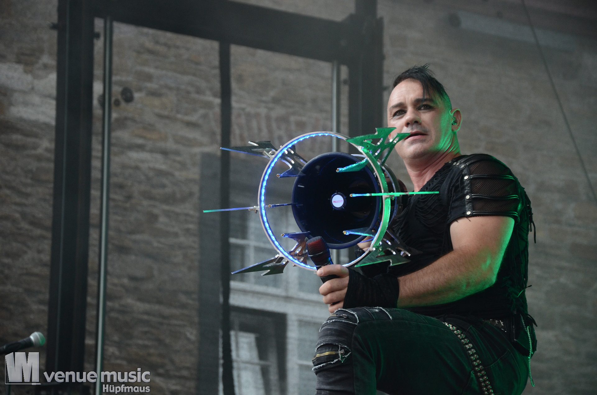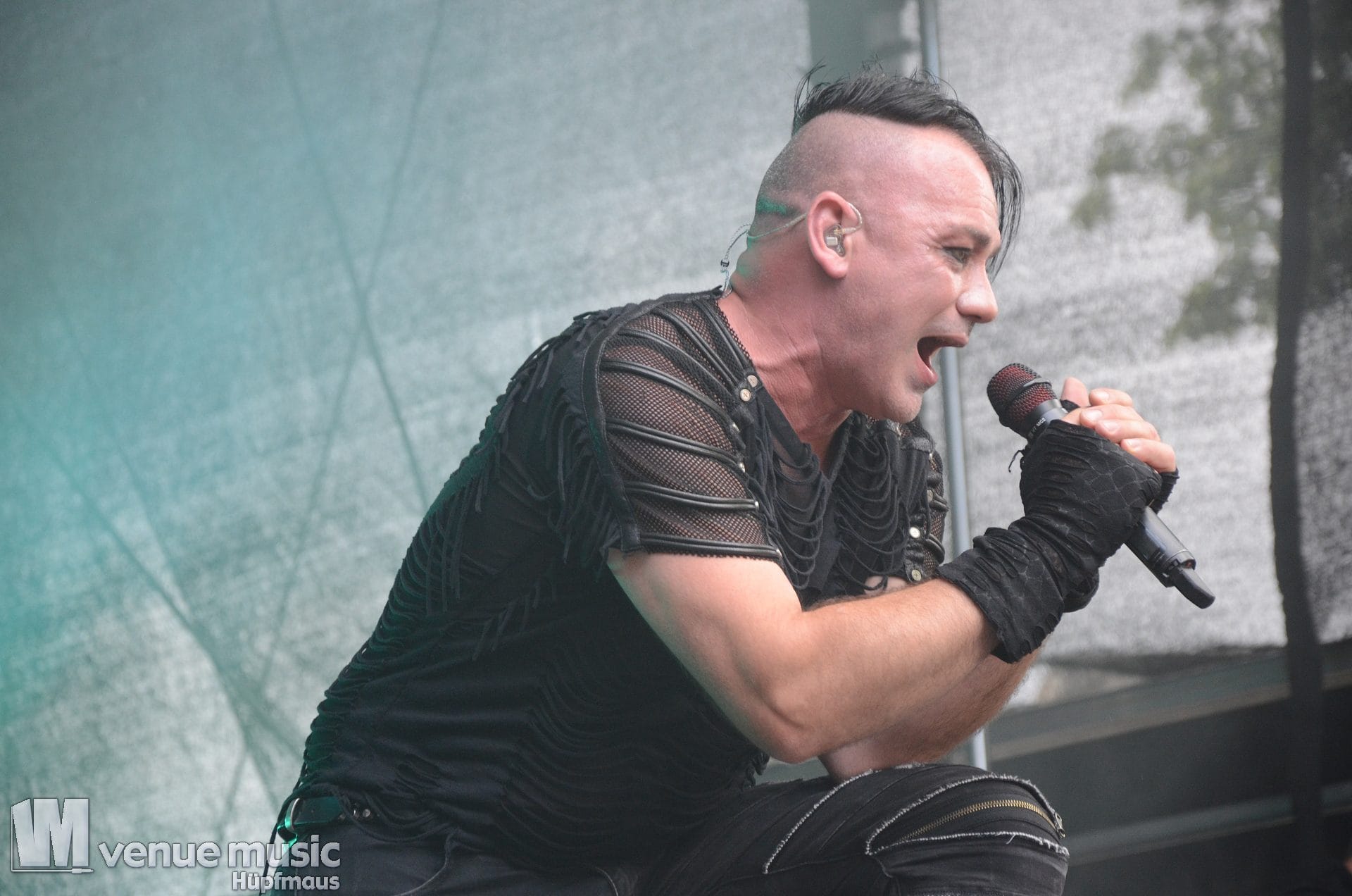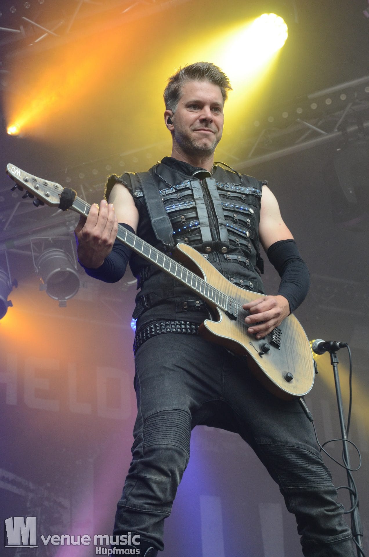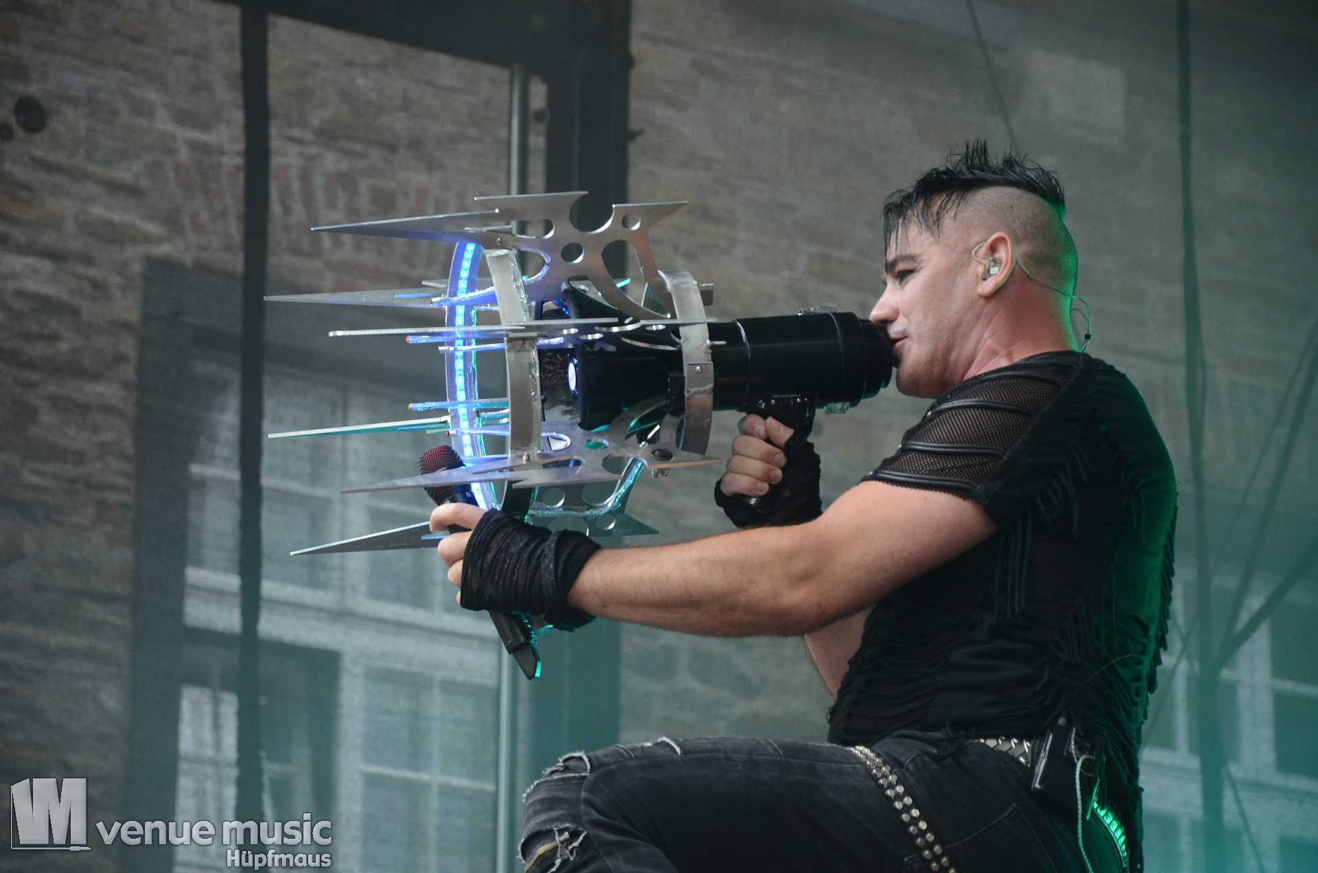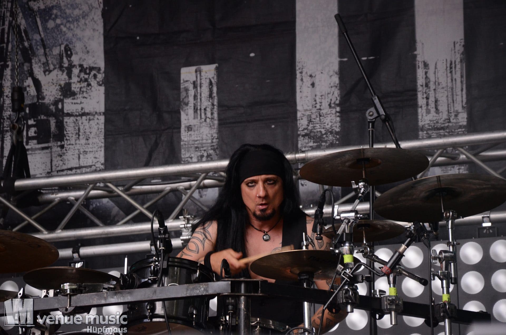 Und weiter ging es mit Neuer Deutscher Härte – Heldmaschine waren nun mit ihrem Set an der Reihe. Ich dachte noch „Moment mal, der Sänger kommt Dir aber bekannt vor“ – klar, er (und noch mehr Musiker der Band) ist ja auch Teil von Völkerball. (Die ich aber immer noch nicht live gesehen habe, dabei spielen sie so oft in Oberhausen, aber irgendwie passte es zeitlich nie bisher). Das versprach noch mal jede Menge Spaß.
