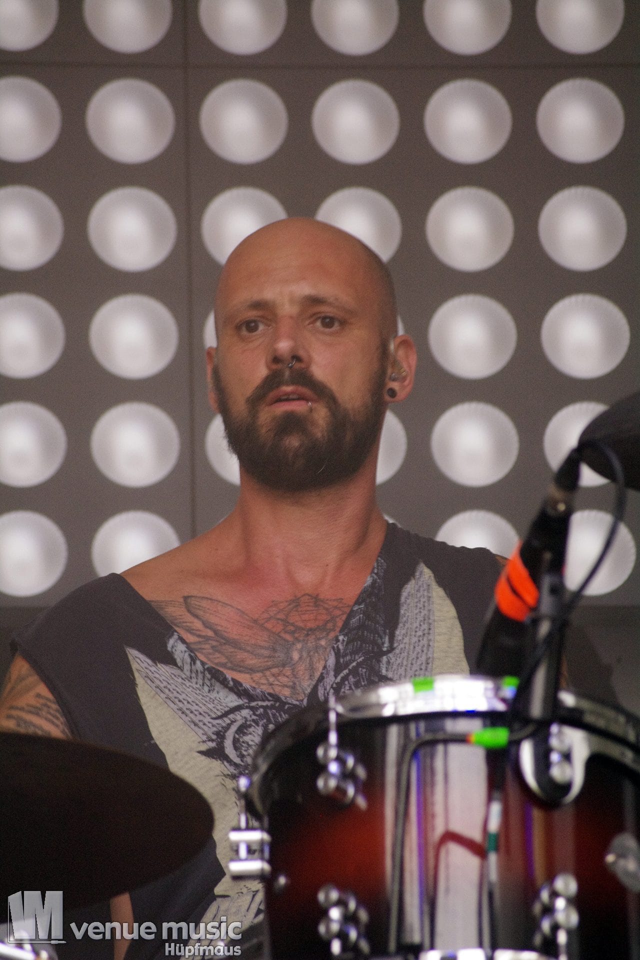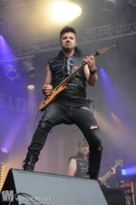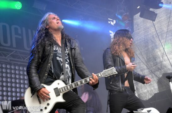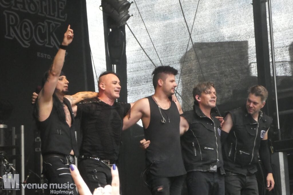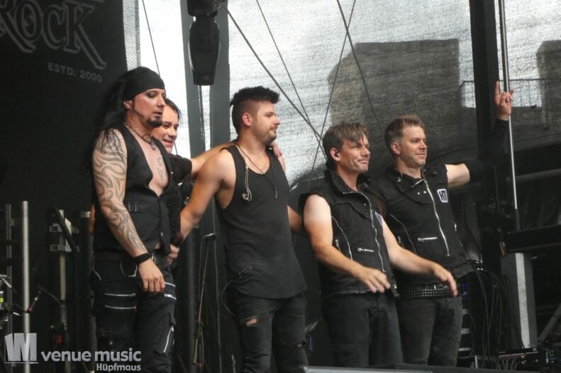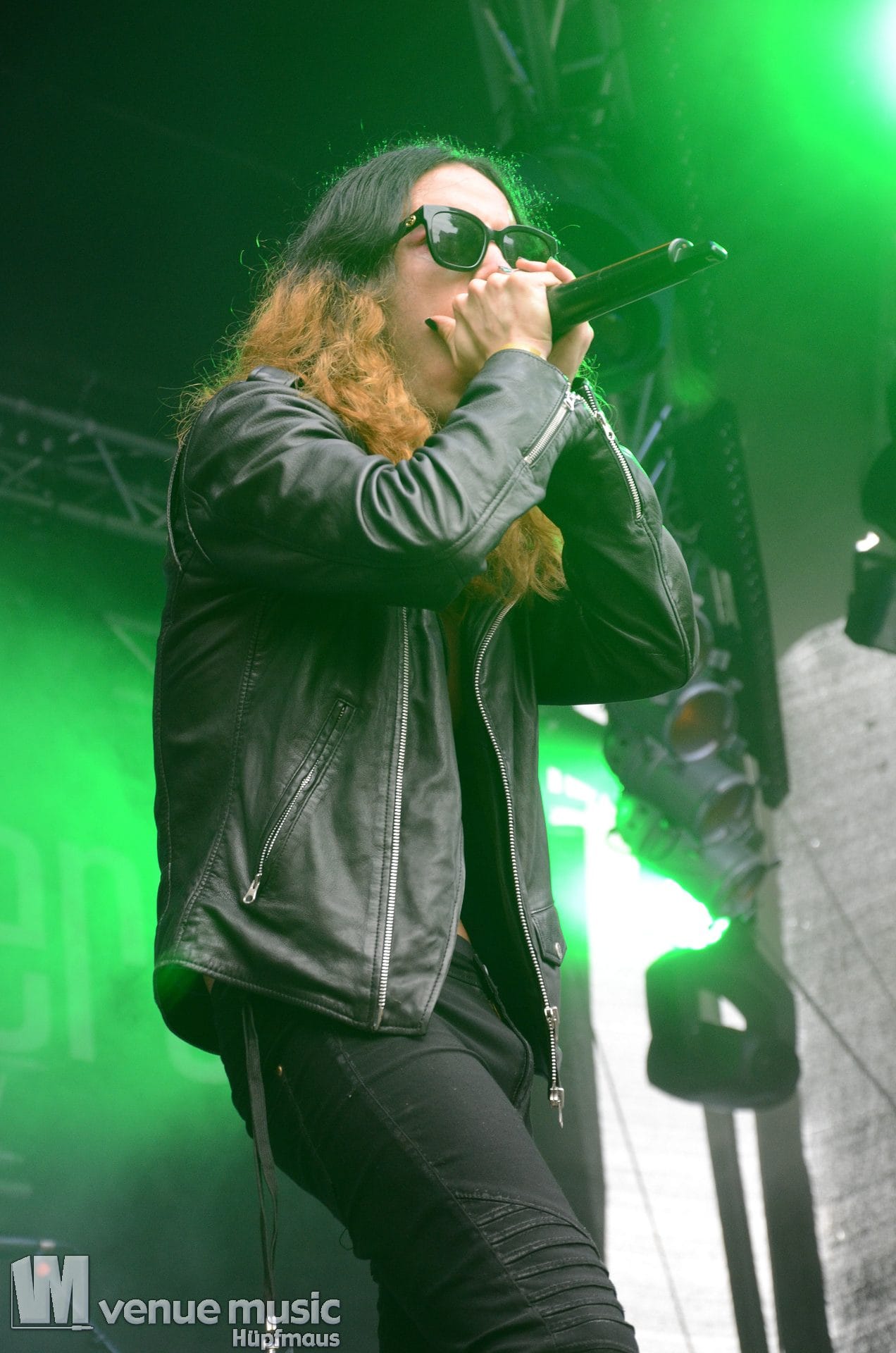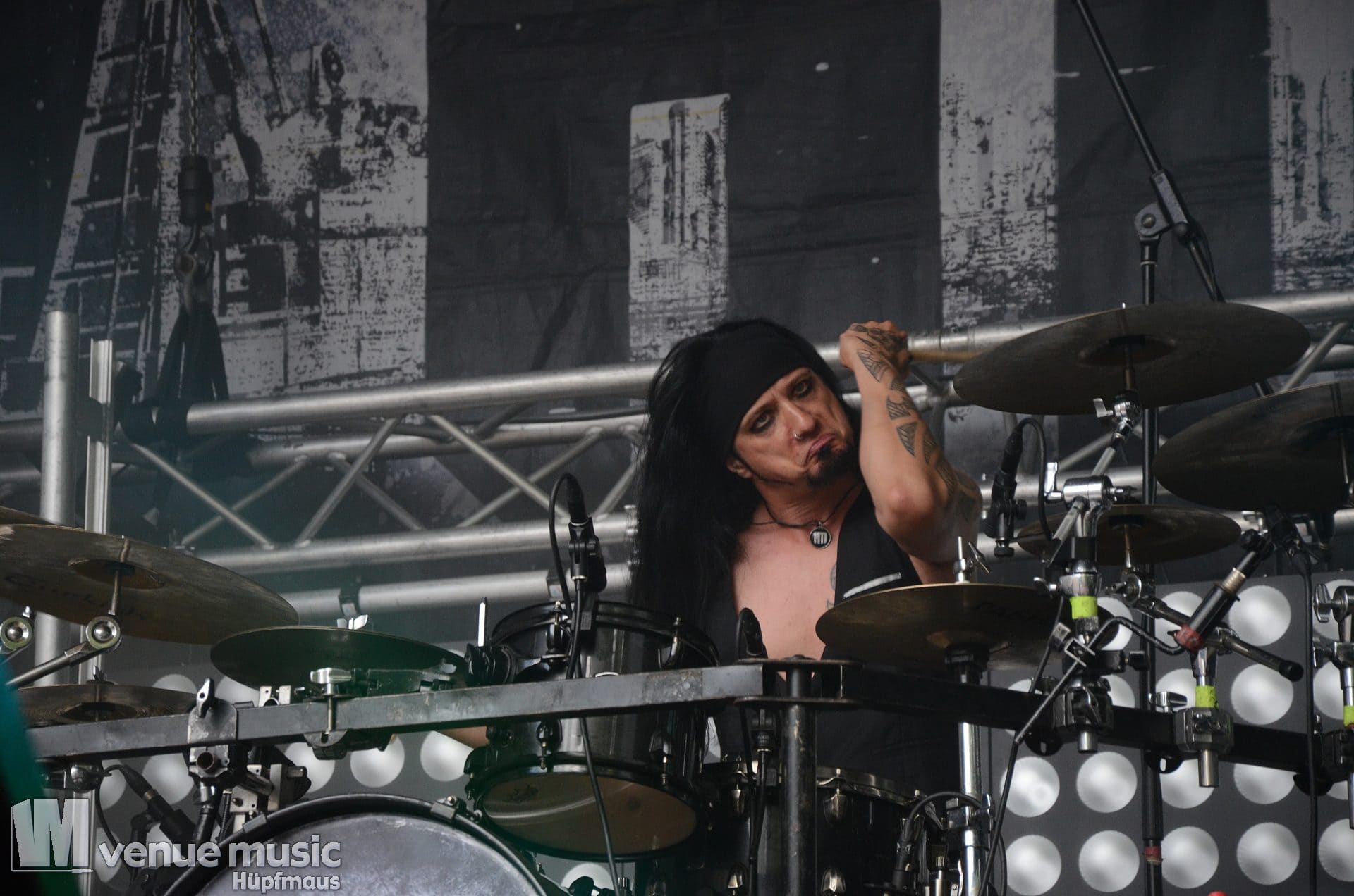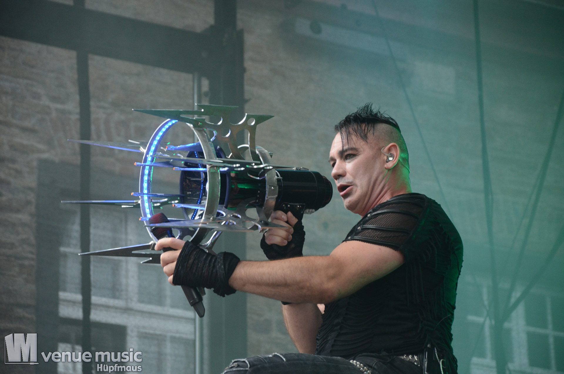 Und weiter ging es mit Neuer Deutscher Härte – Heldmaschine waren nun mit ihrem Set an der Reihe. Ich dachte noch „Moment mal, der Sänger kommt Dir aber bekannt vor“ – klar, er (und noch mehr Musiker der Band) ist ja auch Teil von Völkerball. (Die ich aber immer noch nicht live gesehen habe, dabei spielen sie so oft in Oberhausen, aber irgendwie passte es zeitlich nie bisher). Das versprach noch mal jede Menge Spaß.
