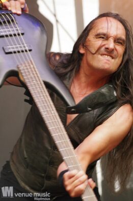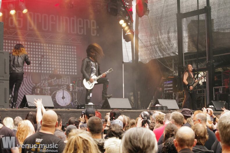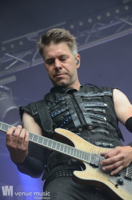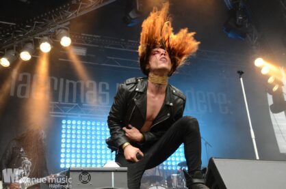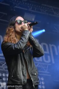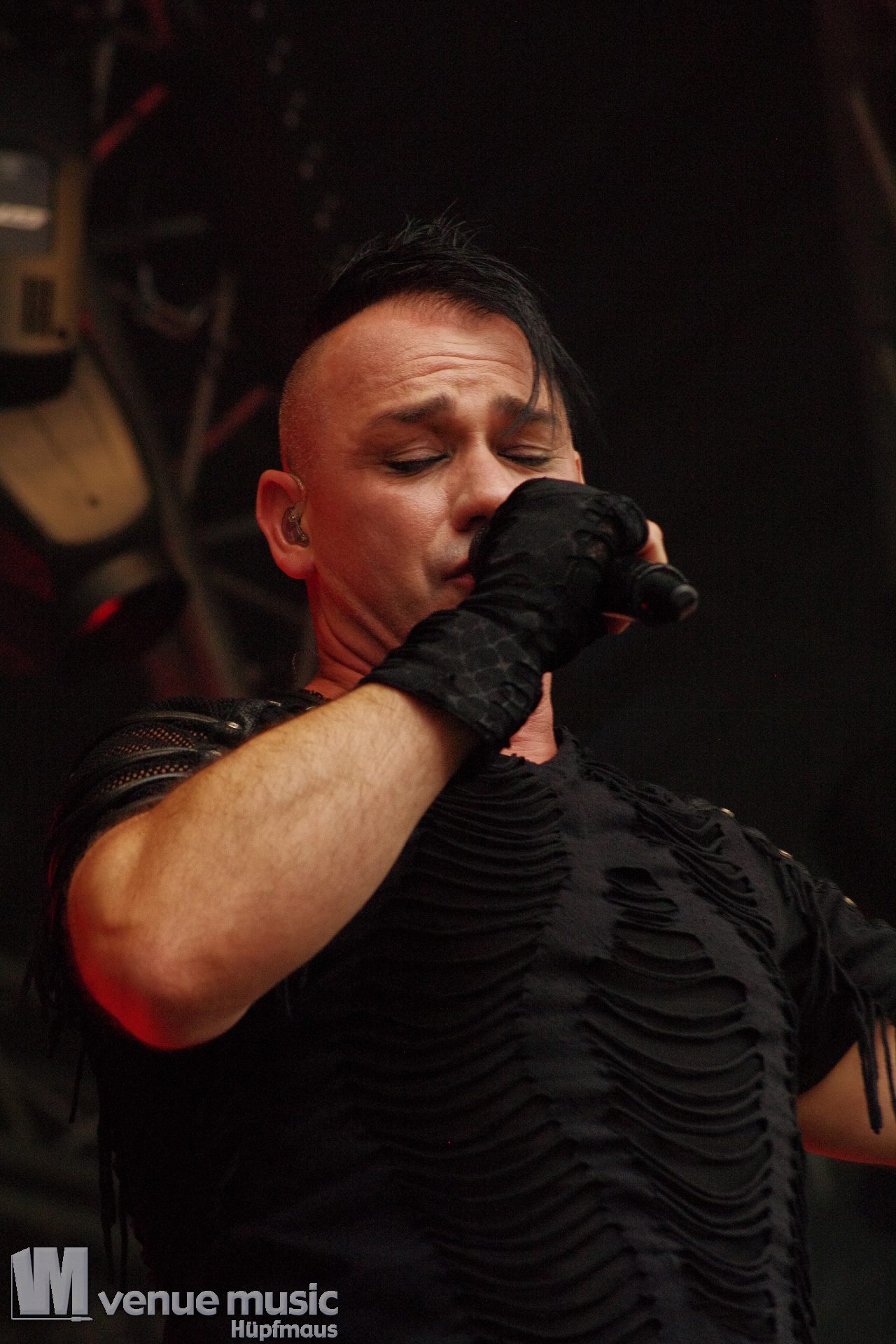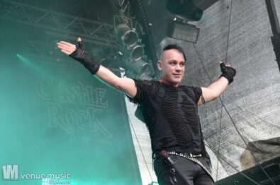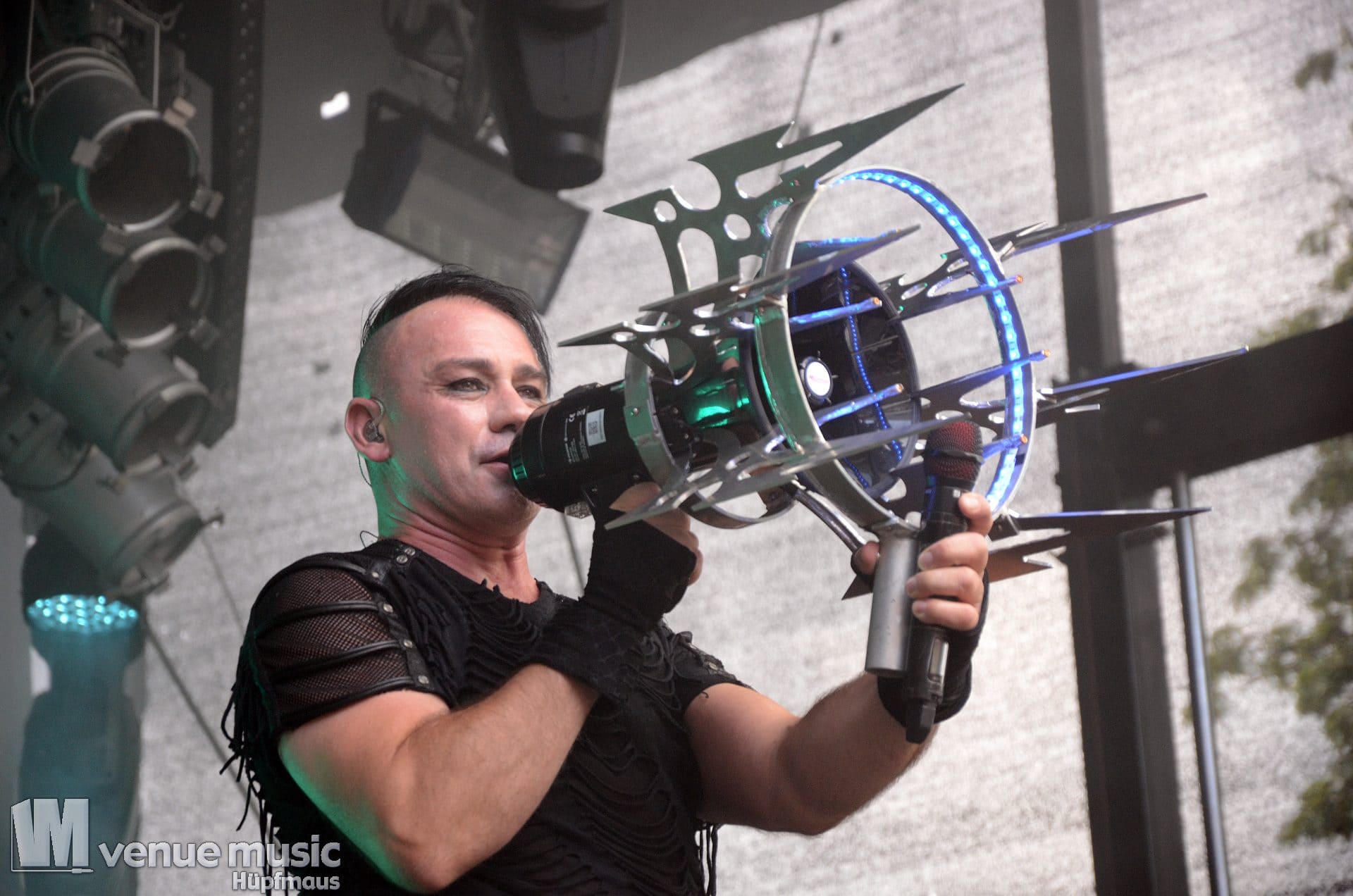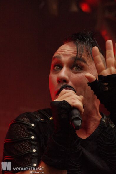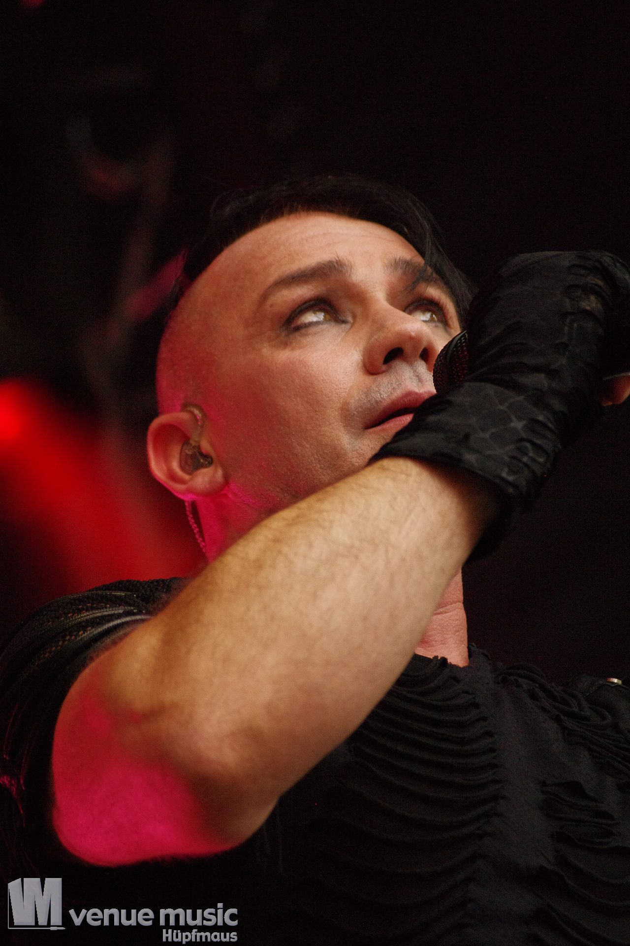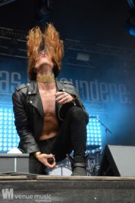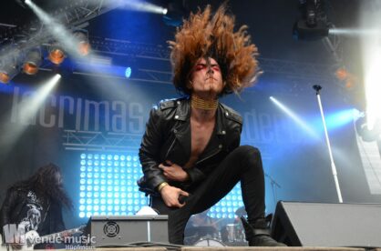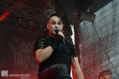 Musikalisch wieder in Richtung Dark Rock waren als nächstes Lacrimas Profundere an der Reihe. Bereits seit 30 Jahren steht Gründungsmitglied Oliver Nikolas Schmid nun schon mit der Band auf der Bühne, gab es aber doch schon viele viele Wechsel im Line-Up. Zuletzt hatte ich sie in Köln noch als Support von Mono Inc. gesehen, jetzt also rockten sie Schloß Broich. Dabei sieht Julian Larre mit dem Make-Up und den Kontaktlinsen teils ganz schön gespenstisch (oder eher vampirisch) aus.
