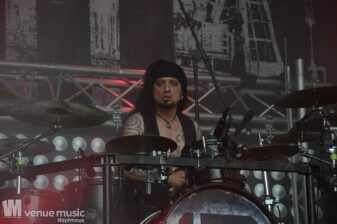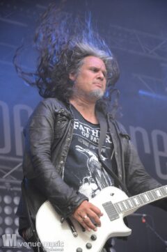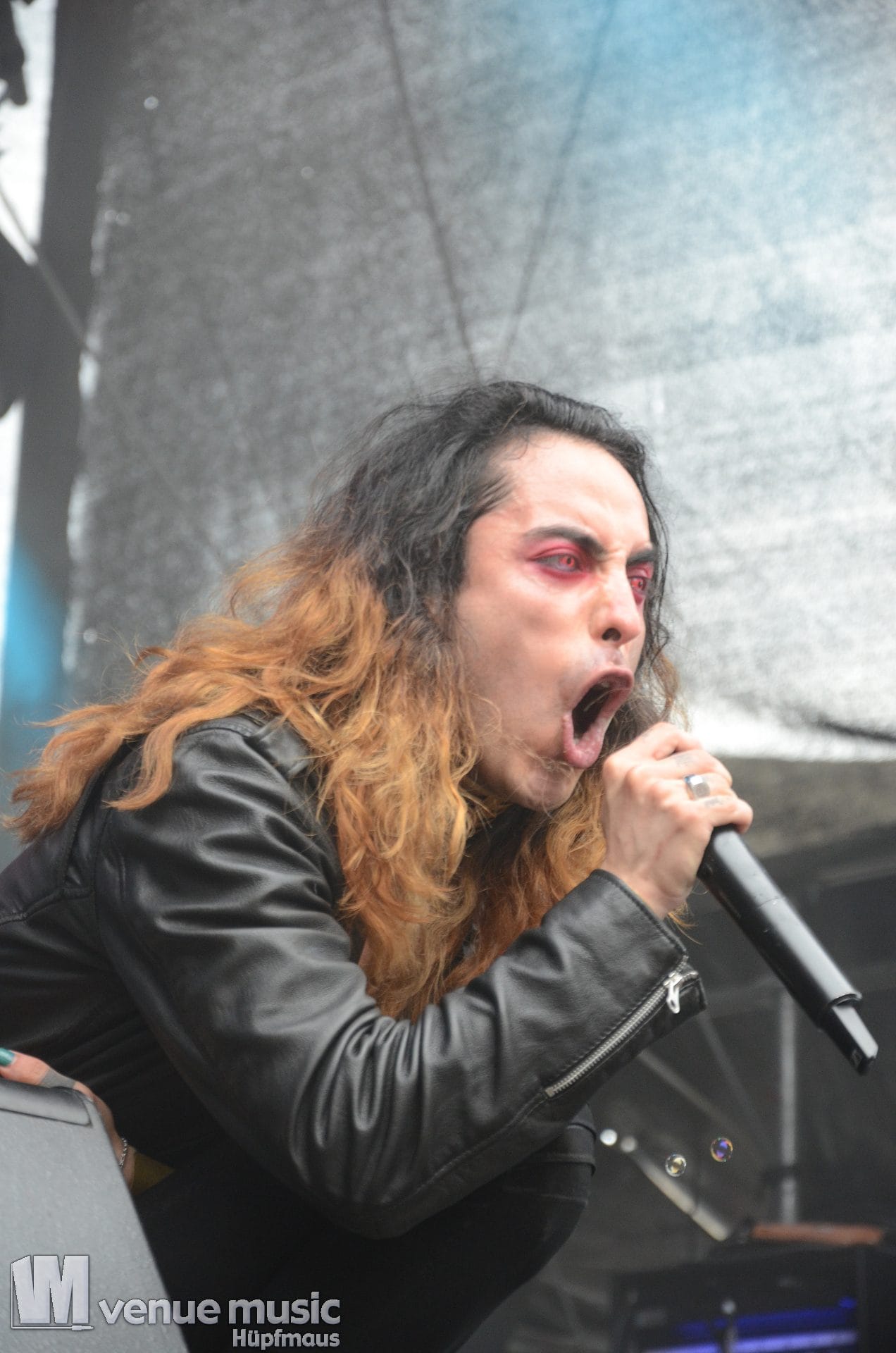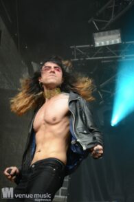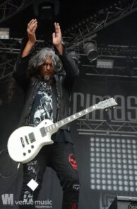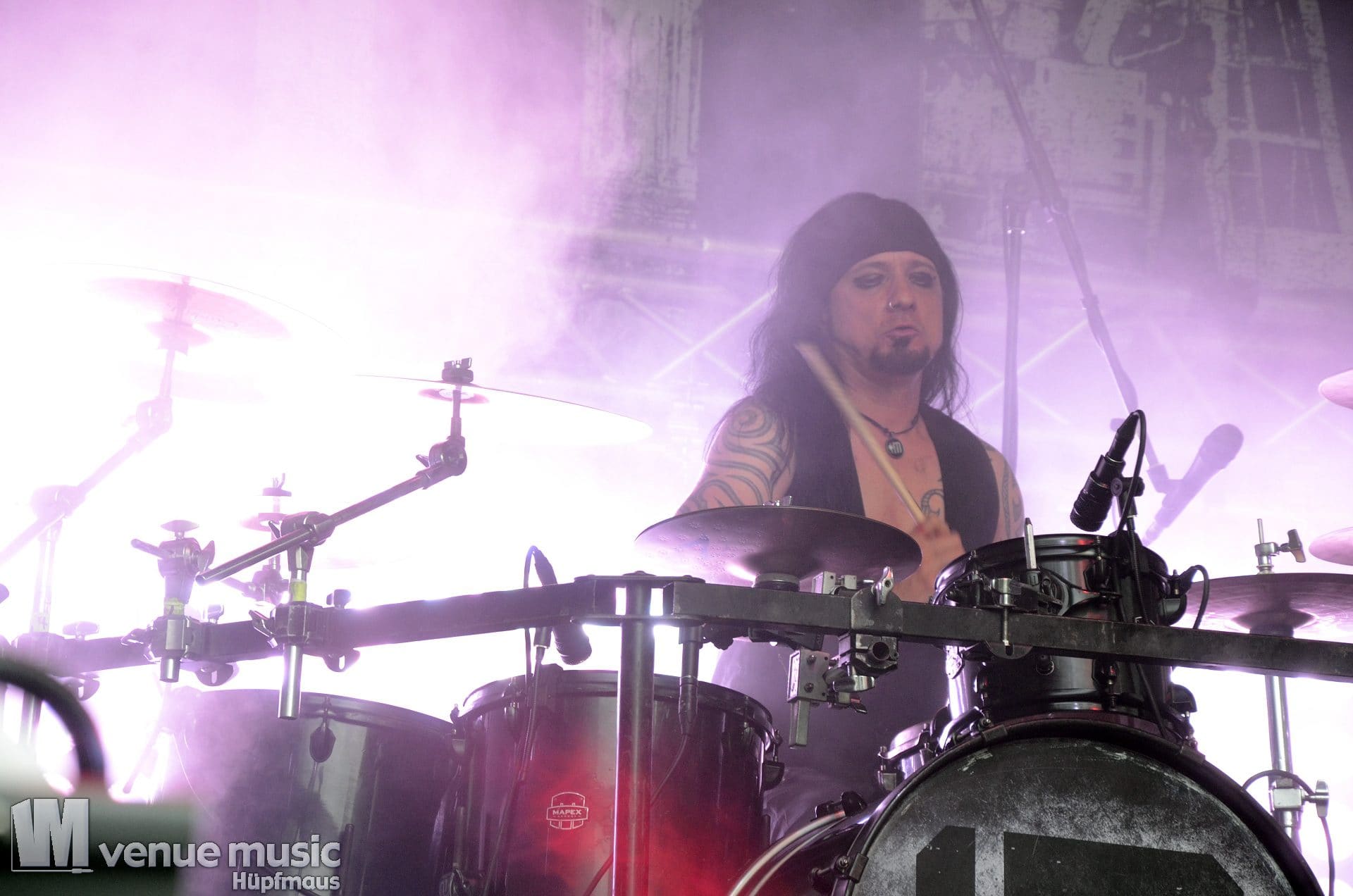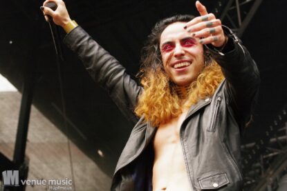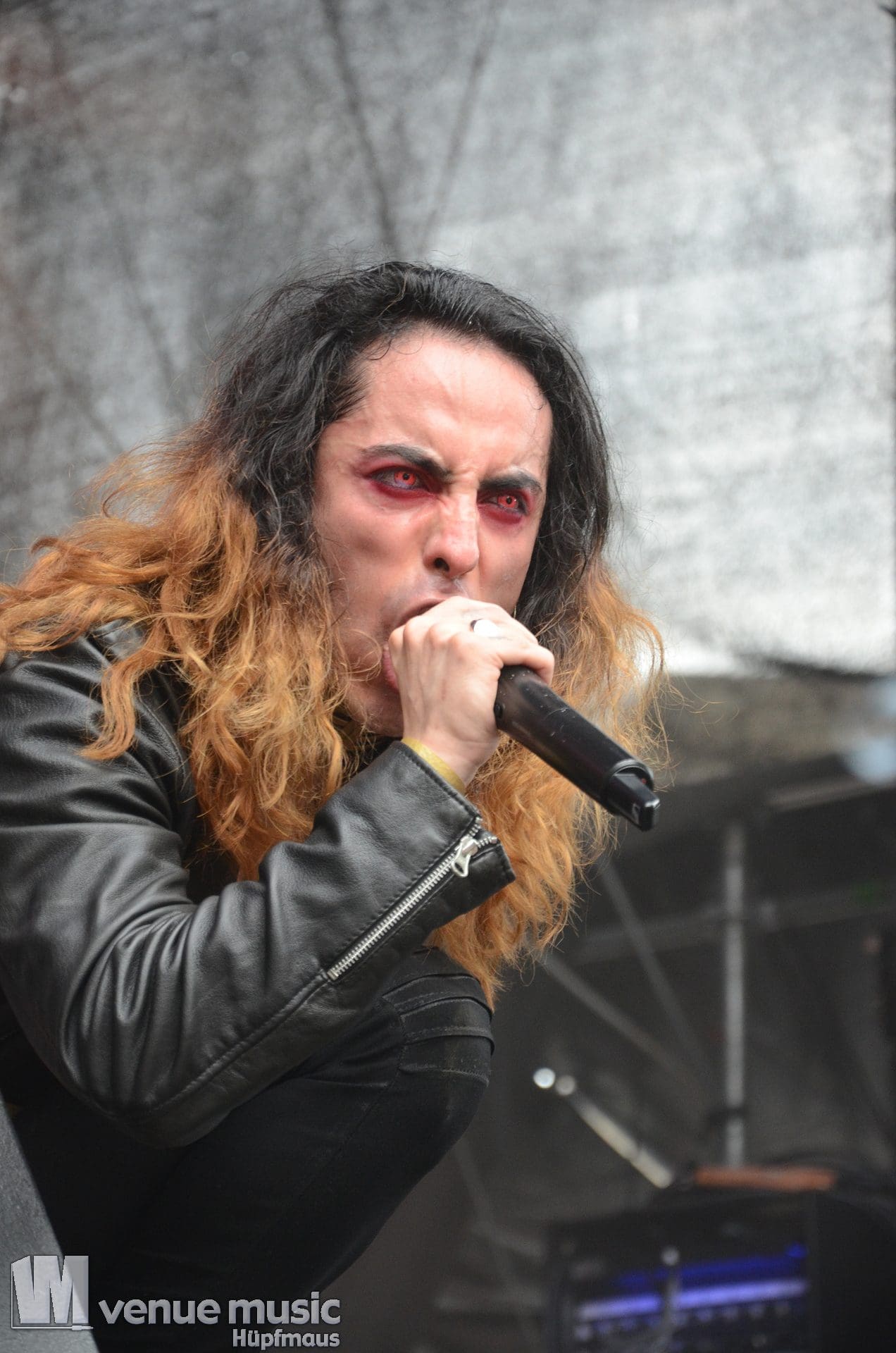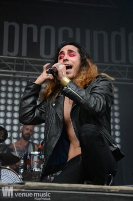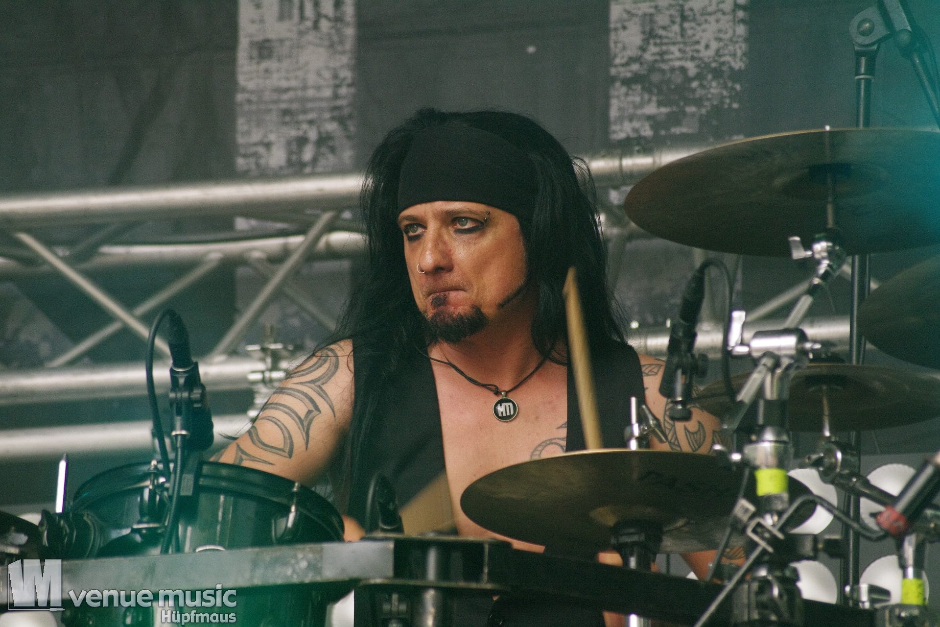 Musikalisch wieder in Richtung Dark Rock waren als nächstes Lacrimas Profundere an der Reihe. Bereits seit 30 Jahren steht Gründungsmitglied Oliver Nikolas Schmid nun schon mit der Band auf der Bühne, gab es aber doch schon viele viele Wechsel im Line-Up. Zuletzt hatte ich sie in Köln noch als Support von Mono Inc. gesehen, jetzt also rockten sie Schloß Broich. Dabei sieht Julian Larre mit dem Make-Up und den Kontaktlinsen teils ganz schön gespenstisch (oder eher vampirisch) aus.