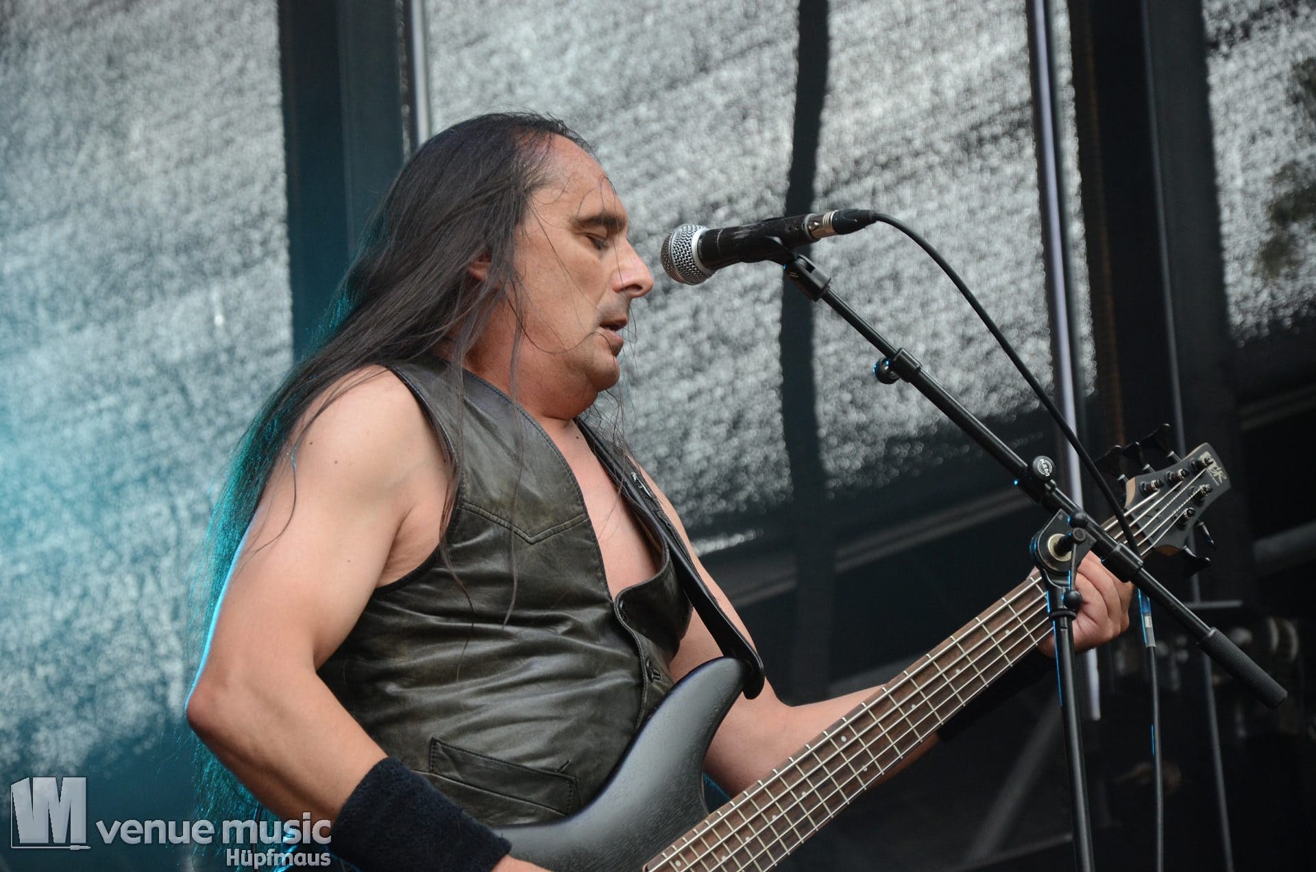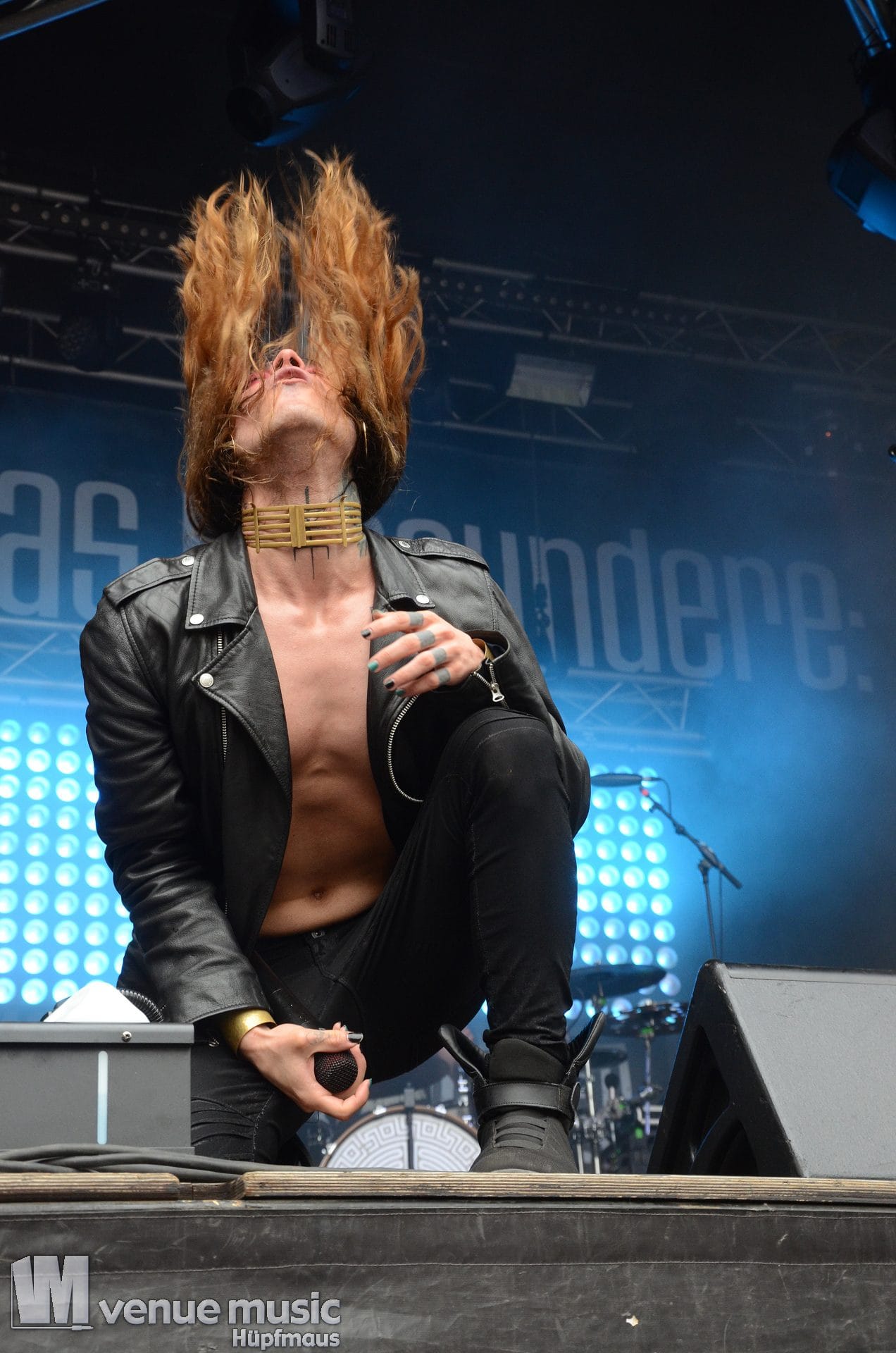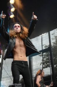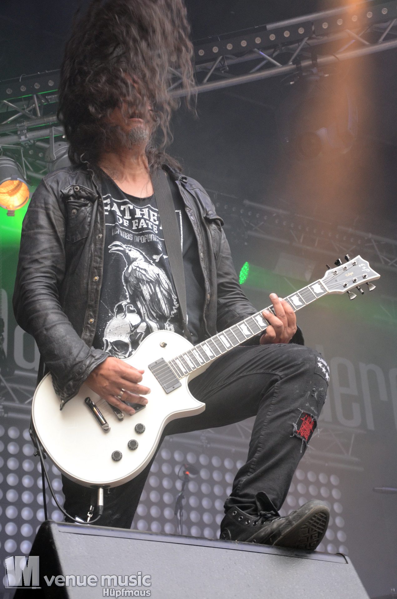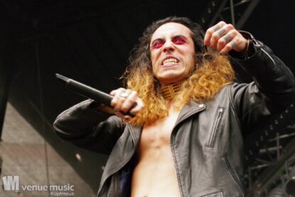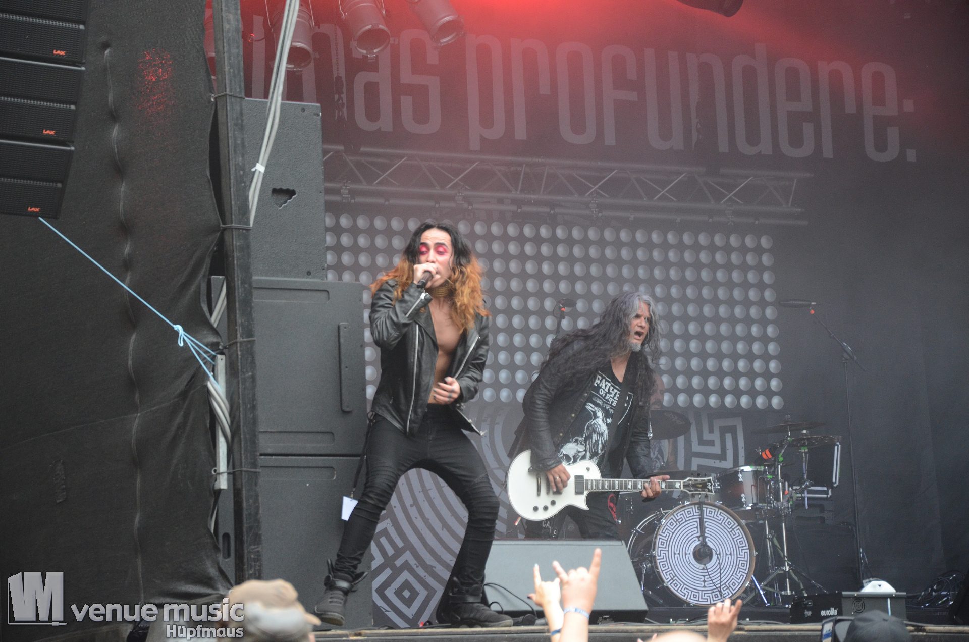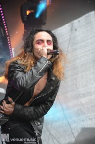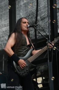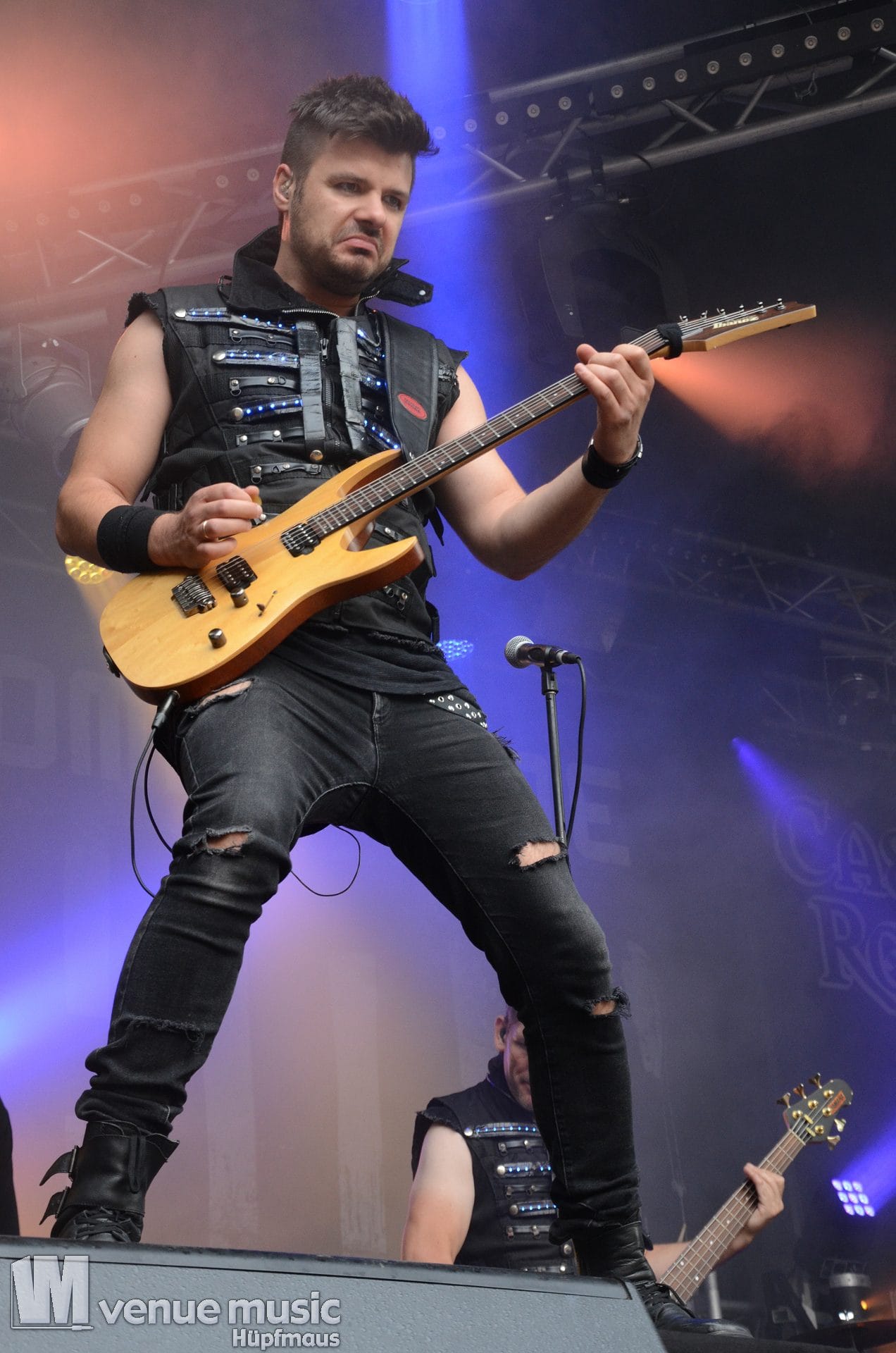 Musikalisch wieder in Richtung Dark Rock waren als nächstes Lacrimas Profundere an der Reihe. Bereits seit 30 Jahren steht Gründungsmitglied Oliver Nikolas Schmid nun schon mit der Band auf der Bühne, gab es aber doch schon viele viele Wechsel im Line-Up. Zuletzt hatte ich sie in Köln noch als Support von Mono Inc. gesehen, jetzt also rockten sie Schloß Broich. Dabei sieht Julian Larre mit dem Make-Up und den Kontaktlinsen teils ganz schön gespenstisch (oder eher vampirisch) aus.