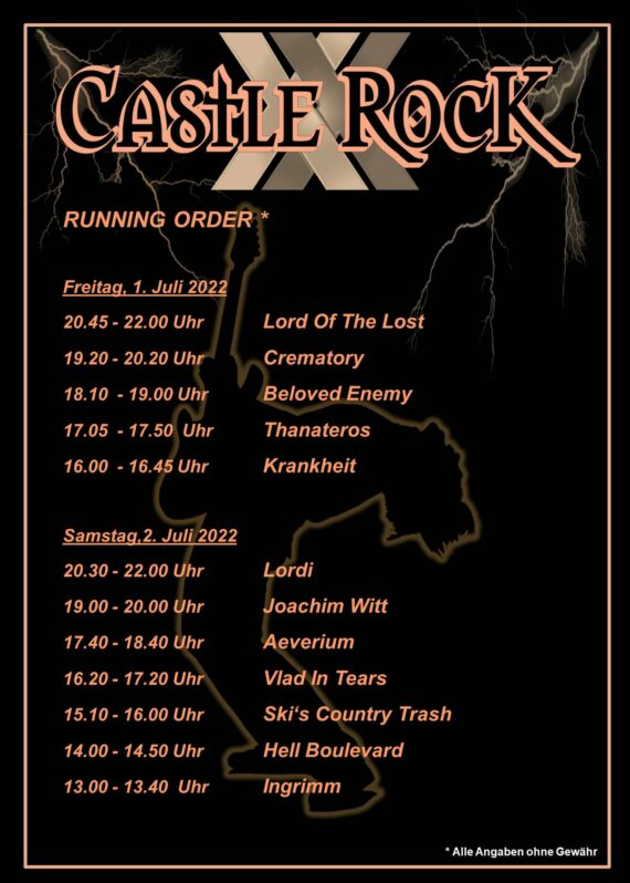 Viele der Bands sind bereits „Wiederholungstäter“ auf Schloß Broich, wie unter anderem Lord of the Lost oder Crematory (deren Sänger man aber auch eigentlich immer auf dem Festival antrifft, selbst wenn er nicht selber auf der Bühne steht). Ski King kann man direkt an beiden Tagen live erleben, einmal mit Beloved Enemy und einemal mit Ski´s Country Trash. Letztere haben auch 2021 in der Nähe vom Schloß Broich gerockt, als Michael Bohnes für uns einen Festival Ersatz „unüberhörbar“ organisiert hat.