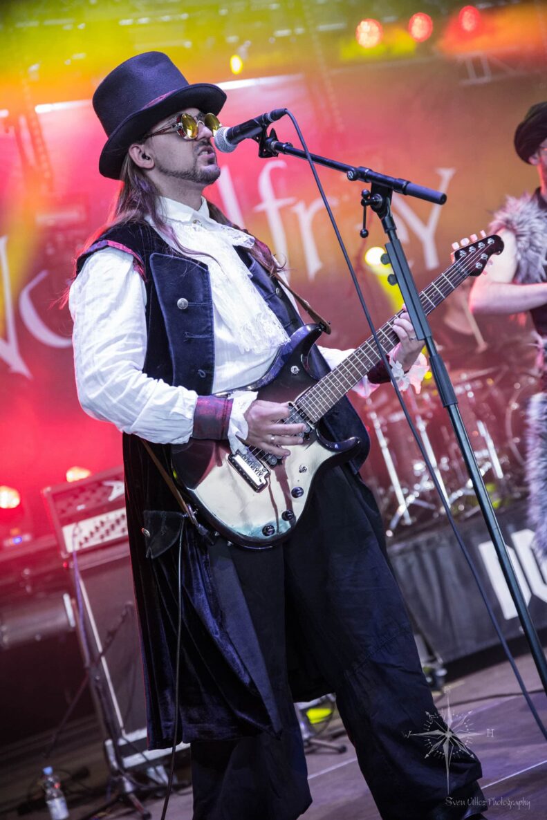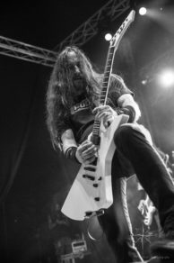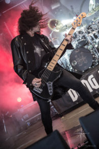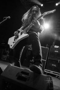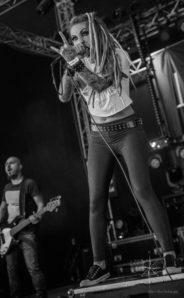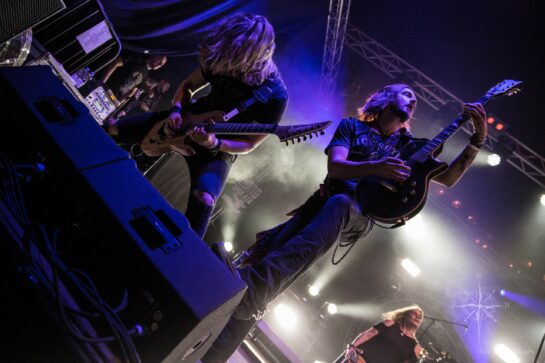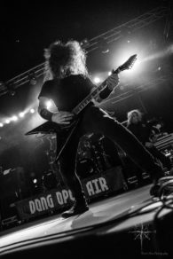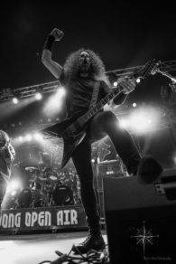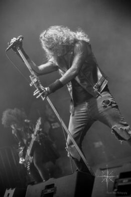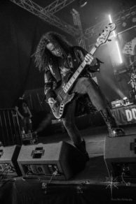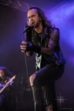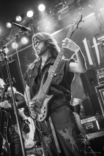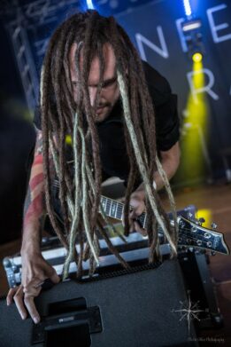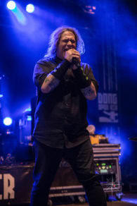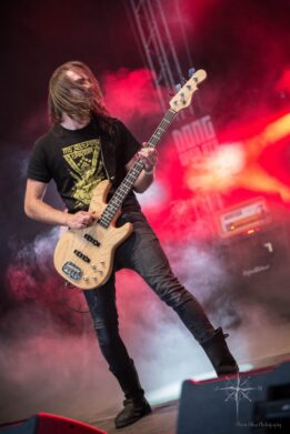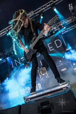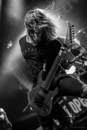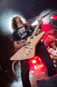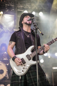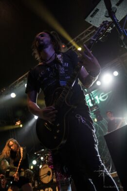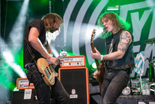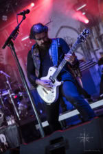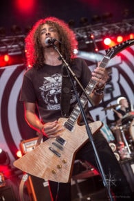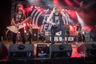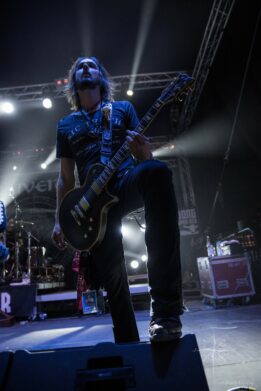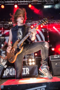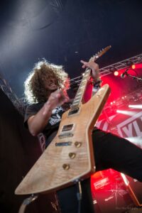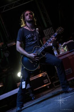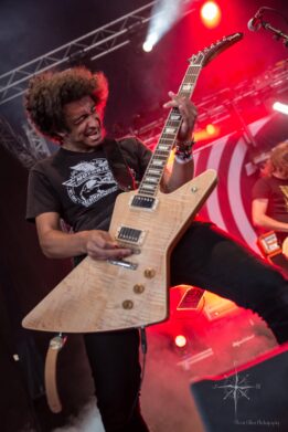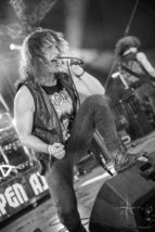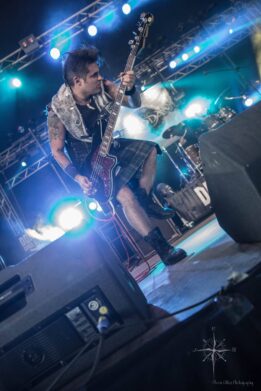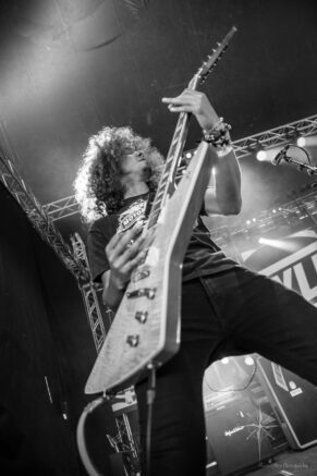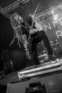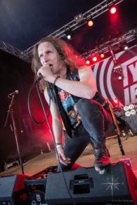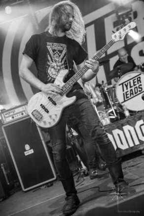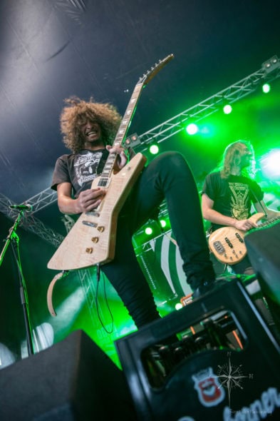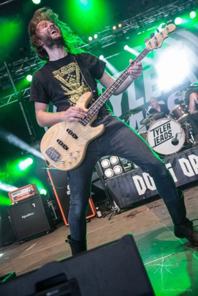 Tyler Leads, fünf Jungs aus Recklinghausen, waren angekündigt als Hard Rock mit Stoner Einflüssen und das bekam ich auch, und zwar richtig dicke. Vor allem aber eine riesige Menge Spielfreude. Ganz in ihrem Element fegten sie in einem Wirbelwind aus fliegenden Haaren, Drehungen mit und ohne Gitarre, Chuck Berry Gedächtniswalk und purer Euphorie so heftig über die Bühne, dass sich die beiden Gitarristen fast ummoshten. So muss Rock’n’Roll! Johnny der Sänger brachte sogar das Wunder zuwege kaputtere Stiefel als ich zu tragen. Wo an meinem rechten Stiefel die Sohle von Sicherheitsnadeln am Leder gehalten wird, schauten bei seinem linken Stiefel einfach unten die Zehen raus. Grandios geil, genau nach meinem Geschmack! „Sven! Du musst die Stiefel drauf kriegen!“ brüllte ich ihm noch zu, aber als erfahrender Fotograf hatte er die natürlich längst drauf.
