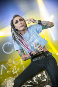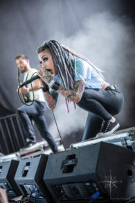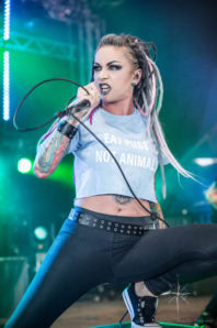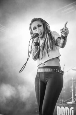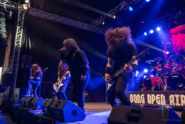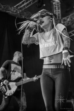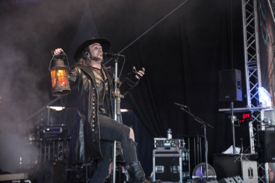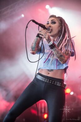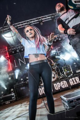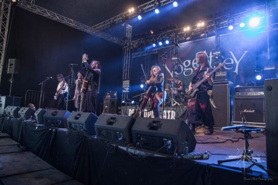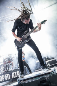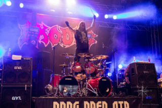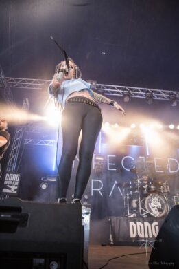 Von der Sonne gegrillt konnte ich es nicht länger im Zelt aushalten und stolperte mit verquollenen Augen in die dreckige provisorische Welt des Festivals hinaus. Was folgte, war ein unbändiger Schrecken. So sehr ich meine Augen rieb und versuchte wieder klar im Kopf zu werden, ich konnte nur noch verschwommen sehen. Das musste an diesem scheiß Glitzerzeug liegen. Ich versuchte schwankend meinen Blick zu fokussieren, aber es half nichts. „Sven, Verdammte Scheiße, ich bin blind!! Ich hab mich gestern blind gesoffen! Scheiße, ich bin blind!“. „Schnitzel, hast du schon versucht deine Brille aufzusetzten?“. Tatsache, ich bin ja Brillenträger, hatte ich ganz vergessen. Mein Sehgestell machte die Sache auch gleich viel besser. Trotzdem, der dicke Schädel war auch diesen Morgen vorhanden, also fackelte ich nicht lange, nahm mir eine Tablette und spülte sie mit einem Kaffee aus dem Backstage runter. Sven war bereits wieder voll in seinem Element und Triddana fotografieren gegangen, ich musste mich noch regenerieren. Zu diesem Zweck rauchte ich mit Tina, die mir erzählte, sie komme zwar von hier sei aber inzwischen Musikerin in London, eine Offensive Zigarette. Das interessante Gespräch mit ihr und – endlich – der Erwerb meiner eigenen Wertmarken ließ mich auch noch Fabulous Desaster verpassten. Dafür war die nächste Band, die auf die ich mich am meisten freute und auch zu meinem persönlichen Highlight wurde.