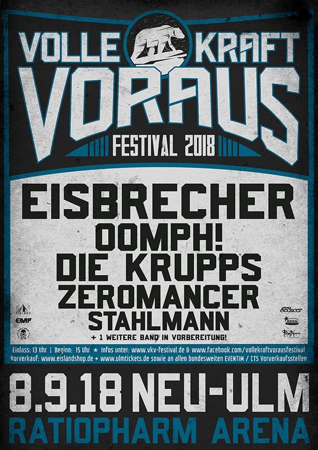 Nach dem Erfolg des ersten „Volle Kraft voraus“-Festivals 2017 nehmen Eisbrecher nun Kurs auf die zweite Ausgabe ihres Sommerevents. Am 8. September 2018 wird die Neu-Ulmer Ratiopharm Arena gerockt. Mit dabei sind sechs Bands, die in einer wetterunabhängigen und teilbestuhlten Top-Location, samt Open-Air Chill-Out-Bereich, Food-Area, Händlermeile und Autogrammstunden spielen werden.