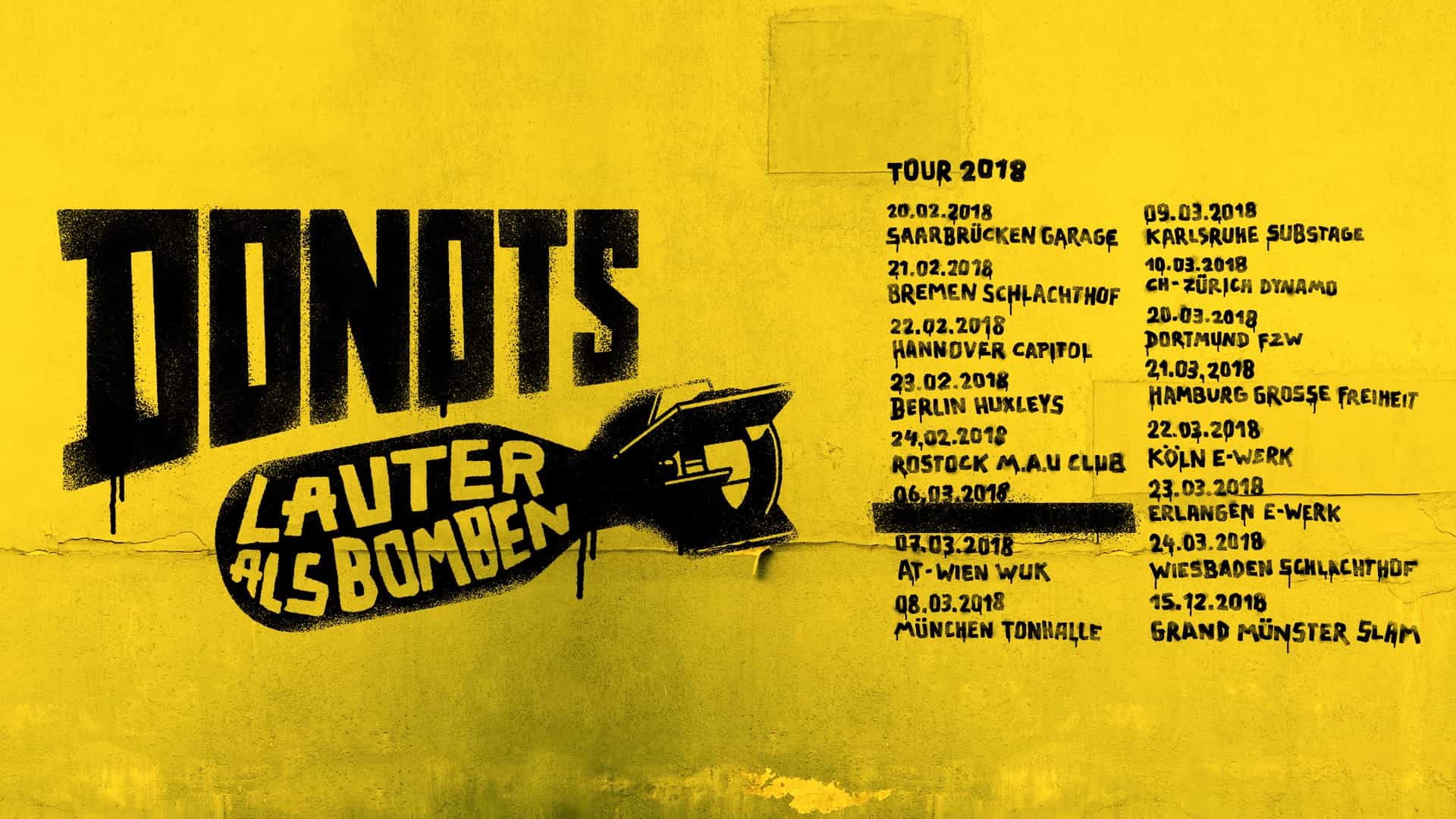 Das dürfte nicht nur Donots-Fans freuen: Anfang 2018 geht die Band wieder auf Tour. Unter dem Motto „Lauter als Bomben“ geht es am 20. Februar 2018 in Saarbrücken los. Und immerhin je ein Auftritt in Österreich und der Schweiz sind Teil der Tour. Und es wird wohl nicht nur bei der Tour bleiben, die Presseinfo zur Tourankündigung spricht von neuen Songs, an denen die Band im eigenen Studio klammheimlich gearbeitet hätte, dem reaktivierten eigenen Label und kündigt für 2018 weitere Überraschungen an. Nun ja, ein neues Album im kommenden Jahr würde nach Lektüre dieser Presseinfo wohl niemanden mehr überraschen, also haben die fünf Westfalen hoffentlich noch mehr in ihrer Kreativpause ausgetüftelt.