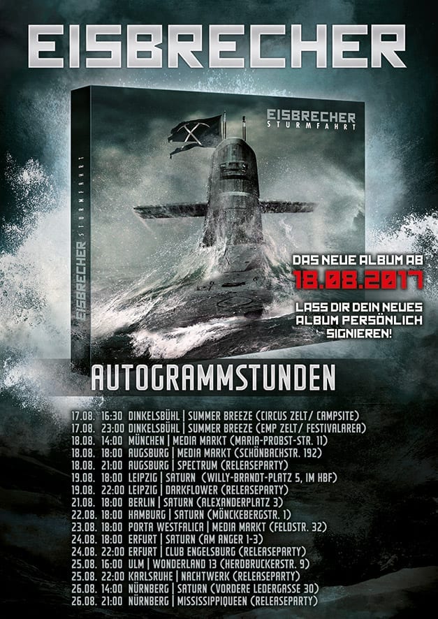 Es wird wieder kalt – und das, wo der Sommer doch schon verregnet genug ist. Sind womöglich Eisbrecher schuld? ;-) Die Jungs nehmen erneut Fahrt auf und schockgefrieren mit ihrem neuen Album „Sturmfahrt“ (vorbestellen bei Amazon(*) oder bei iTunes(*)) am 18. August das Gothic-/Industrial-/Rock-/Metal-Genre – mit harten Grooves vor der Brust und einem breiten Grinsen im Gesicht. So wie man es eigentlich von der Band gewohnt ist. Und das neue Album ist wahnsinnig abwechslungsreich: Von Industrial-Tracks über eine krasse Coverversion des Grauzone-Klassikers „Eisbär“ bis hin zu rockigen Nummern – es ist alles dabei.