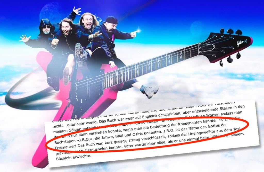 Tatsache ist, dass eine bislang vollkommen unverdächtige Band aus Erlangen nicht nur bei den Freimaurern mitmischt, sondern diese sogar anführt! Sie sind sogar so dreist treten dabei mit ihrem Freimauerer-Namen auf: J.B.O.! Diese drei Buchstaben stehen für die Götter Jahwe, Baal und Osiris. J.B.O. ist der Name des Gottes der Freimaurer! Vertuschen konnten die Freimauerer diese offensichtliche Verbindung nur durch geschickte Manipulationen, die mit Hilfe der komplett von ihnen kontrollierten Musikindustrie durchgeführt wurden. Mit Hilfe der Plattenfirma von James Last wurde die Legende konstruiert, dass der Name die Abkürzung für „James Blast Orchester“ wäre.