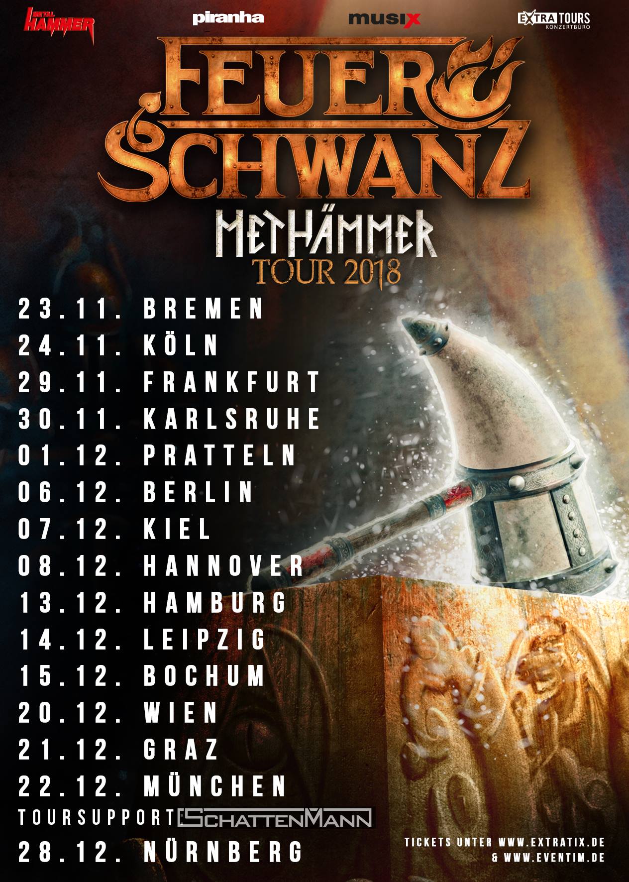 Im Hause Feuerschwanz ging es in den letzten Monaten ganz schön turbulent zu: Der Bassist verließ die Band (wenn ihr uns fragt, dann war er wohl einfach nur verschlissen, was bei Bassisten durchaus mal vorkommt) und wurde durch „Jarne Hodinsson“ ersetzt und vor einigen Monaten versammelte sich der ganze Haufen im Great Hall Studio bei Simon Michael, um einen neuen Longplayer aufzunehmen. Die Damen und Herren machen es wirklich spannend. Erst die geheimnisvolle Enthüllung des neuen Bassisten und dann spannte man uns noch mit der Enthüllung des Album-Covers und -Namens auf die Folter. „Methämmer“(*) heisst gute Stück und wird am 17.08.2018 in den Läden stehen. Eine erste Kostprobe gibt’s jetzt in Form eines Videos zum Song „Die Hörner hoch“, eine echte Partynummer, die auf Festivals sicher gut ankommen wird.
