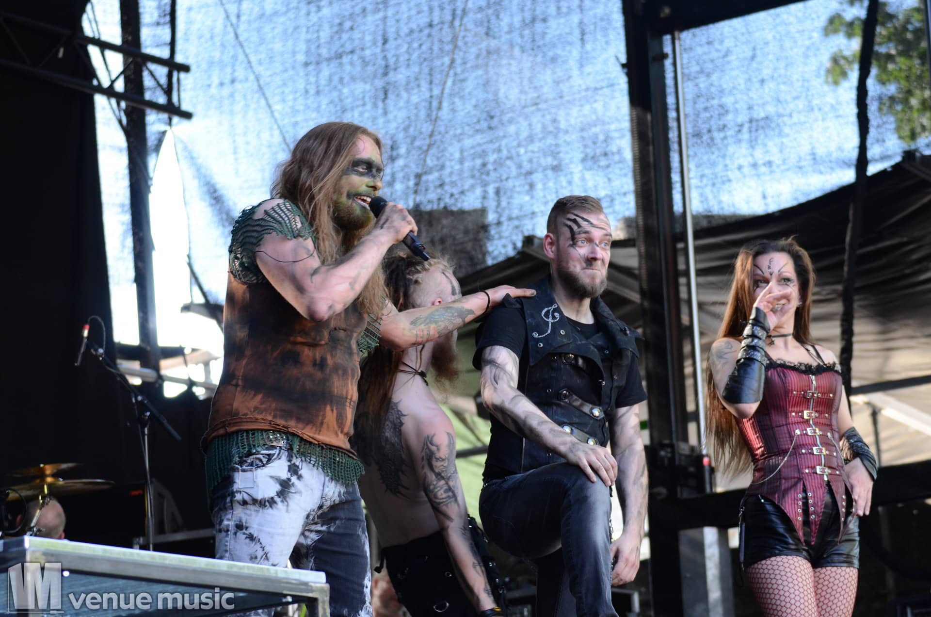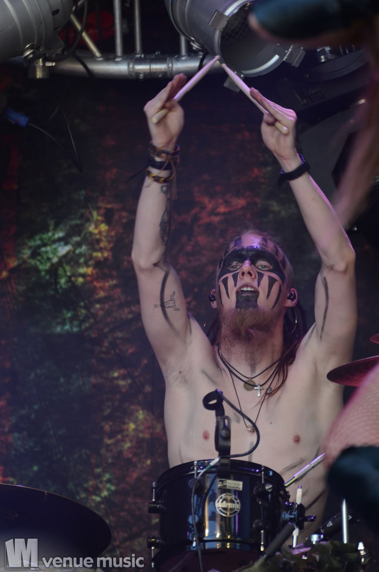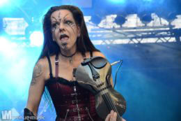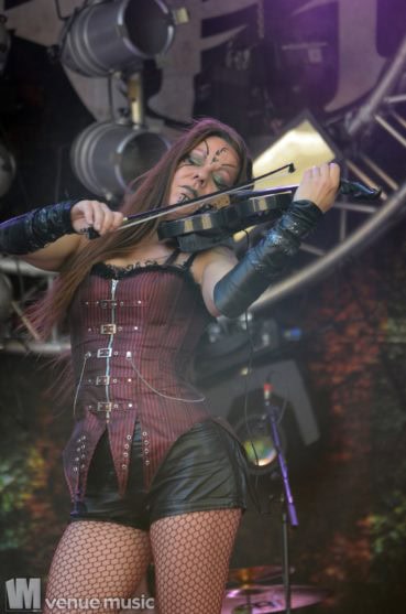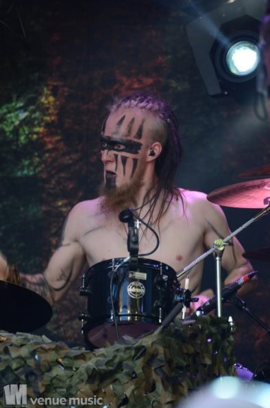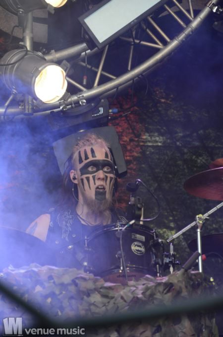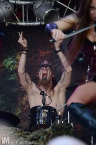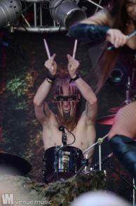 Noch mehr gab es dann mit Harpyie: mehr Musiker auf der Bühne, mehr verschiedene Instrumente und mehr Verkleidung und Schminke ;) aber mindestens genau so viel Stimmung. Unter anderem durch die Violine wirkt die Musik fröhlich und lädt zum Tanzen ein. Aber auf einem Festival haben die Bands natürlich nicht so viel Zeit, aber Sänger „Aello die Windböe“ hat es sich nicht nehmen lassen, mit diversen Ansagen das Publikum zu motivieren: „Ihr müsste lauter klatschen, so dass wir es hören können“ oder „seid Ihr bereit für noch mehr Hitze“ luden natürlich zum Stimmung machen ein. Aber als er fragte, ob uns im Publikum auch so warm sei und die Band überlegen würde, sich ganz nackig zu machen und was wir denn davon hielten, war es anscheinend vielen im Publikum schon zu warm, um auch nur zu antworten, denn Aello meinte „Das habe ich auch schon enthusiastischer gehört“. Und so behielten die Musiker ihre Klamotten an ;) Mit Songs wie „Fauler Zauber“, „Schwarzer Mann“ und „Löwenherz“ begeisterten Harpyie das Publikum – inklusive mir!