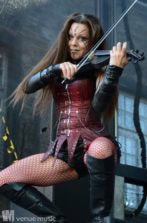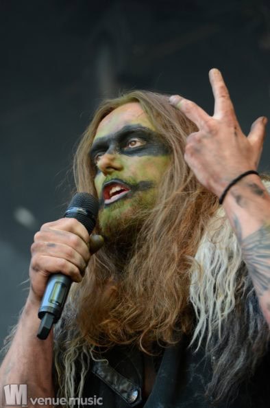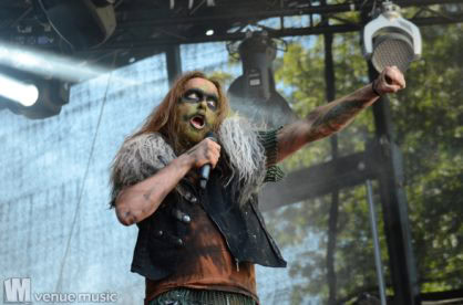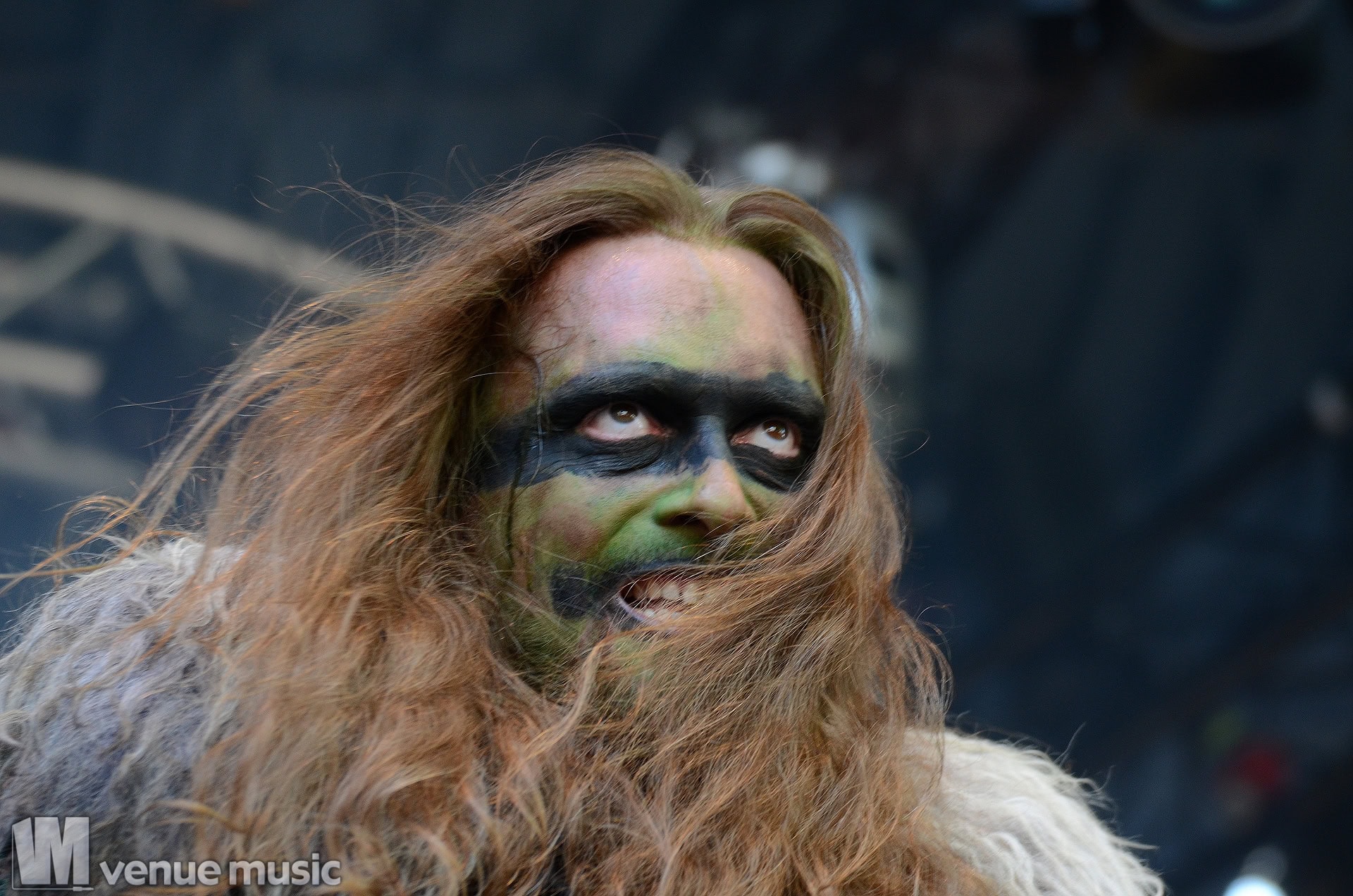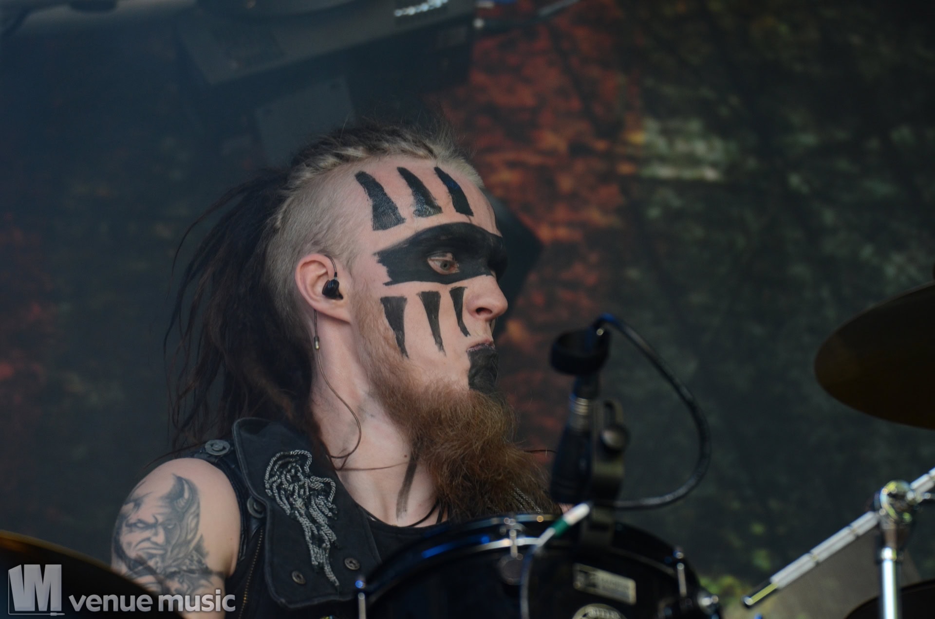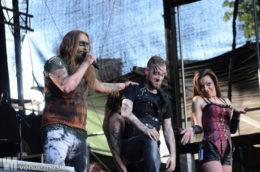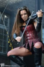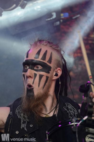 Noch mehr gab es dann mit Harpyie: mehr Musiker auf der Bühne, mehr verschiedene Instrumente und mehr Verkleidung und Schminke ;) aber mindestens genau so viel Stimmung. Unter anderem durch die Violine wirkt die Musik fröhlich und lädt zum Tanzen ein. Aber auf einem Festival haben die Bands natürlich nicht so viel Zeit, aber Sänger „Aello die Windböe“ hat es sich nicht nehmen lassen, mit diversen Ansagen das Publikum zu motivieren: „Ihr müsste lauter klatschen, so dass wir es hören können“ oder „seid Ihr bereit für noch mehr Hitze“ luden natürlich zum Stimmung machen ein. Aber als er fragte, ob uns im Publikum auch so warm sei und die Band überlegen würde, sich ganz nackig zu machen und was wir denn davon hielten, war es anscheinend vielen im Publikum schon zu warm, um auch nur zu antworten, denn Aello meinte „Das habe ich auch schon enthusiastischer gehört“. Und so behielten die Musiker ihre Klamotten an ;) Mit Songs wie „Fauler Zauber“, „Schwarzer Mann“ und „Löwenherz“ begeisterten Harpyie das Publikum – inklusive mir!