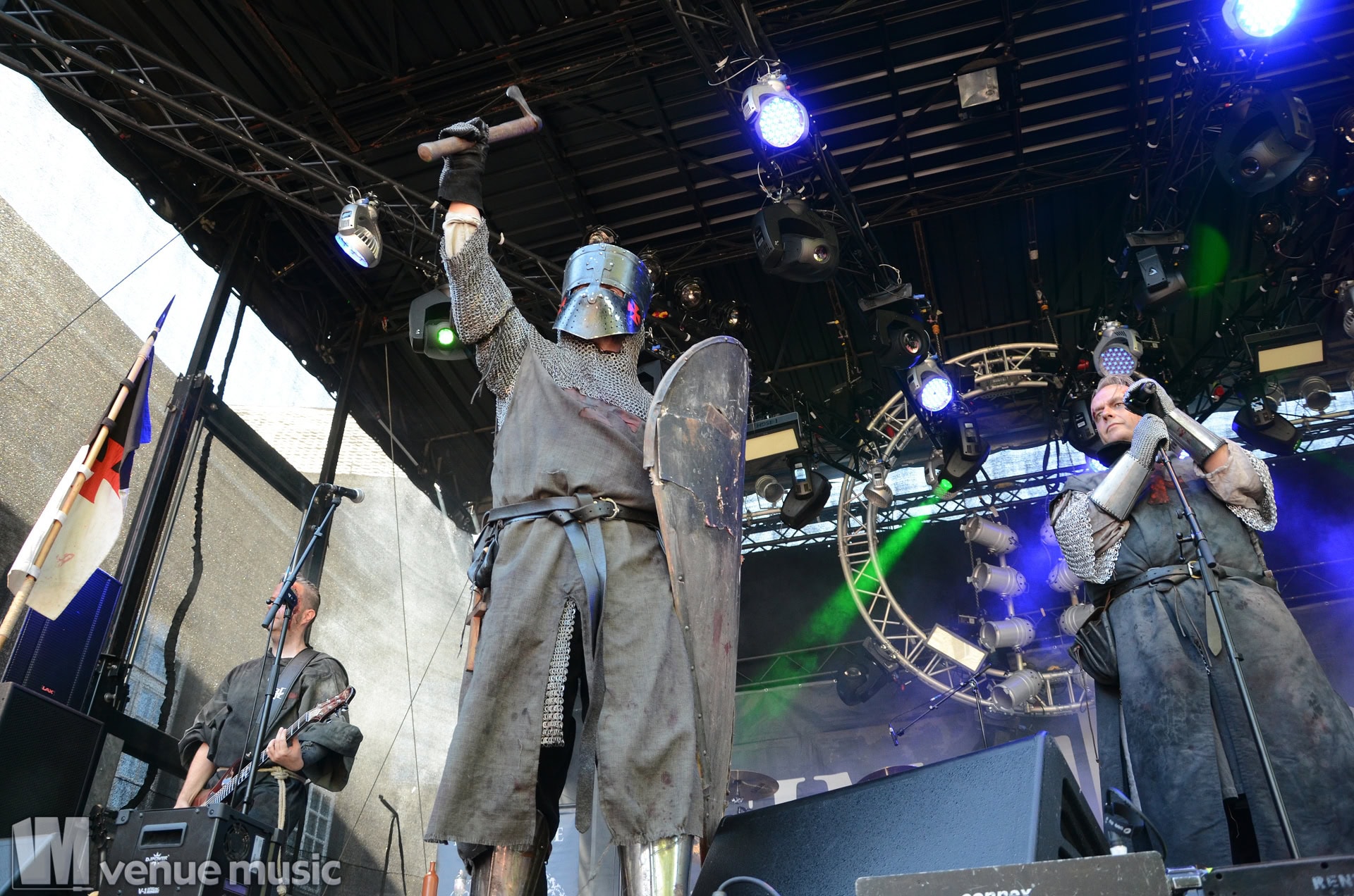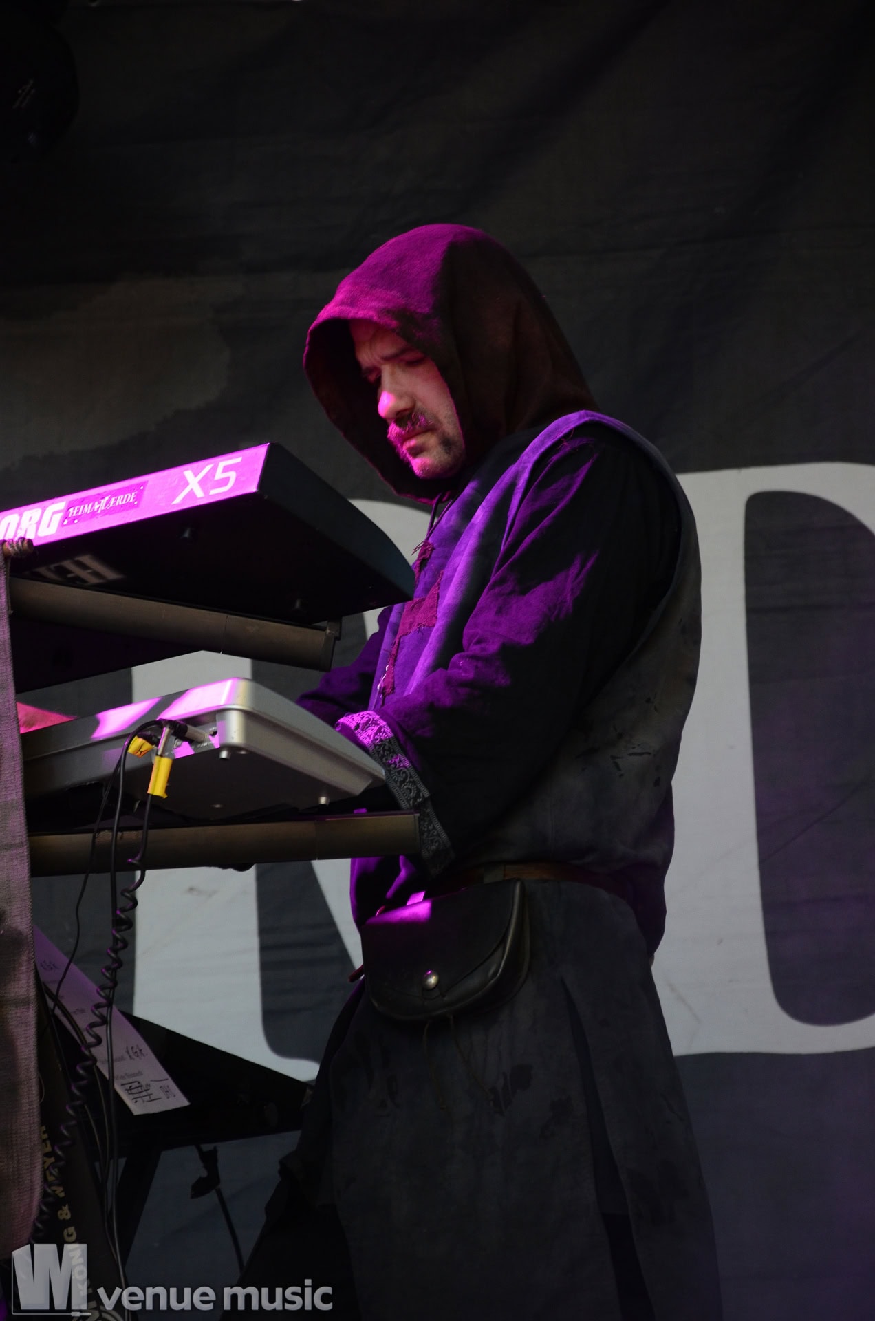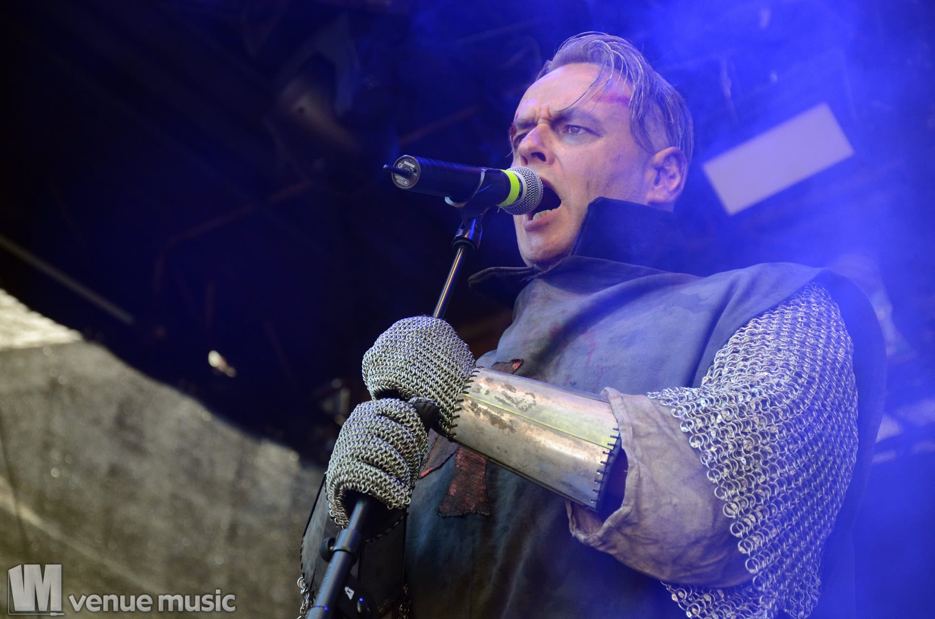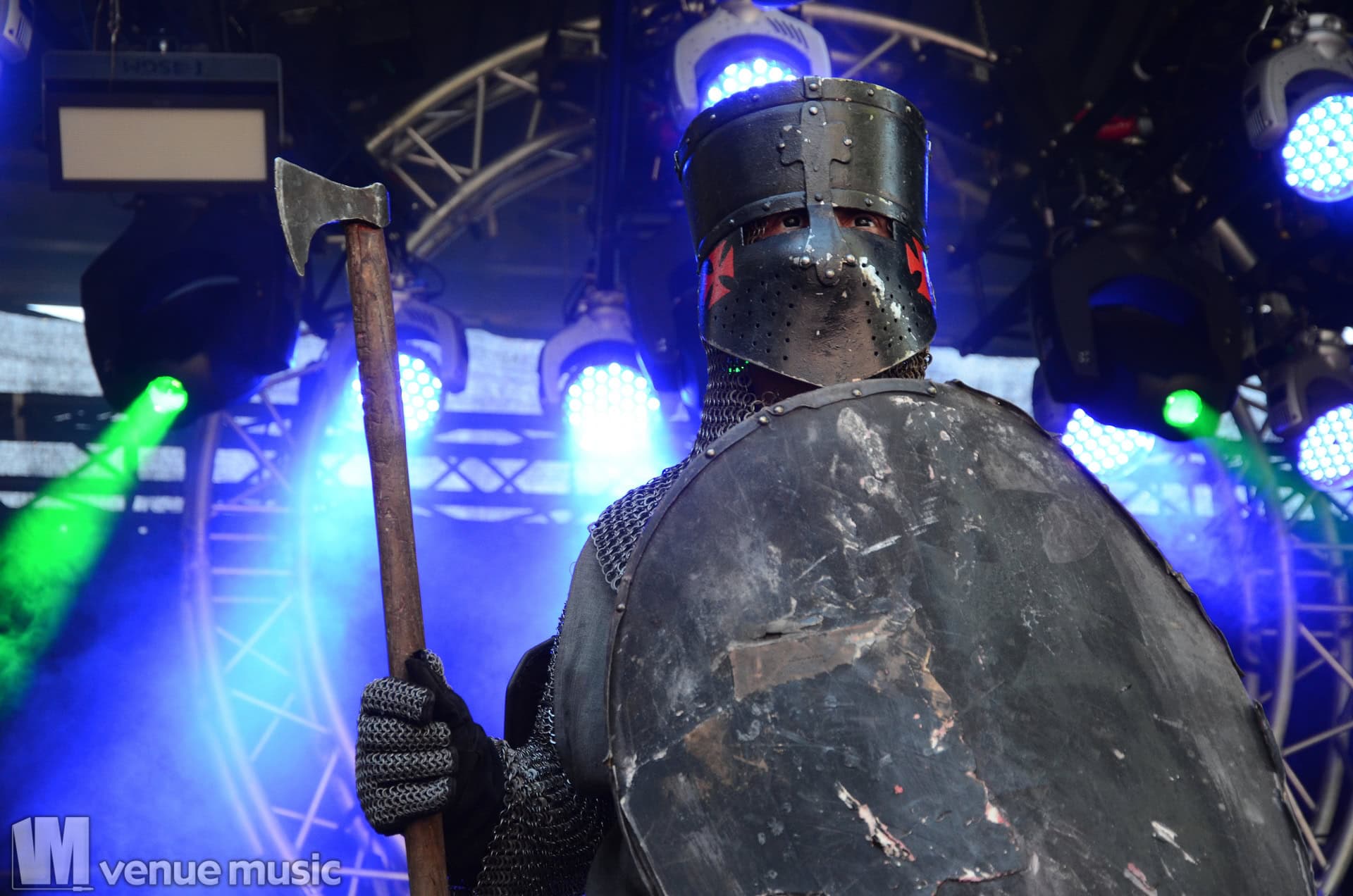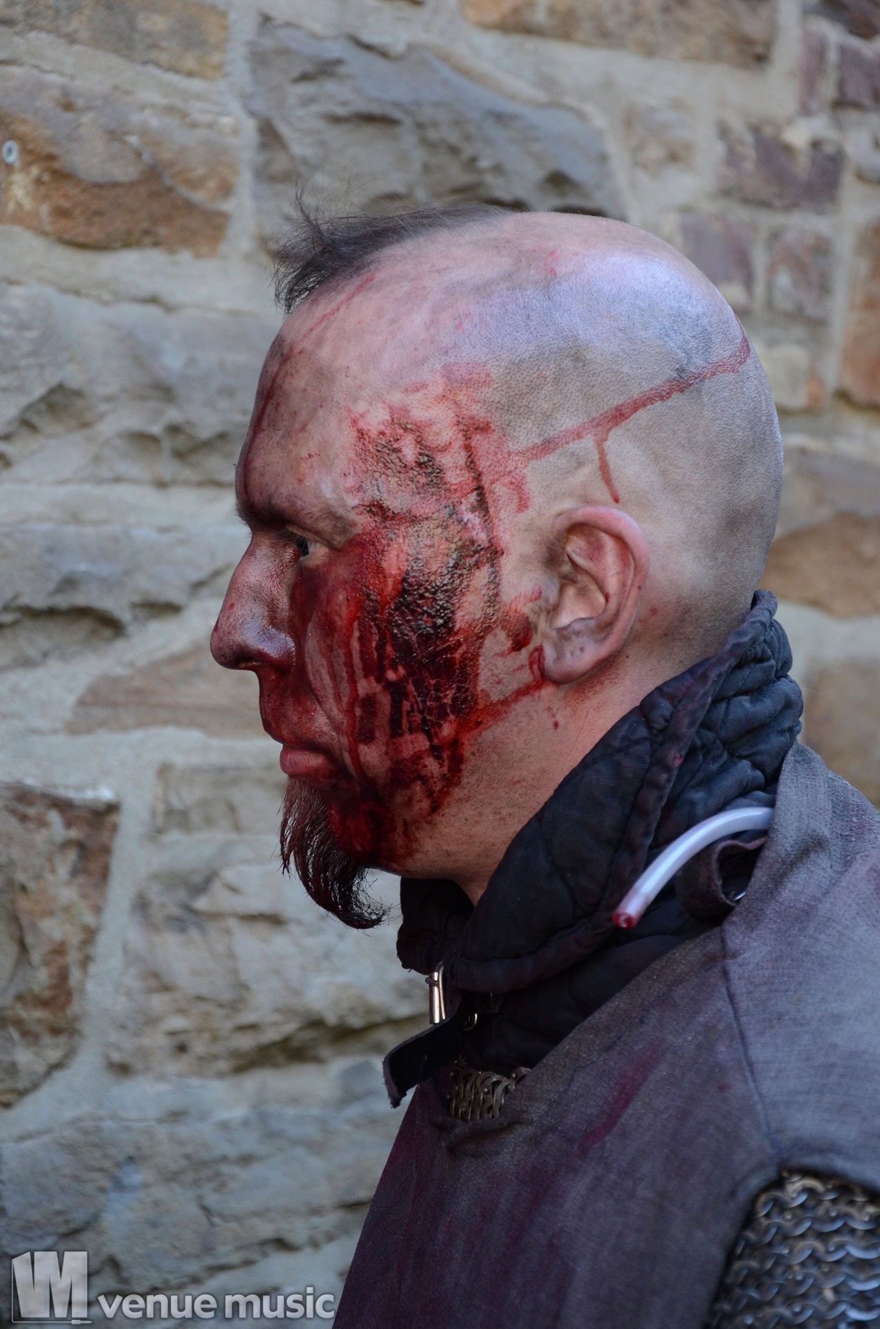 Einiges mehr an Action auf der Bühne wurde dann bei Heimataerde geboten, die von Michael Bohnes mit den Worten „ein bisschen Burgfolg muss sein“ angekündigt wurden. Dort sie schließlich schon häufiger zu Gast gewesen. Auch wenn die Band als Ritter auf der Bühne steht, so ist sie doch eher dem Elektro zuzuordnen, selbst wenn sie verschiedene andere (mittelalterliche) Elemente mit einbezieht. Laut Aussage von Frontmann und Bandgründer Ashlar von Megalon waren in die Show ein paar neue Elemente eingebaut. Und die Band ist schließlich Mittelalter, also mittelalt ;)