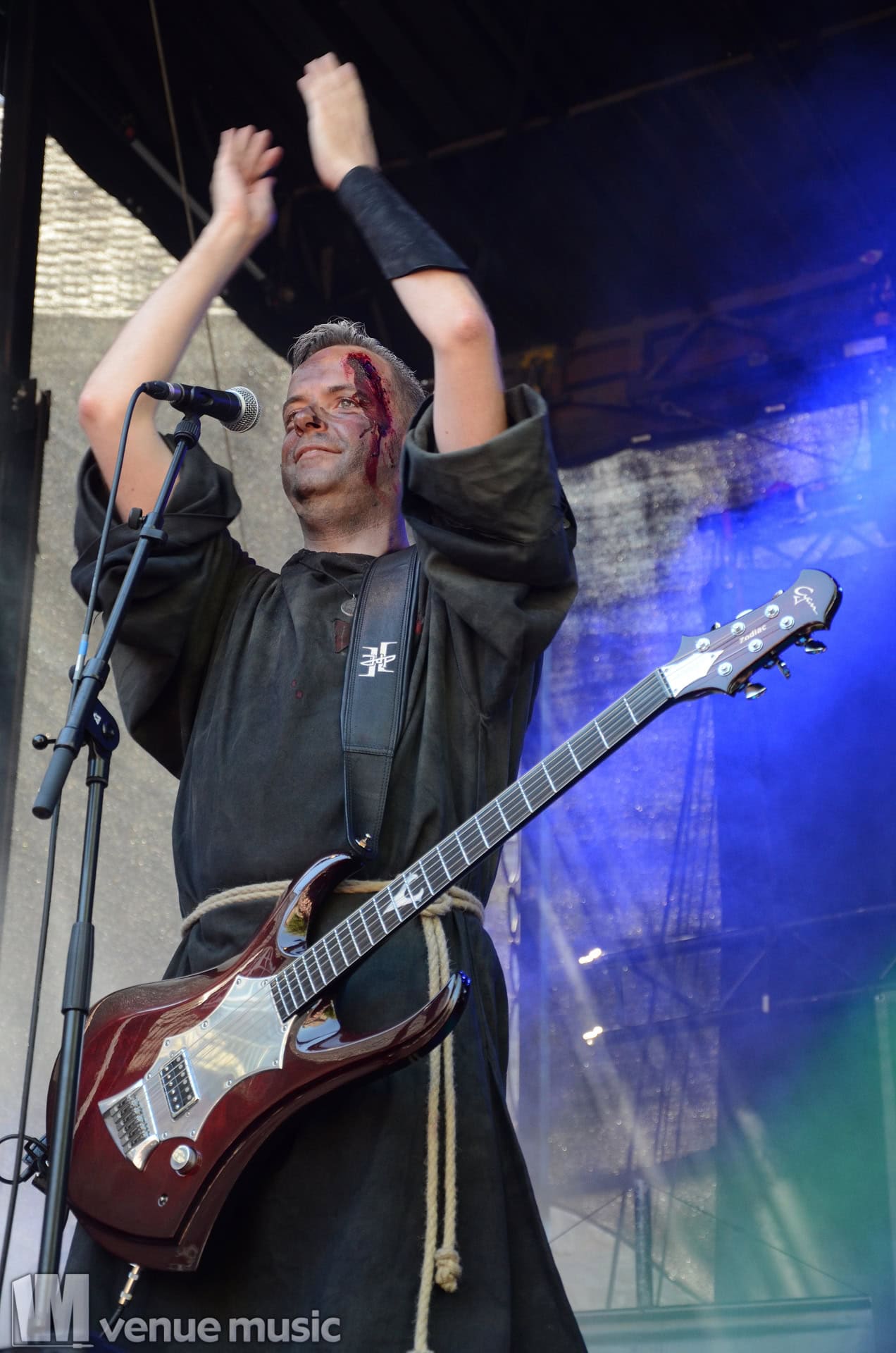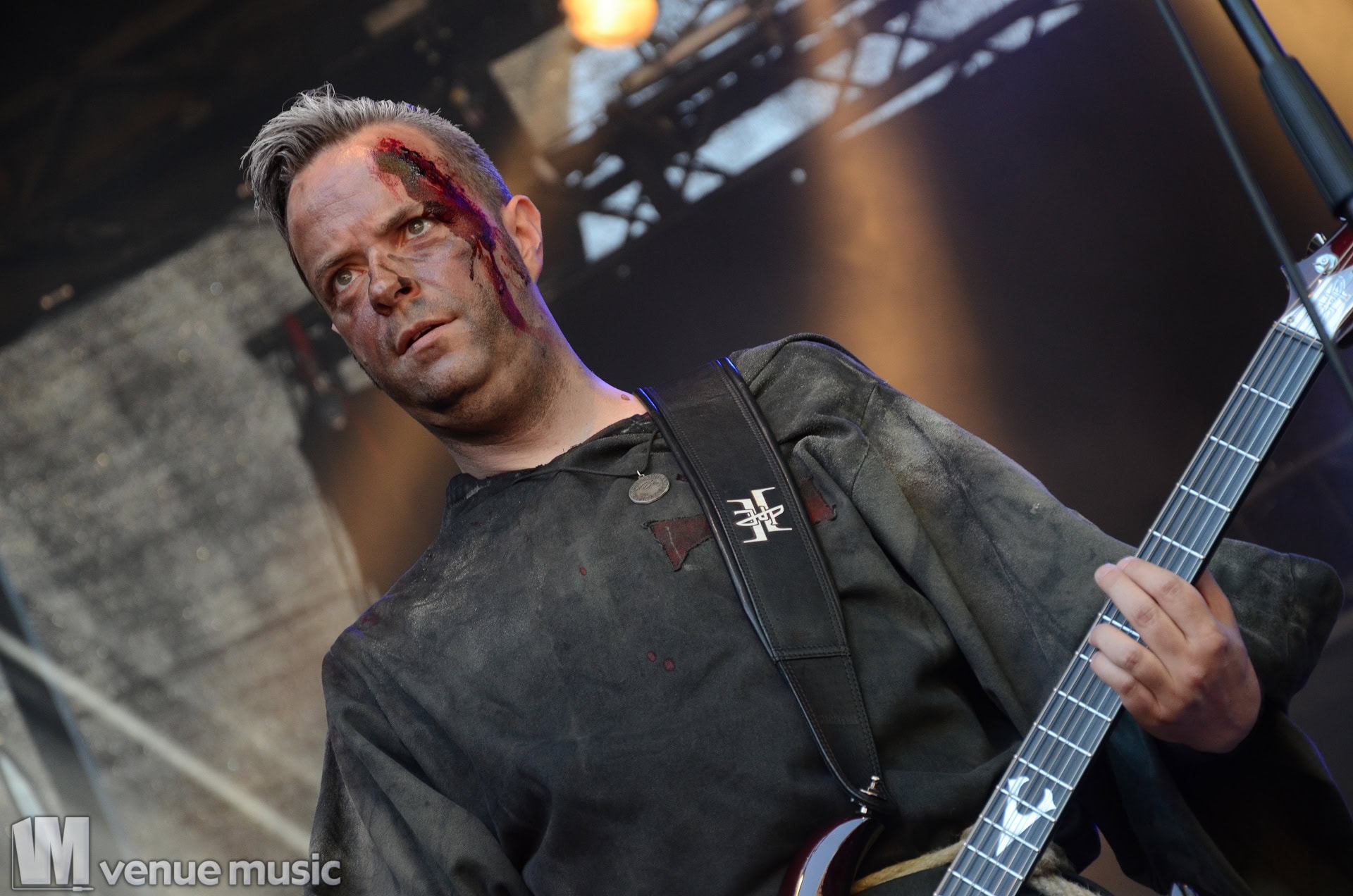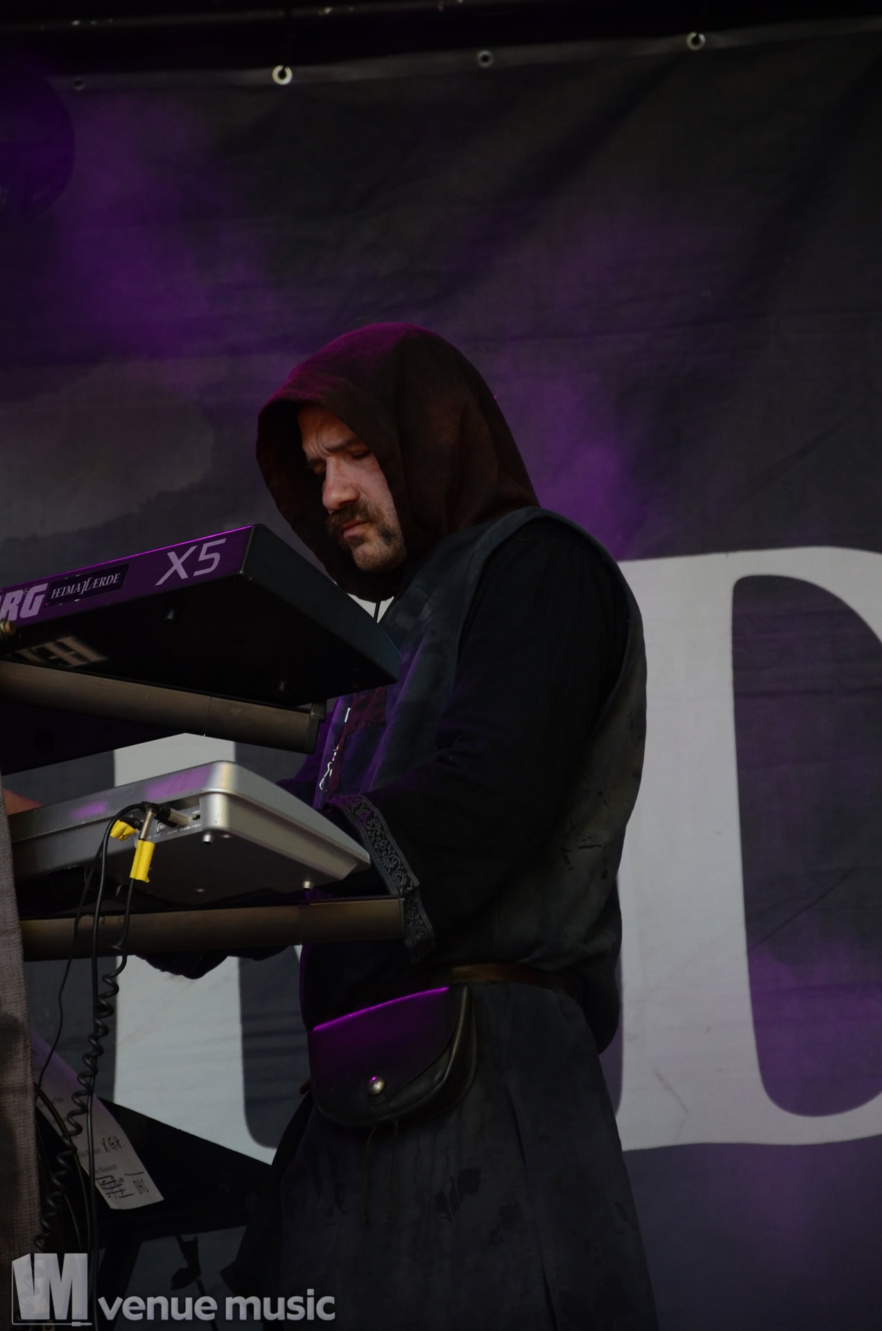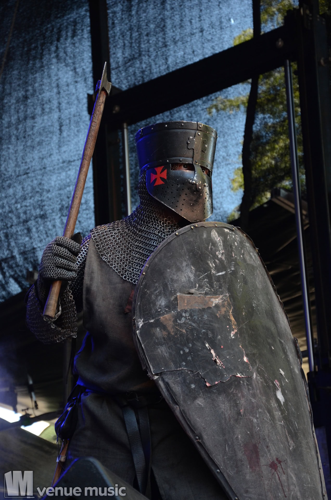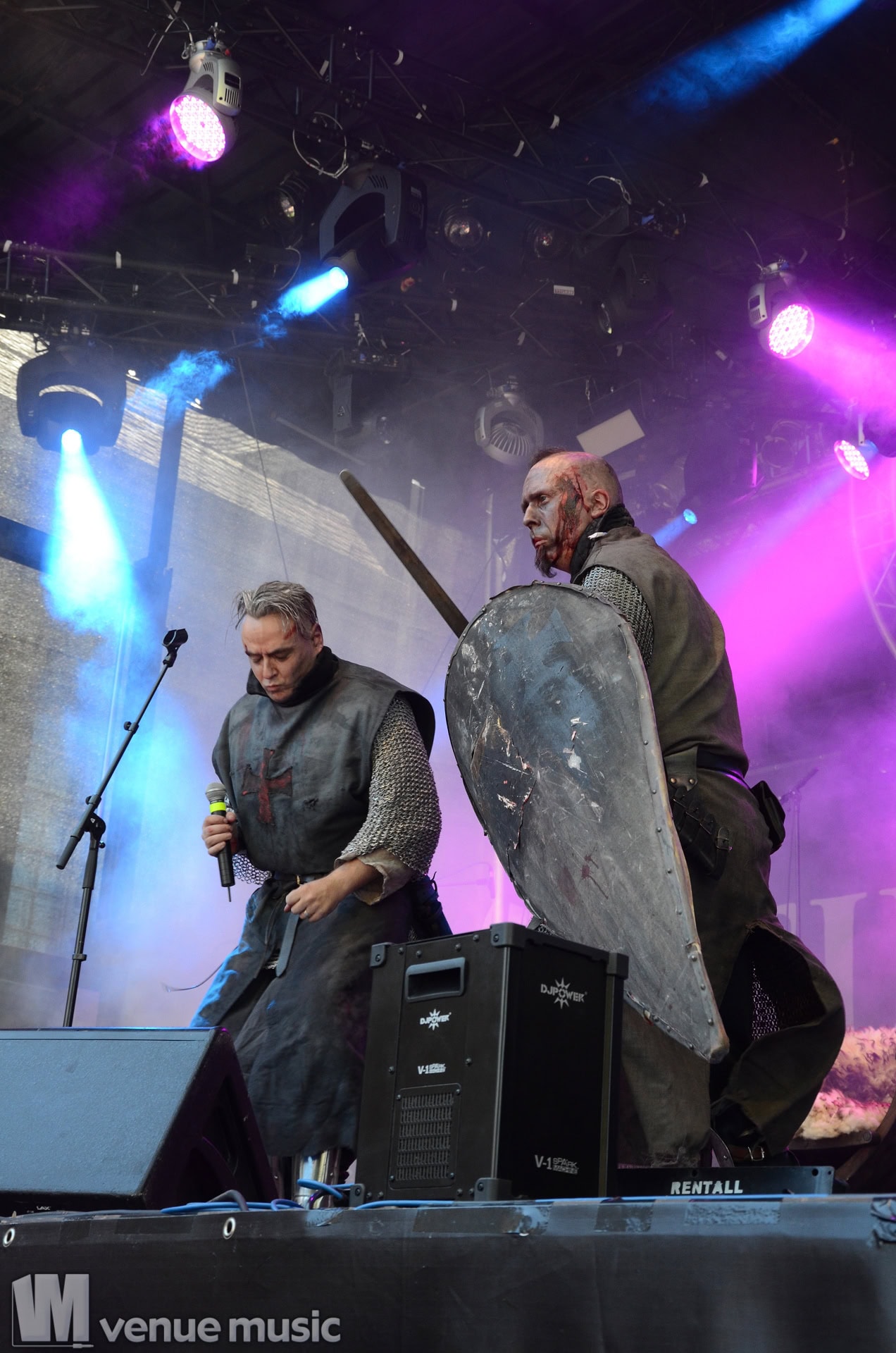 Einiges mehr an Action auf der Bühne wurde dann bei Heimataerde geboten, die von Michael Bohnes mit den Worten „ein bisschen Burgfolg muss sein“ angekündigt wurden. Dort sie schließlich schon häufiger zu Gast gewesen. Auch wenn die Band als Ritter auf der Bühne steht, so ist sie doch eher dem Elektro zuzuordnen, selbst wenn sie verschiedene andere (mittelalterliche) Elemente mit einbezieht. Laut Aussage von Frontmann und Bandgründer Ashlar von Megalon waren in die Show ein paar neue Elemente eingebaut. Und die Band ist schließlich Mittelalter, also mittelalt ;)