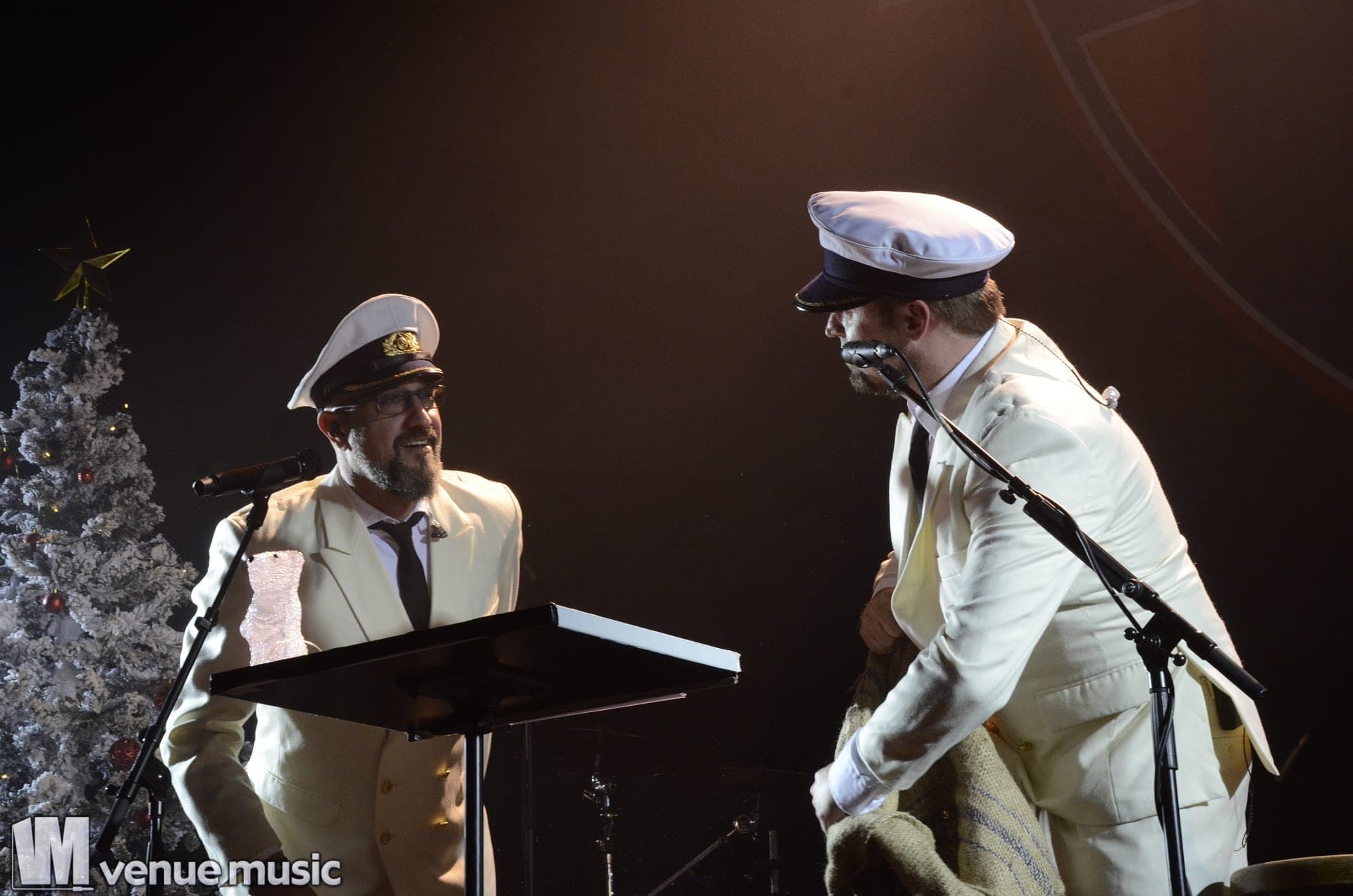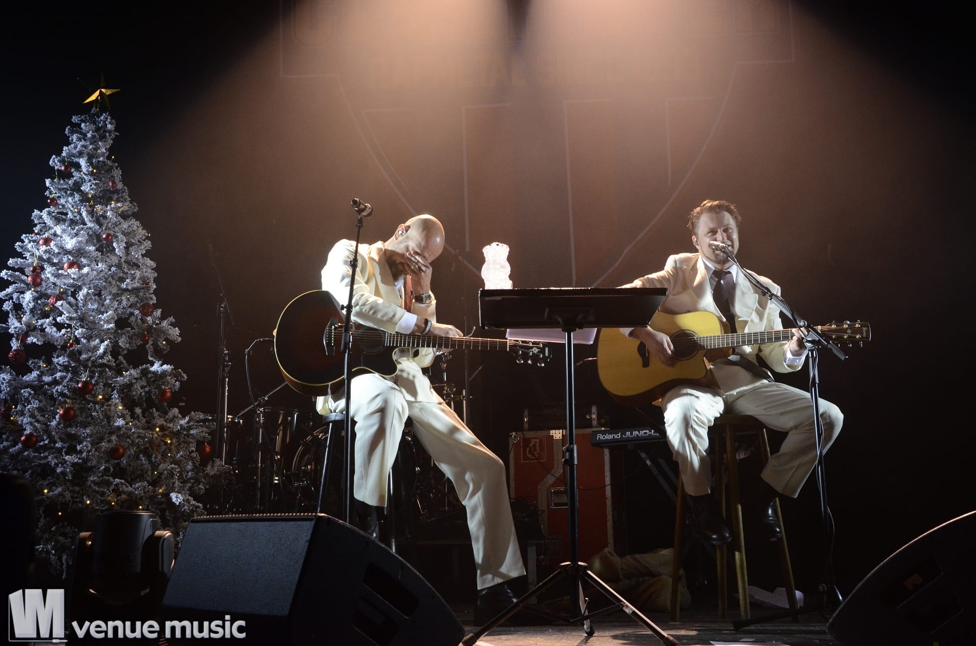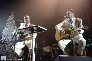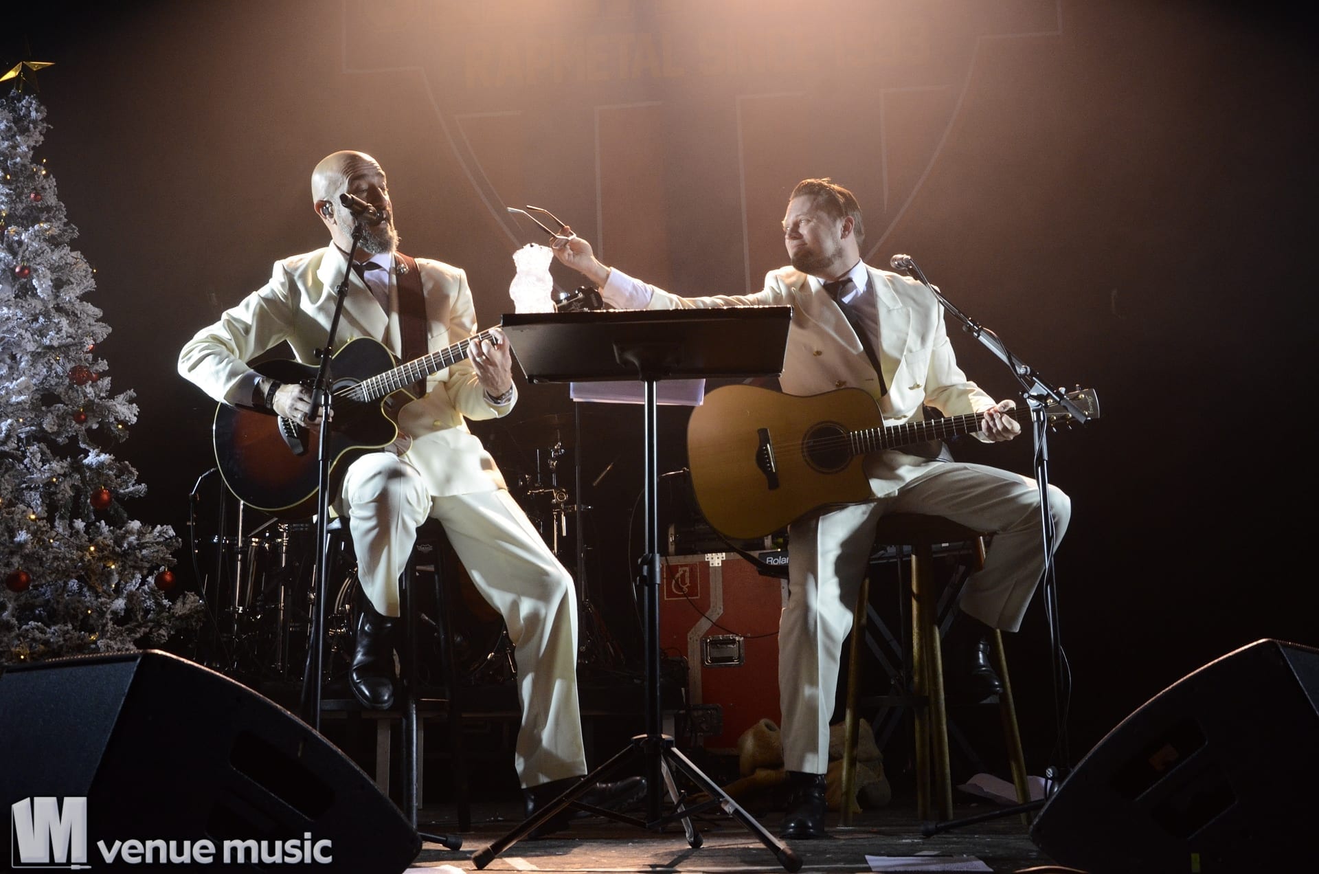 Ein ganz besonderes Schmankerl zu Weihnachten war die erste „Band“: „Jürgen & Ich“. Wie zu vermuten war, bestand dieses Duo aus Jürgen und Alex. Stilvoll in weißen Anzügen gab es ein kleines Weihnachtssingen. Allerdings ließ die Textfestigkeit vor allem des Publikums zu wünschen übrig. Doch das tat der Stimmung keinen Abbruch. Es war eine sehr amüsante Showeinlage – und gesundes Obst wurde auch noch aus dem Weihnachtssack verteilt.