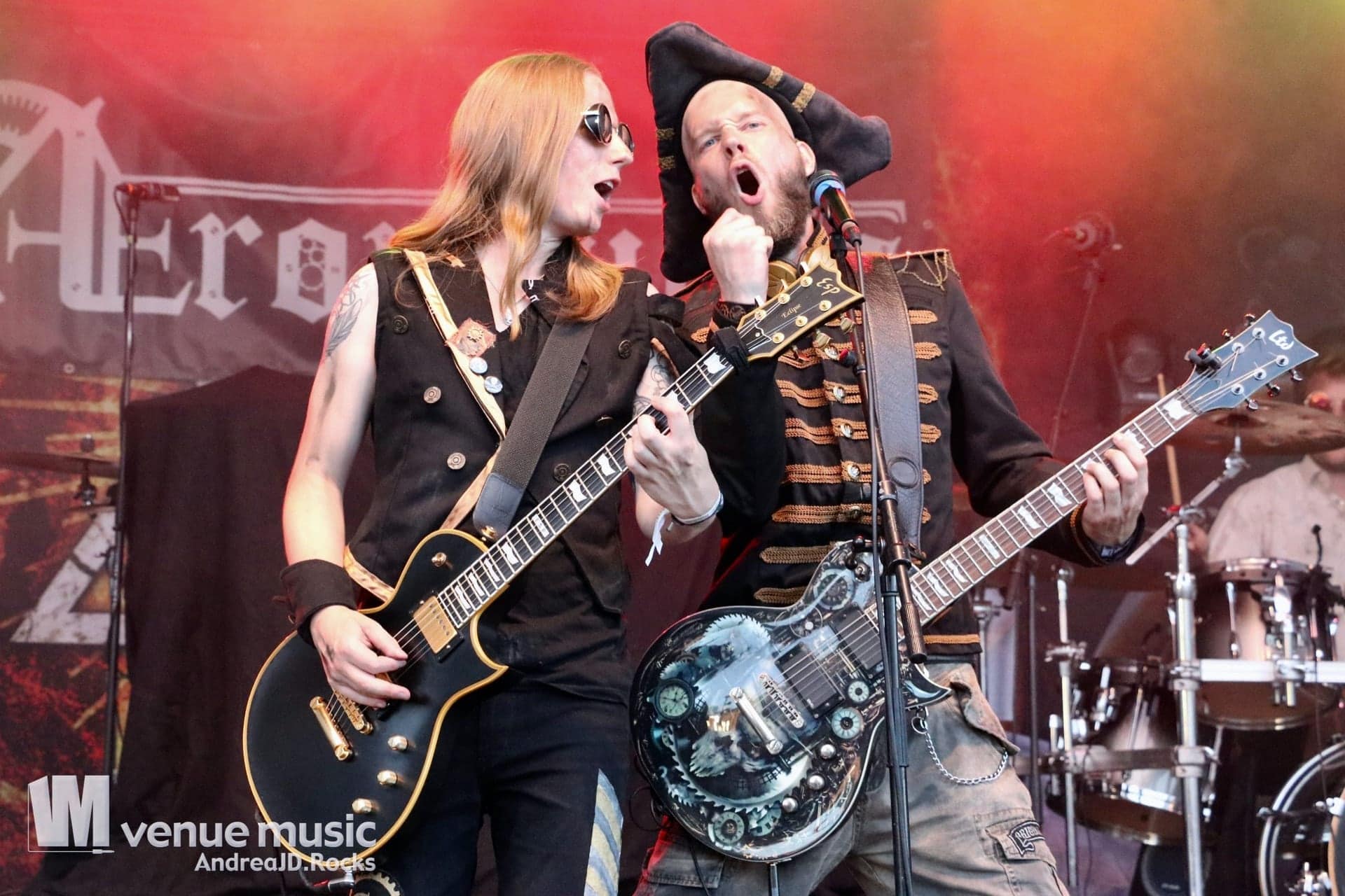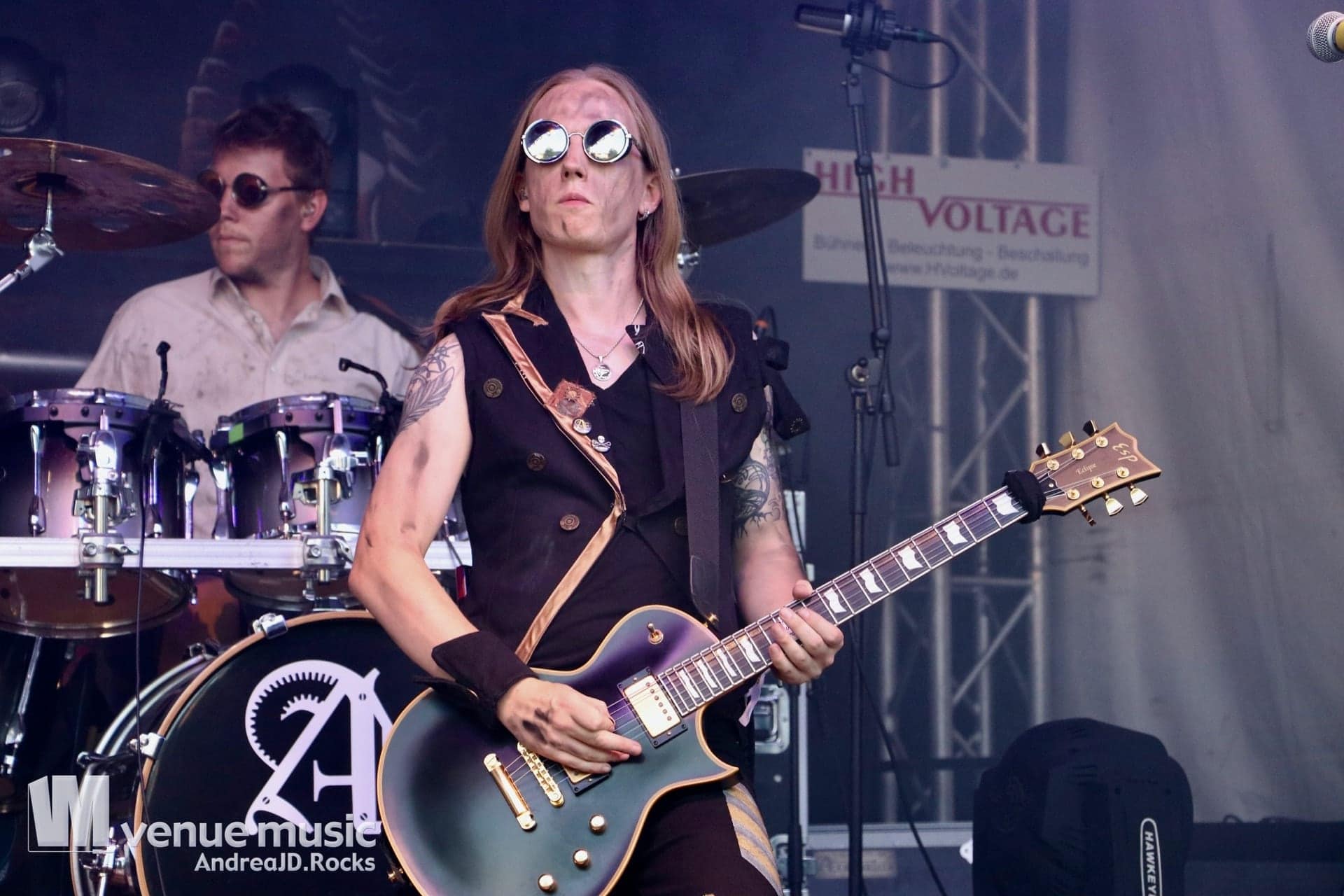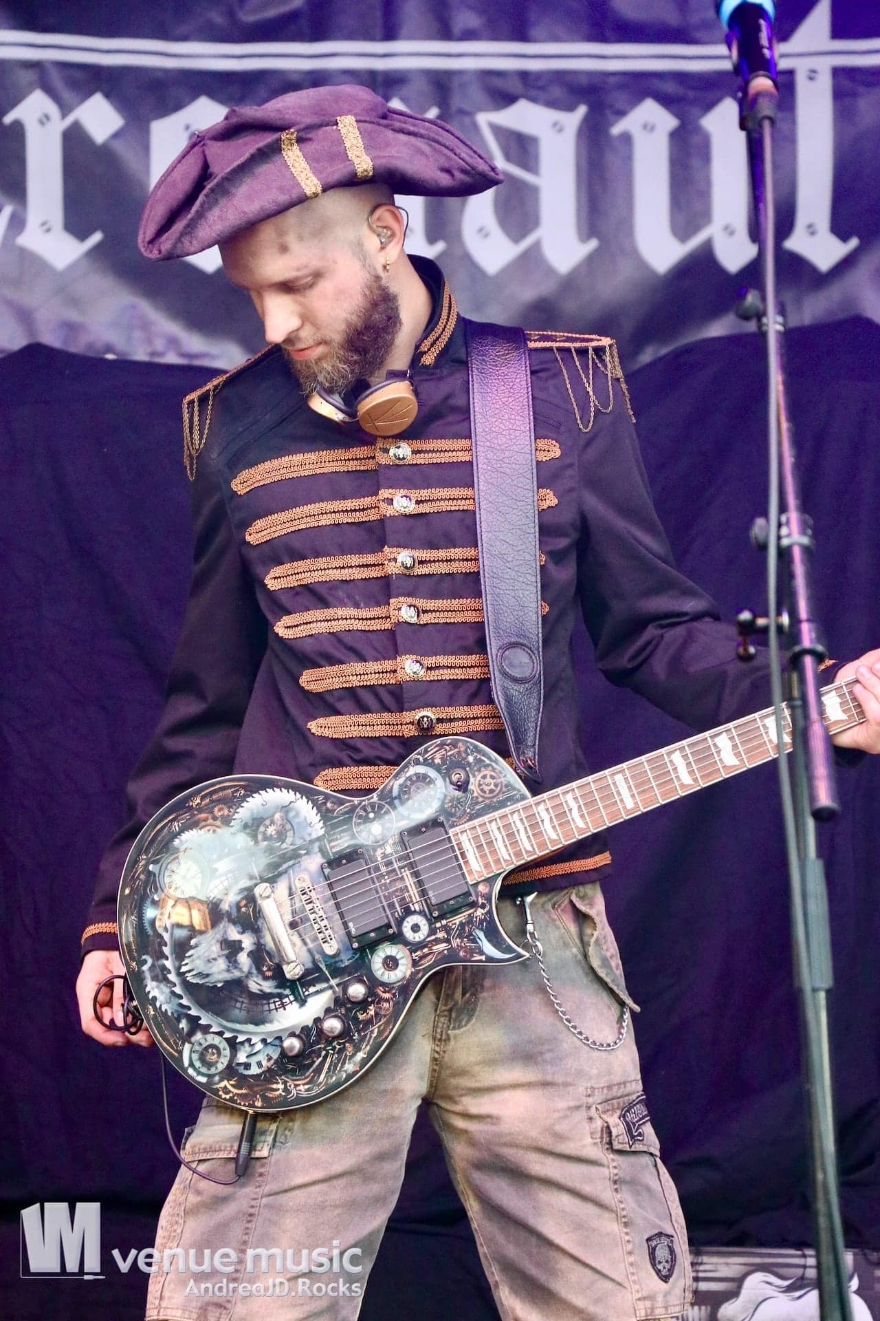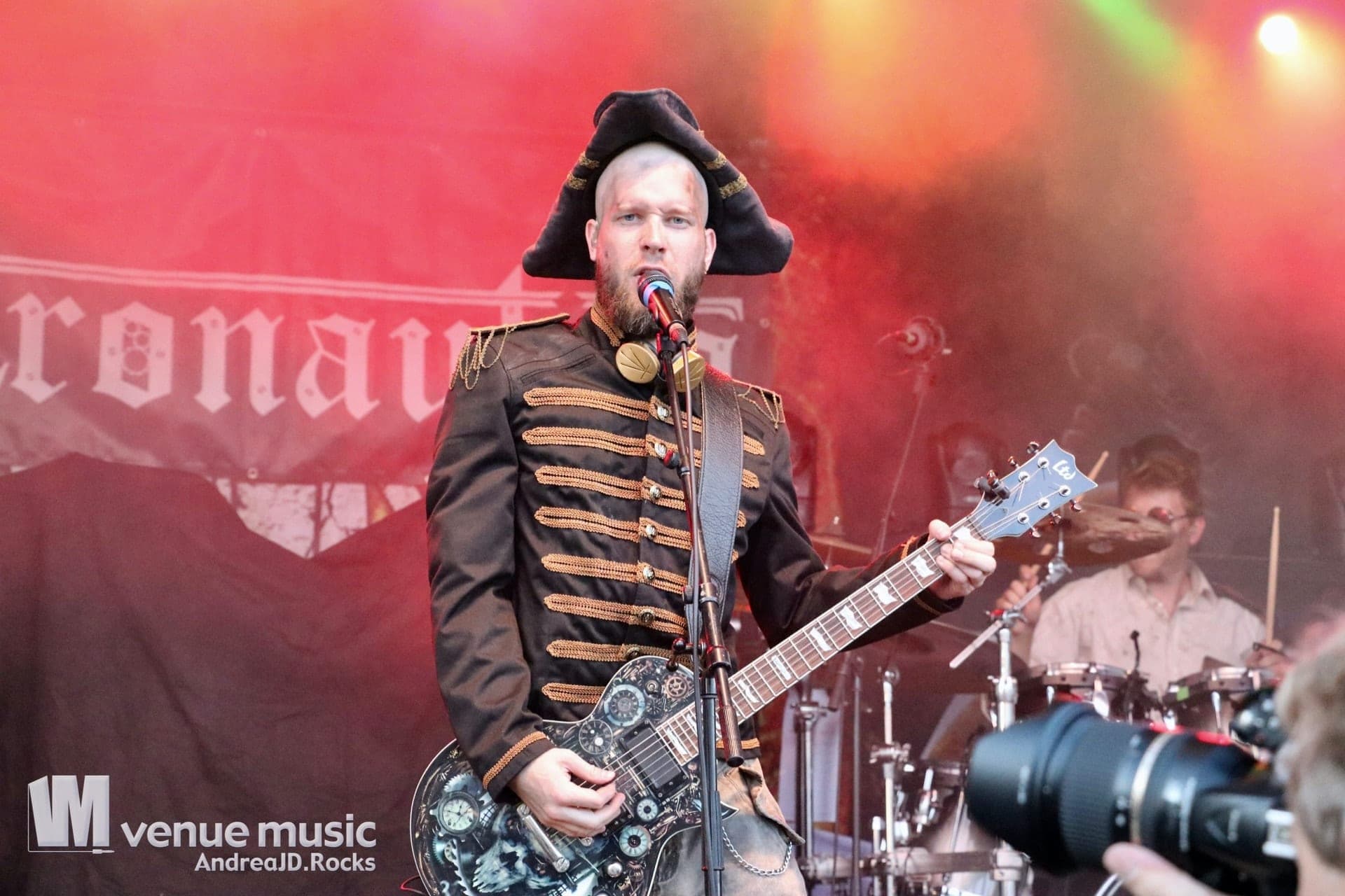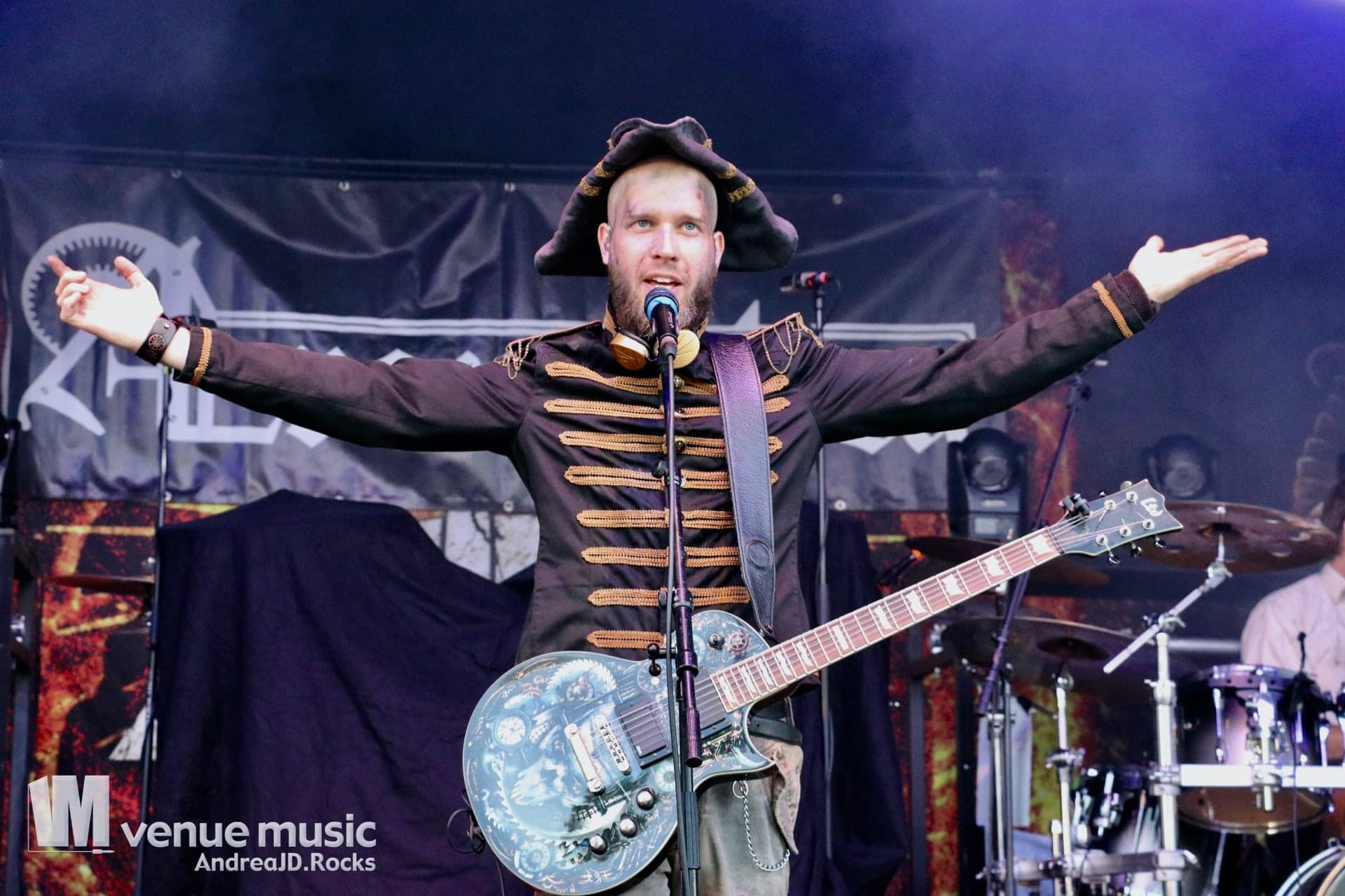 Aeronautica aus Witten lockten mit ihrem Steampunk etliche Fans des Genres an und hatten auch offensichtlich eine Menge Fans im Saarland oder eben auch aus der Heimat mit dabei. Während des Gigs füllte sich der Platz vor der Central Stage immer mehr bis letztendlich nach der Endzeit-Parade auch Feuerschwanz die Bühne betraten.