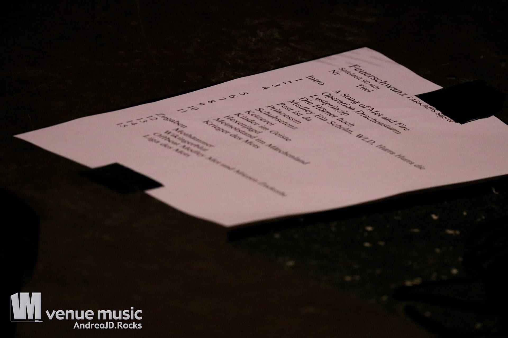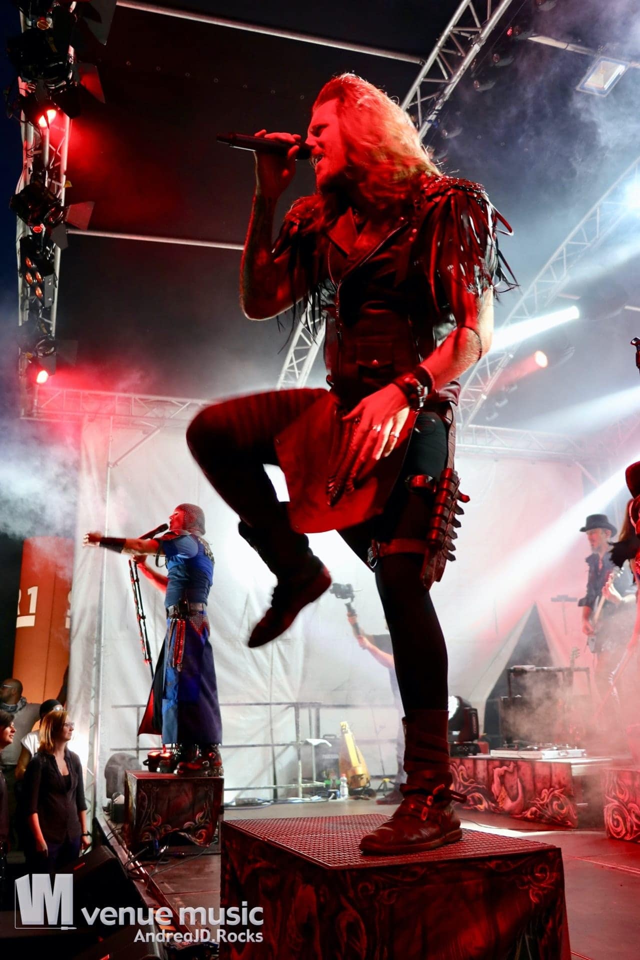 Die Show war eine typische Feuerschwanz-Show: Rock, Metal, Spaß, Met & Miezen standen wie immer im Vordergrund. Der Platz platzte fast aus allen Nähten, so viele Fans waren gekommen, um mit dem Hauptmanns geilem Haufen zu feiern.