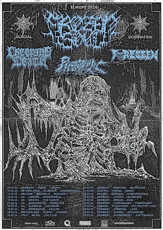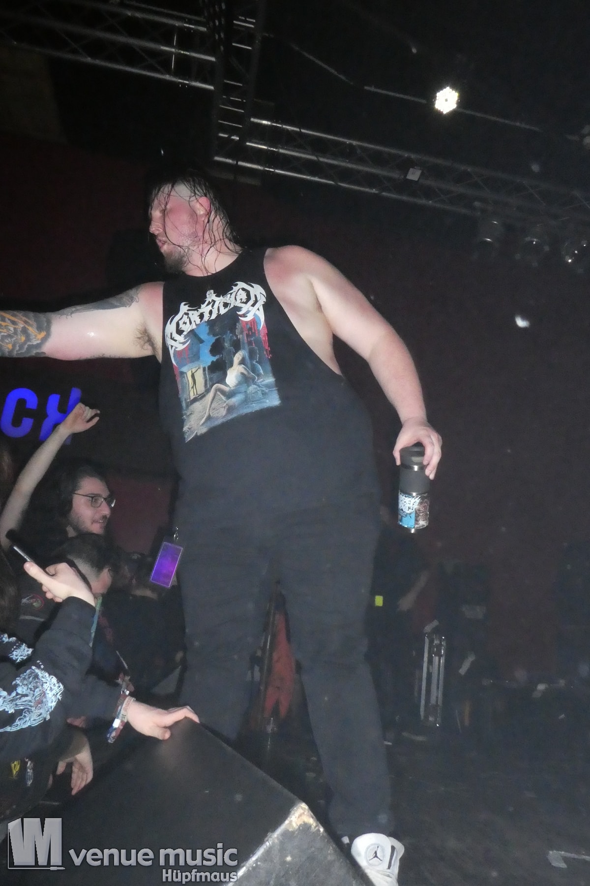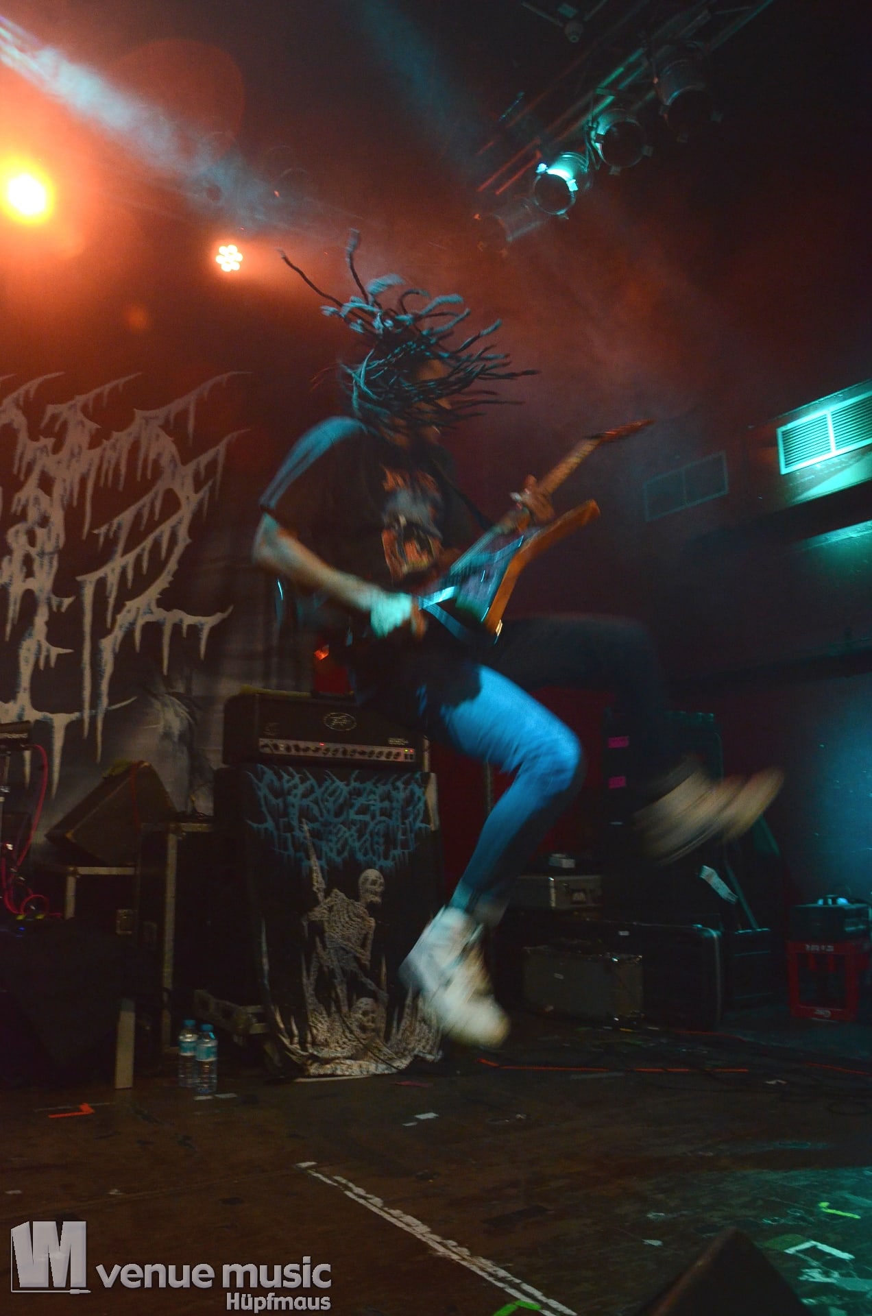 Am 09.02.2024 waren Frozen Soul im Turock in Essen zu Gast. Der Tourauftakt ihrer „Glacial Domination“-Tour war zwar nicht ausverkauft, aber das Turock war doch sehr gut gefüllt. Foreseen hatten den Abend eröffnet, aber das hatten wir nicht geschafft, so dass wir dann noch Creeping Death zum Teil schauen konnten – nachdem wir am Merch geshoppt hatten. 35€ für ein T-Shirt und 40€ für ein Longsleeve waren zwar echt schon wieder viel, aber ein Andenken an die Tour musste dennoch sein.
