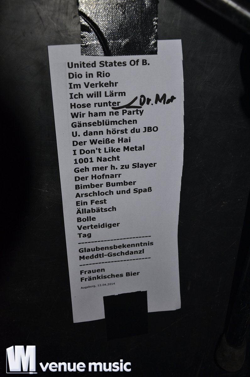 Am 16.04.2014 waren J.B.O. im Rahmen ihrer „Wir spielen was Ihr wollt“-Tour in der Zeche Carl zu Gast. Vorher konnte die Fans ihre 10 Lieblingssongs, die sie gerne auf dieser Tour hören wollten, wählen. Da es aber 2x vorkam, dass die Songs eine exakt gleiche Punktzahl bekommen haben, sind es eben 12 geworden. Drum herum gab es dann noch Lieder, die die Band gerne spielen wollte. So waren alle zufrieden ;) Naja, J.B.O. spielen „Der weiße Hai im Dechsendorfer Weiher“ zwar nicht gerne live, aber dem Publikum hats gefallen!