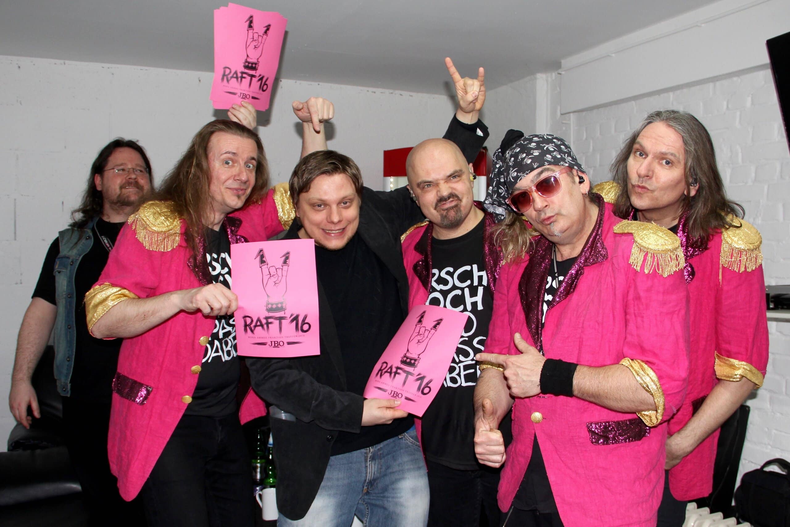 Bevor dann J.B.O. auf die BĂźhne kamen, hatten wir noch in kleines Meet’n’Greet Backstage: Michael Holtschulte – tot aber lustig! – kam vorbei und wir zelebrierten die offizielle Ăbergabe des Logos fĂźr das RAFT’16, das diesjährige Rosa Armee Fraktion Treffen in Erlangen im Juli.