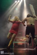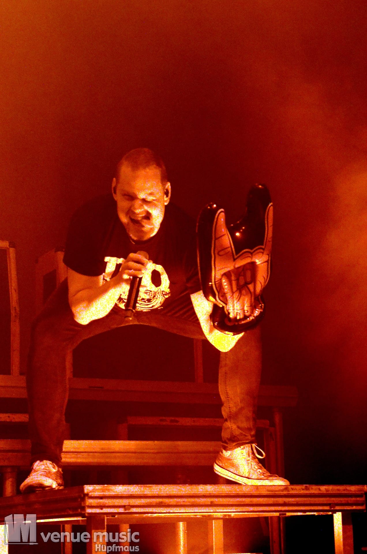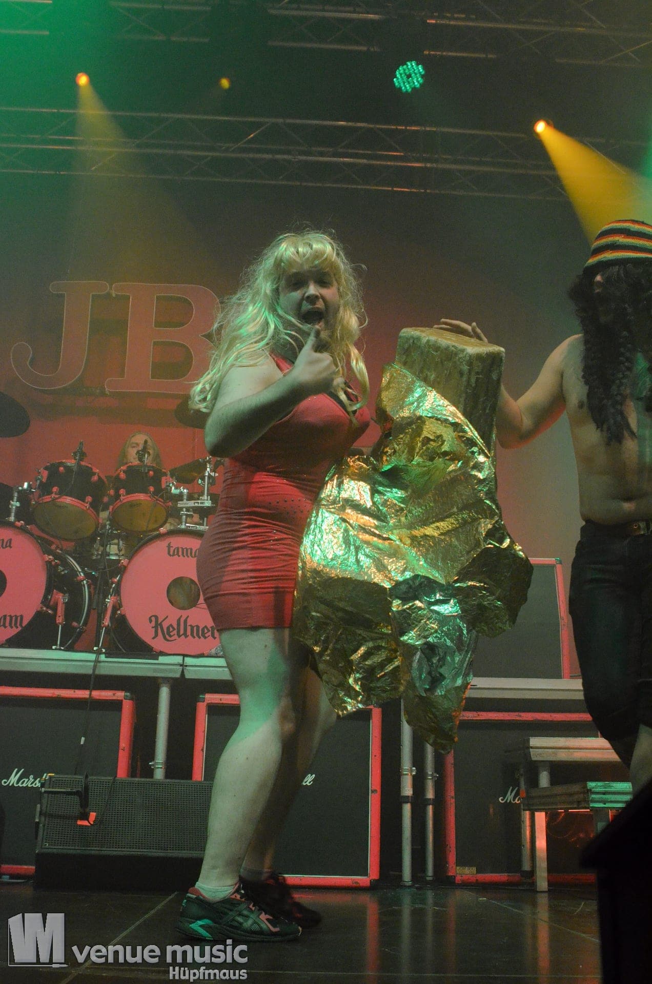 Wie immer gabs natürlich zwischen den Songs reichlich Ansagen, Interaktion mit dem Publikum und ganz viel Blödsinn. Doch das gehört auch einfach zu einem J.B.O. Konzert dazu. Dieses Mal hatte ich „nur“ eine normale Foto-Akkreditierung (also die ersten 3 Songs im Fotograben), die letzten beiden Male in der Turbinenhalle wurde mir die Ehre zuteil, das komplette Konzert inkl. auch Backstage/von der Bühne aus fotografieren zu können. Einerseits schade, denn das bekommt man nicht so oft und macht wirklich Spaß. Ist aber auch verdammt anstrengend. Man rennt nur überall herum und versucht, irgendwie jedes Motiv von überall (Graben, Balkon, Bühne…) einzufangen. Da macht man echt Meter. Und die Menge an Bildern dann danach.. ich kann mich ja dann immer nicht beherrschen.. und vor allem nicht entscheiden ;) Andererseits konnte ich dann meine Cam weglegen und zu meinem Freund ins Publikum gehen und den Rest des Konzerts ohne „Arbeitsstress“ genießen und natürlich mitbangen, -singen und hüpfen. Allerdings bin ich noch nie SO nass geworden auf einem Konzert (außer bei GWAR natürlich). Ich habe keine Ahnung, wie viel Bier ich abbekommen habe, aber naja, so ist das eben ;) Wobei ich ja tatsächlich diesen auf Konzerten doch nicht ganz so billigen Gerstensaft an Stelle derer, die den gekauft haben, lieber getrunken hätte. Aber gut, jeder wie er mag und was das Portemonnaie hergibt…