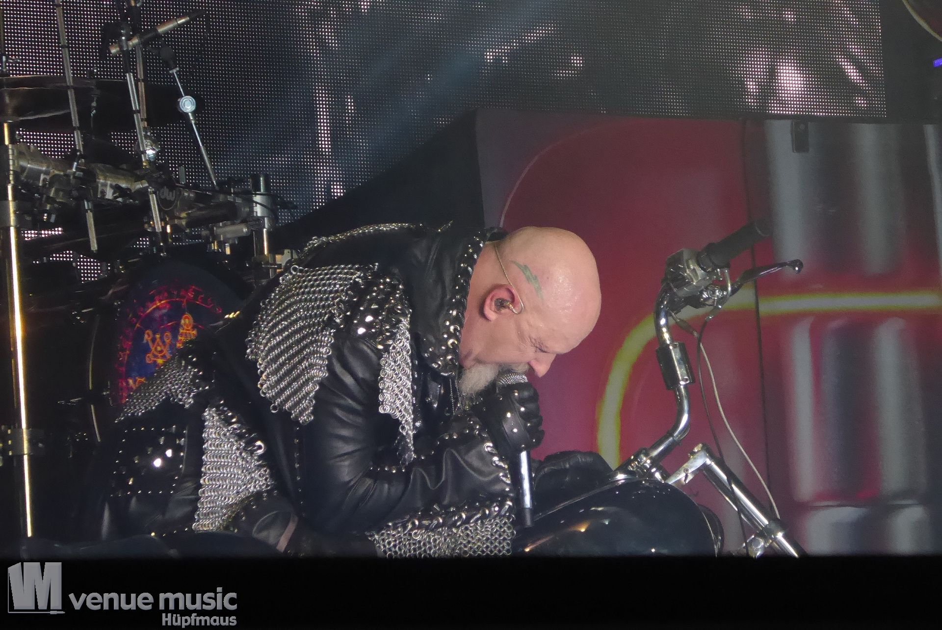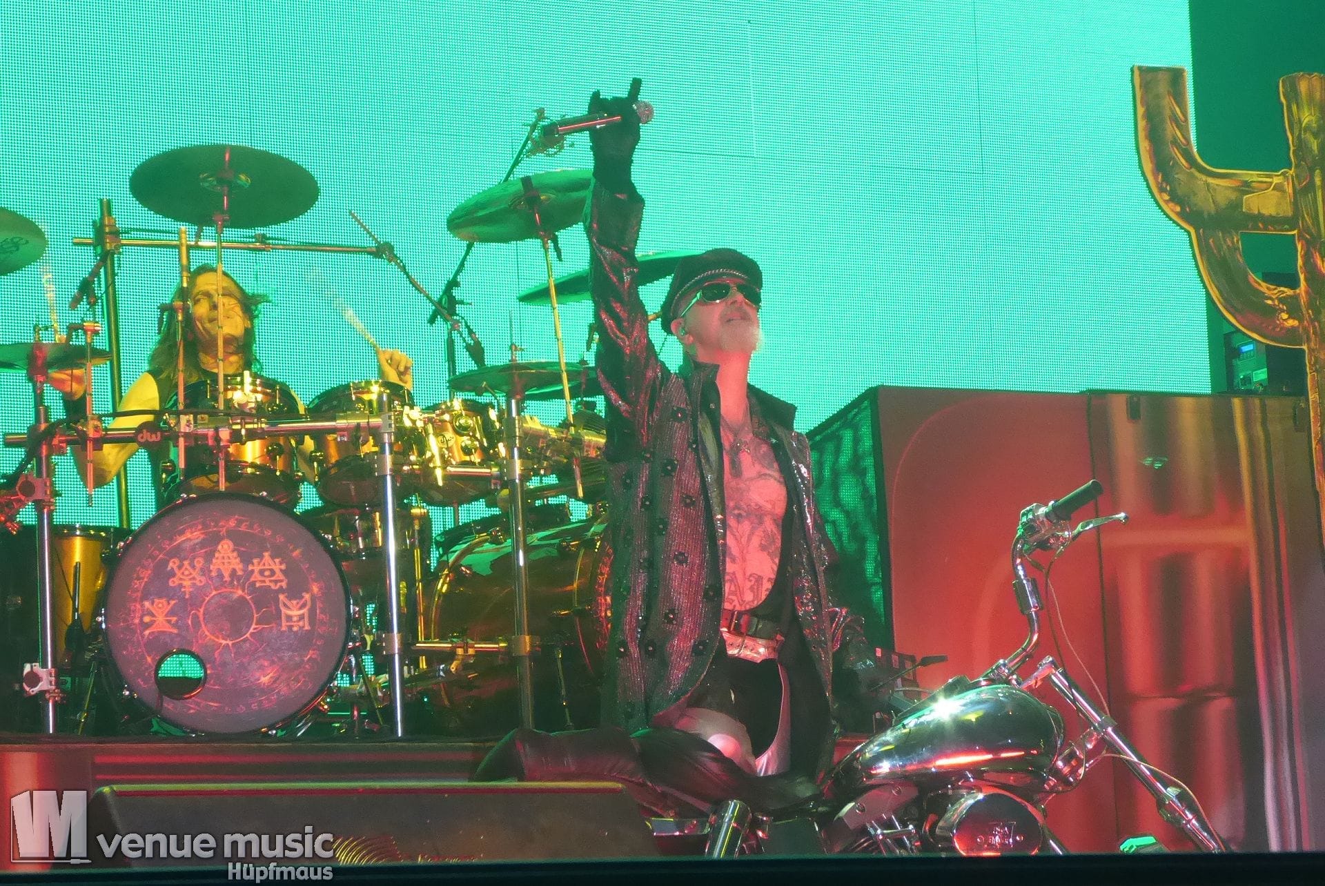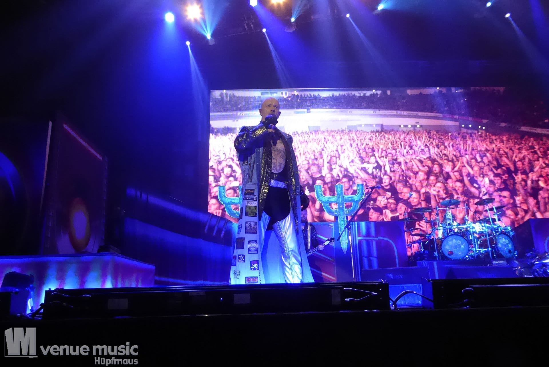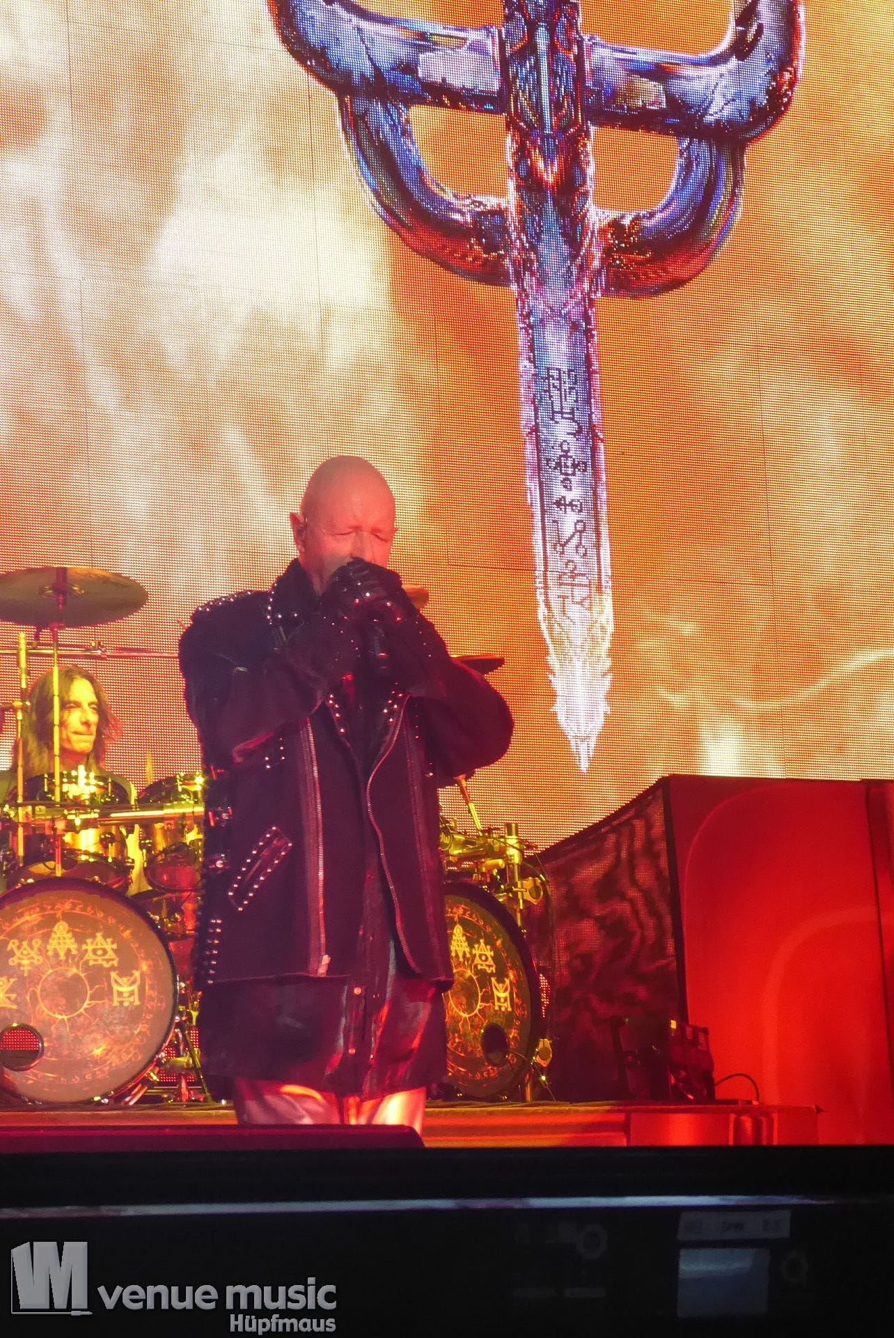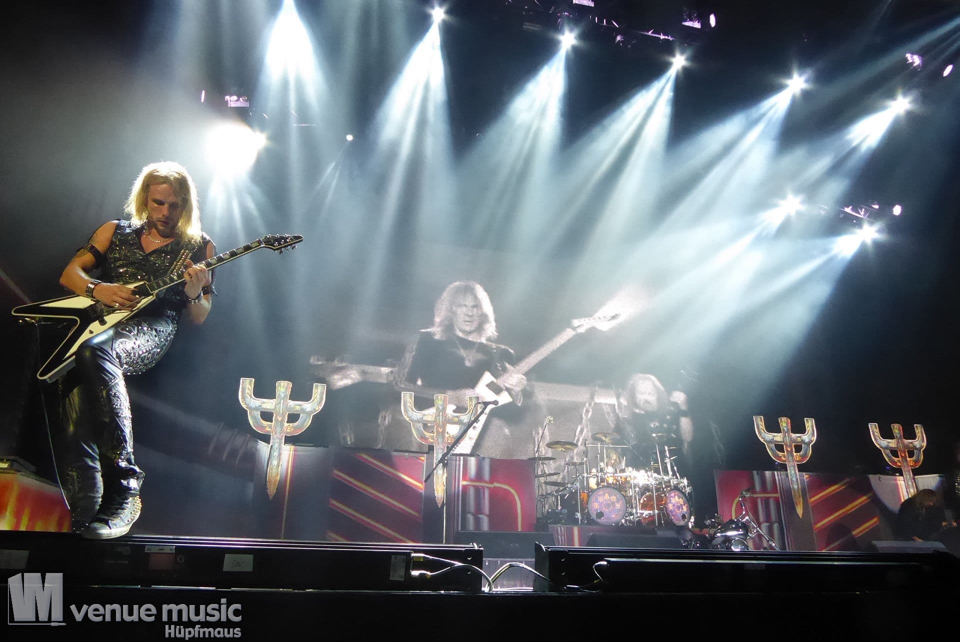 Die Bühnenshow war klasse, klaro, dass auch ein Motorrad mit dabei sein musste. Allerdings hatte man das Gefühl, dass Rob Halford nicht alle Texte gleichermaßen gut auf dem Schirm hatte und in der Bühnenmitte ein Monitor stand, von dessen Seite er vor allem bei den ganz bekannten Klassikern wich. Denn da kam er auch schon mal zum vorderen Rand der Bühne. Aber was solls, das tat der Stimmung keinen Abbruch und verzeihen wir im die – vermeintliche – Gedächtnisstütze. Die brauchen weitaus jüngere Musiker auch schon mal.
