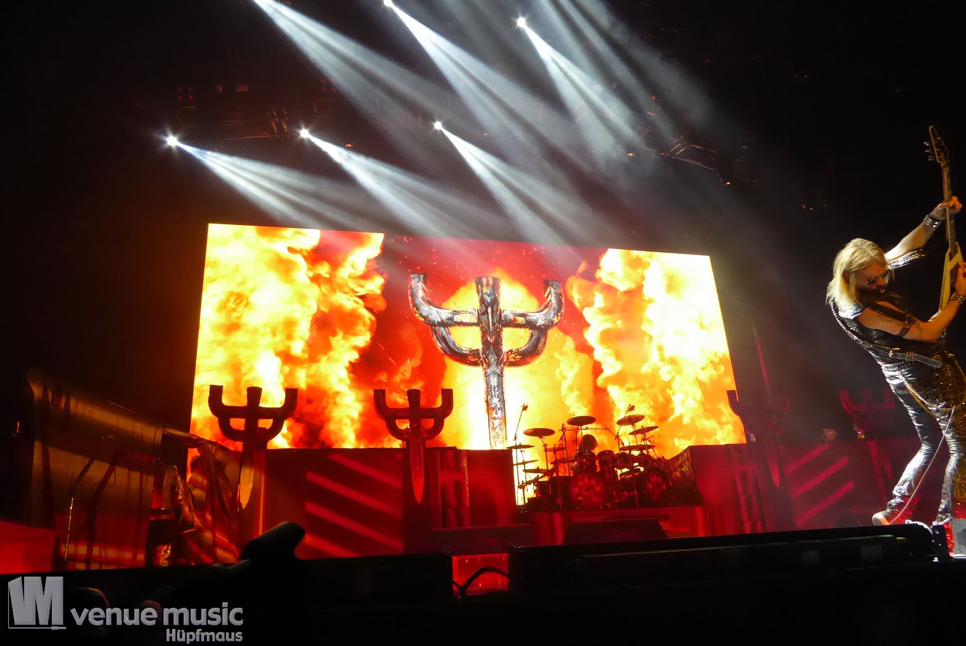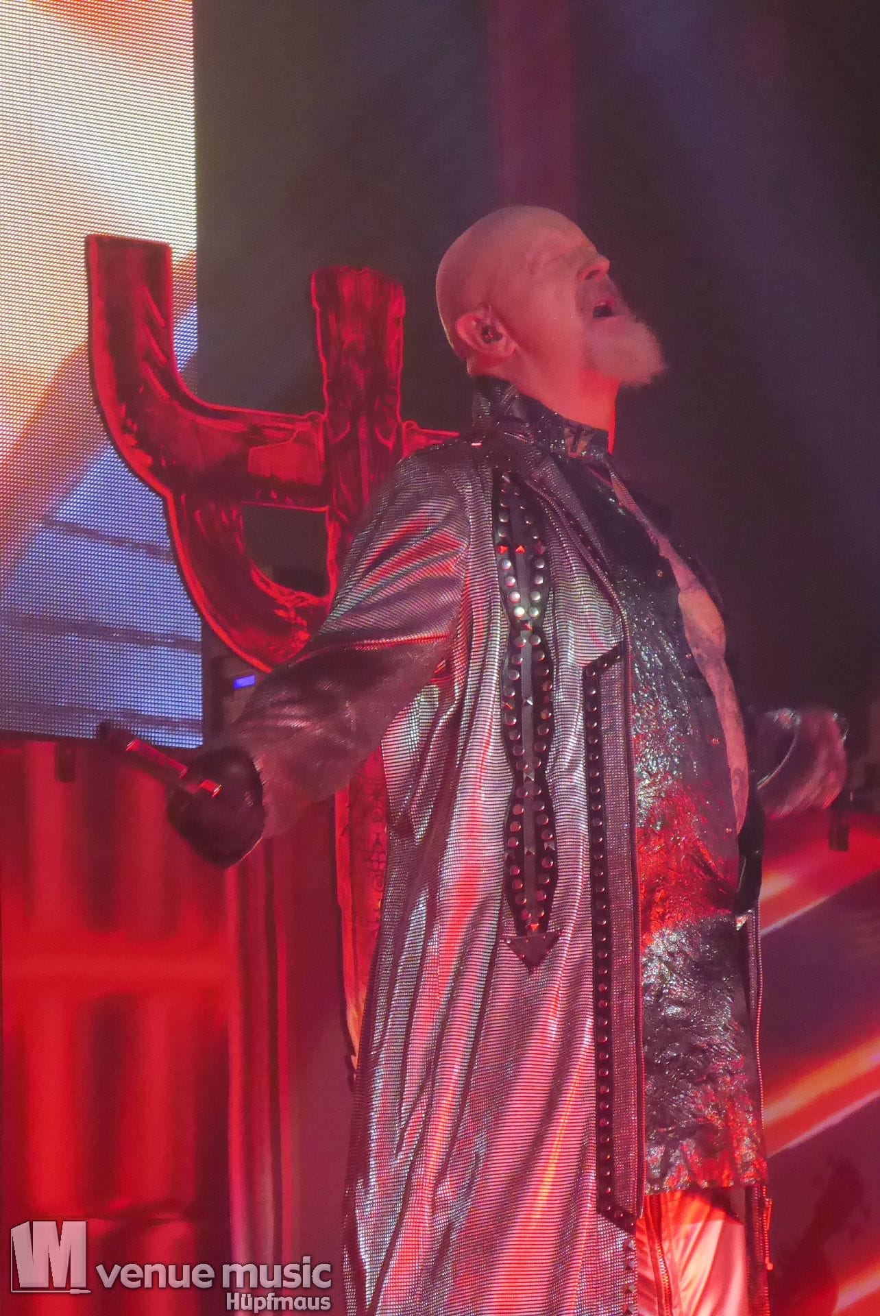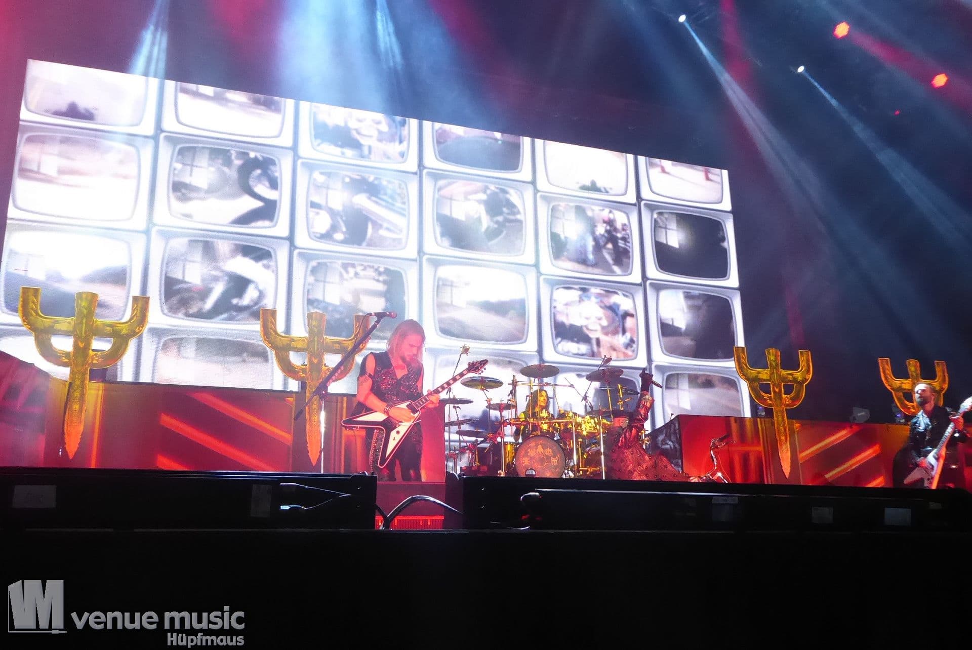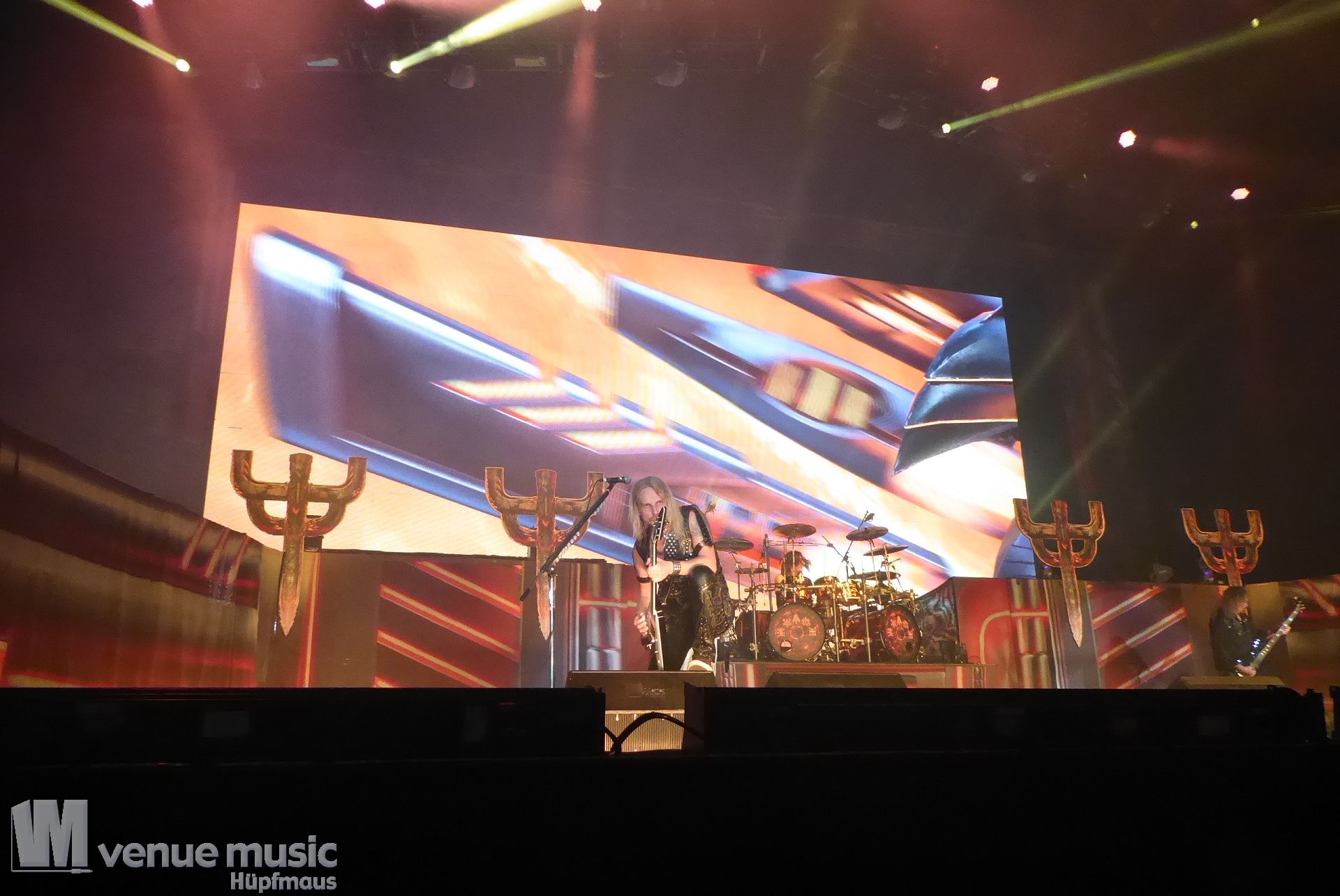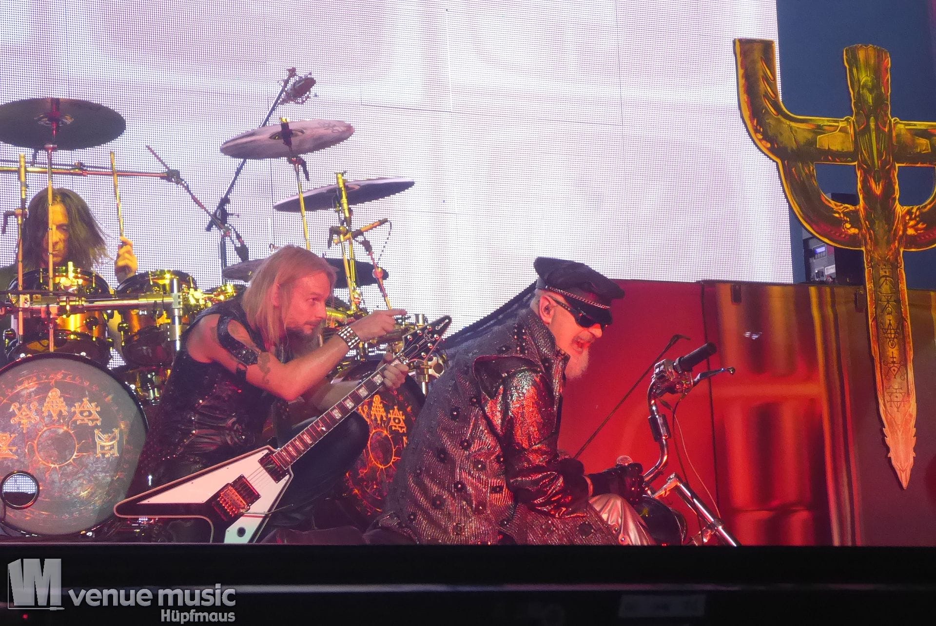 Die Bühnenshow war klasse, klaro, dass auch ein Motorrad mit dabei sein musste. Allerdings hatte man das Gefühl, dass Rob Halford nicht alle Texte gleichermaßen gut auf dem Schirm hatte und in der Bühnenmitte ein Monitor stand, von dessen Seite er vor allem bei den ganz bekannten Klassikern wich. Denn da kam er auch schon mal zum vorderen Rand der Bühne. Aber was solls, das tat der Stimmung keinen Abbruch und verzeihen wir im die – vermeintliche – Gedächtnisstütze. Die brauchen weitaus jüngere Musiker auch schon mal.