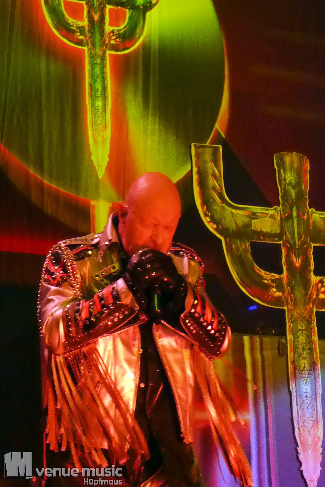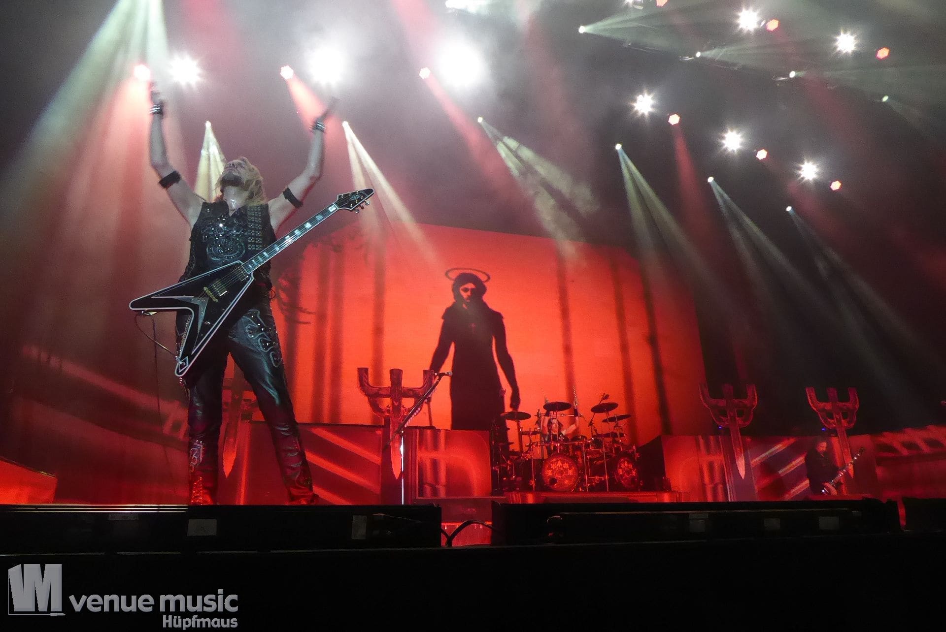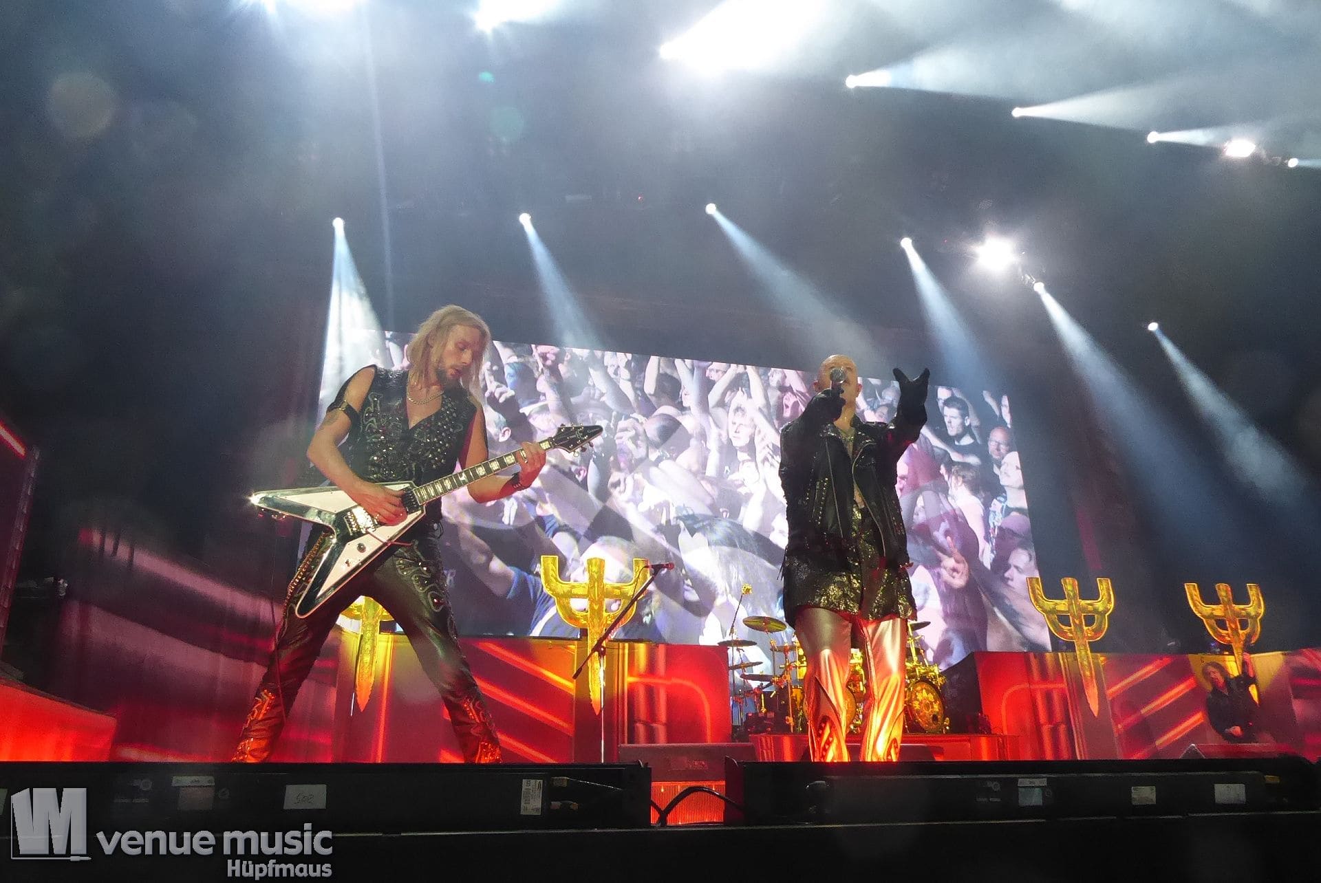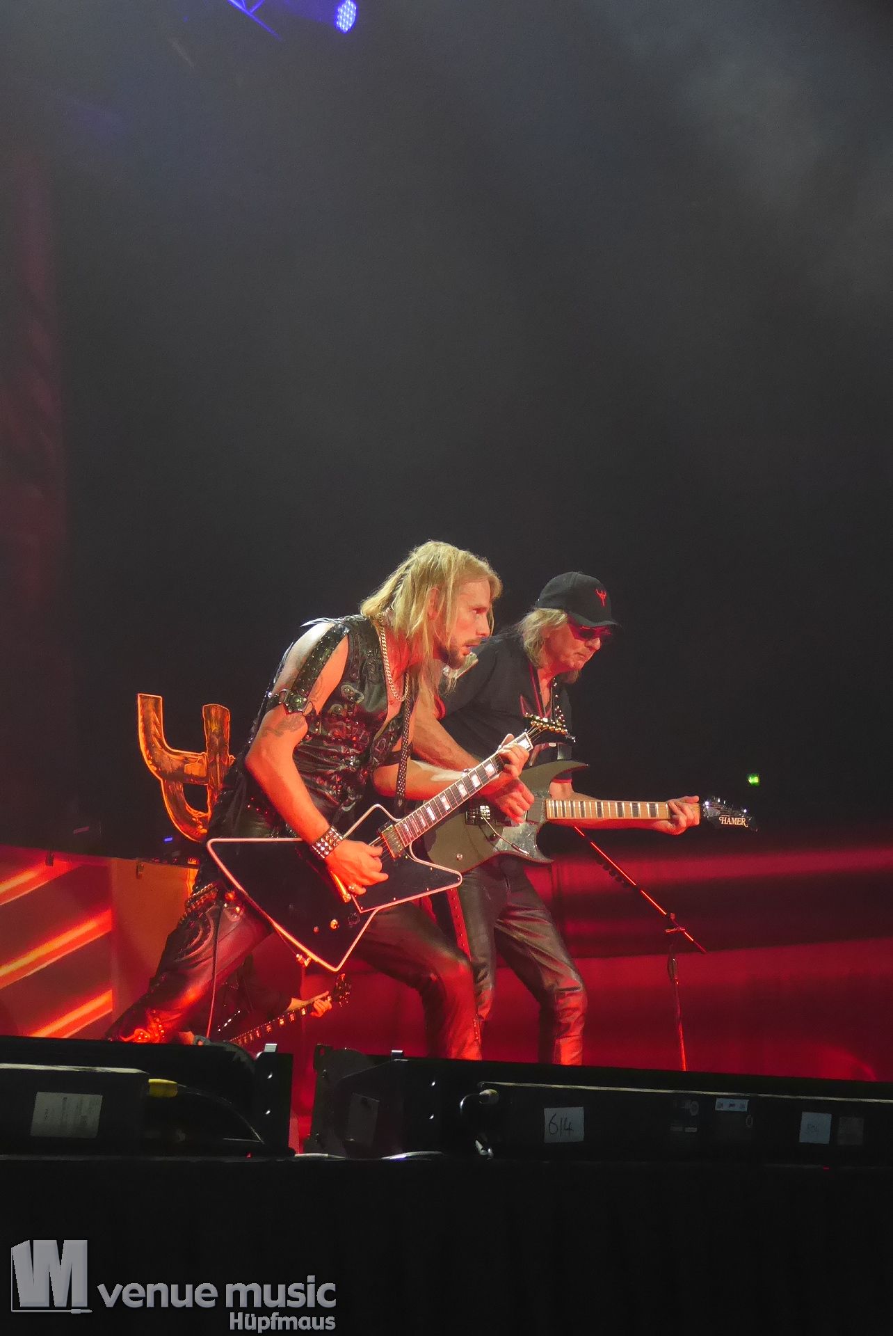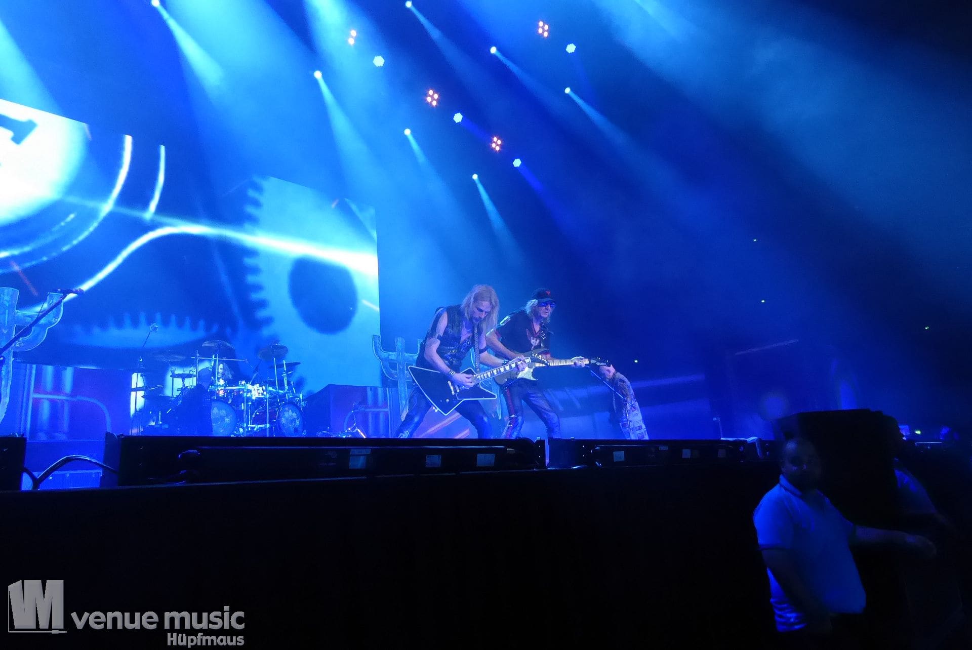 Die Bühnenshow war klasse, klaro, dass auch ein Motorrad mit dabei sein musste. Allerdings hatte man das Gefühl, dass Rob Halford nicht alle Texte gleichermaßen gut auf dem Schirm hatte und in der Bühnenmitte ein Monitor stand, von dessen Seite er vor allem bei den ganz bekannten Klassikern wich. Denn da kam er auch schon mal zum vorderen Rand der Bühne. Aber was solls, das tat der Stimmung keinen Abbruch und verzeihen wir im die – vermeintliche – Gedächtnisstütze. Die brauchen weitaus jüngere Musiker auch schon mal.