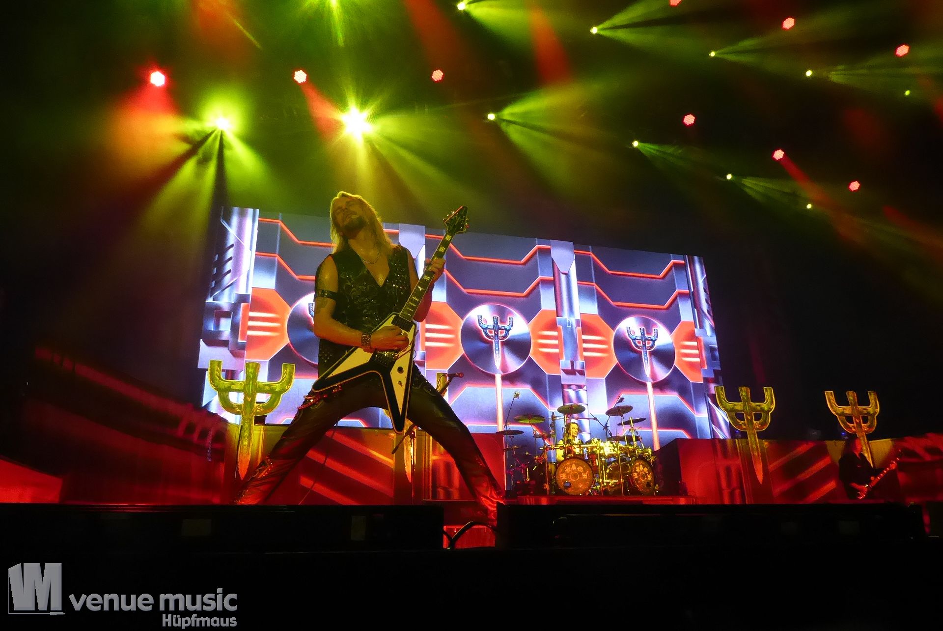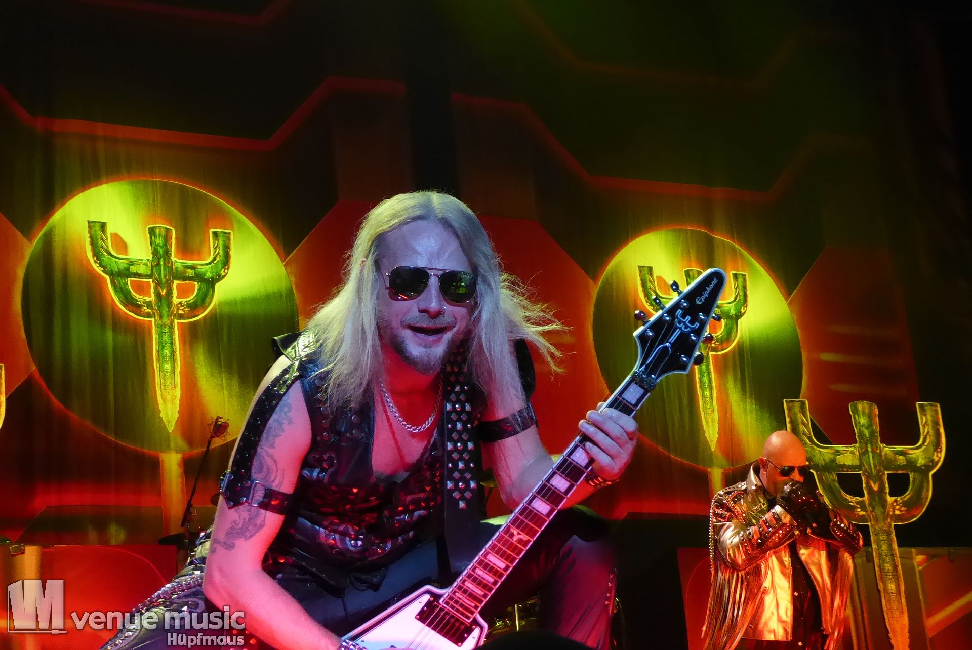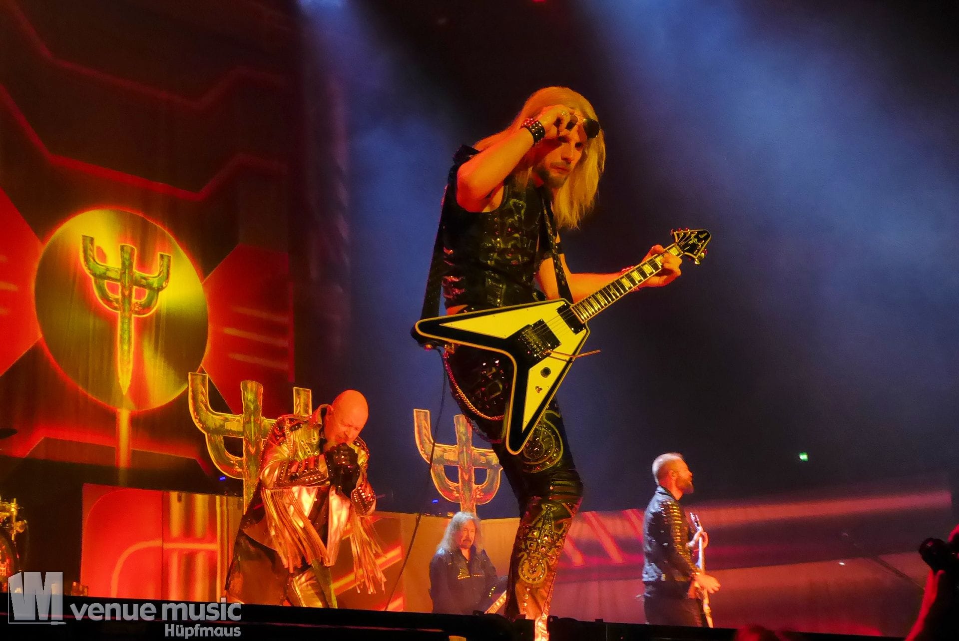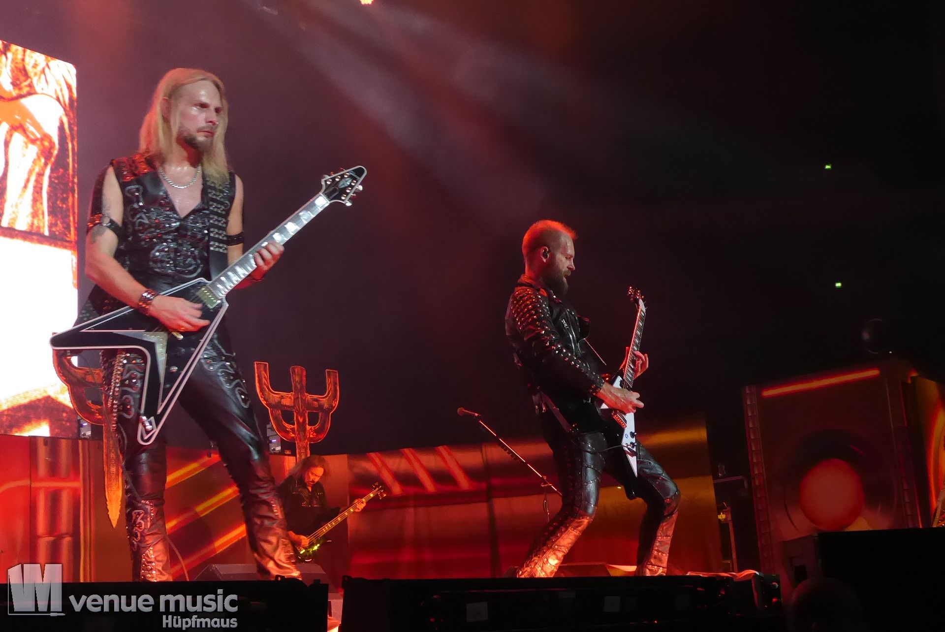 Die Bühnenshow war klasse, klaro, dass auch ein Motorrad mit dabei sein musste. Allerdings hatte man das Gefühl, dass Rob Halford nicht alle Texte gleichermaßen gut auf dem Schirm hatte und in der Bühnenmitte ein Monitor stand, von dessen Seite er vor allem bei den ganz bekannten Klassikern wich. Denn da kam er auch schon mal zum vorderen Rand der Bühne. Aber was solls, das tat der Stimmung keinen Abbruch und verzeihen wir im die – vermeintliche – Gedächtnisstütze. Die brauchen weitaus jüngere Musiker auch schon mal.