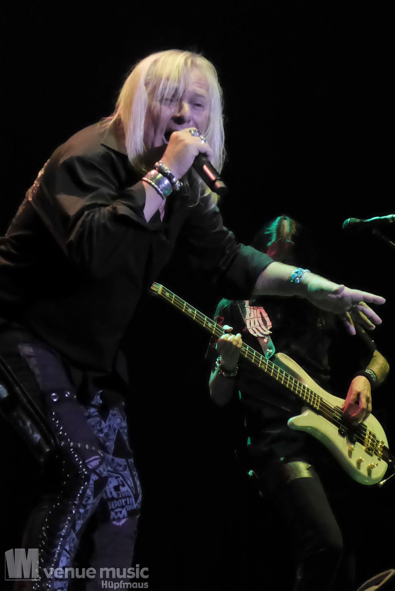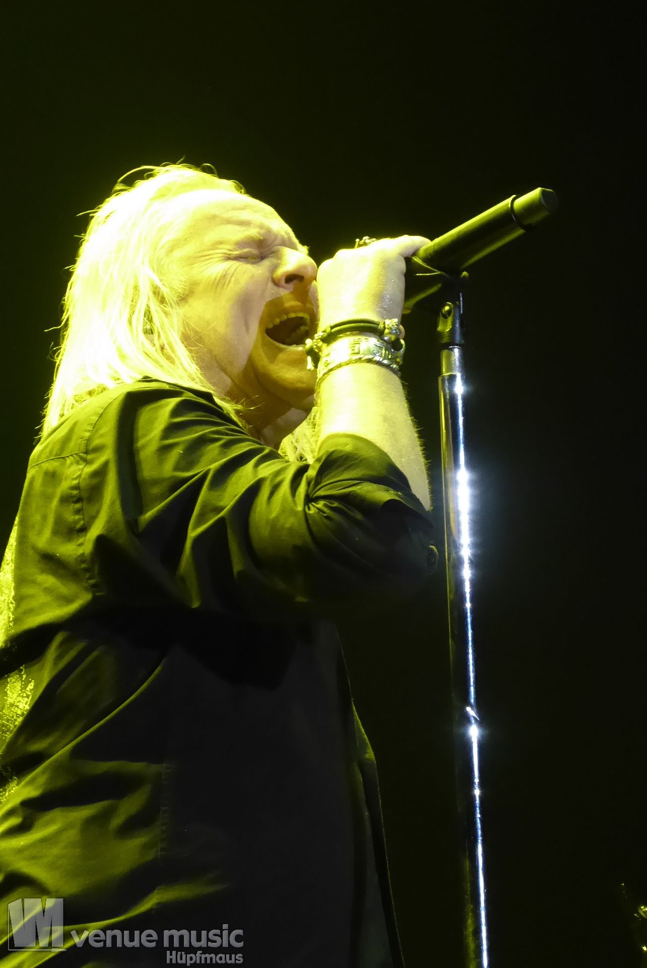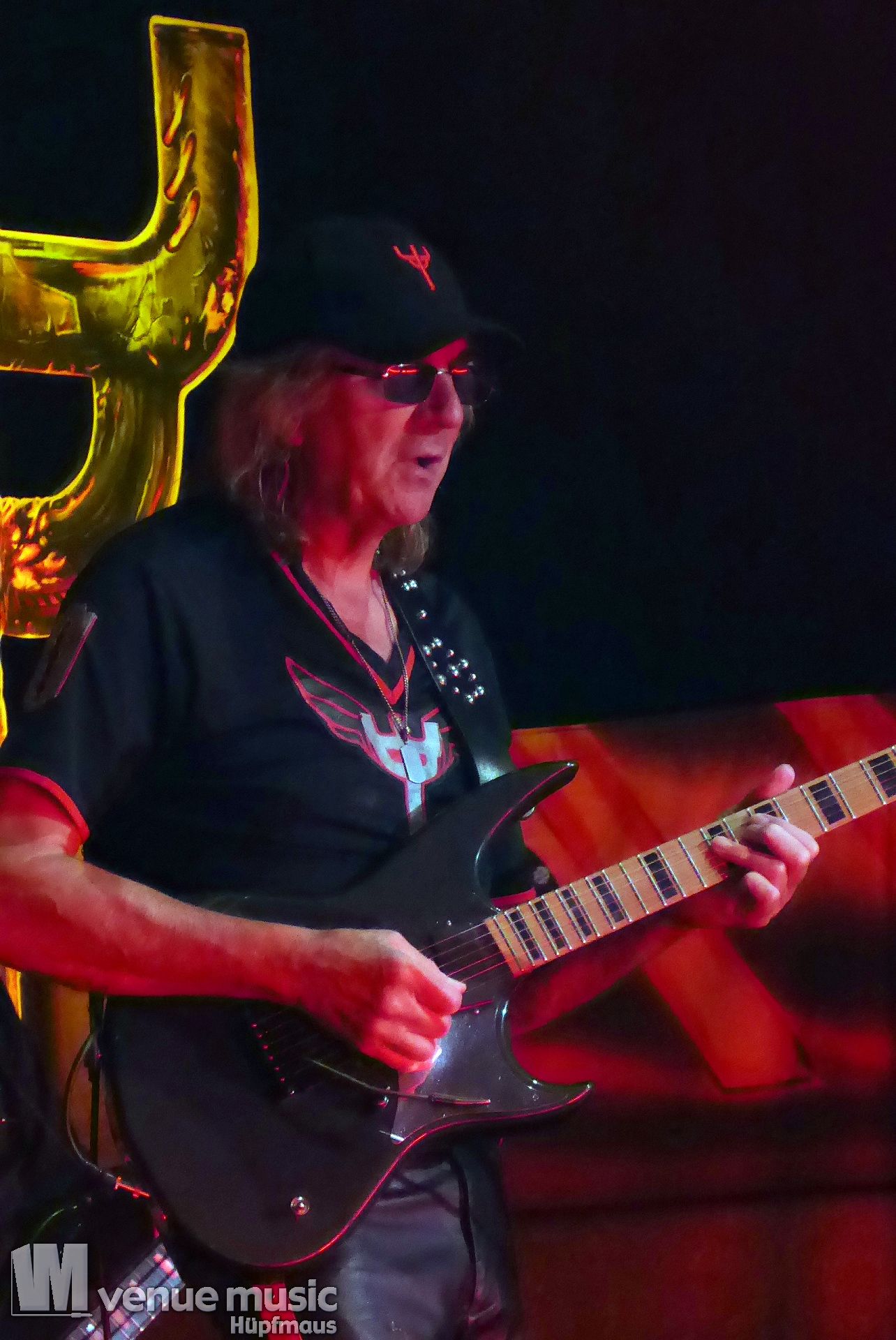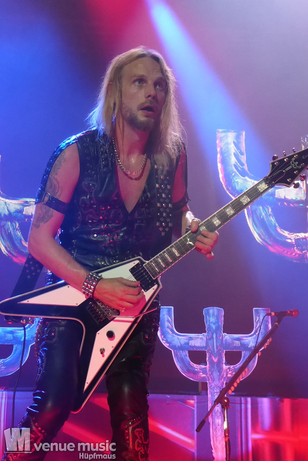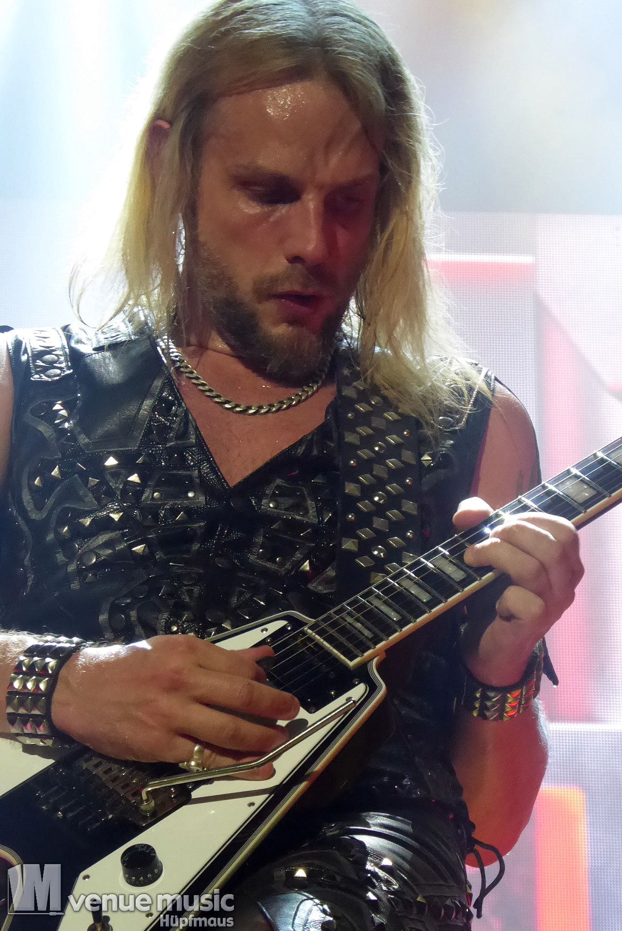 Die Bühnenshow war klasse, klaro, dass auch ein Motorrad mit dabei sein musste. Allerdings hatte man das Gefühl, dass Rob Halford nicht alle Texte gleichermaßen gut auf dem Schirm hatte und in der Bühnenmitte ein Monitor stand, von dessen Seite er vor allem bei den ganz bekannten Klassikern wich. Denn da kam er auch schon mal zum vorderen Rand der Bühne. Aber was solls, das tat der Stimmung keinen Abbruch und verzeihen wir im die – vermeintliche – Gedächtnisstütze. Die brauchen weitaus jüngere Musiker auch schon mal.