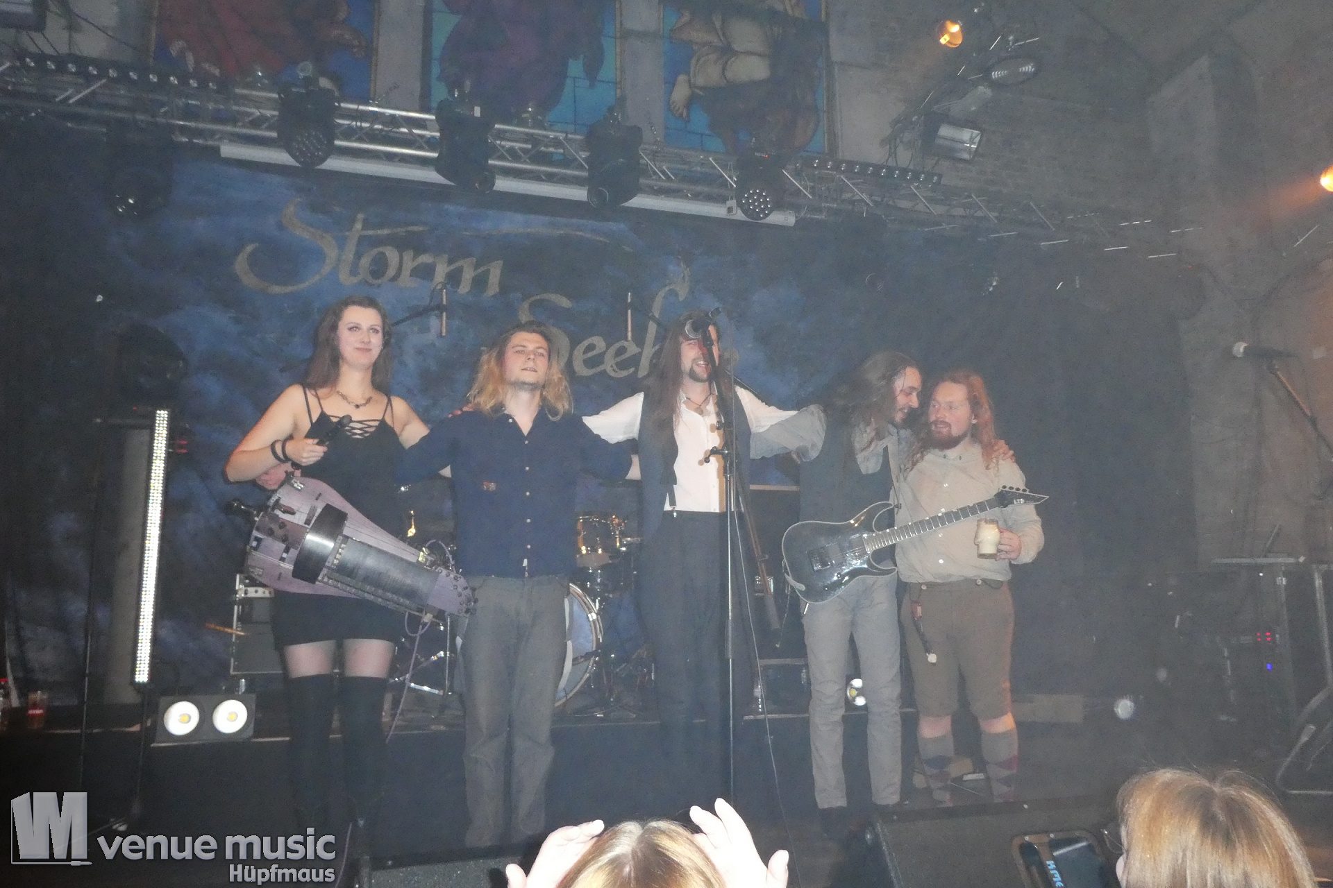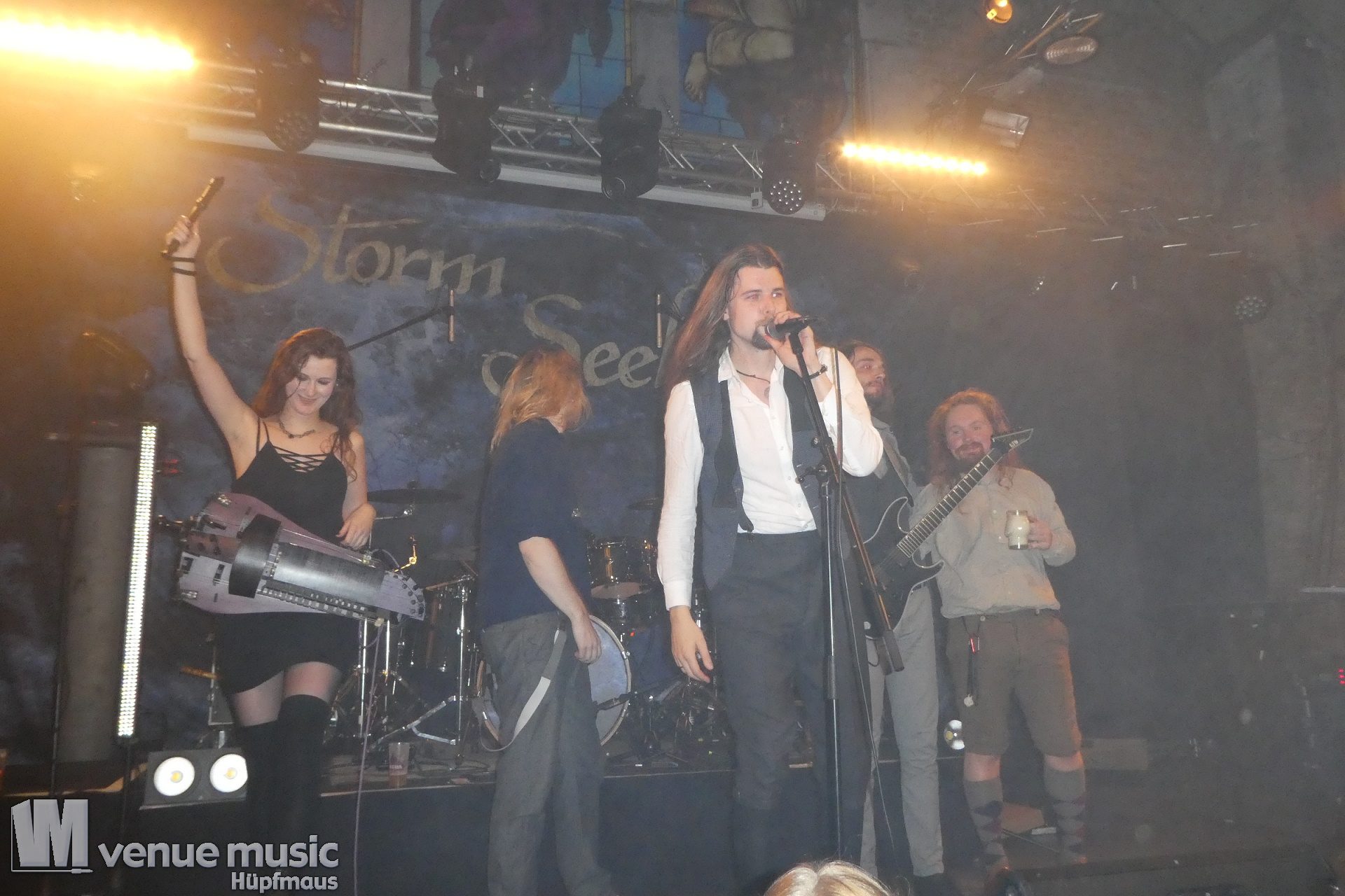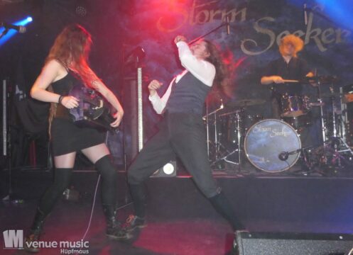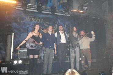 Aber Vanaheim waren nach ihrem Auftritt noch nicht verschwunden, denn sie hatten nach dem Umbau ja Feierabend und konnten den Auftritt von Storm Seeker dann direkt mal vor der Bühne im Publikum mitverfolgen. Und hatten ebenfalls sichtlich Spaß dabei ;) Nun ging es nicht mehr ganz so hart beim Gesang zu, jetzt waren wir aber dafür alle Piraten. Und was ein echter Piratenanwärter ist, der muss dann auch noch drei Prüfungen bestehen. Welche? Na, findet es doch einfach auf einem der nächsten Auftritte heraus! Hier wurde jedenfalls getanzt und gesungen. Und schon wieder jede Menge Spaß gehabt. Tim alias „Ughar der schrecklich Durstige“ am Keyboard machte seinem Namen alle Ehre, denn er hatte ein Bierfass bei sich stehen und zapfte fleissig. Für sich, die Band – und auch das Publikum ;) so musste durchaus mal ein Song ohne Keyboard begonnen werden (aber wer braucht schon ein Keyboard?! ;) ) Ein ganz neuer Song war mit im Set, der noch nie live gespielt wurde und den daher keiner mitsingen konnte. Außer diejenigen mit Insider-Wissen natürlich ;) ;) Schon wieder ein Band, die ich vorher nicht kannte (zumindest konnte ich mich an keinen Auftritt erinnern) und die absolut klasse war. Das Publikum hat super mitgemacht – das Rudern war mindestens so gut wie bei der Show von Amon Amarth… Eine Stunde konnten uns die Düsseldorfer mit ihrem Pirate-Folk begeistern. Und das so richtig. Wir waren auf jeden Fall warm getanzt für Manntra.