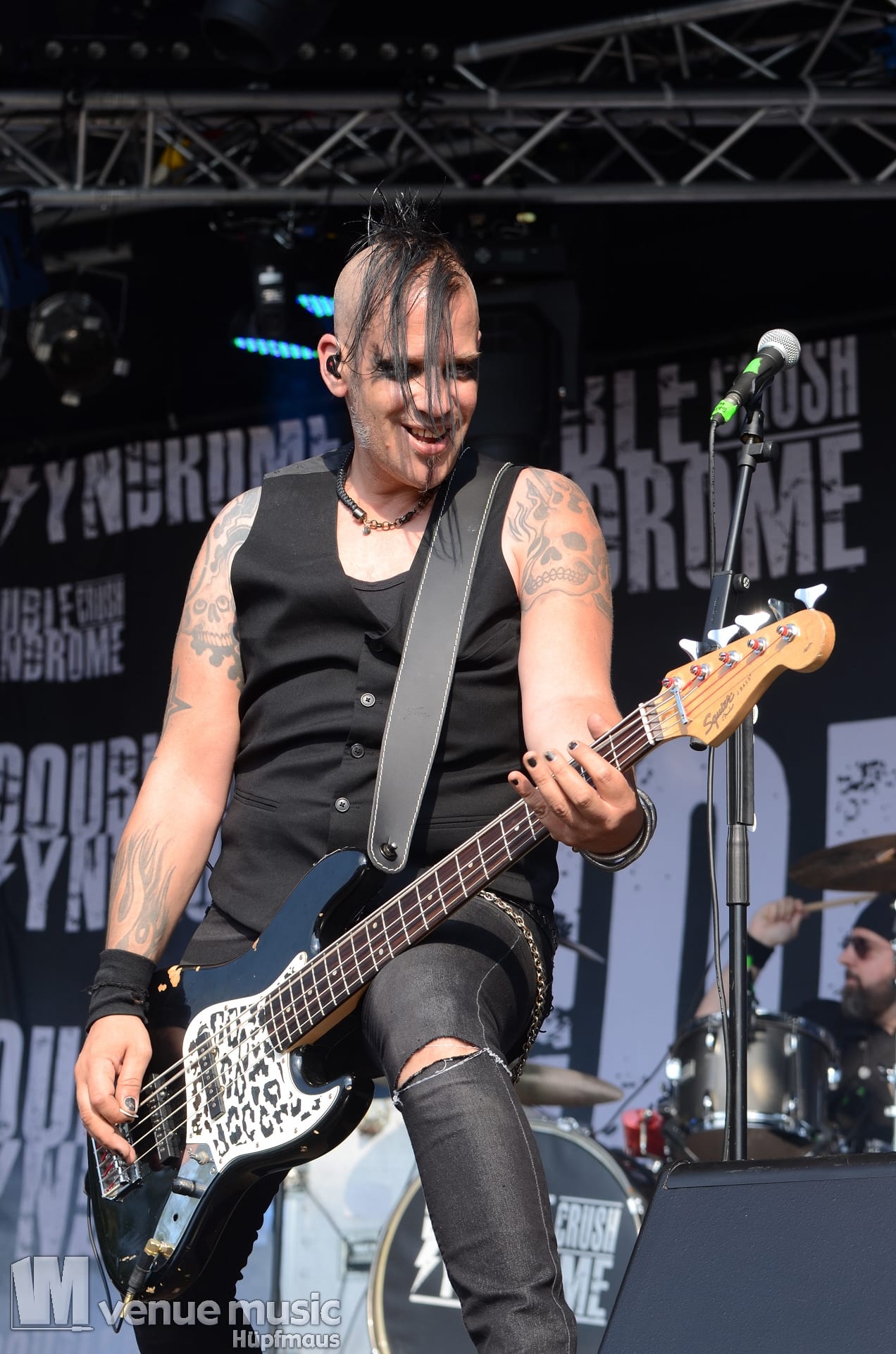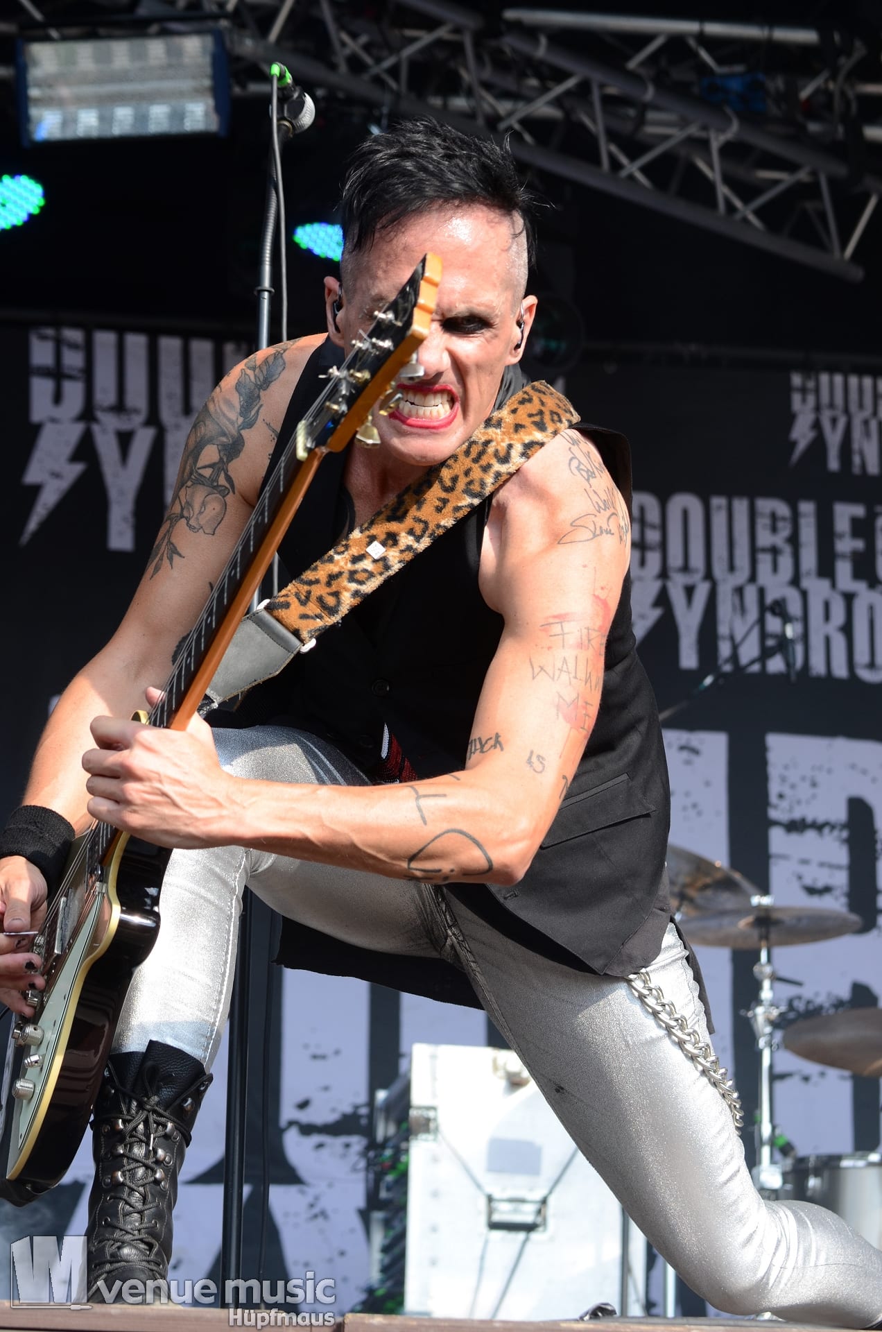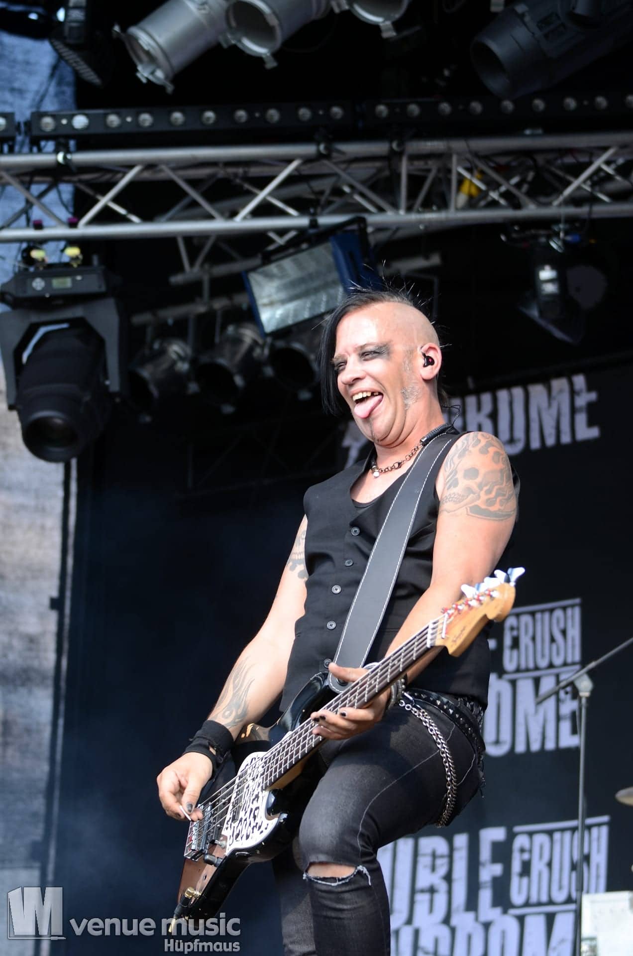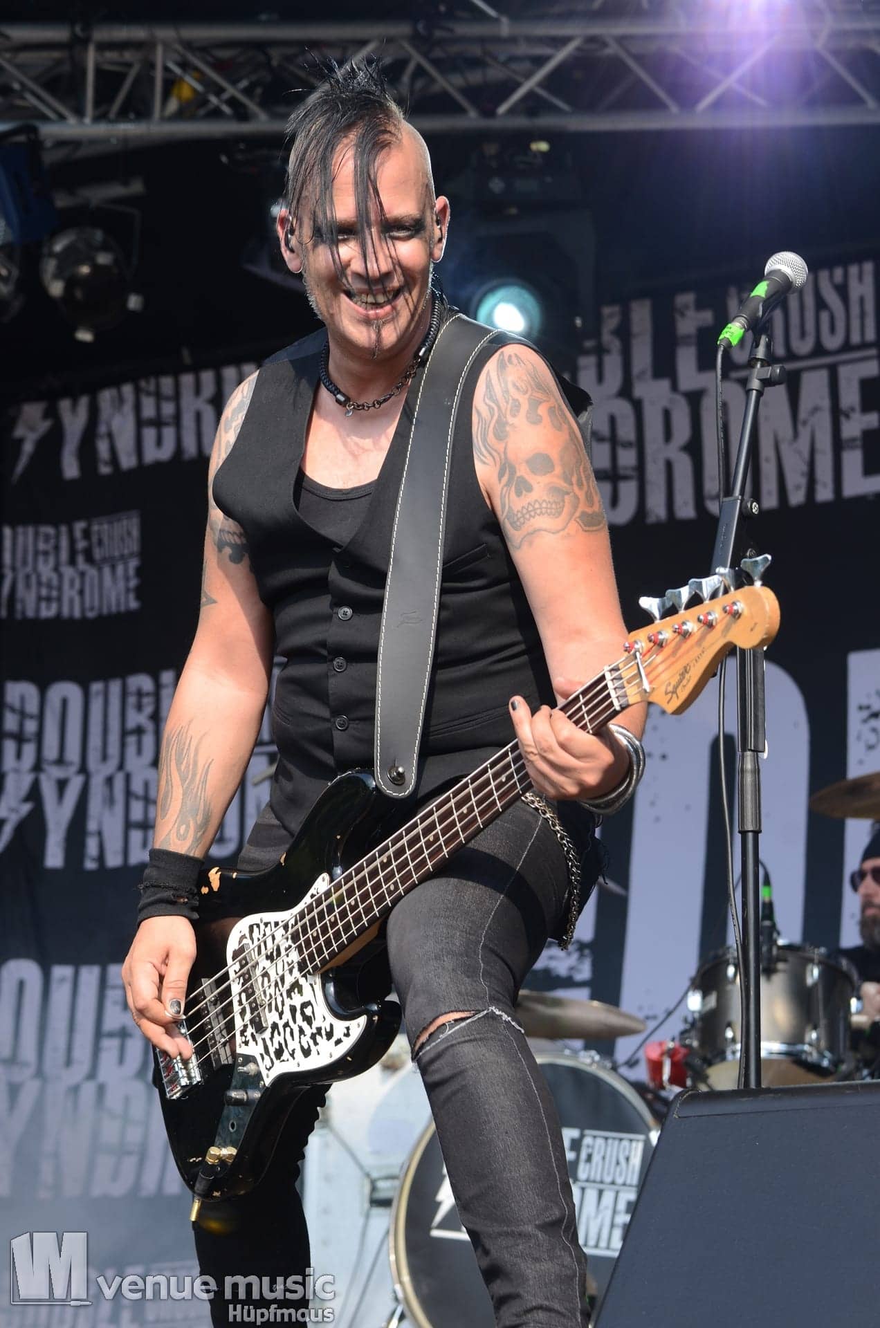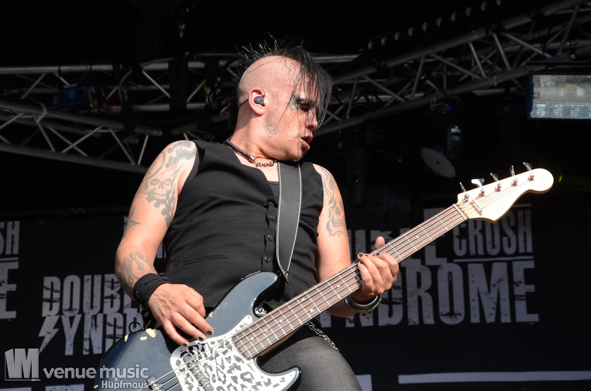 Als nächstes waren dann Double Crush Syndrome an der Reihe, die das Publikum sicher schon ein bisschen mehr polarisierten und mit ihrem Punk´n´Roll aber ebenfalls mächtig Stimmung machten. OK, über das Outfit von Andy Brings wollen wir mal nicht sprechen – wobei es eher die Schmink(nicht-)künste waren, die mehr so an einen Dreijährigen erinnerten, der seiner Mama den Lippenstift geklaut hat ;) aber was solls, es passte zu den drei Verrückten, die so richtig los rockten. Und schließlich ist das Outfit nur Nebensache – es geht schließlich um die Musik!