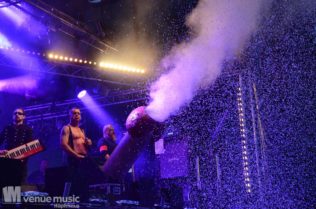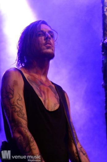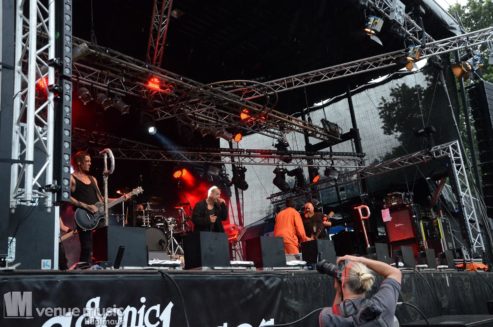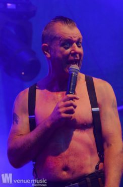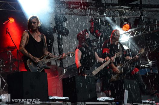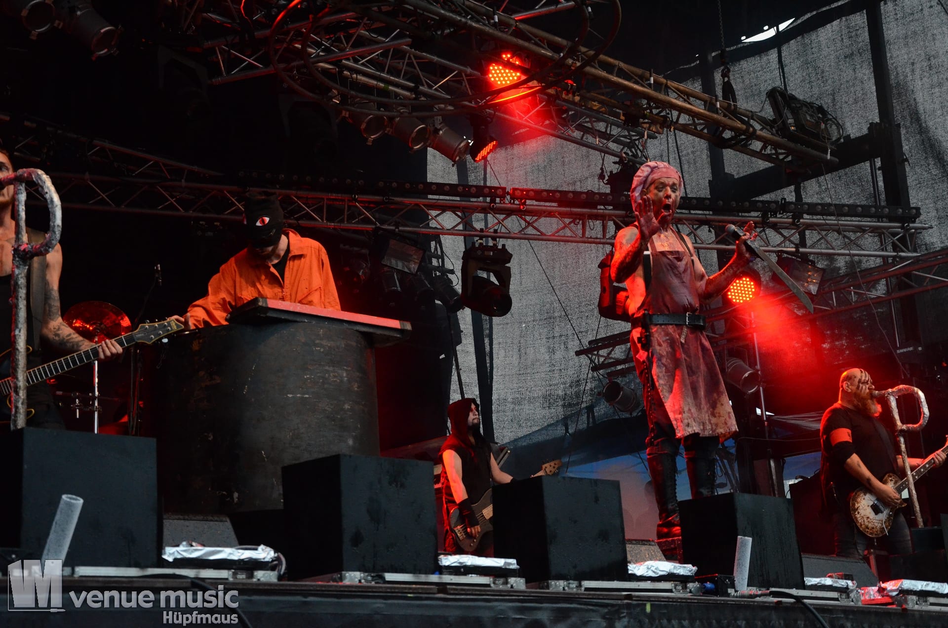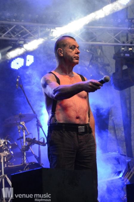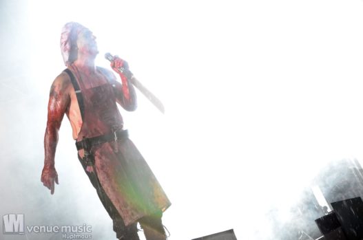 Der Auftritt stand wettertechnisch unter keinem guten Stern, denn schon zu Gothminister hatte es angefangen zu regnen – und das hörte auch erst gegen Ende vom Set von Stahlzeit wieder auf. (Dabei waren die Metallspürhunde doch gar nicht da gewesen und hatten „Böse Wetter“ gesungen.. In Erinnerung an eines der vergangenen Castle Rocks.. wer erinnert sich noch?) So war es eine doppelte Herausforderung, vernünftige Bilder zu bekommen, denn die Fotografen durften nicht in den Fotograben. Das wurde aber erst kurz vor Beginn bekannt gegeben, so war für mich in der ersten Reihe nur noch am Rand Platz. Aber lieber erste Reihe am Rand als woanders mittig. Zumindest als „normaler“ Konzertbesucher. Eingerahmt wurde ich von zwei 10-jährigen Mädels, beides Rammstein-Fans. Dass die Bühnenshow aber nicht für jedes Kind gleichermaßen geeignet ist, sollte sich im Verlauf des Konzerts noch zeigen.