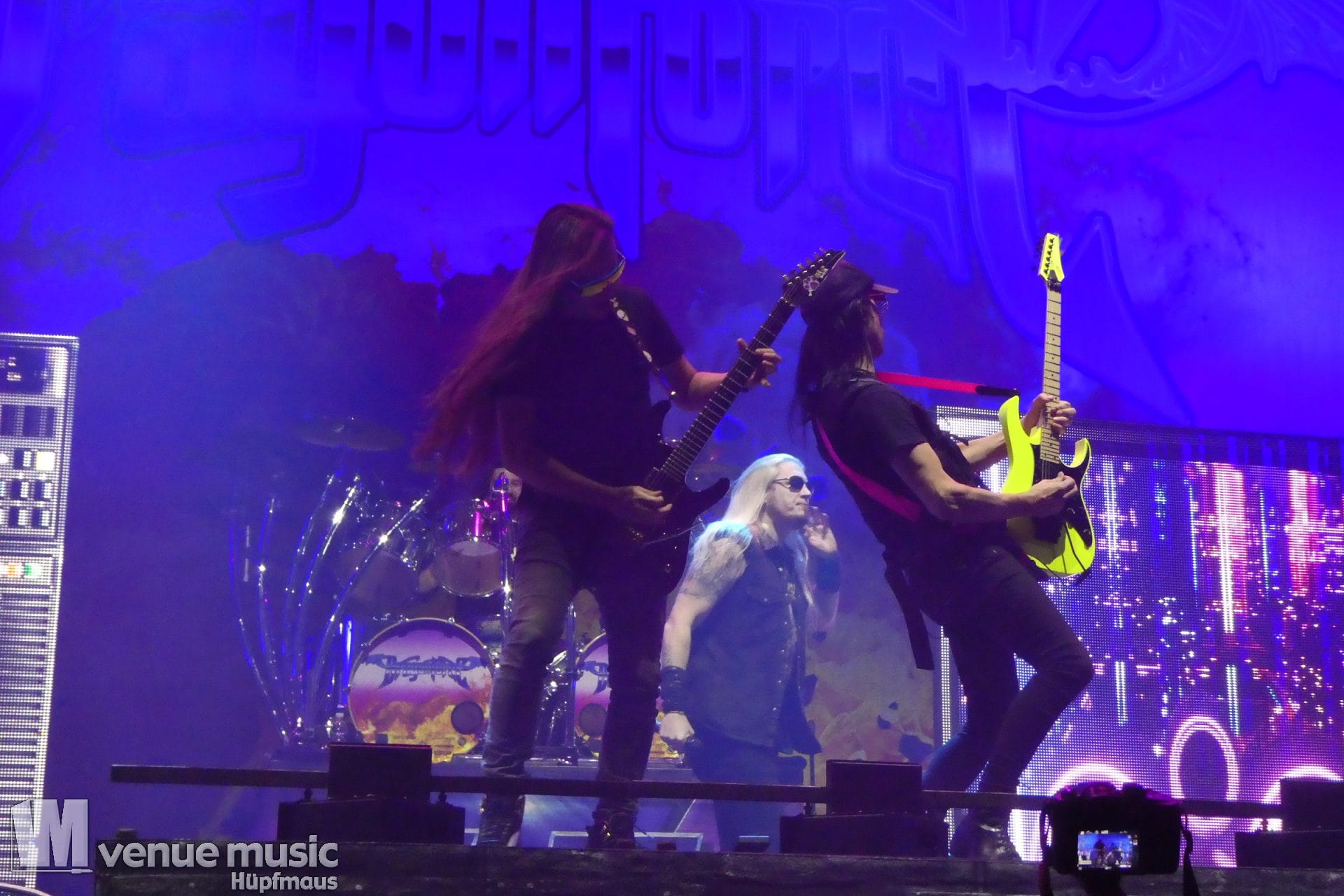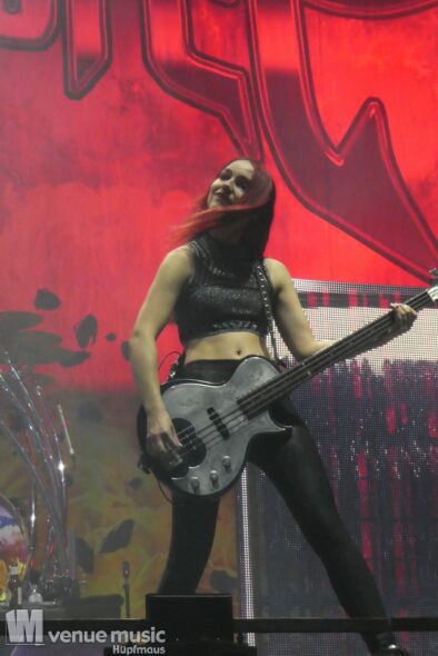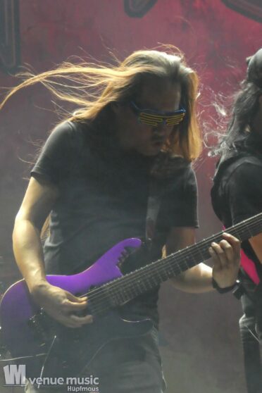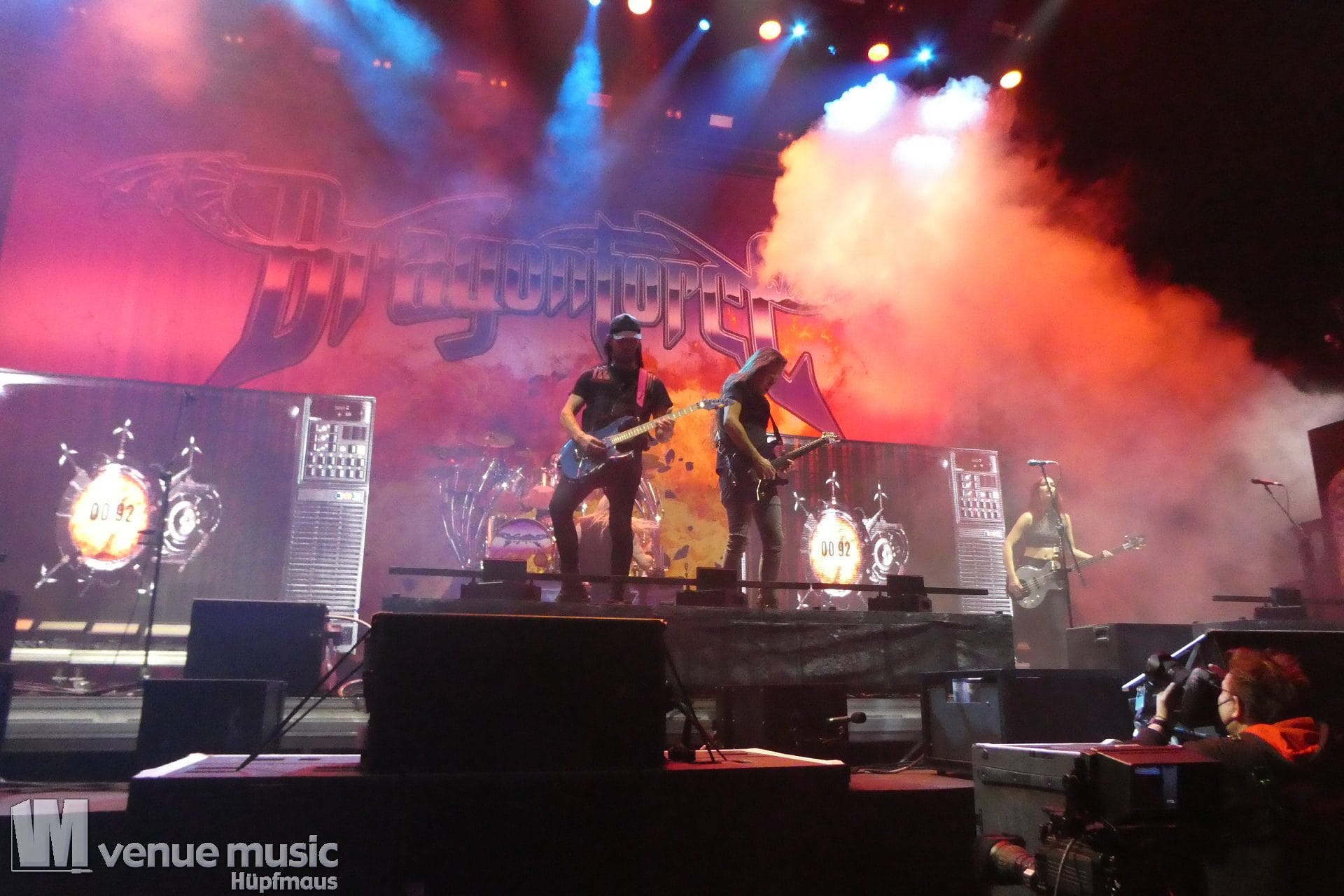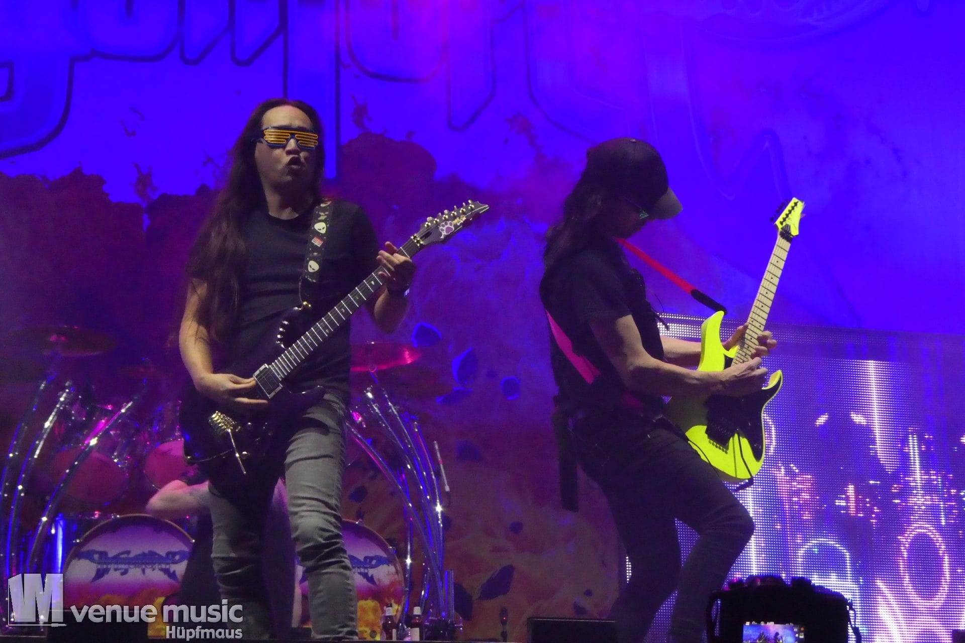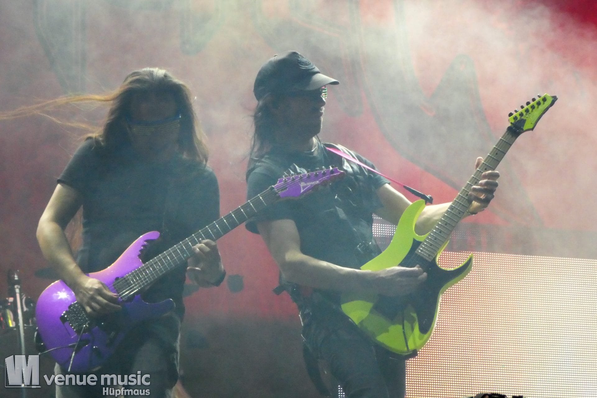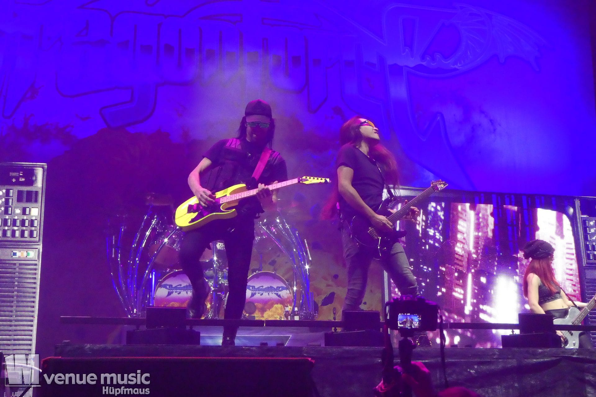 Dragonfoce hatte ich zuletzte vor ewigen Jahren gesehen und war komplett verdutzt, als der Sänger auf die Bühne kam – kannte ich doch noch ZP Theart am Mikro. Der Unterschied ist doch riesig ;) zumindest optisch… aber stimmungsmäßig ging es genau so gut ab wie damals und die Bühnendeko ist ziemlich cool. So sind die Mitglieder von Dragonforce Gamer und genau so wurde die Bühne gestaltet: mit Daddelautomaten als Podeste, auf denen „Spiele“ liefen, in denen die Band selbst als Character zu sehen war. Alleine das war es schon wert, den Auftritt zu sehen. Und dann noch die Energie auf der Bühne – das war megagenial!