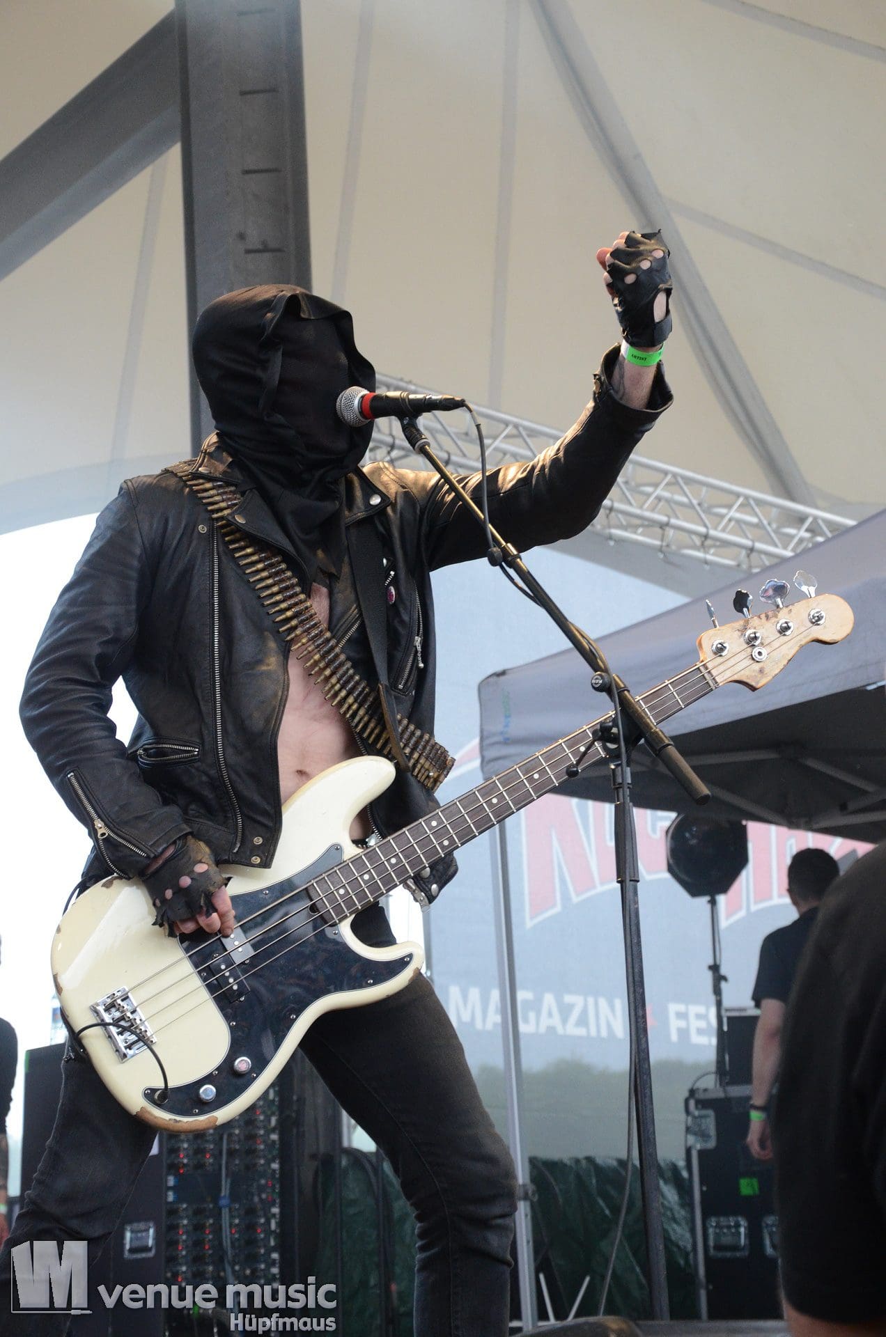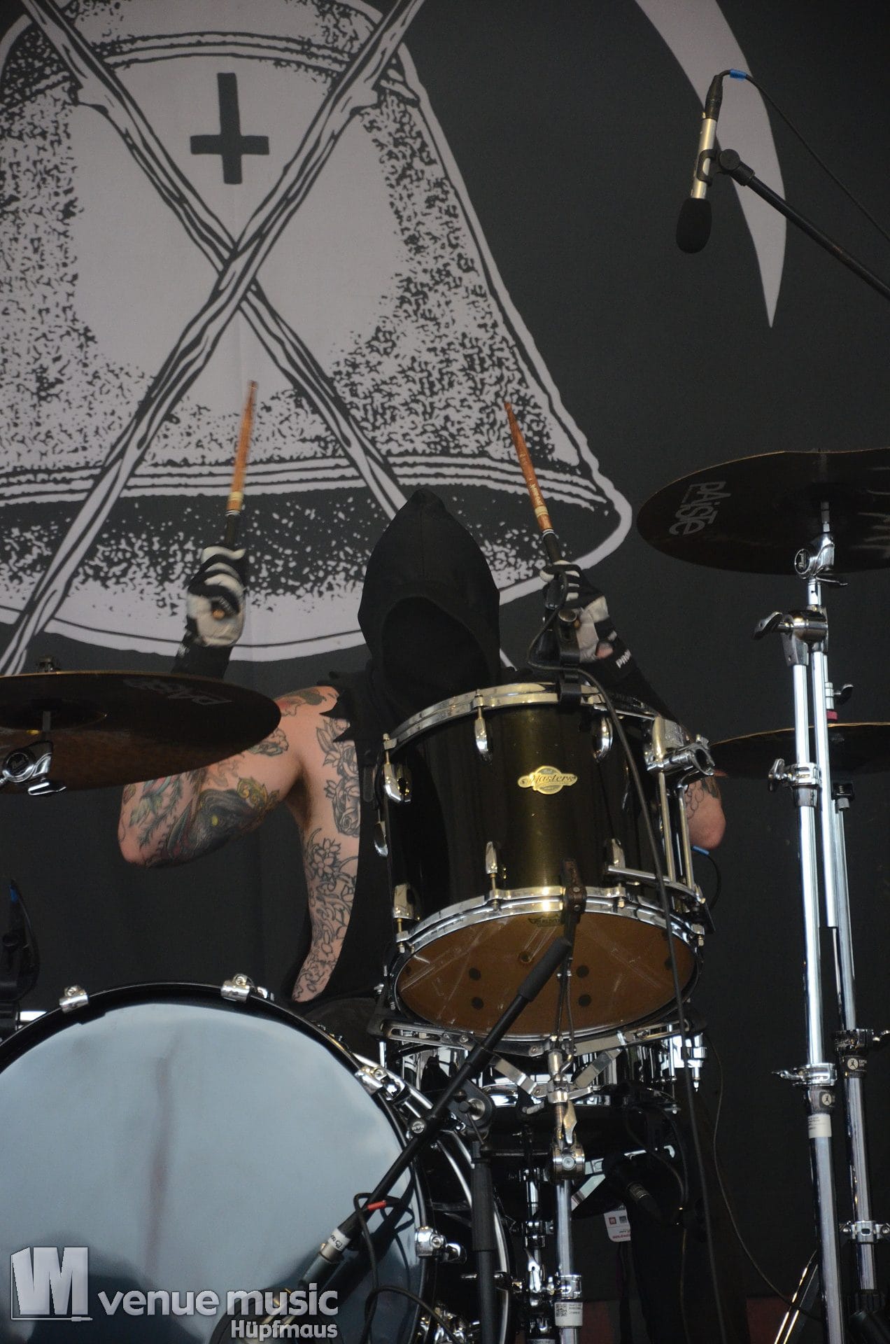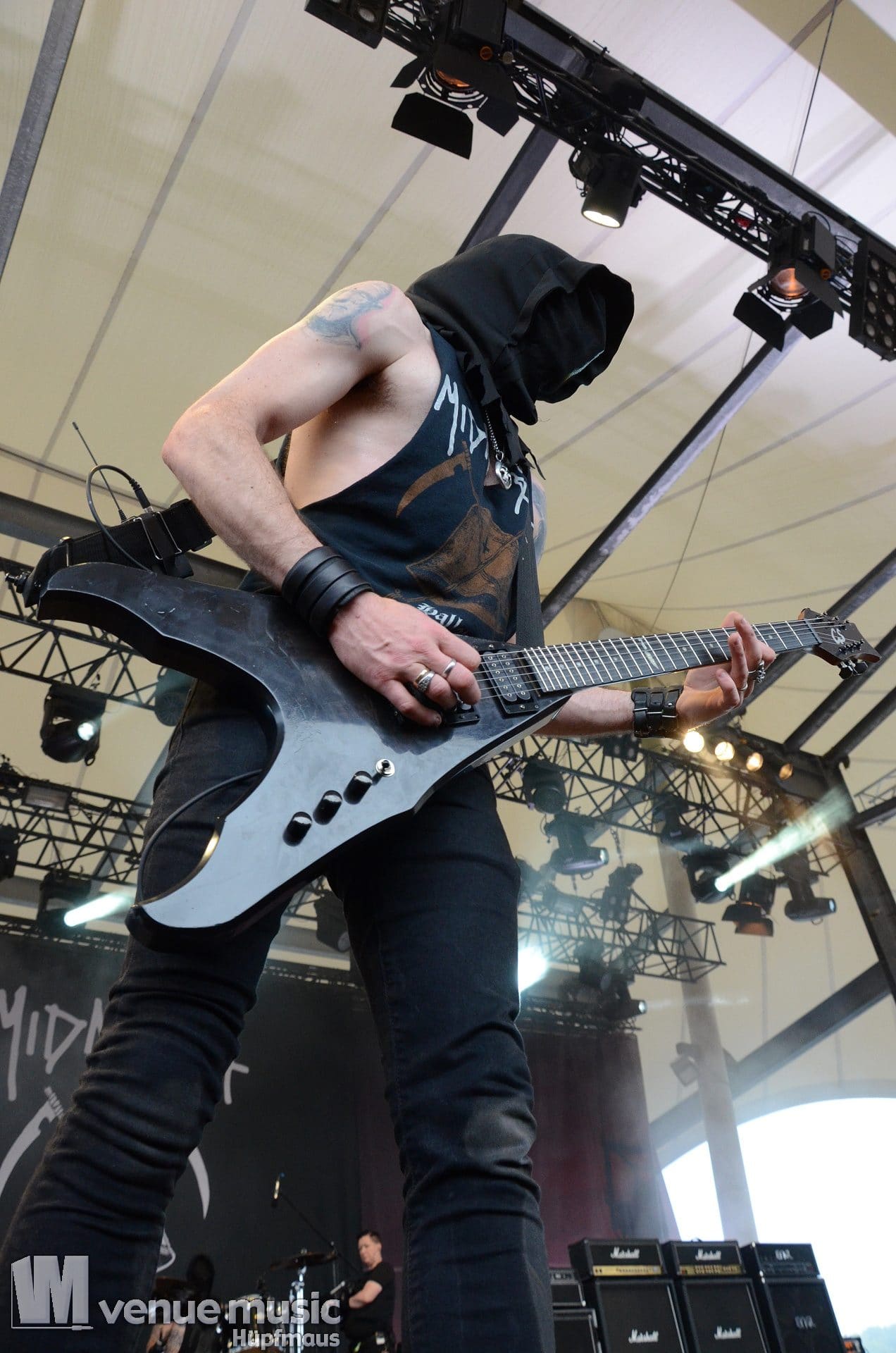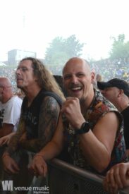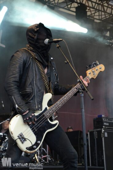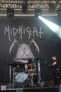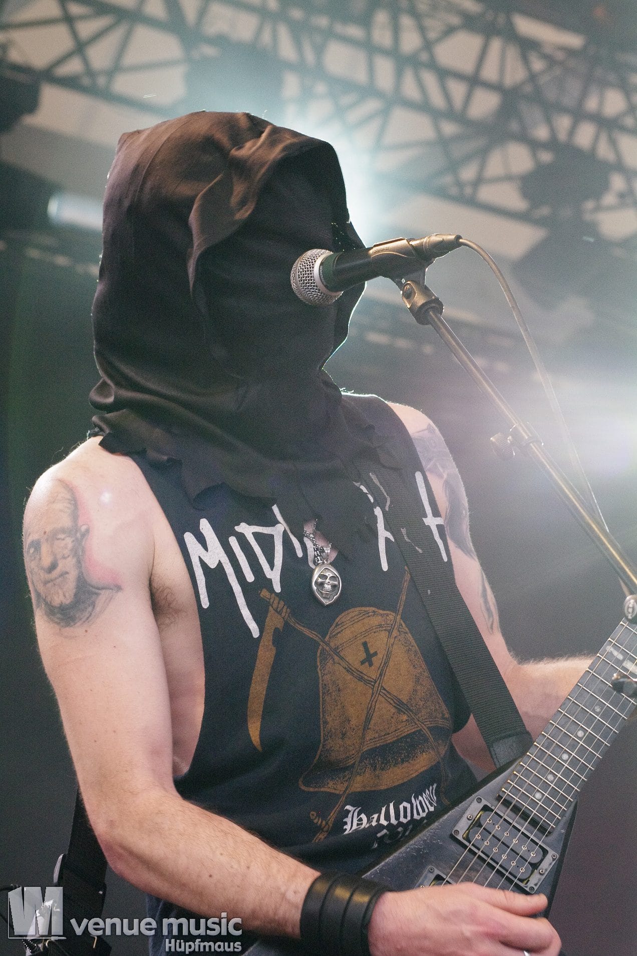 Midnight haben zwar nicht um Mitternacht gespielt, aber sich mittels ihrer Kapuzen in Dunkelheit begeben. Zumindest, was ihre Identität anging ;) Die drei Jungs aus Ohio hatten allerdings keine gute Karten beim Wettergott, denn der öffnete zeitweise mehr oder weniger stark seine Schleusen. Die Hardcore-Fans konnte das natürlich nicht schocken, also wurde weiter fleissig vor der Bühne mitgefeiert. Unter anderem von Teutonic Slaughter Sänger Philip in der ersten Reihe. Sonst auf der Bühne, heute mal davor ;) Auch nach ihrem Set war die Band noch zur Autogrammstunde inmitten ihrer Fans sehr lange anzutreffen.