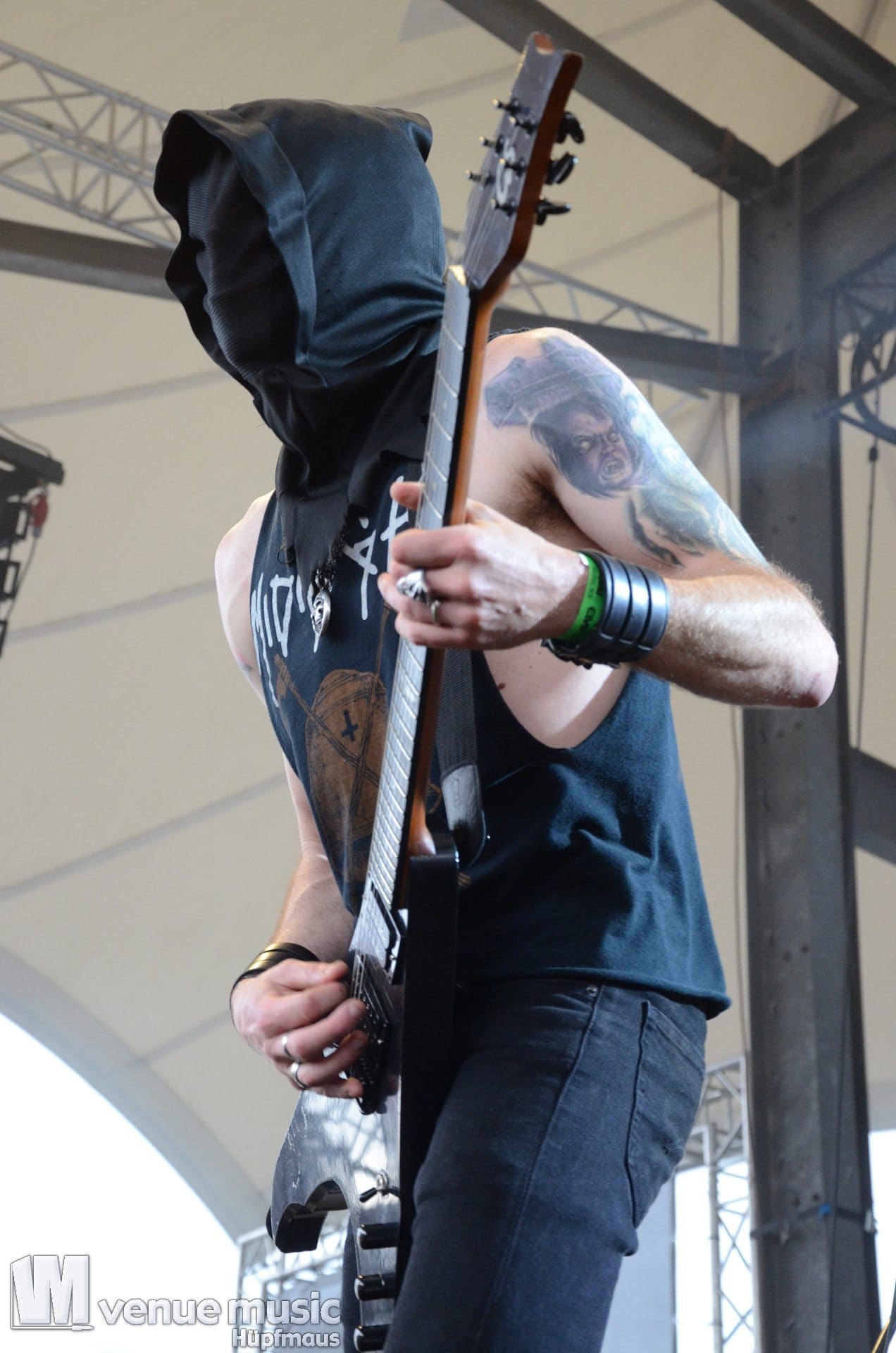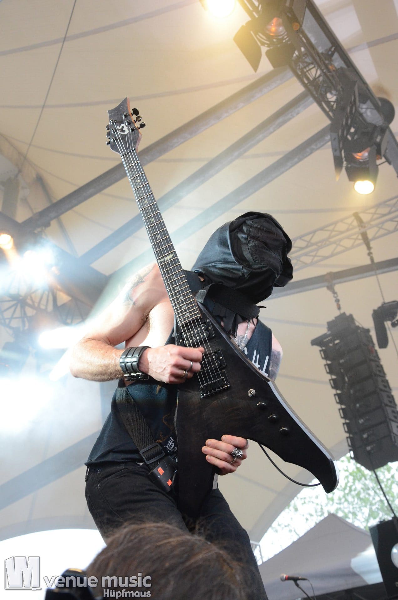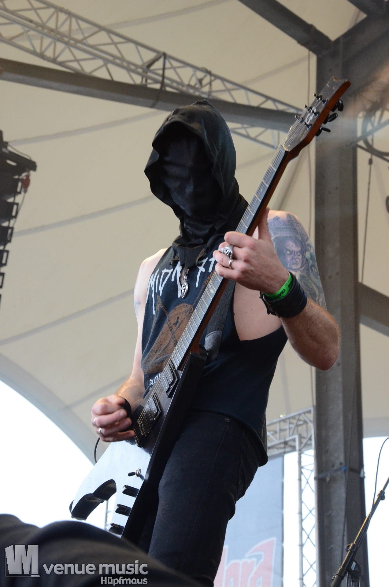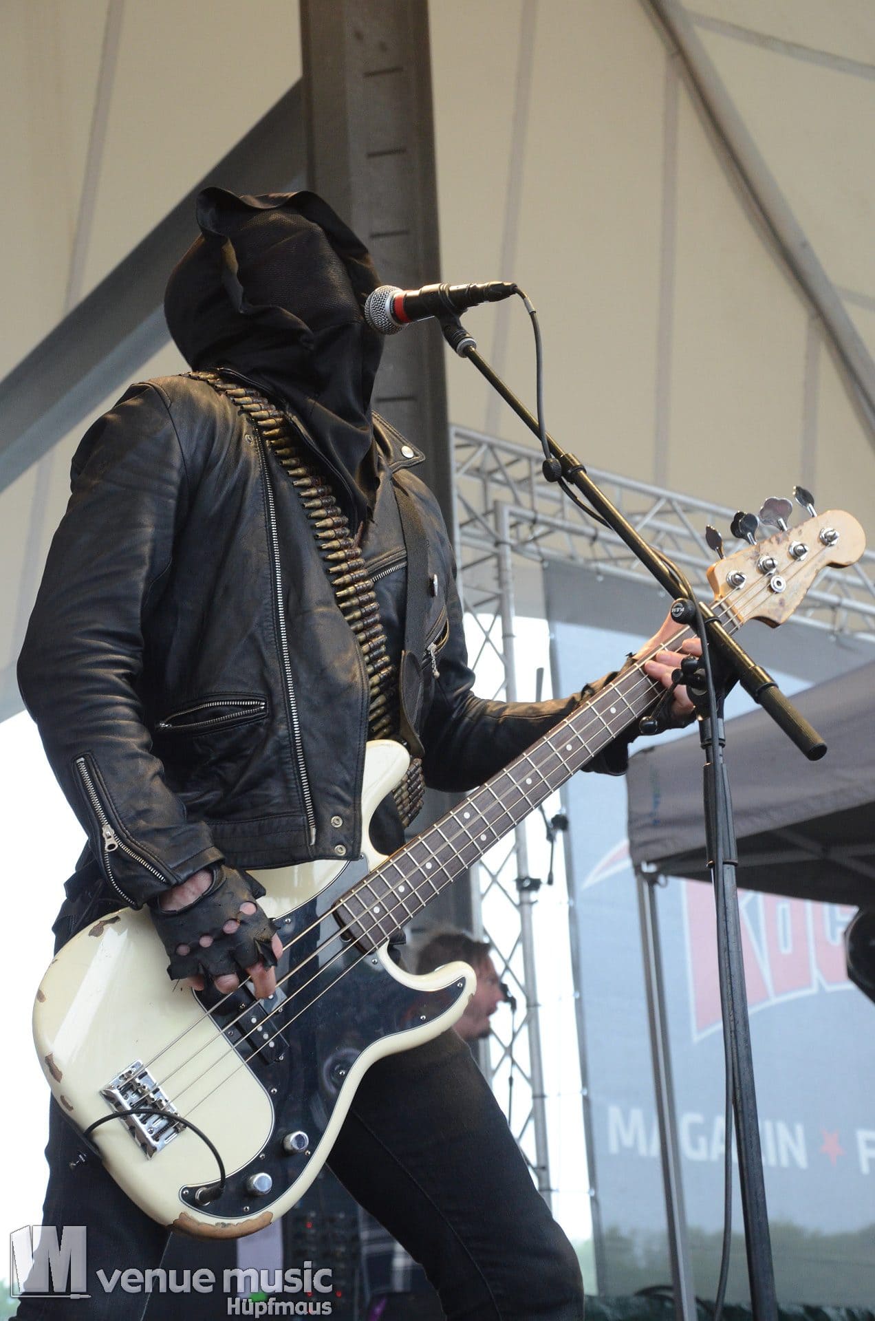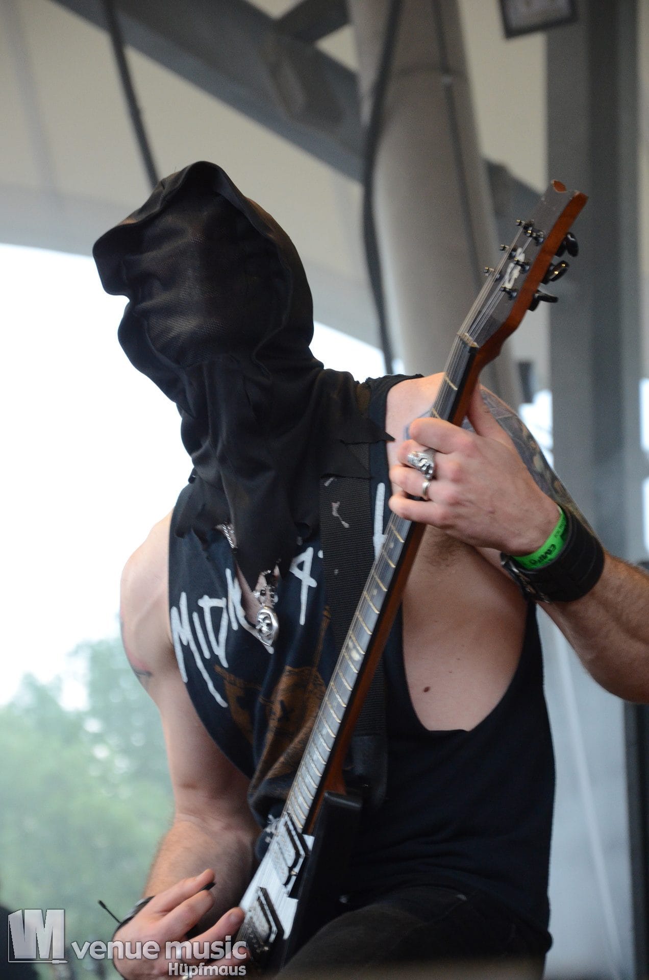 Midnight haben zwar nicht um Mitternacht gespielt, aber sich mittels ihrer Kapuzen in Dunkelheit begeben. Zumindest, was ihre Identität anging ;) Die drei Jungs aus Ohio hatten allerdings keine gute Karten beim Wettergott, denn der öffnete zeitweise mehr oder weniger stark seine Schleusen. Die Hardcore-Fans konnte das natürlich nicht schocken, also wurde weiter fleissig vor der Bühne mitgefeiert. Unter anderem von Teutonic Slaughter Sänger Philip in der ersten Reihe. Sonst auf der Bühne, heute mal davor ;) Auch nach ihrem Set war die Band noch zur Autogrammstunde inmitten ihrer Fans sehr lange anzutreffen.