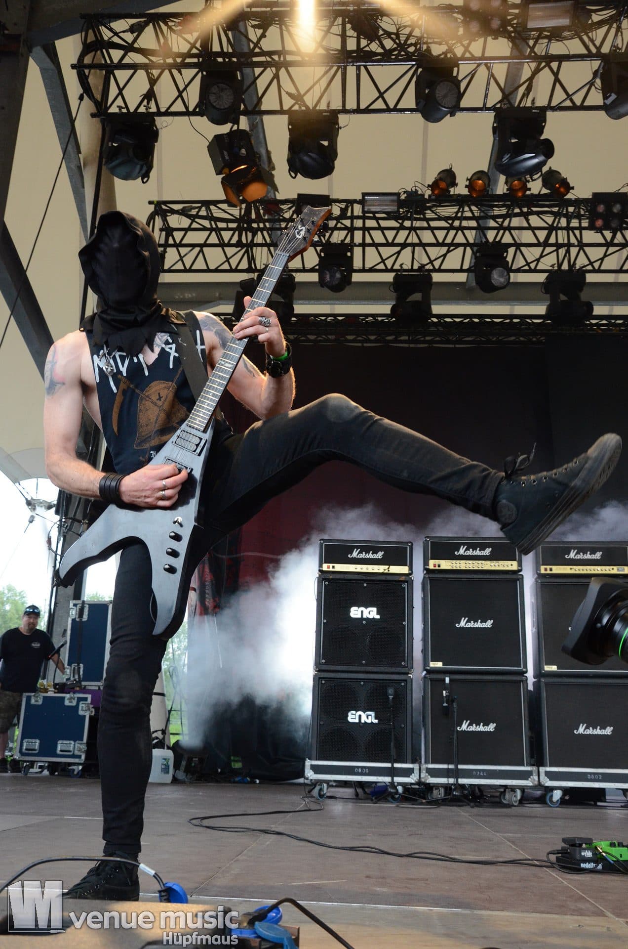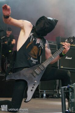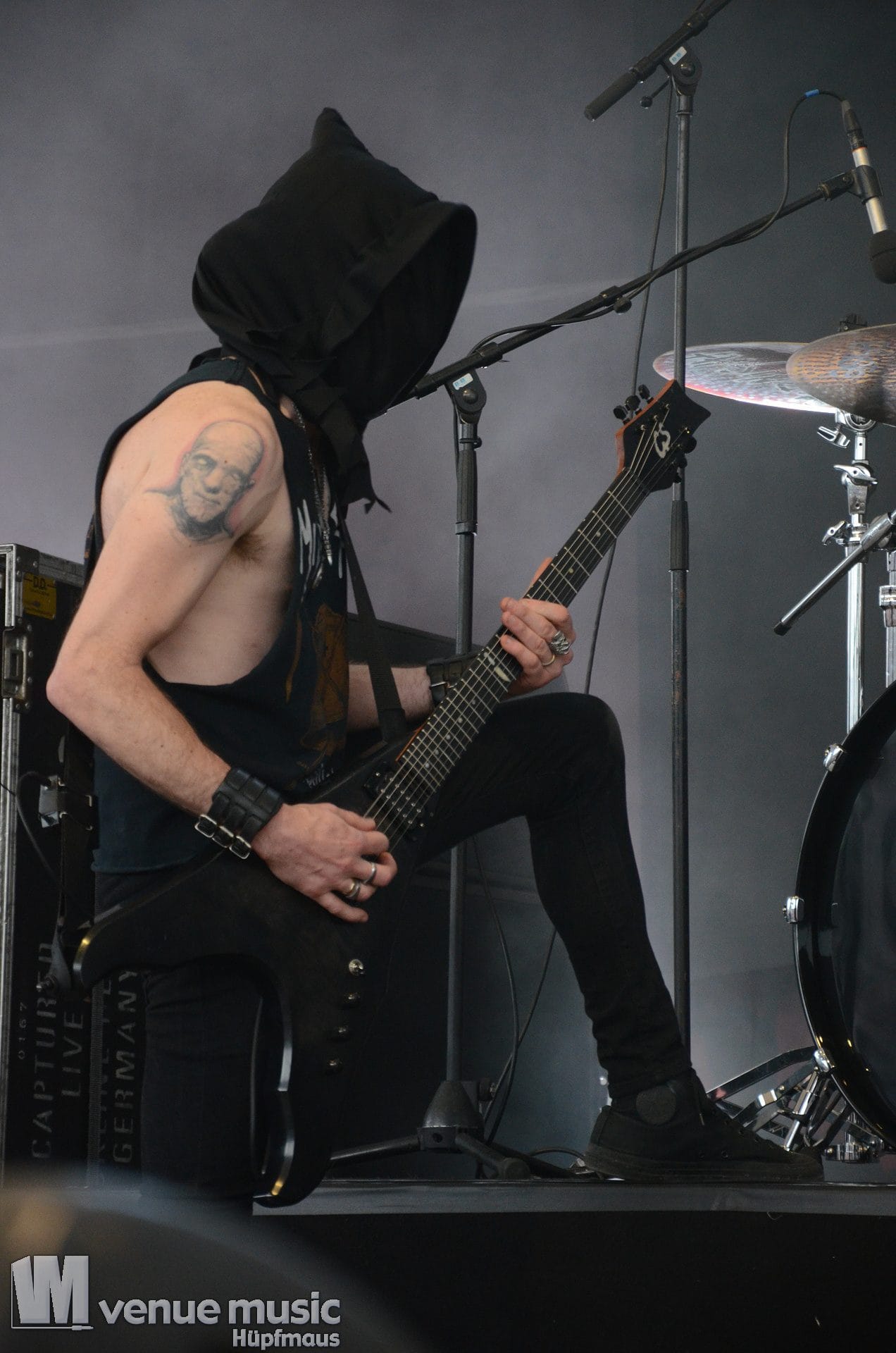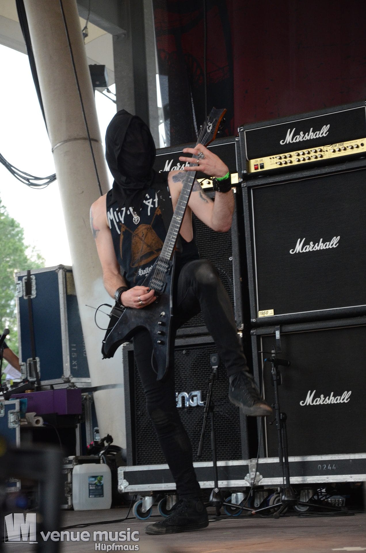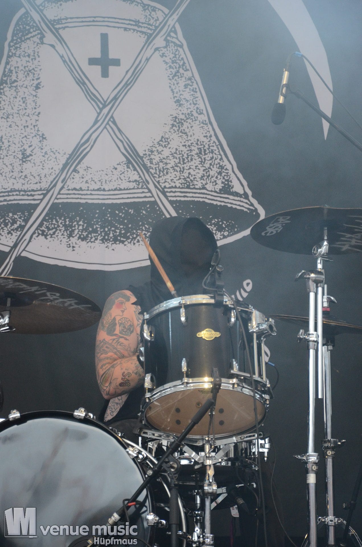 Midnight haben zwar nicht um Mitternacht gespielt, aber sich mittels ihrer Kapuzen in Dunkelheit begeben. Zumindest, was ihre Identität anging ;) Die drei Jungs aus Ohio hatten allerdings keine gute Karten beim Wettergott, denn der öffnete zeitweise mehr oder weniger stark seine Schleusen. Die Hardcore-Fans konnte das natürlich nicht schocken, also wurde weiter fleissig vor der Bühne mitgefeiert. Unter anderem von Teutonic Slaughter Sänger Philip in der ersten Reihe. Sonst auf der Bühne, heute mal davor ;) Auch nach ihrem Set war die Band noch zur Autogrammstunde inmitten ihrer Fans sehr lange anzutreffen.
