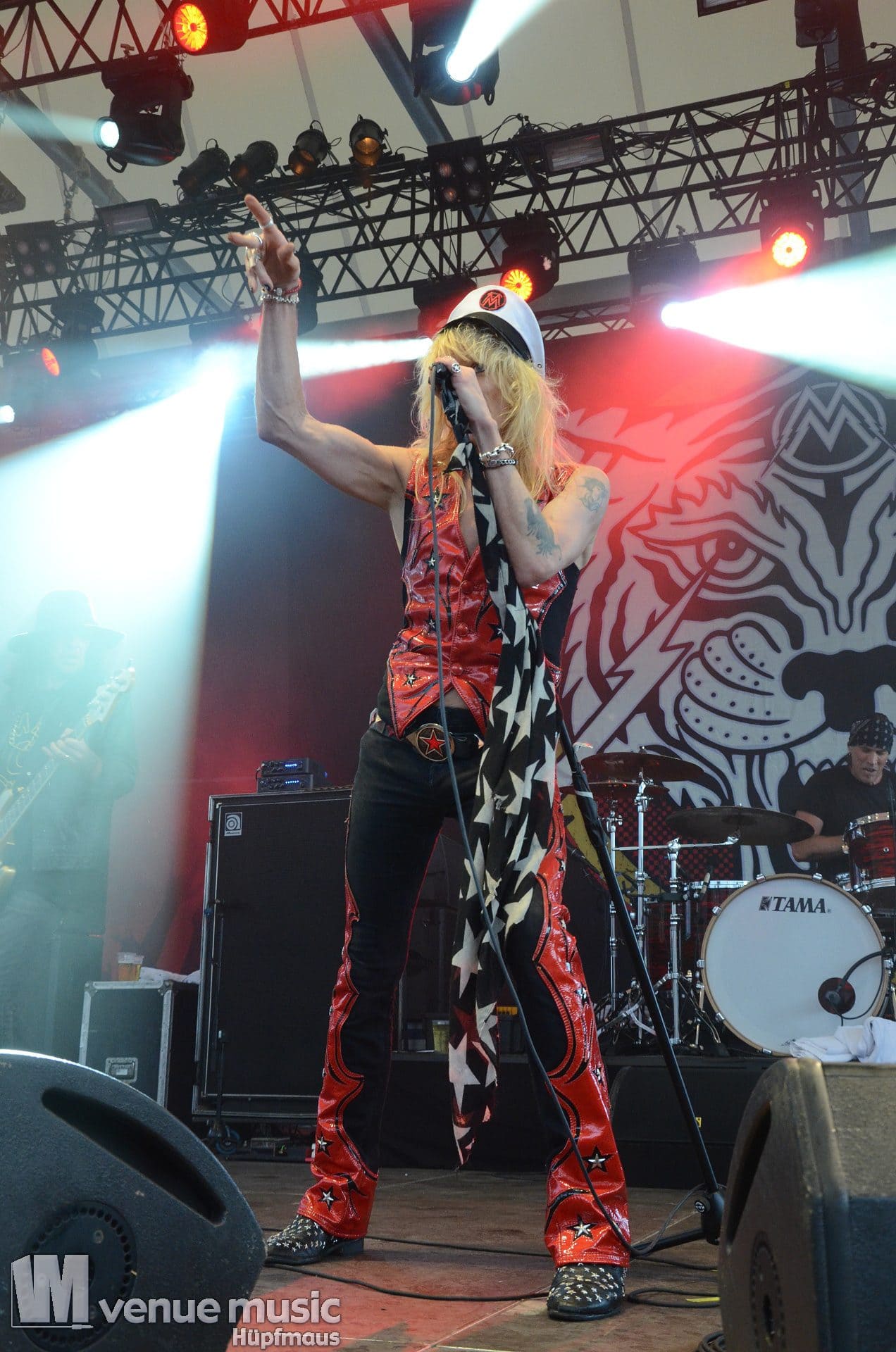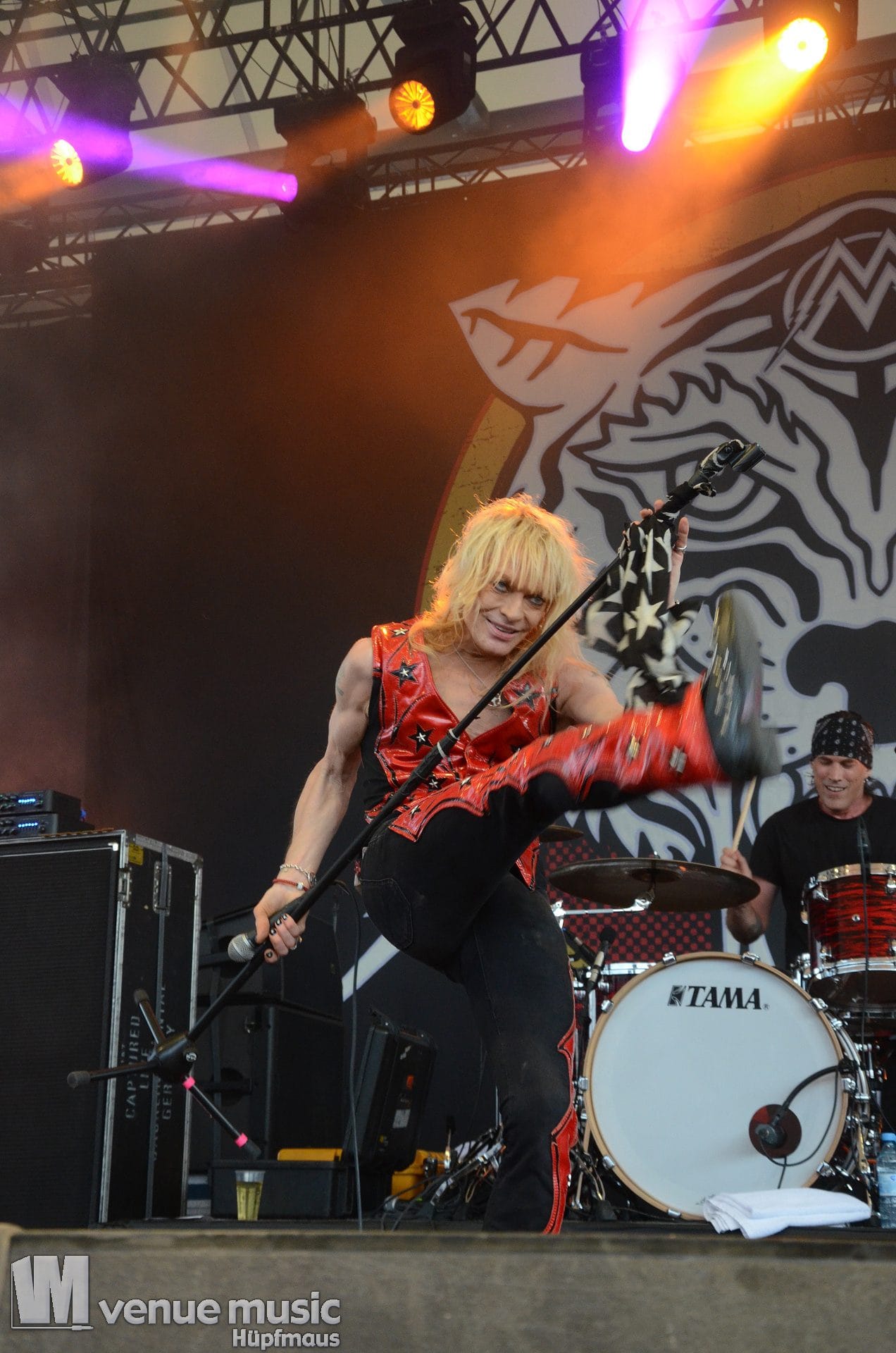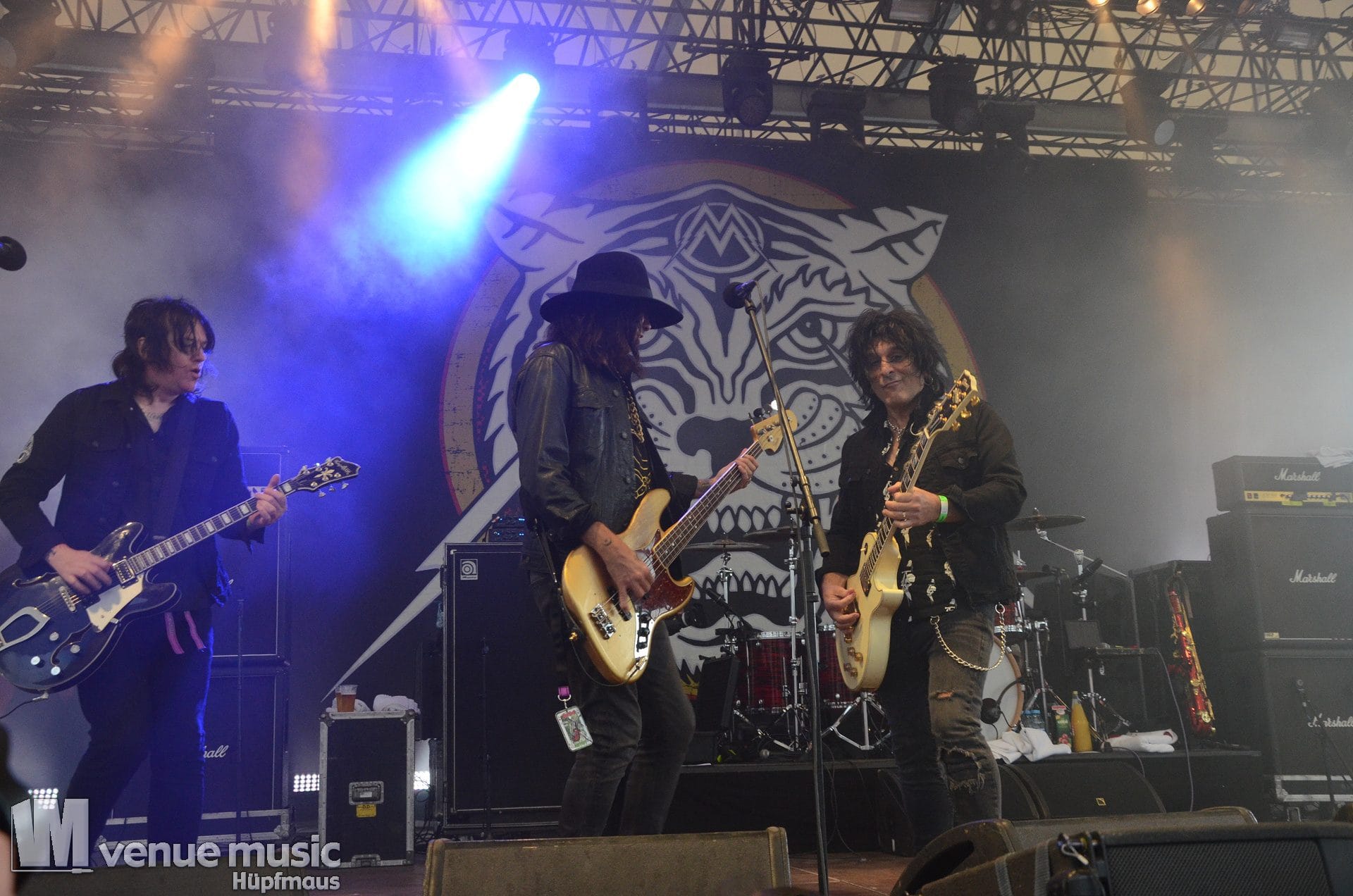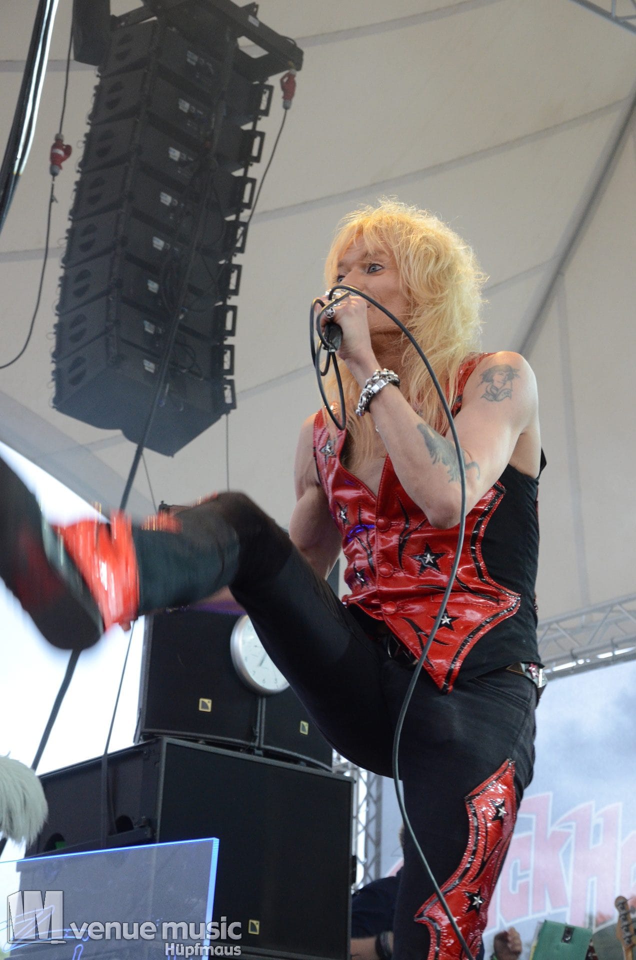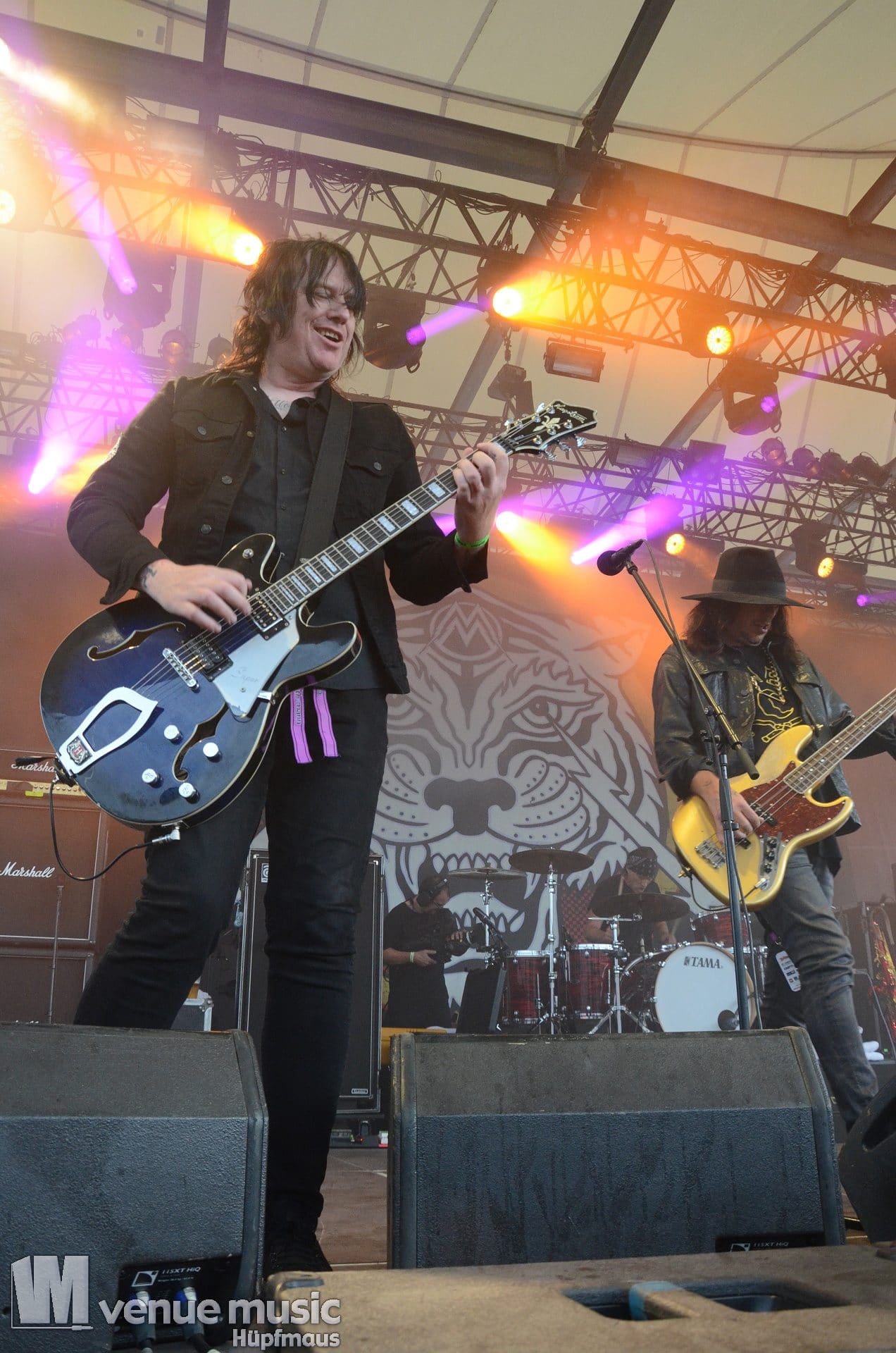 Danach war so richtig Stimmung auf der Bühne mit Michael Monroe, der wirklich quasi nie still stand. Und wenn doch, dann gab es aber eine Grimasse nach der anderen. Glam Rock´n´Roll. Vielleicht nicht jedermanns Sache, aber unterhaltsam allemal. Und nicht nur er, sondern auch der Rest der Band gaben alles, so dass es ein absolut unterhaltsames Set war. Auch wenn man – wie ich – vorher nicht einen Song kannte. Dass es da noch teils regnete, war da ziemlich egal, das trübte die Stimmung nicht.