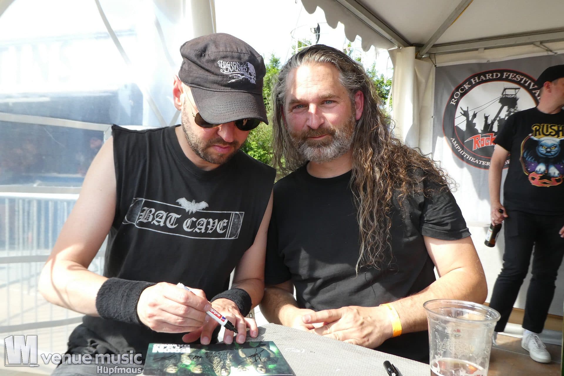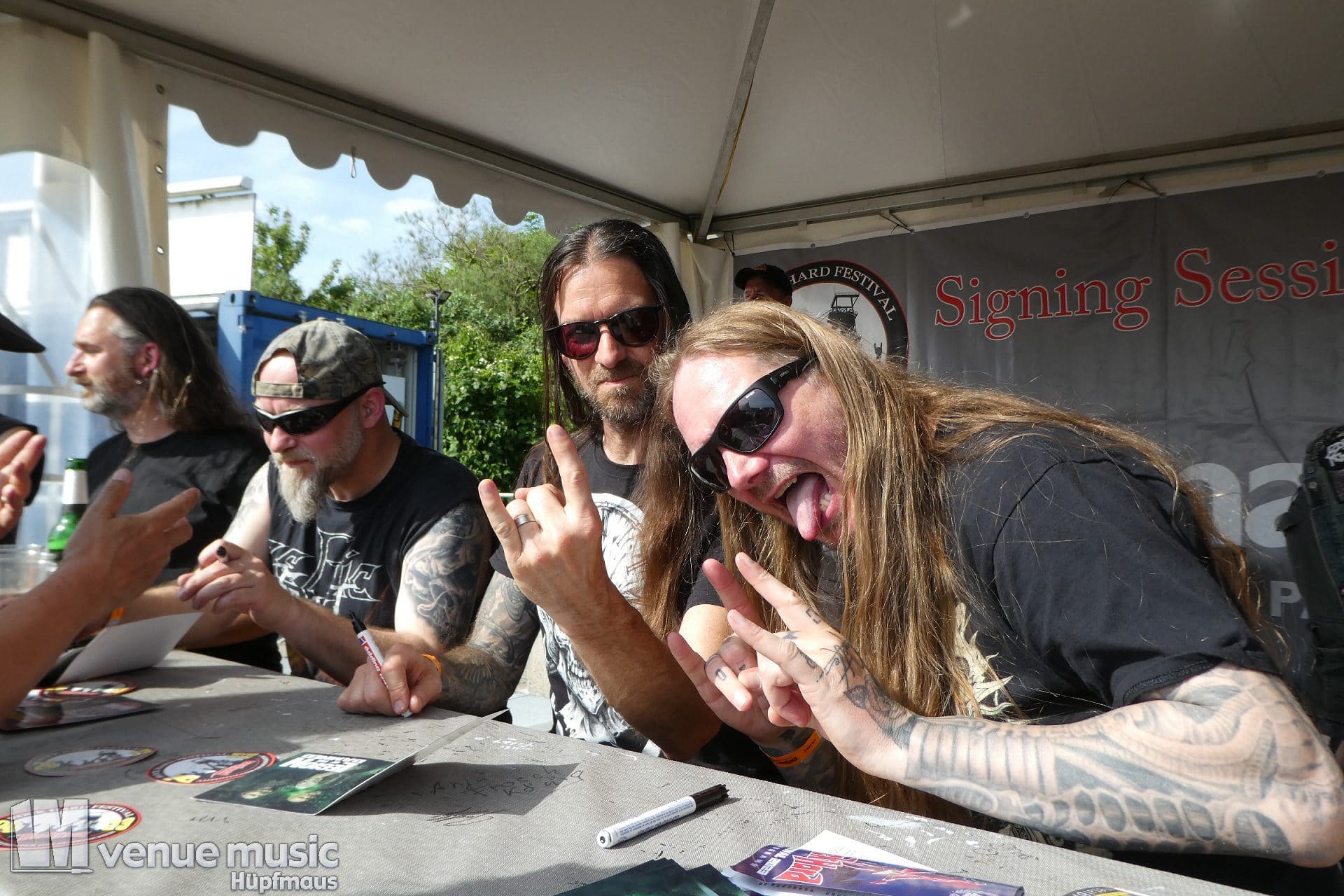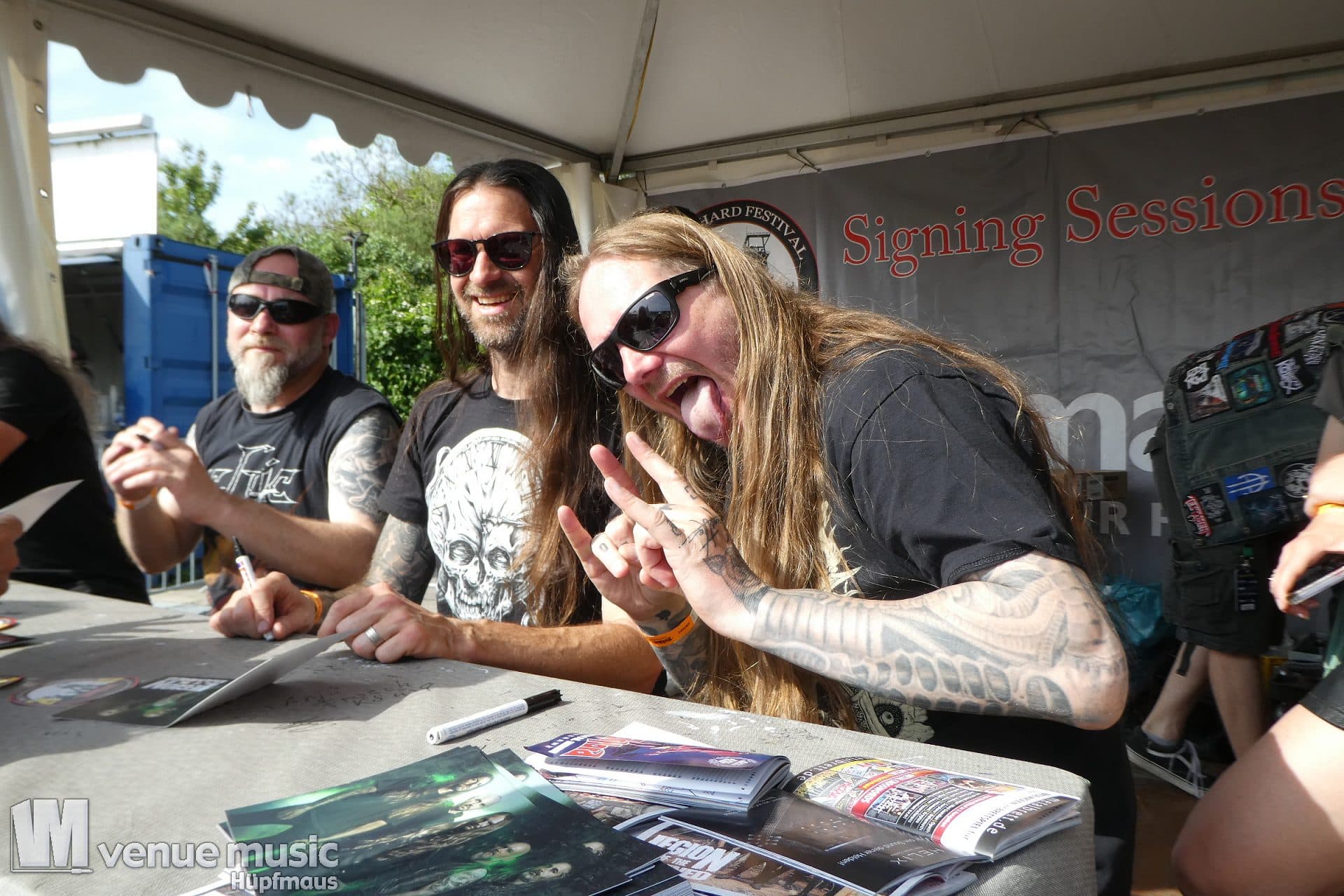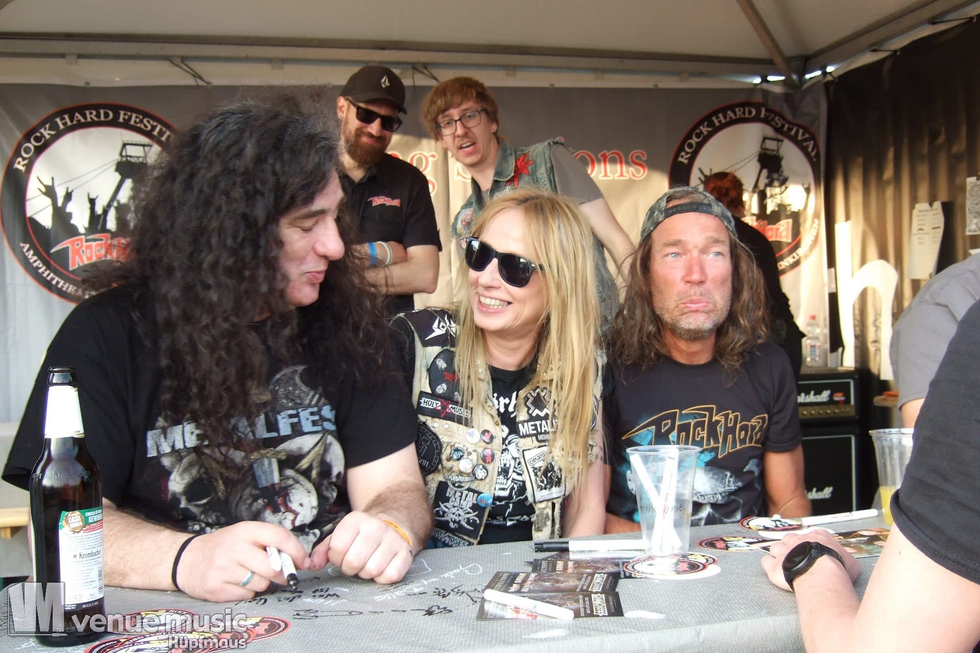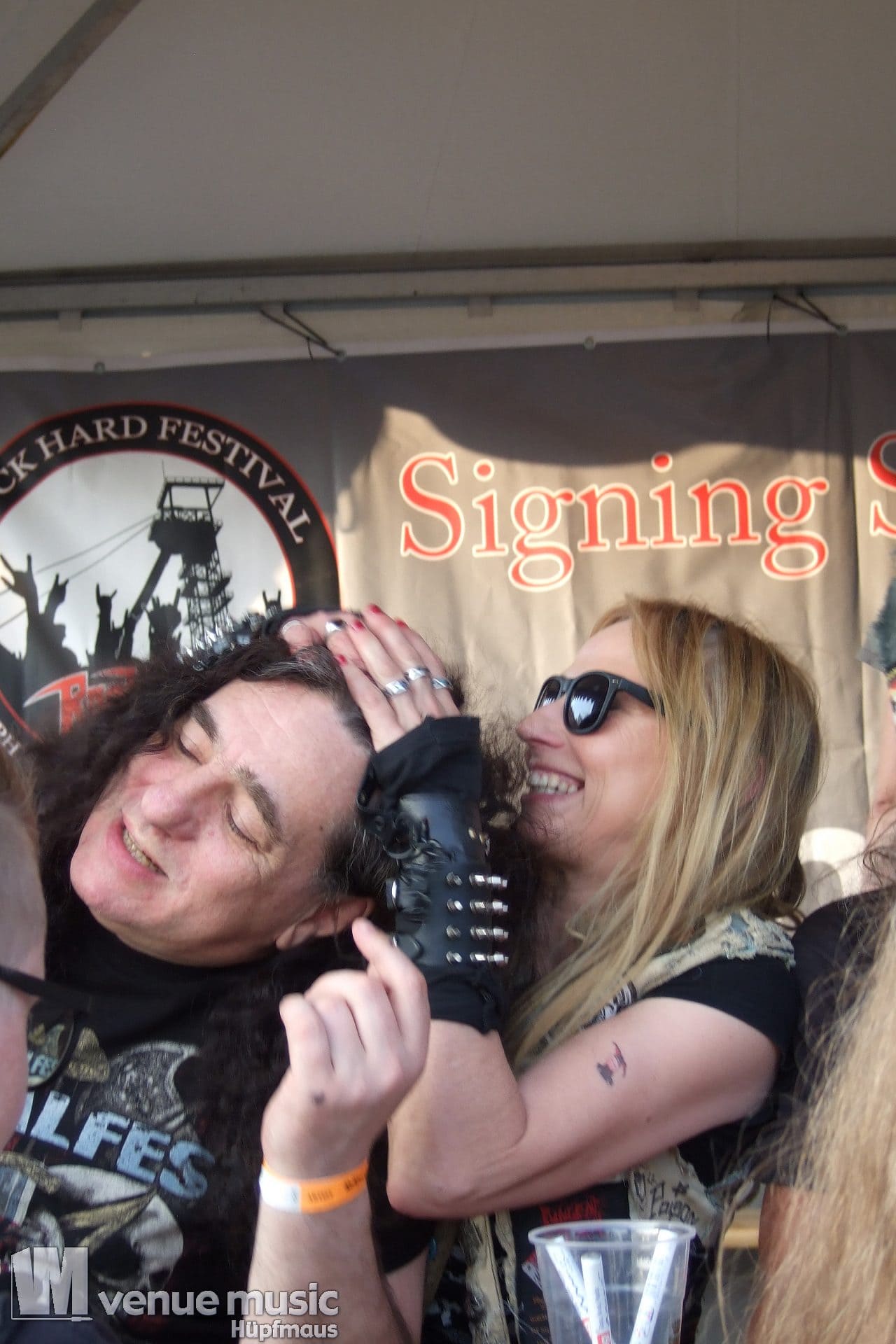 Am letzten Tag des Rock Hard Festivals signierten Iron Fate, Undertow, Legion of the Damned, Enforcer und Tankard (mit Gast Sabina Classen) wieder fleissig und machten Fotos mit ihren Fans. Zwar gab es an keinem der drei Tage Autogramme vom Headliner, aber die meisten Bands hatten dafür Zeit einplanen können.