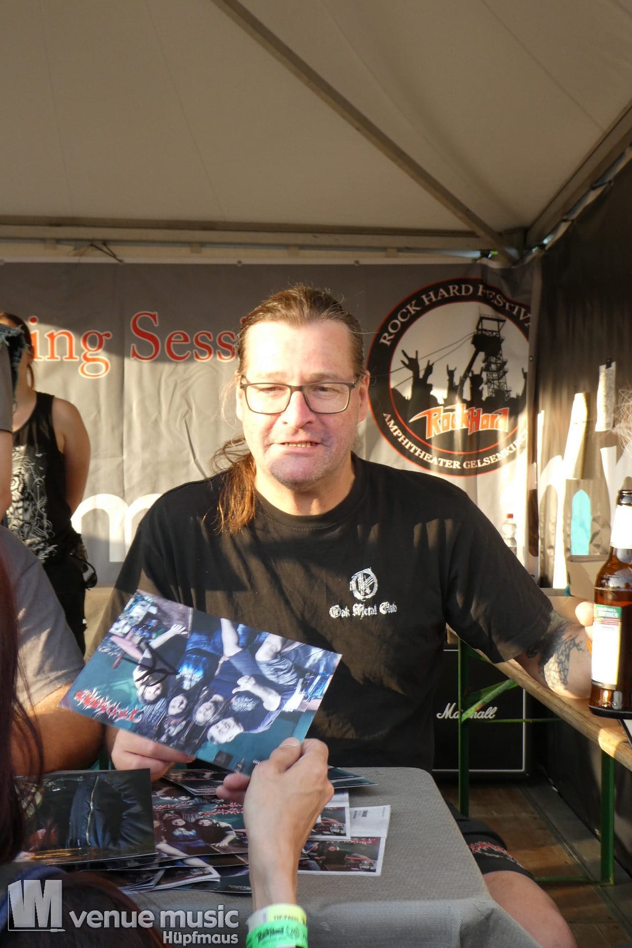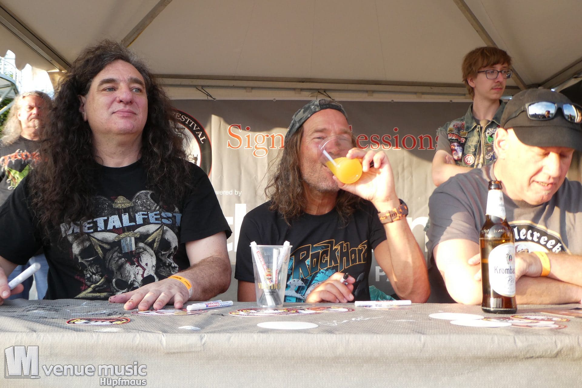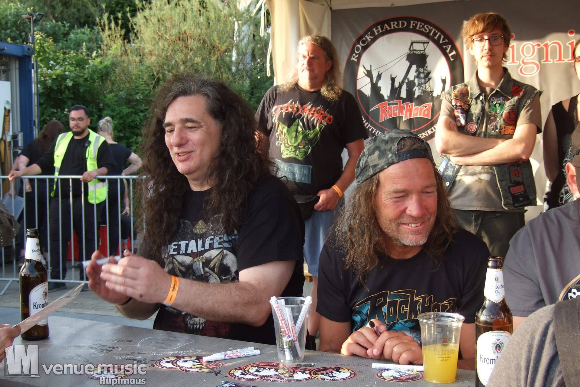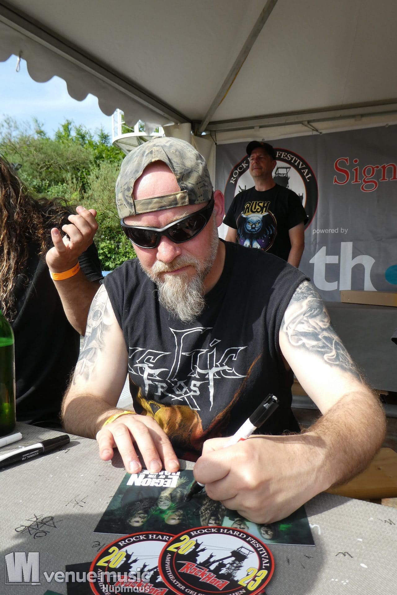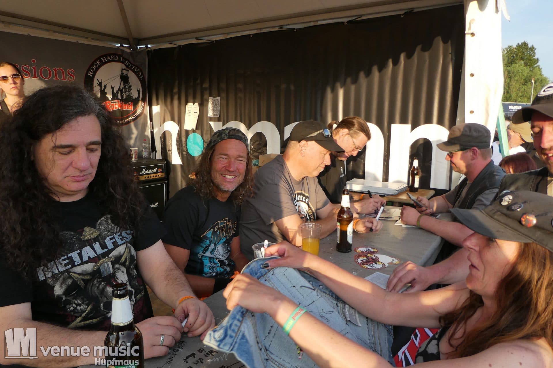 Am letzten Tag des Rock Hard Festivals signierten Iron Fate, Undertow, Legion of the Damned, Enforcer und Tankard (mit Gast Sabina Classen) wieder fleissig und machten Fotos mit ihren Fans. Zwar gab es an keinem der drei Tage Autogramme vom Headliner, aber die meisten Bands hatten dafür Zeit einplanen können.