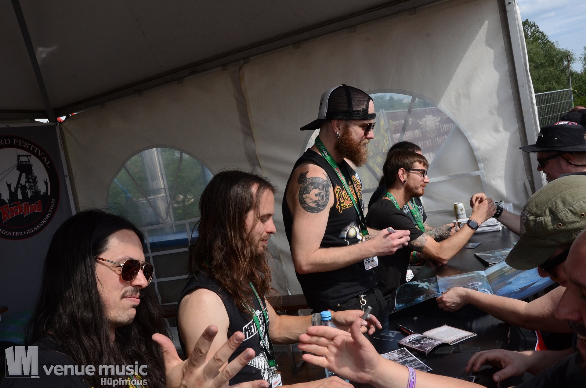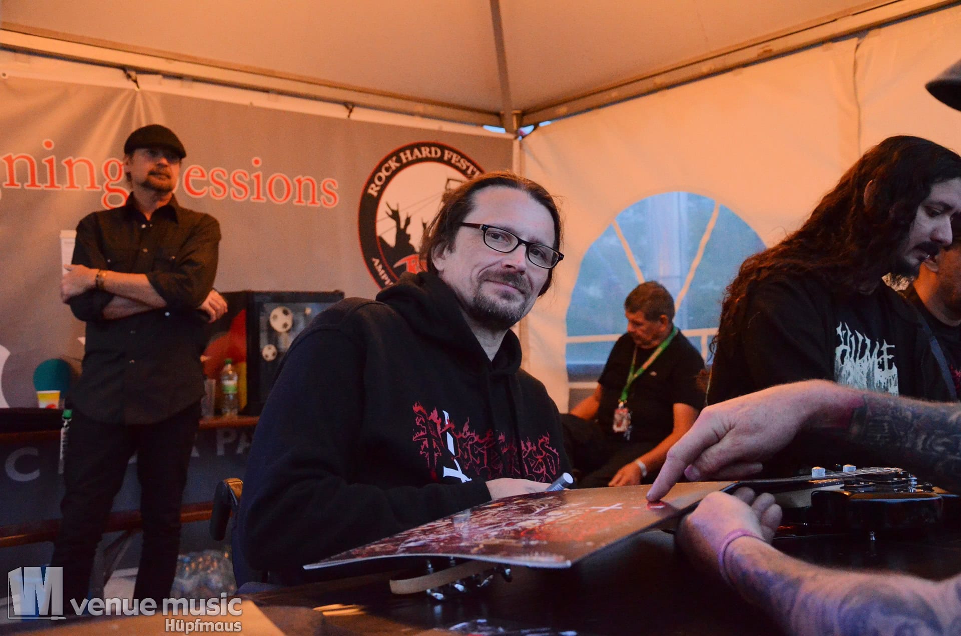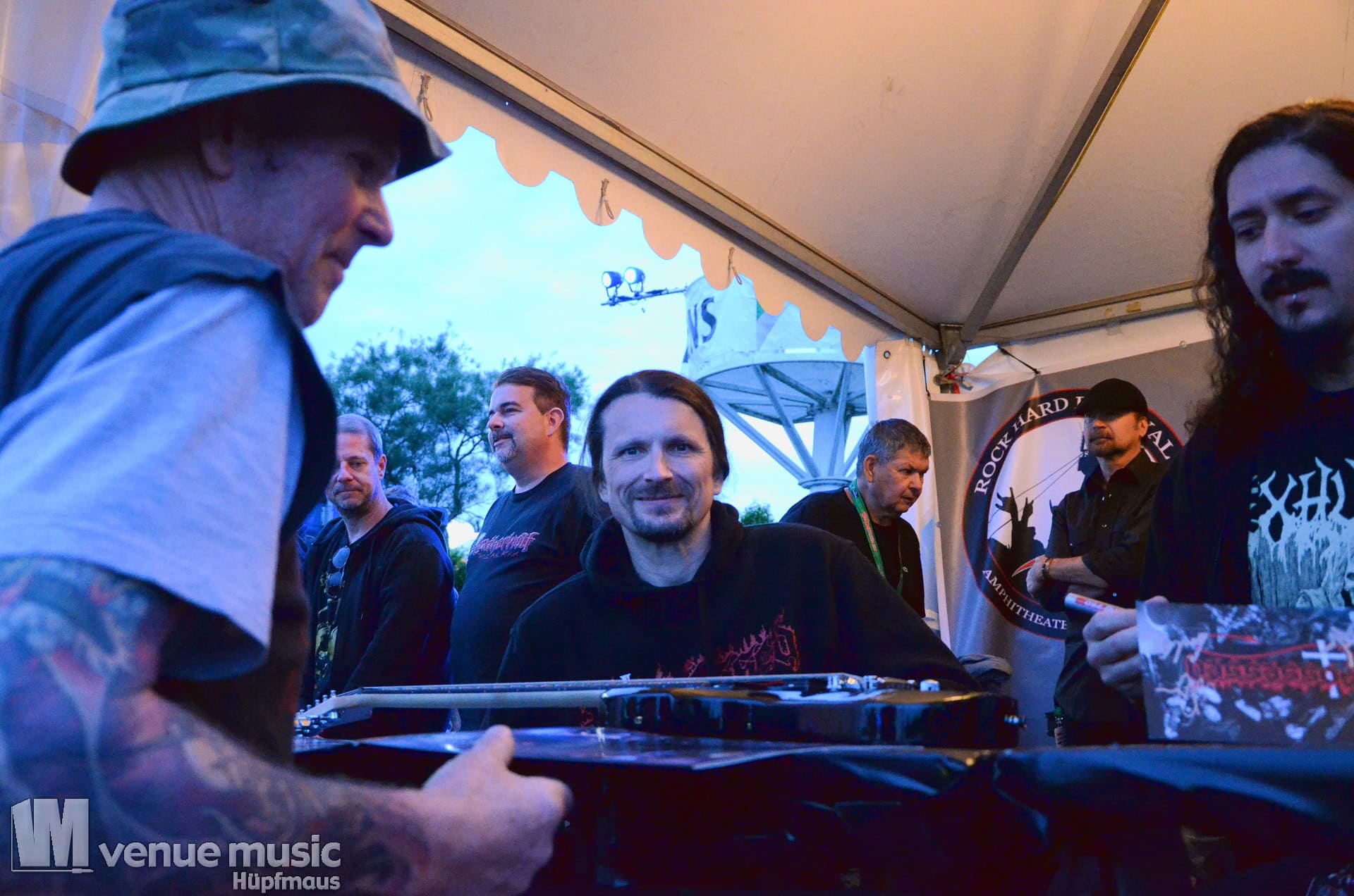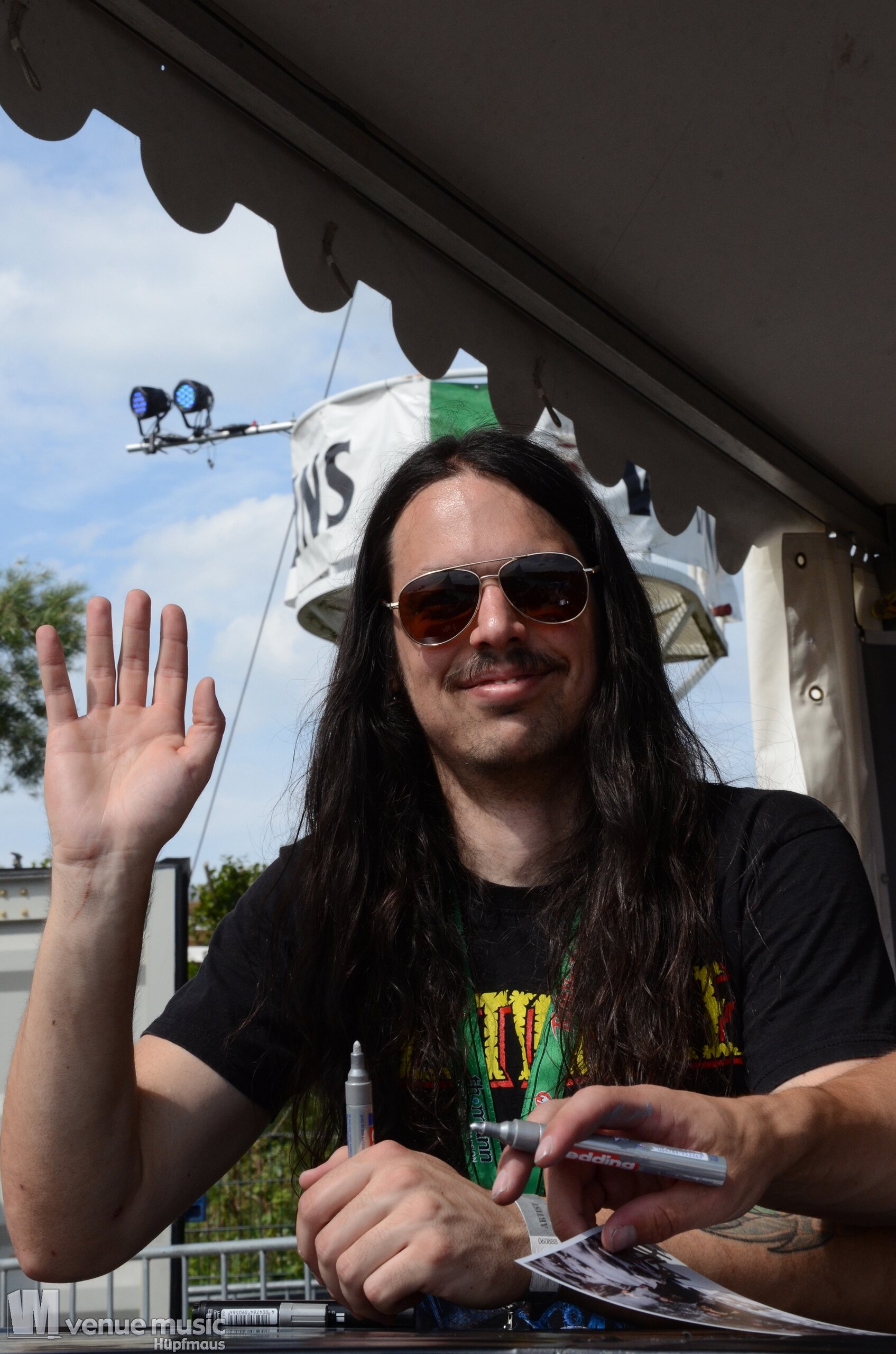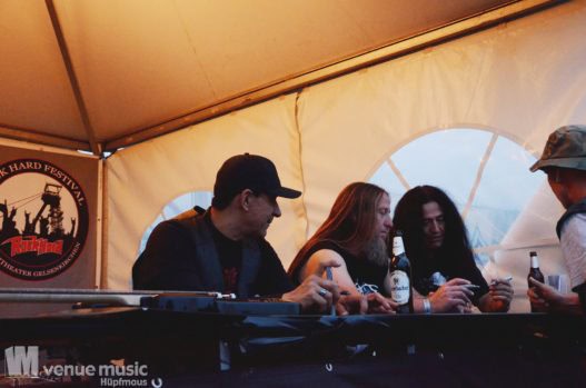 Auch am letzten Tag des Rock Hard Festivals wurde von den Bands fleissig für ihre Fans signiert, jede Menge Fotos geschossen und geklönt. Sechs gut gelaunte Bands waren für ihre Fans an diesem Tag dabei: Zodiac, Visigoth – welche so ziemlich die längste Autogrammstundenschlange hatten, Long Distance Calling, Fifth Angel, Magnum und zu guter letzt Possessed. Allerdings hätte mindestens Sänger Jeff Becerra wohl lieber einen anderen Slot gehabt, denn sie mussten parallel zum Auftritt von Anthrax signieren, dabei hätte den gerne selber gesehen. Aber das hielt ihn nicht davon ab, sich mit den Fans zu unterhalten und jeden Autogrammwunsch zu erfüllen.
