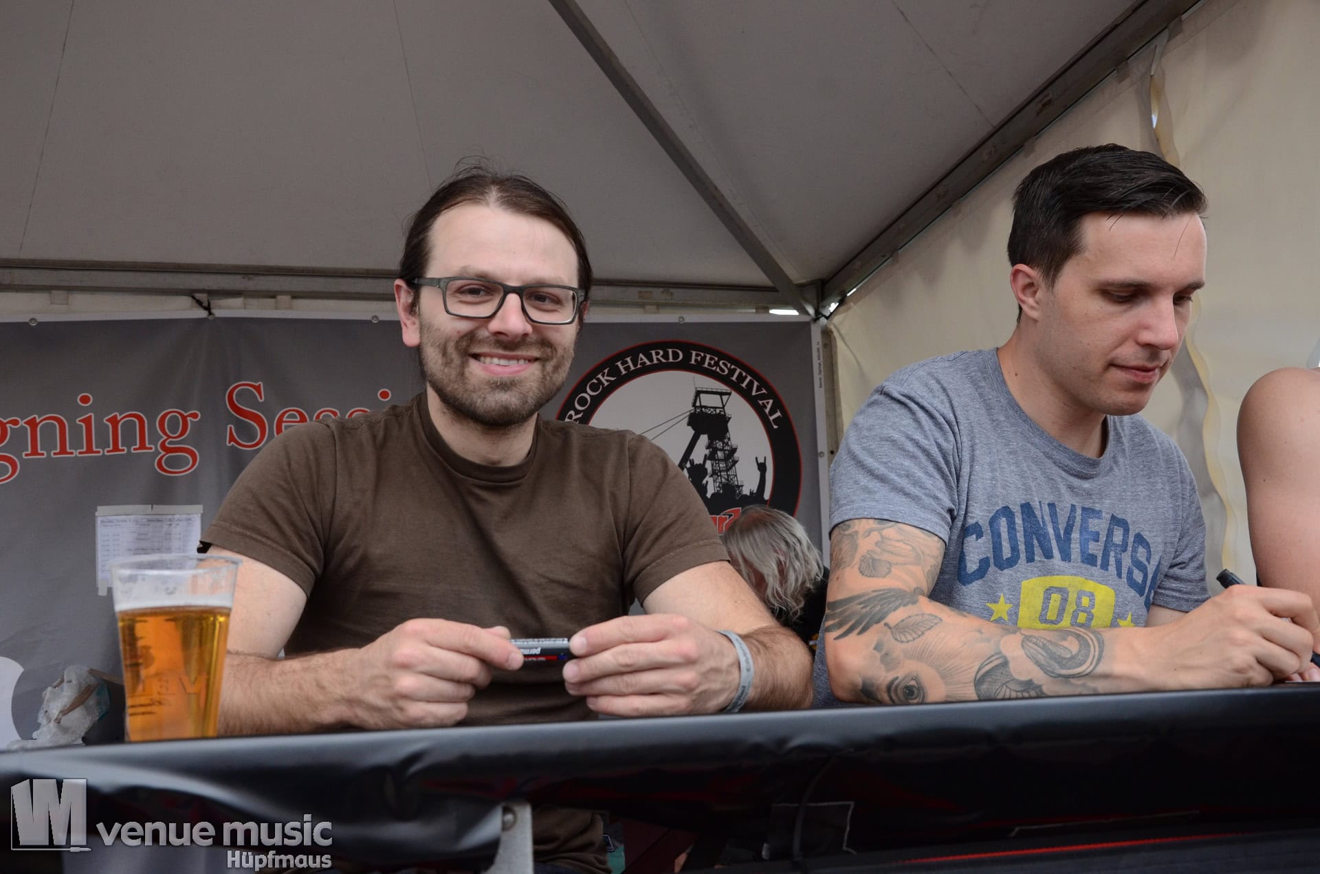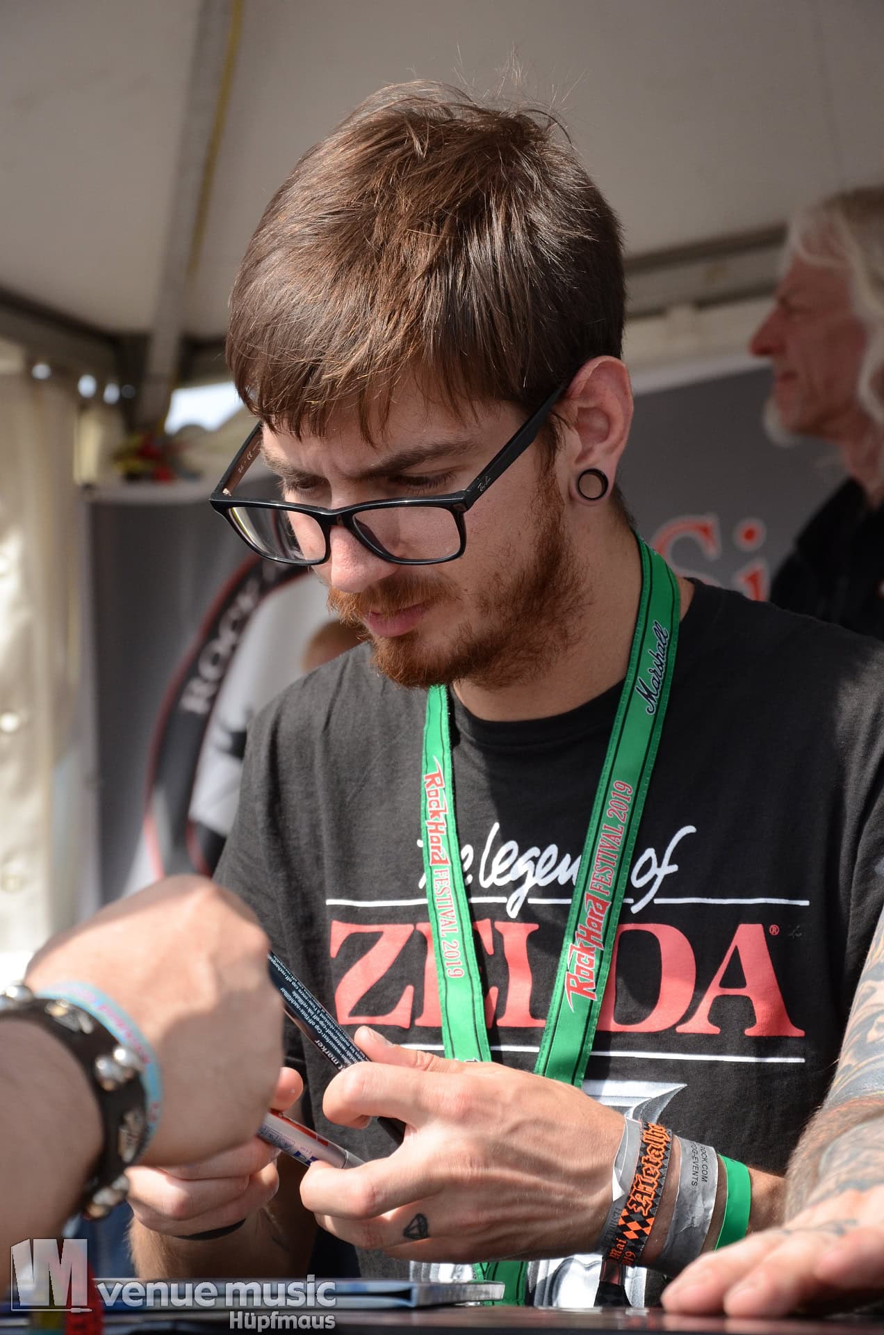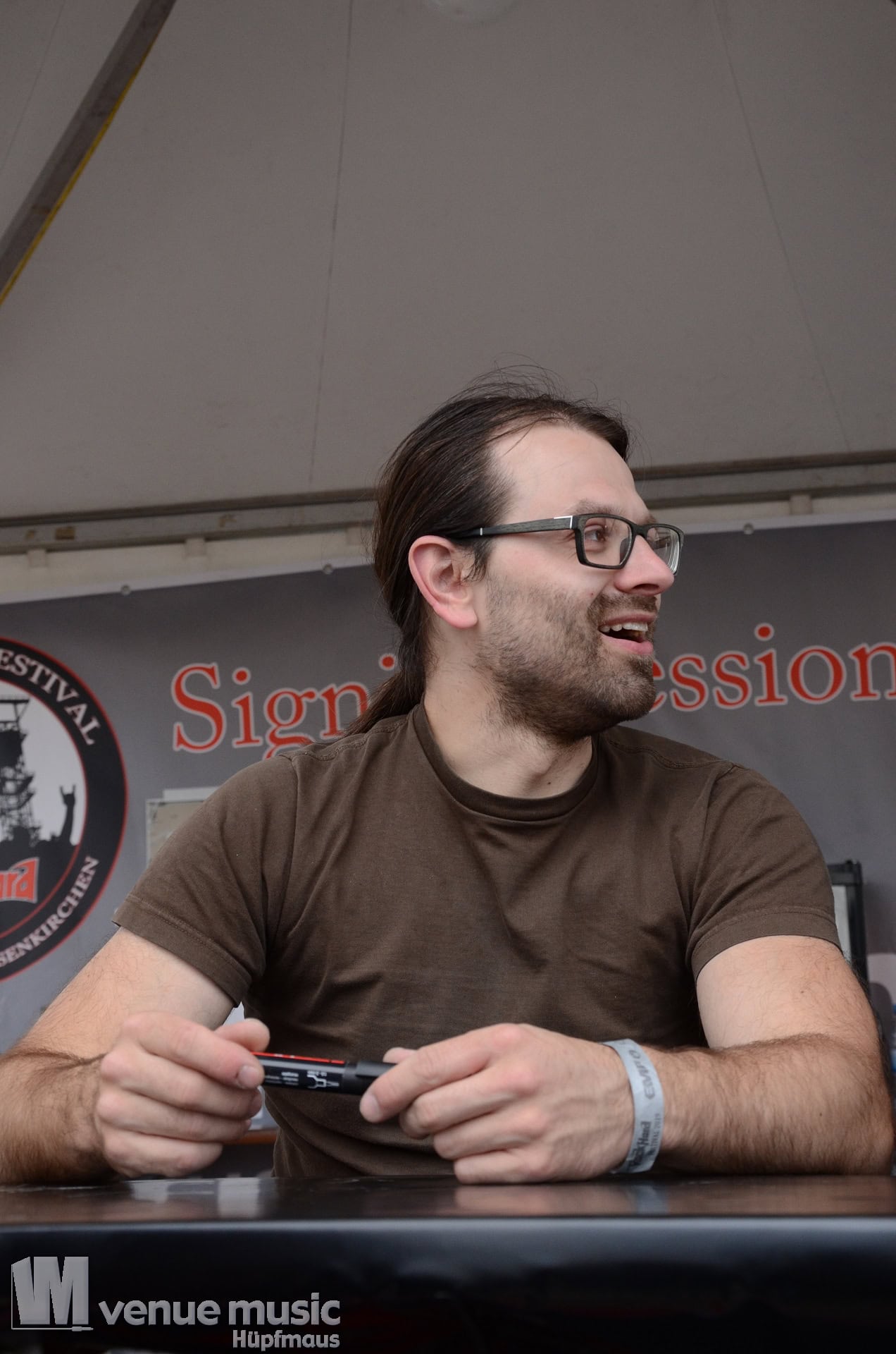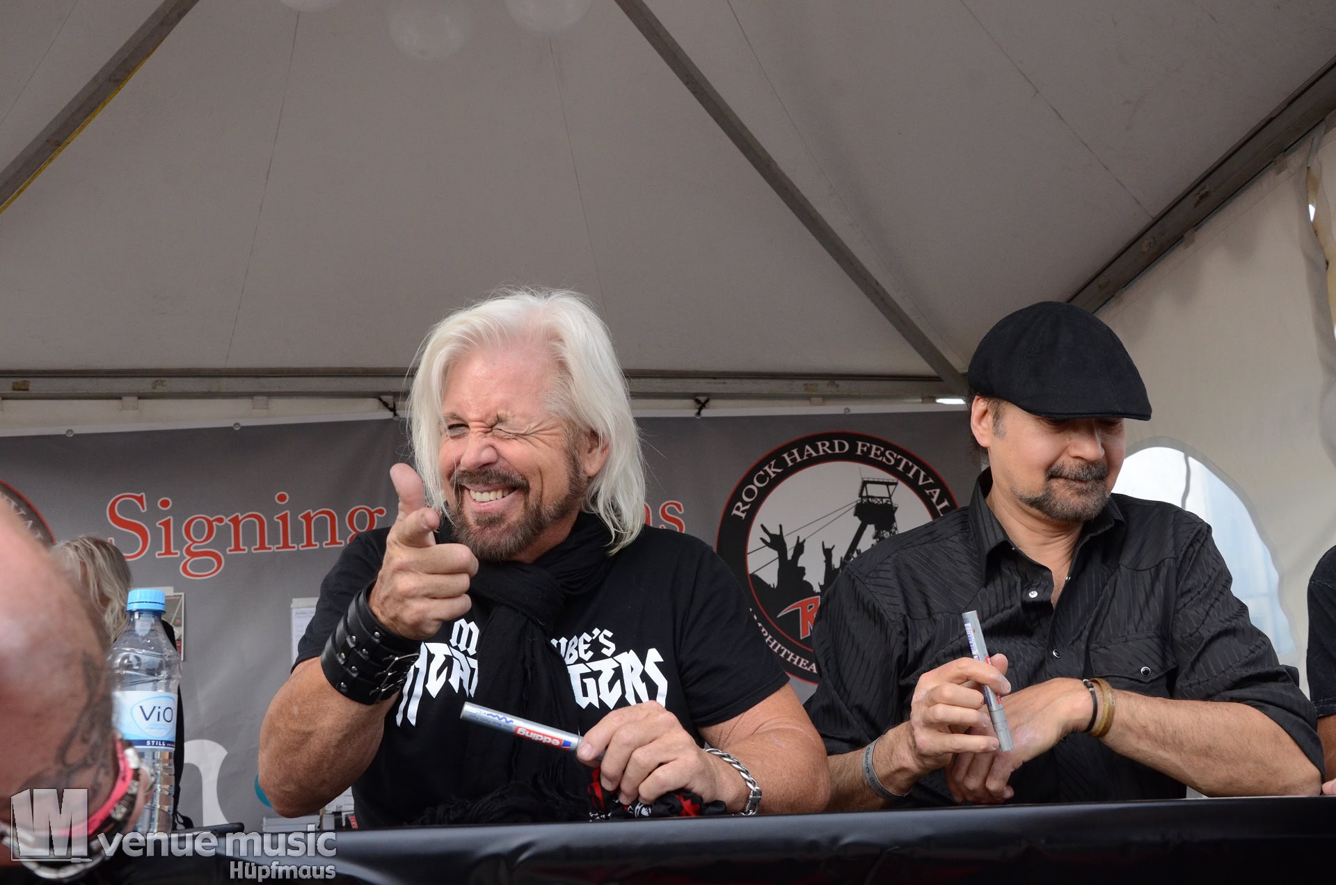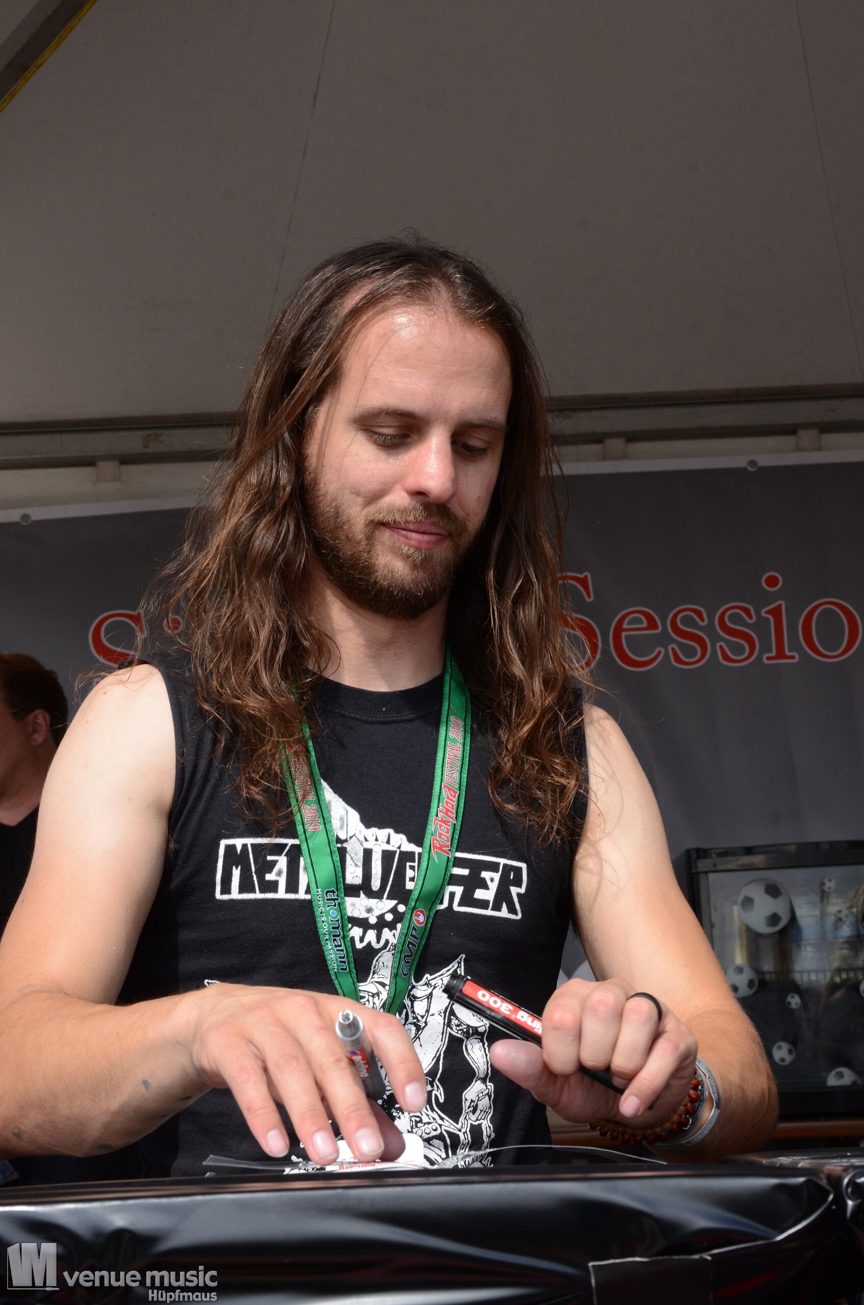 Auch am letzten Tag des Rock Hard Festivals wurde von den Bands fleissig für ihre Fans signiert, jede Menge Fotos geschossen und geklönt. Sechs gut gelaunte Bands waren für ihre Fans an diesem Tag dabei: Zodiac, Visigoth – welche so ziemlich die längste Autogrammstundenschlange hatten, Long Distance Calling, Fifth Angel, Magnum und zu guter letzt Possessed. Allerdings hätte mindestens Sänger Jeff Becerra wohl lieber einen anderen Slot gehabt, denn sie mussten parallel zum Auftritt von Anthrax signieren, dabei hätte den gerne selber gesehen. Aber das hielt ihn nicht davon ab, sich mit den Fans zu unterhalten und jeden Autogrammwunsch zu erfüllen.