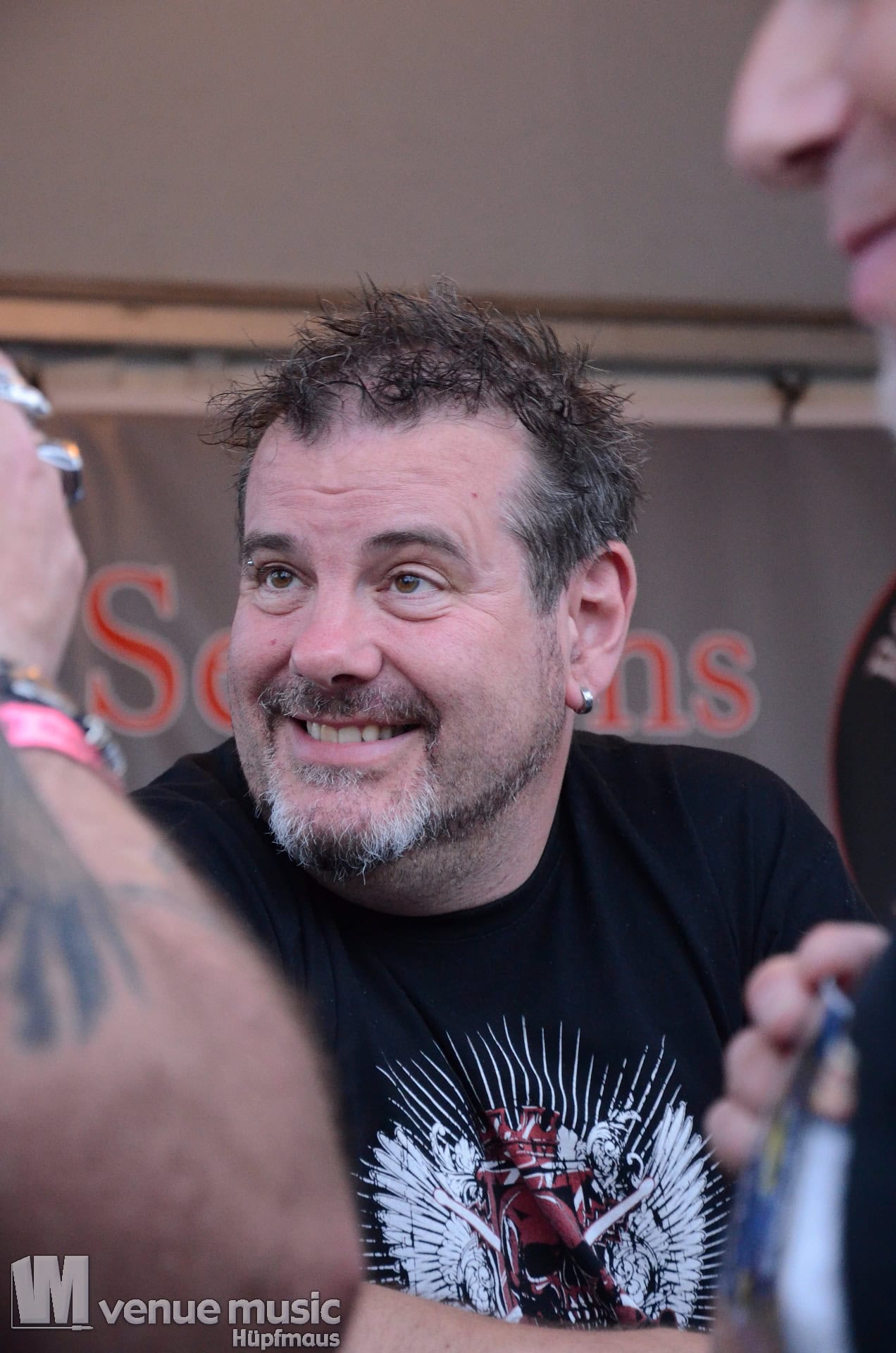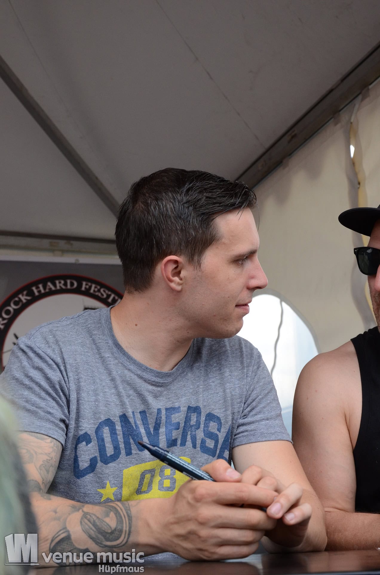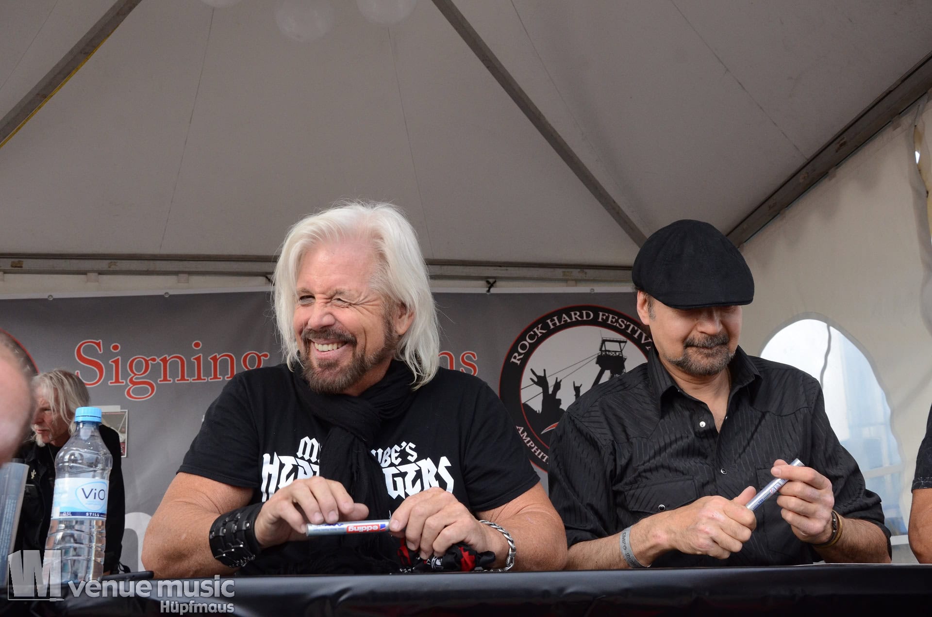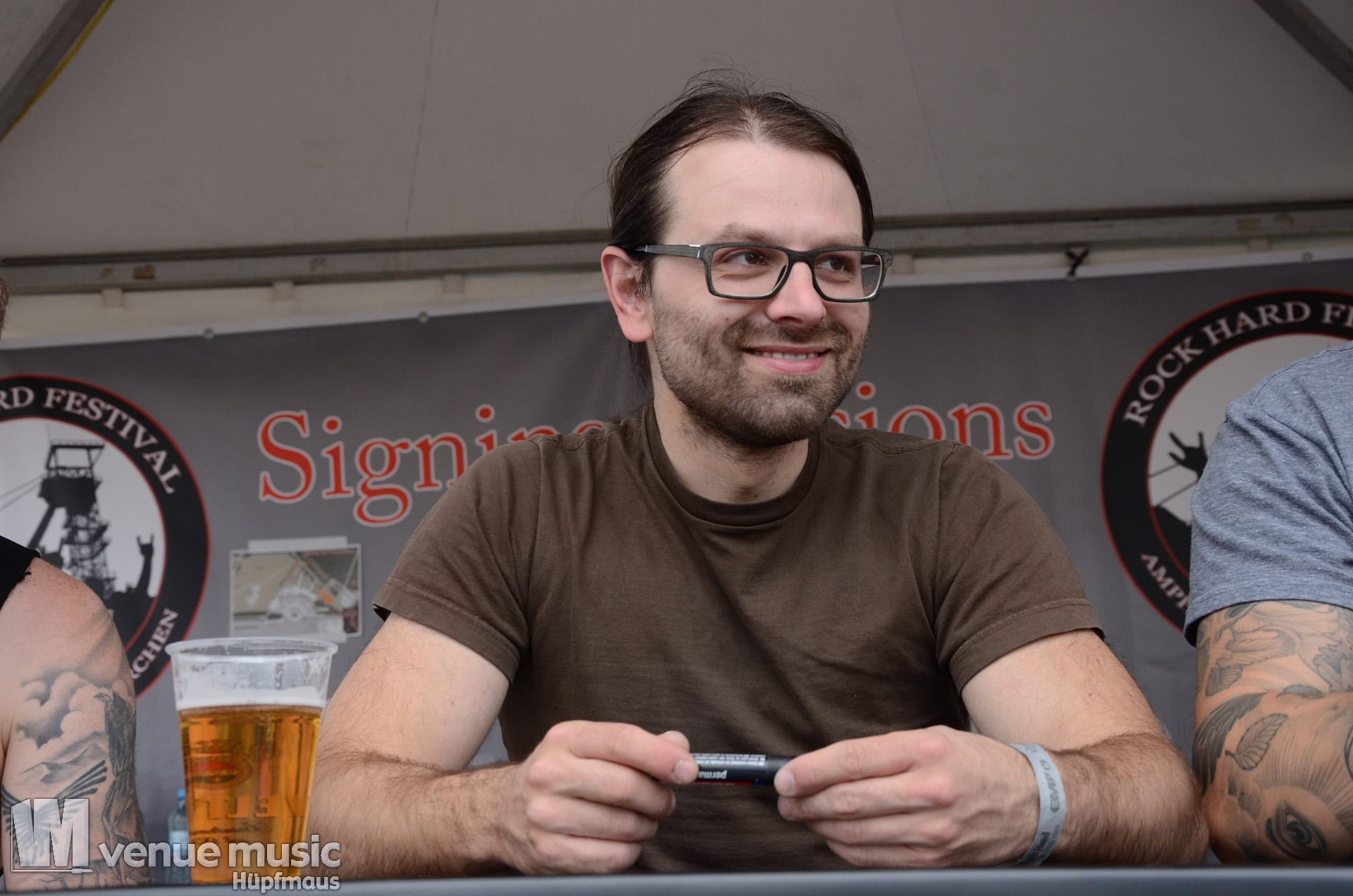 Auch am letzten Tag des Rock Hard Festivals wurde von den Bands fleissig für ihre Fans signiert, jede Menge Fotos geschossen und geklönt. Sechs gut gelaunte Bands waren für ihre Fans an diesem Tag dabei: Zodiac, Visigoth – welche so ziemlich die längste Autogrammstundenschlange hatten, Long Distance Calling, Fifth Angel, Magnum und zu guter letzt Possessed. Allerdings hätte mindestens Sänger Jeff Becerra wohl lieber einen anderen Slot gehabt, denn sie mussten parallel zum Auftritt von Anthrax signieren, dabei hätte den gerne selber gesehen. Aber das hielt ihn nicht davon ab, sich mit den Fans zu unterhalten und jeden Autogrammwunsch zu erfüllen.