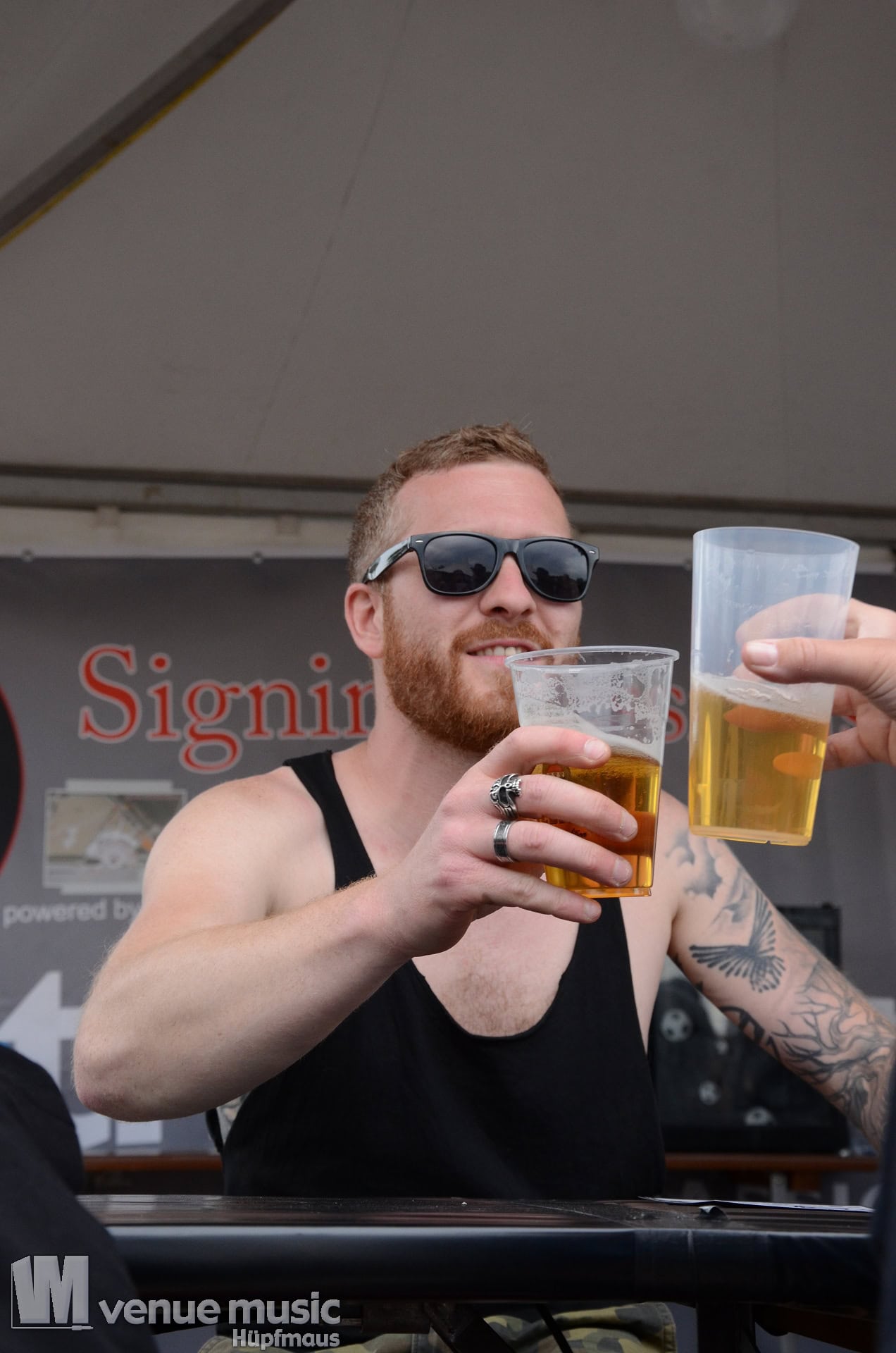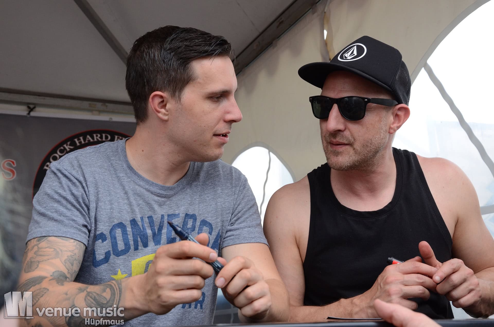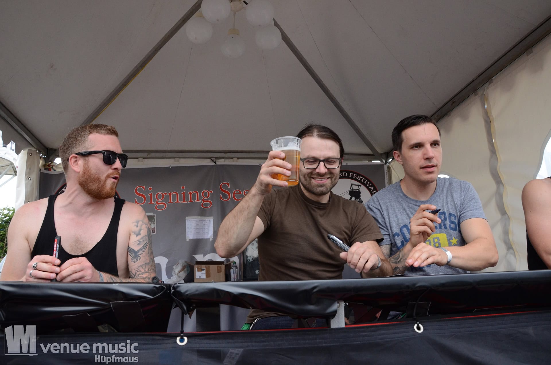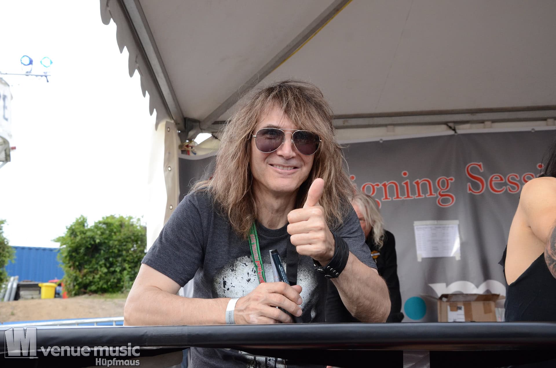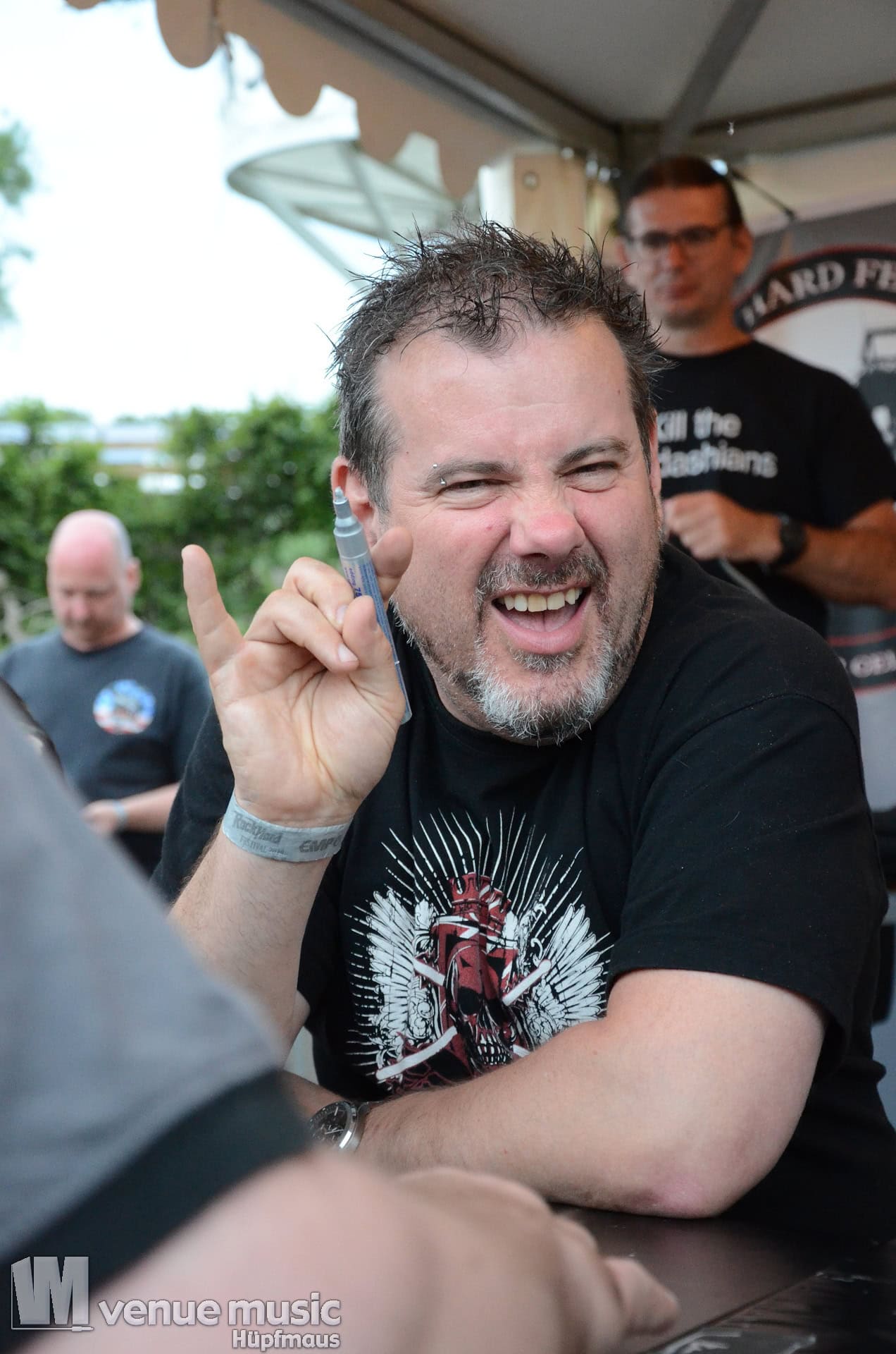 Auch am letzten Tag des Rock Hard Festivals wurde von den Bands fleissig für ihre Fans signiert, jede Menge Fotos geschossen und geklönt. Sechs gut gelaunte Bands waren für ihre Fans an diesem Tag dabei: Zodiac, Visigoth – welche so ziemlich die längste Autogrammstundenschlange hatten, Long Distance Calling, Fifth Angel, Magnum und zu guter letzt Possessed. Allerdings hätte mindestens Sänger Jeff Becerra wohl lieber einen anderen Slot gehabt, denn sie mussten parallel zum Auftritt von Anthrax signieren, dabei hätte den gerne selber gesehen. Aber das hielt ihn nicht davon ab, sich mit den Fans zu unterhalten und jeden Autogrammwunsch zu erfüllen.