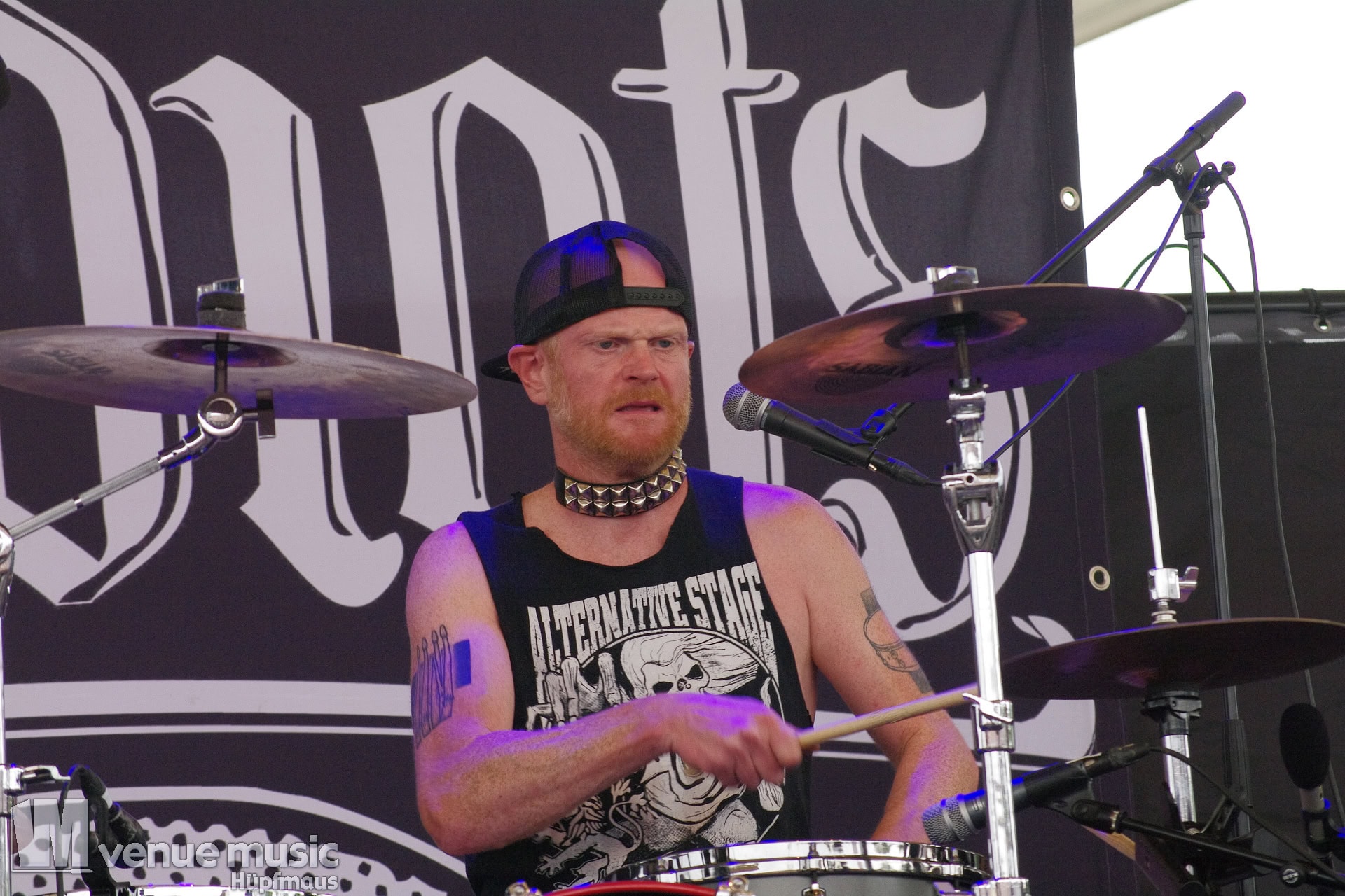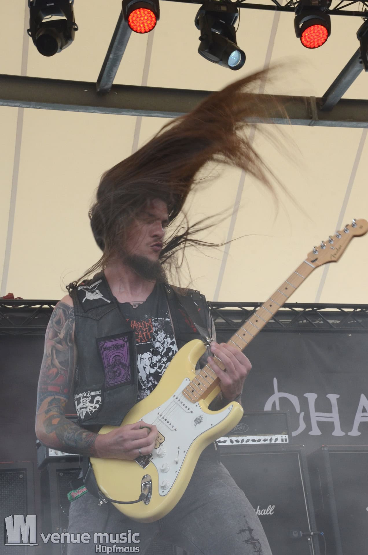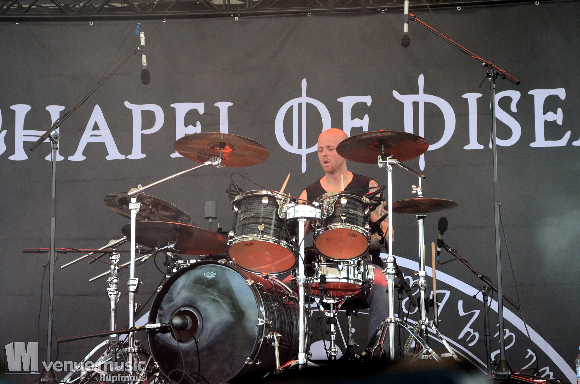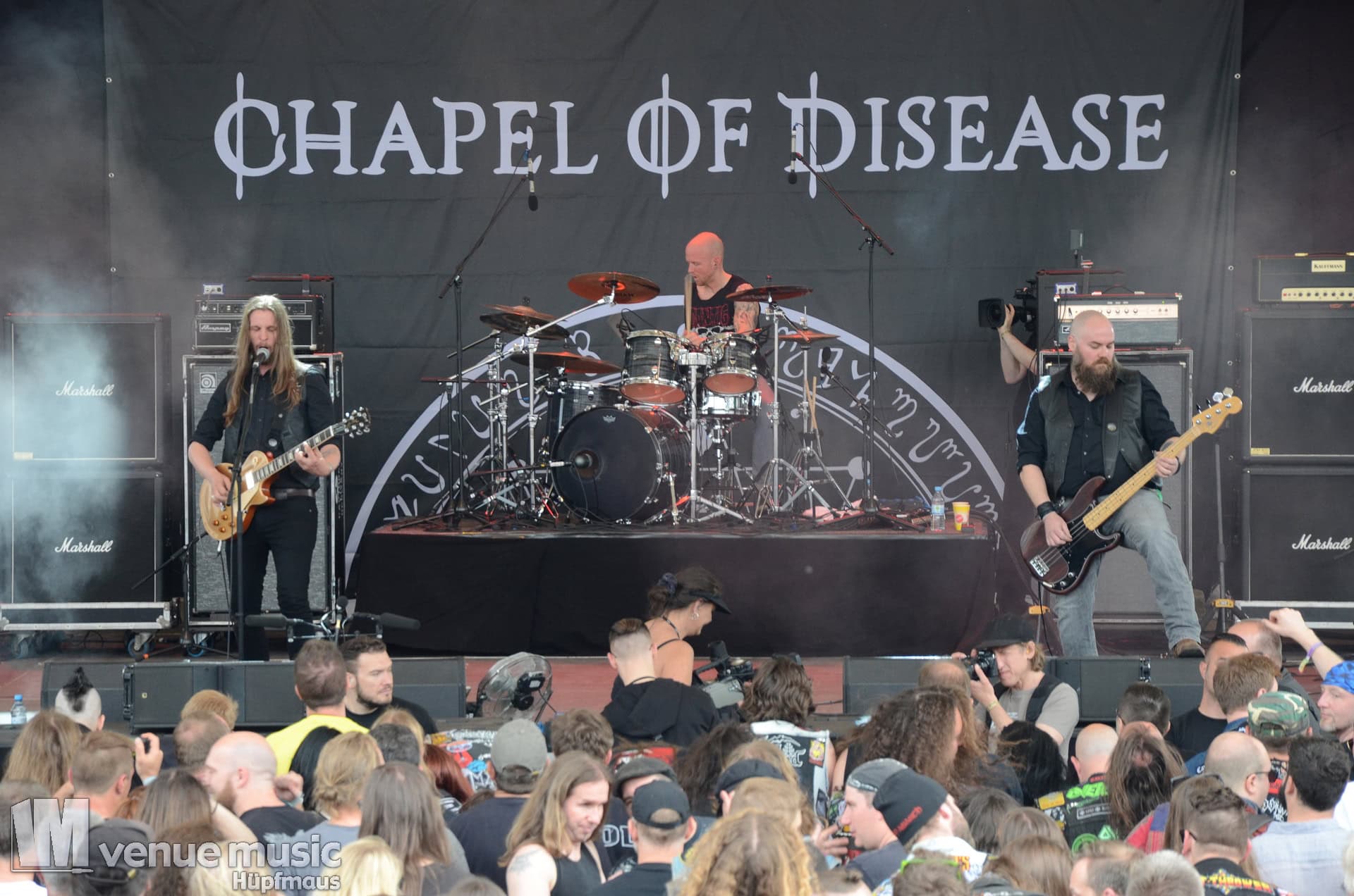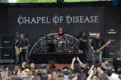 Aber nun weiter zum Festival: schnell das Band an der Ausgabe geholt, Fotopass: check. Die erste Band für mich sollten Chapel of Disease sein. Das letzte Album „…And as We Have Seen the Storm, We Have Embraced the Eye“ war noch nicht sehr alt und wurde von uns recht oft gehört. Daher hatte ich mich darauf sehr gefreut. Allerdings war ich irgendwie noch nicht richtig auf dem Festival angekommen. Zumindest konnten mich die Kölner irgendwie nicht so ganz mitreißen. Nur der letzte „Song of the Gods“, den ich direkt an seinem Intro erkannte, der kam dann richtig gut. Insgesamt waren es auch nur 5 Songs, denn die Titel von Chapel of Disease sind allesamt eher etwas länger.