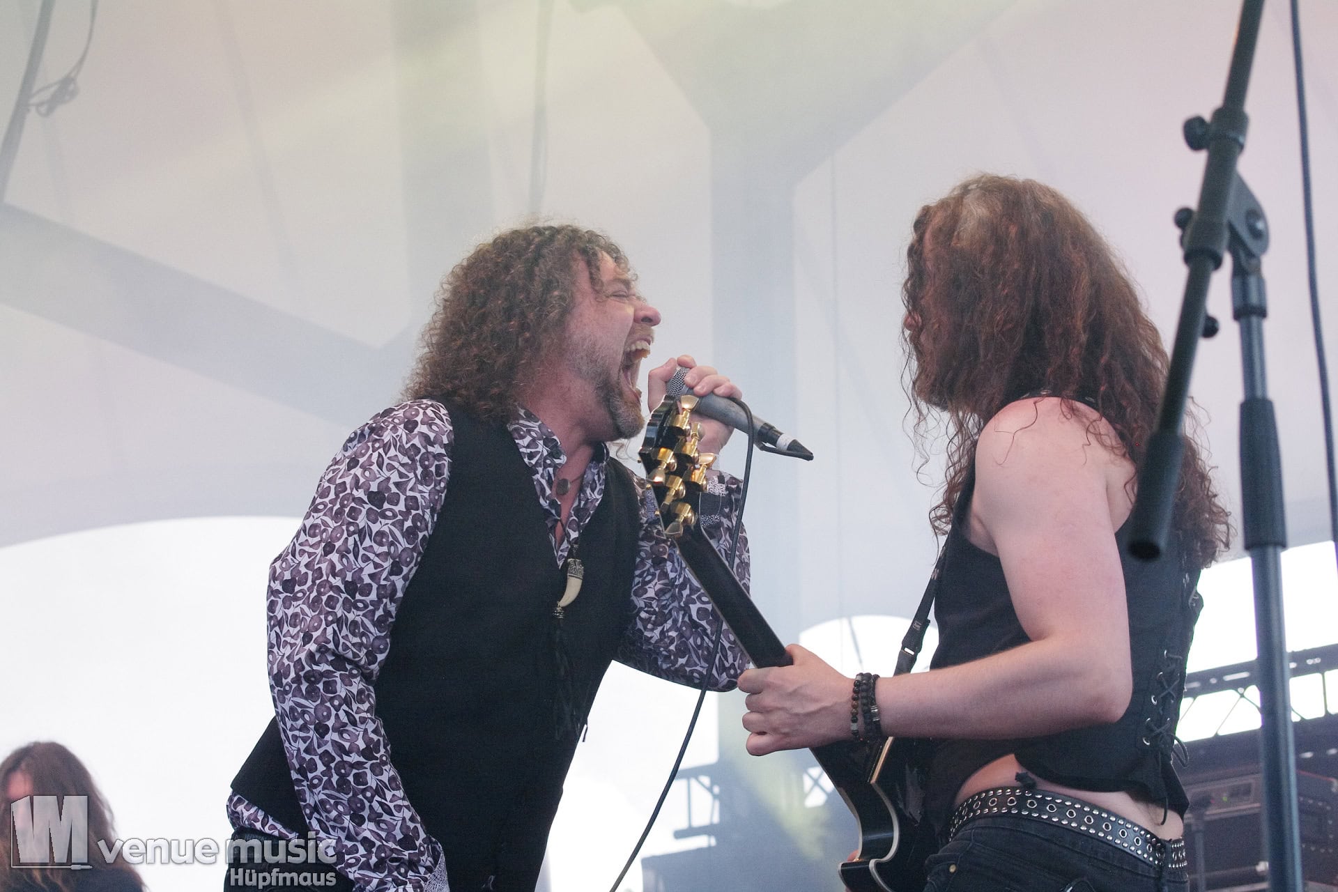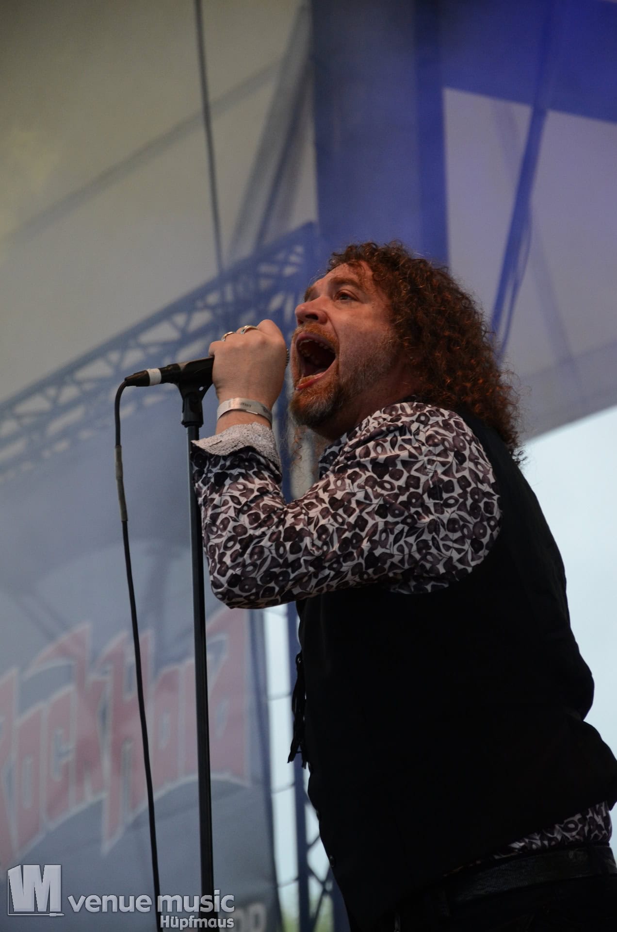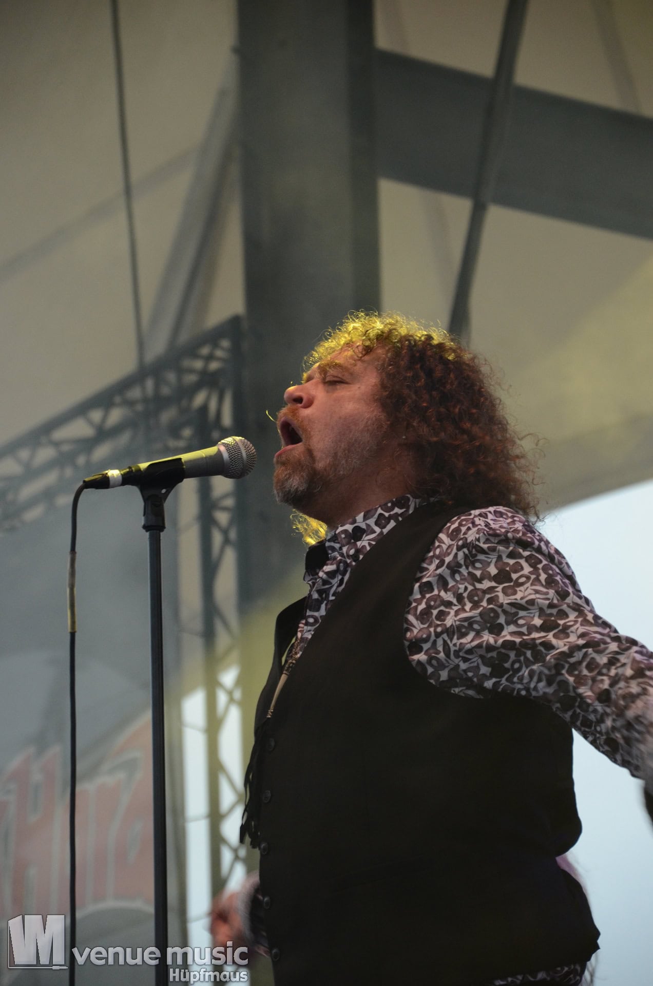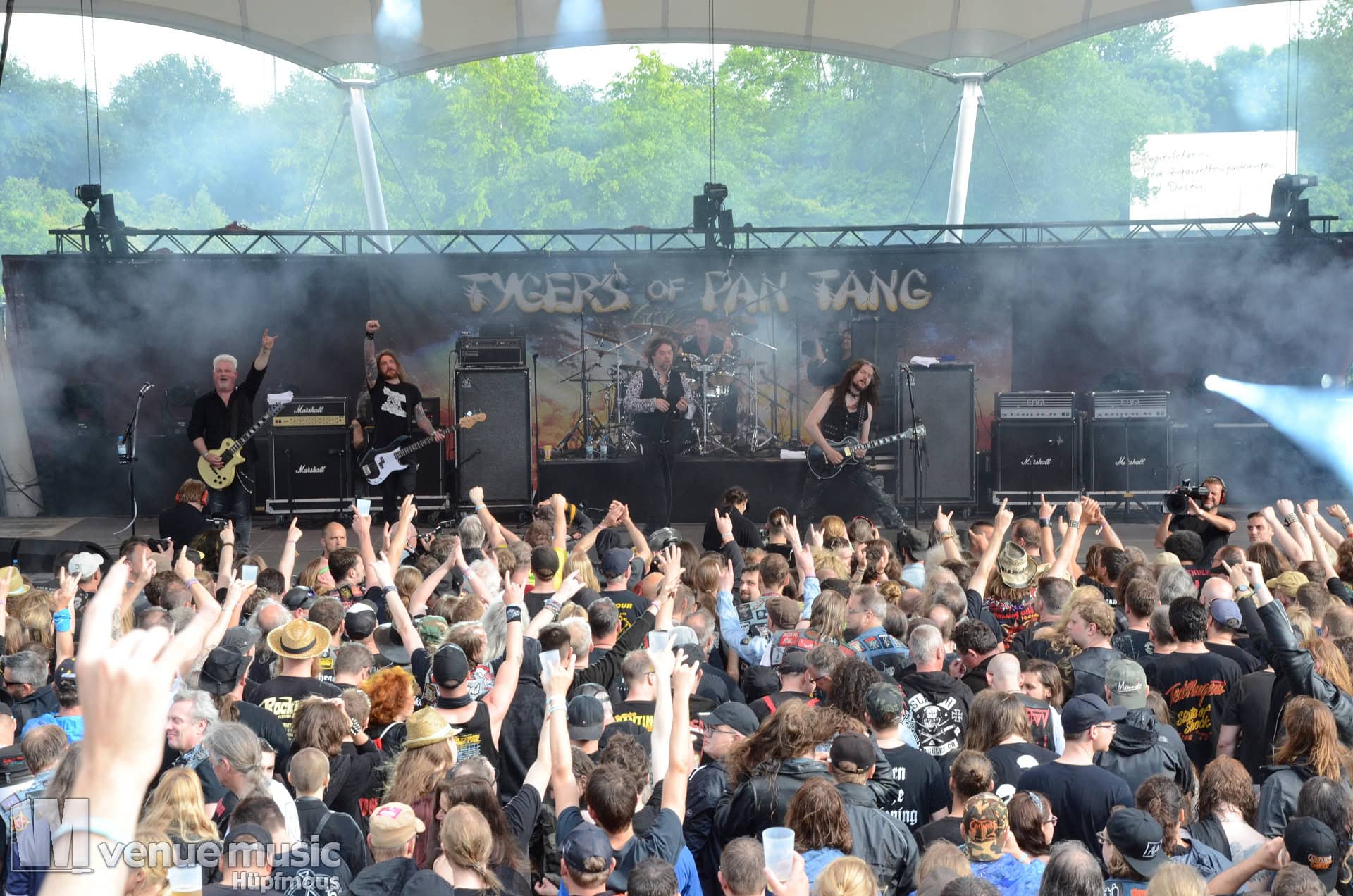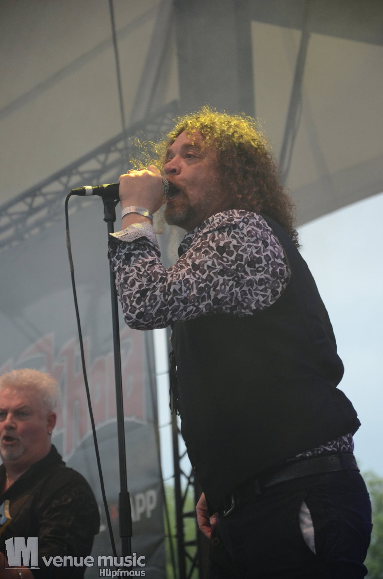 Pünktlich zum Beginn des Auftritts der „Tygers of Pan Tang“ fing es an zu schütten. Was für ein Glück, dass wir genau zu der Zeit im Fotograben waren. Auch die Briten sind bereits seit 1978 aktiv auf der Bühne und veröffenlichten in der Zeit 30 Alben, Live-Alben und Best-Of-CDs. Das nennt man produktiv. Mich überzeugt NWoBHM allerdings nicht ganz so, aber nun ja, man muss ja nicht alles total toll finden und der Rest vom Festivalgelände will ja auch erkundet und mit dem einen oder anderen Freund oder Bekannten ein Schwätzchen gehalten werden. Denn auch dafür steht das Rock Hard Festival: viele nette Leute treffen!