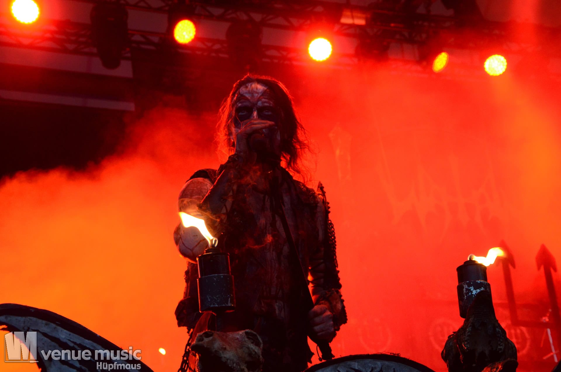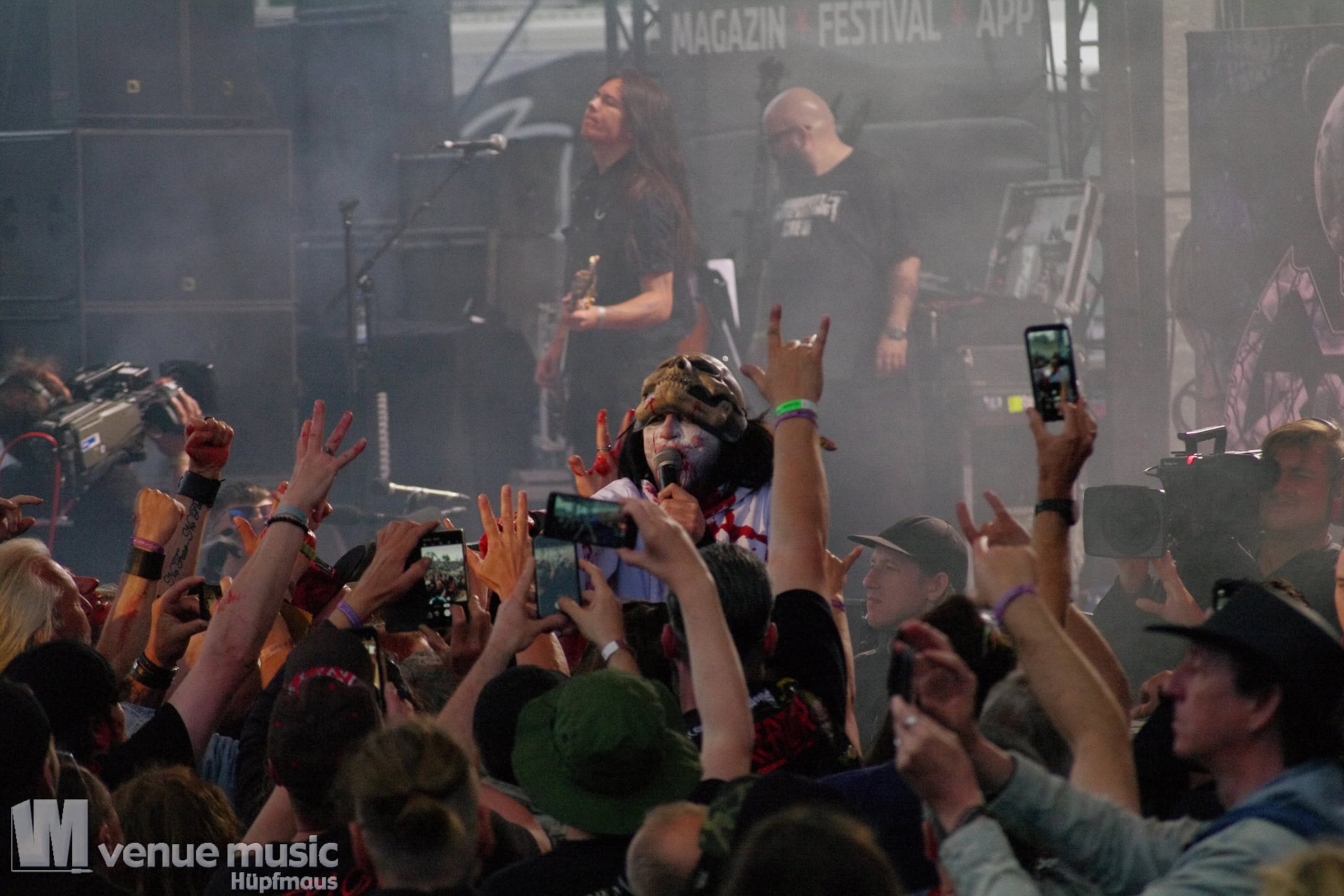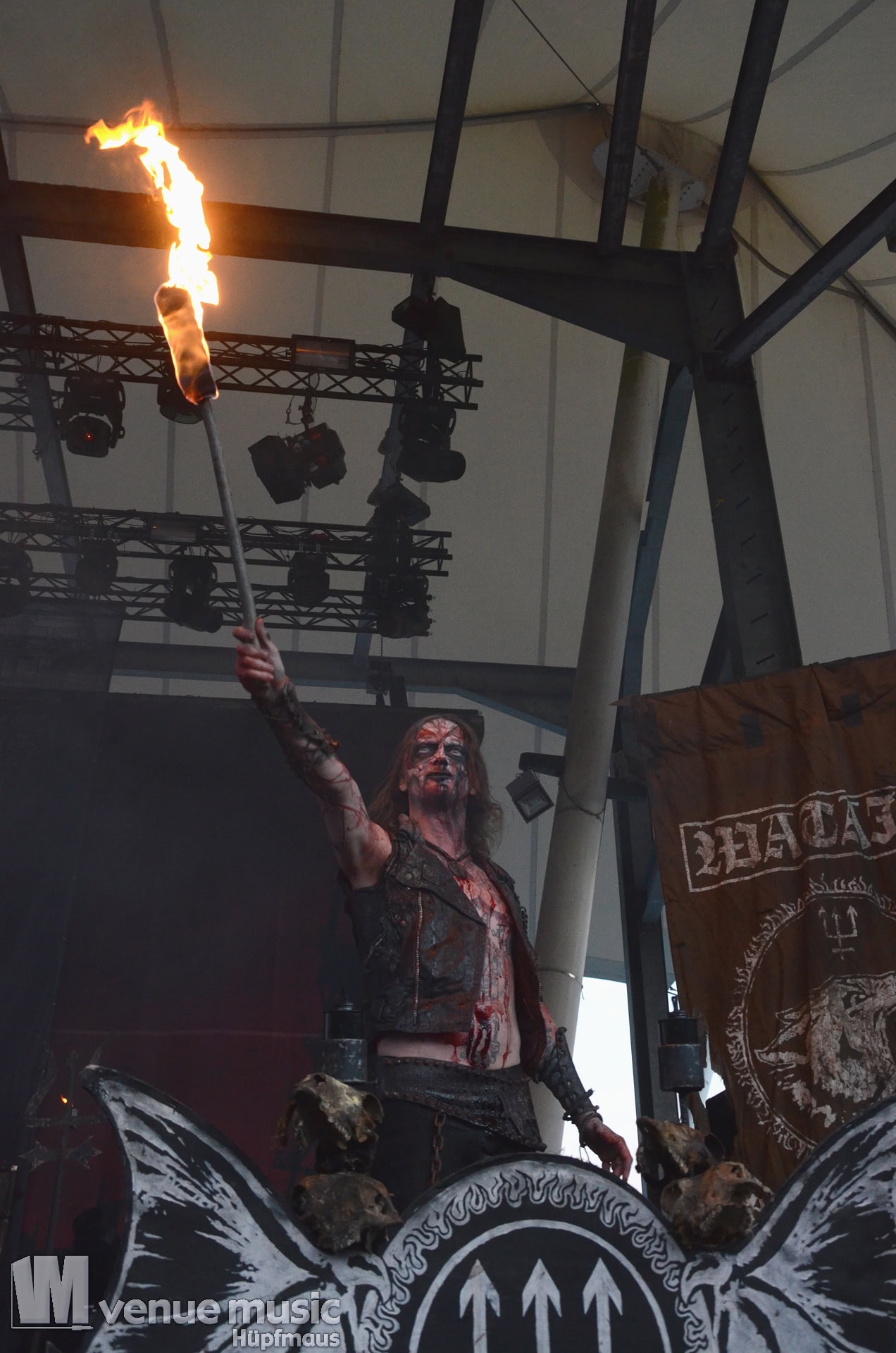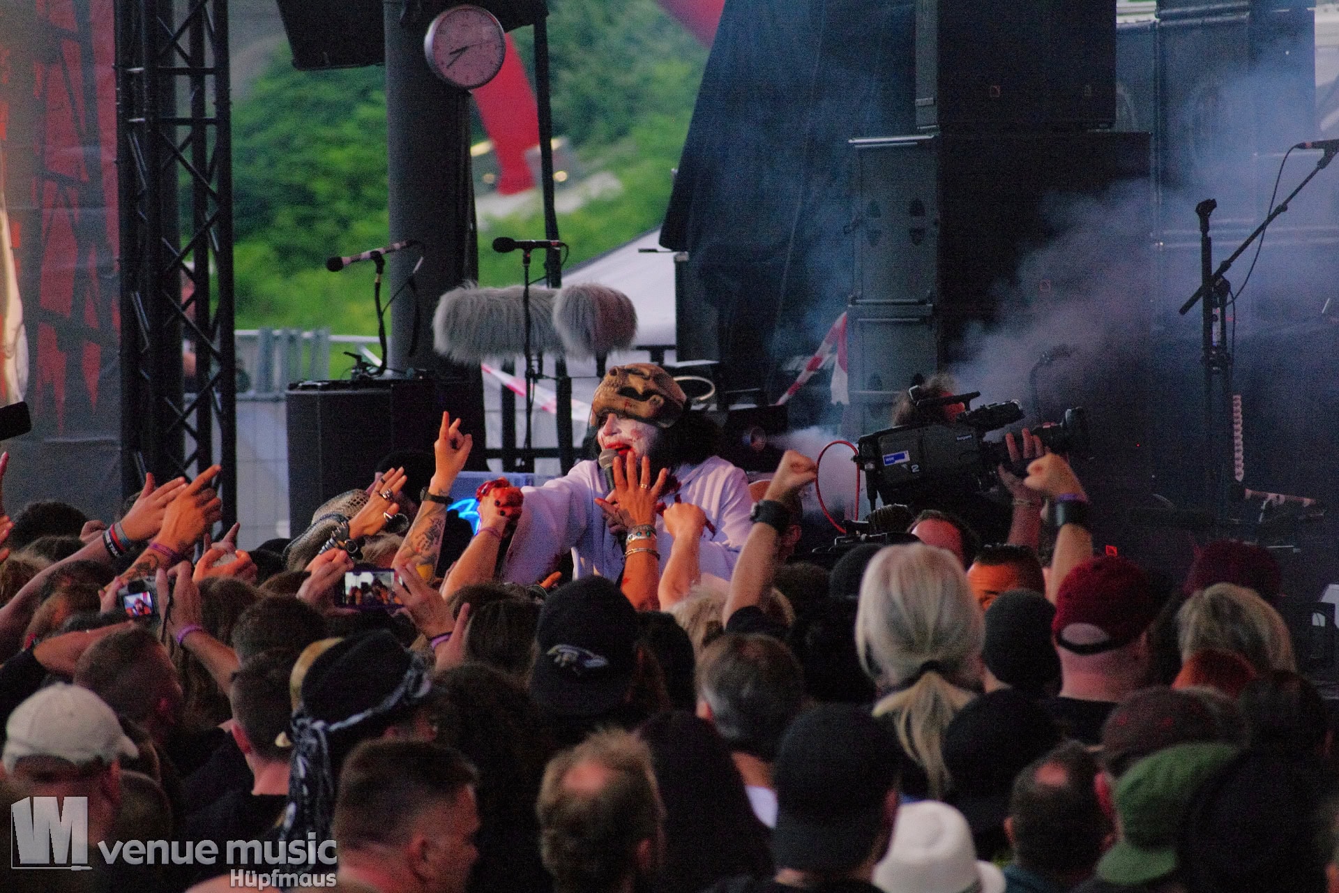 Lizzy Borden boten was Kostüme etc. angeht auf jeden Fall die beste Show des Festivals. Bei nahezu jedem Song sah Sänger Lizzy anders aus. Teilweise waren die Masken echt gruselig, zum Beispiel das dreifache Gesicht. Die Stimmung war super, das machte Laune. Die Fans in den ersten Reihen kamen dann noch sehr „blutig“ auf ihre Kosten, denn bewaffnet mit einem Eimer Kunstblut und was auch immer das sonst noch so darstellte, ging Lizzy direkt zum Publikum und es gab dann wohl nur noch wenige, die nicht zumindest ein bisschen eingesaut waren. Fotograben inklusive – der stank dann bei Watain ganz schön.
