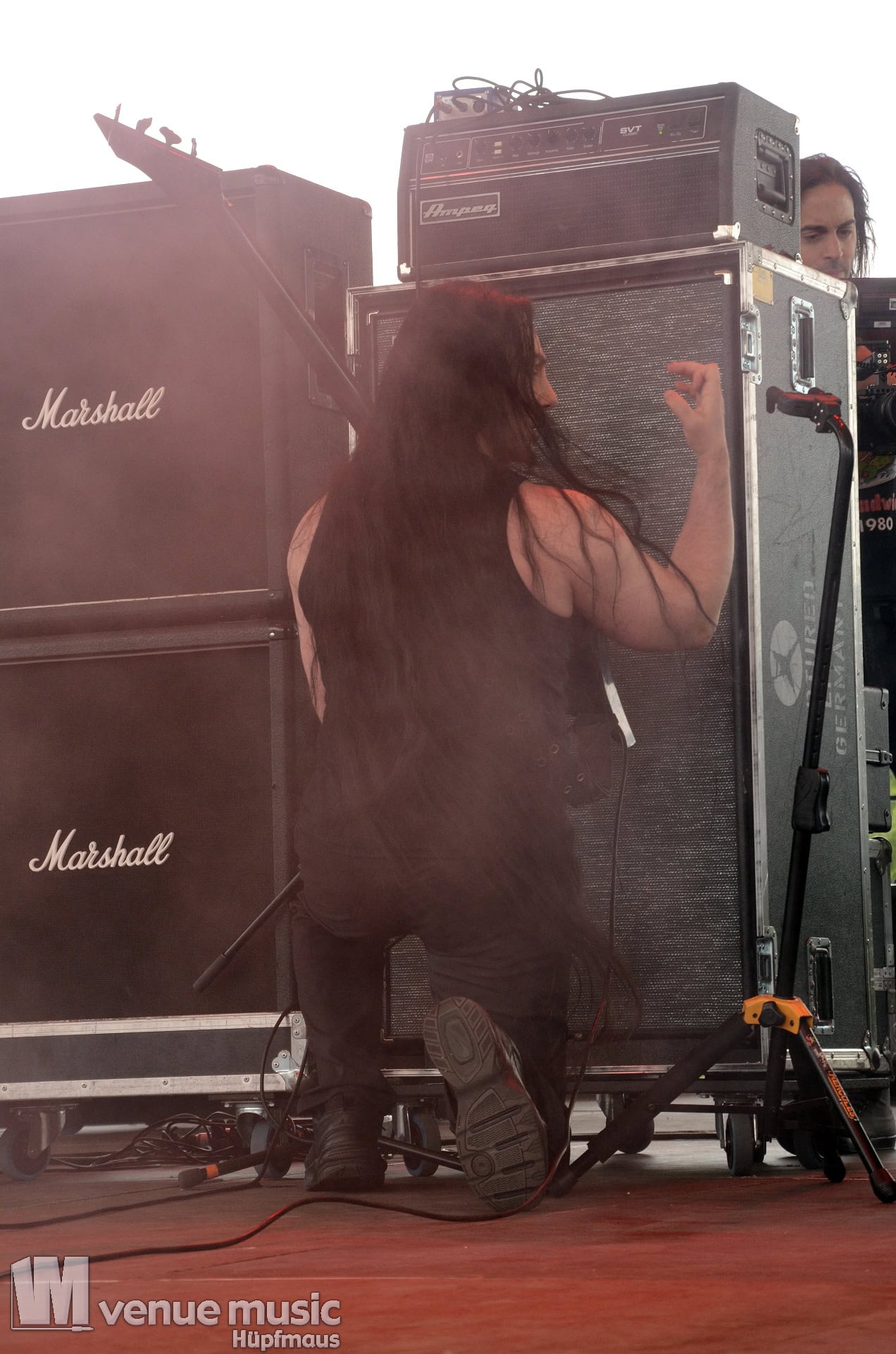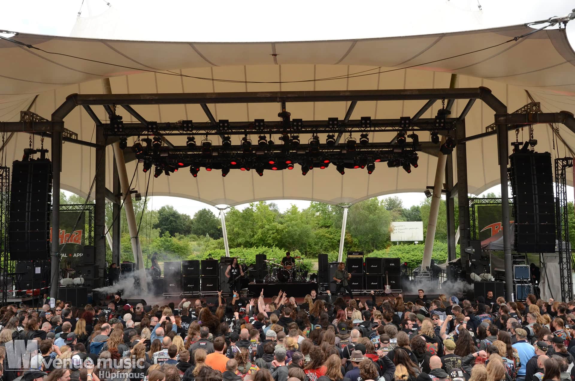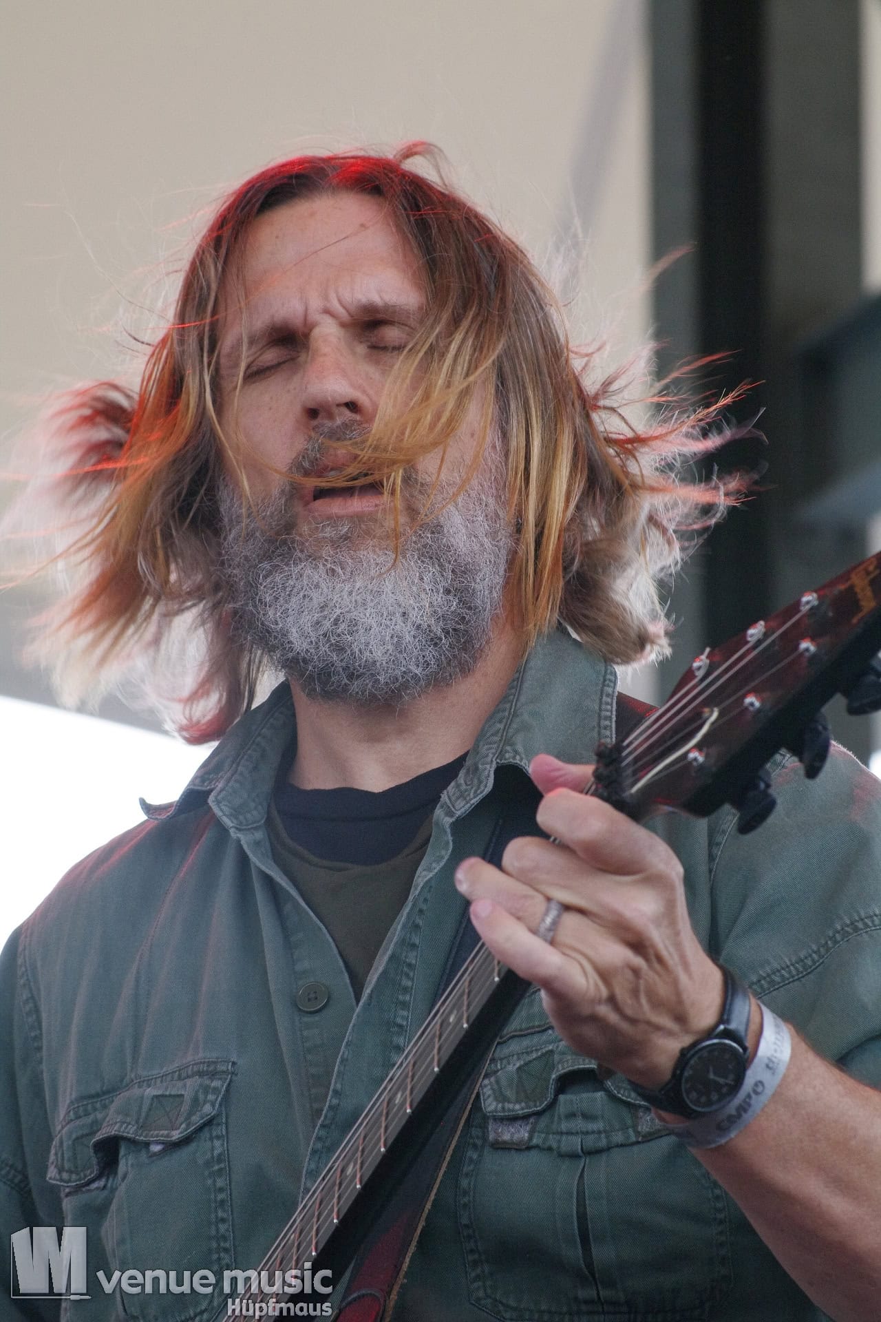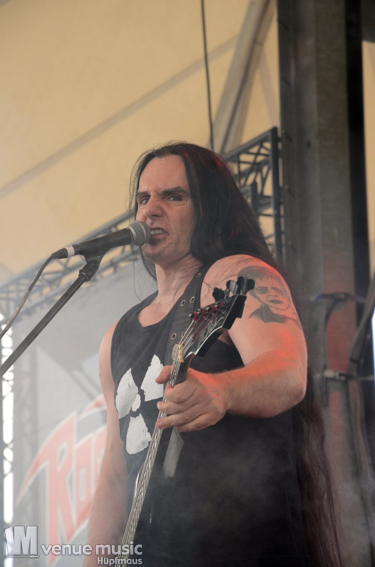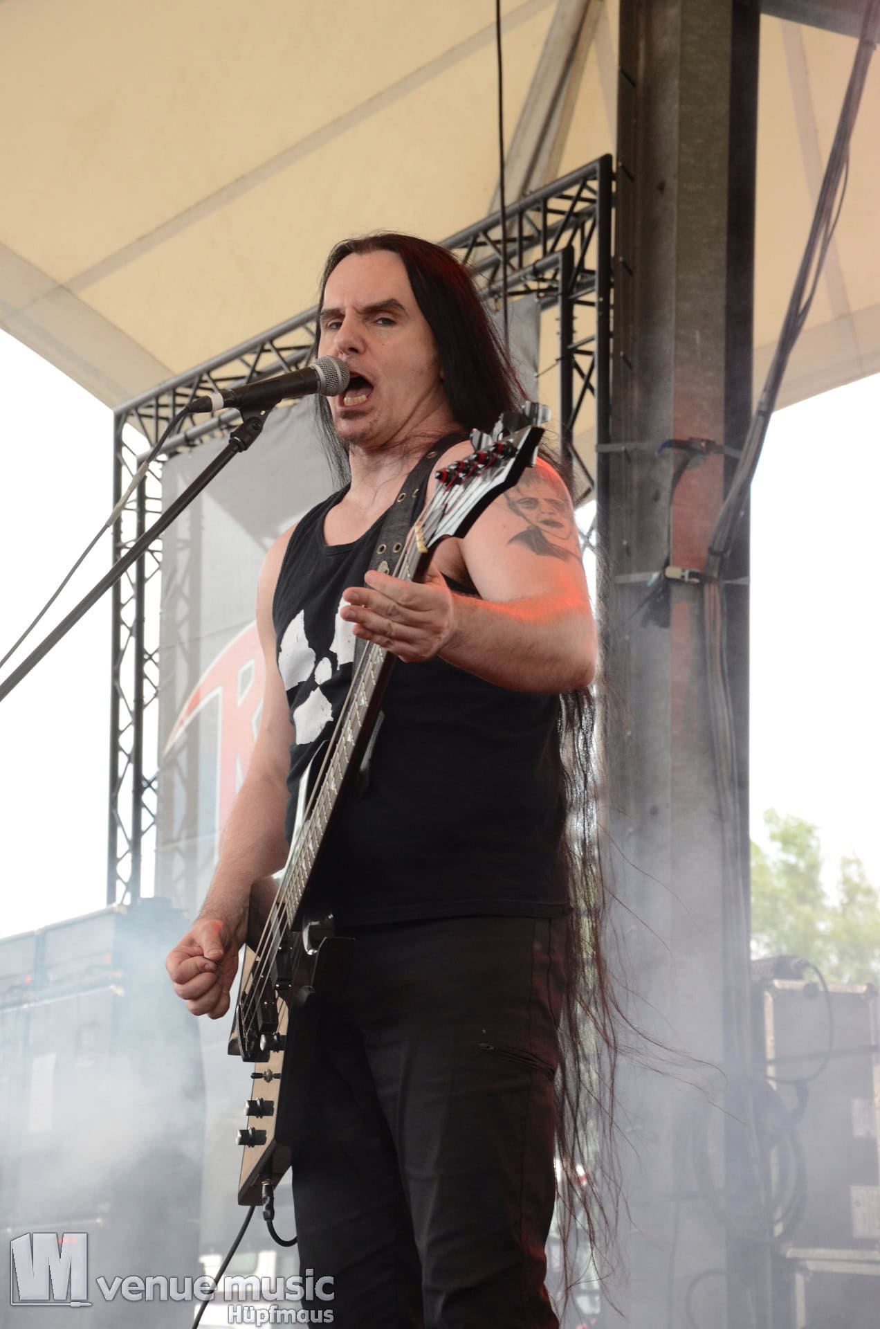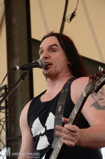 Tag 2 des Rock Hard Festivals startete für mich mit Carnivore A.D.. Die Bühne wirkte recht leer. Zum einen, weil es nur drei Musiker waren, aber es war auch ungewohnt, dass kein Backdrop den Hintergrund zierte. Es war dafür schlicht zu windig. Dafür hat Baron Misuraca Haare für drei ;) Dass die sich bei dem Wind nicht an seinem Bass verhedderten, war ein Wunder..